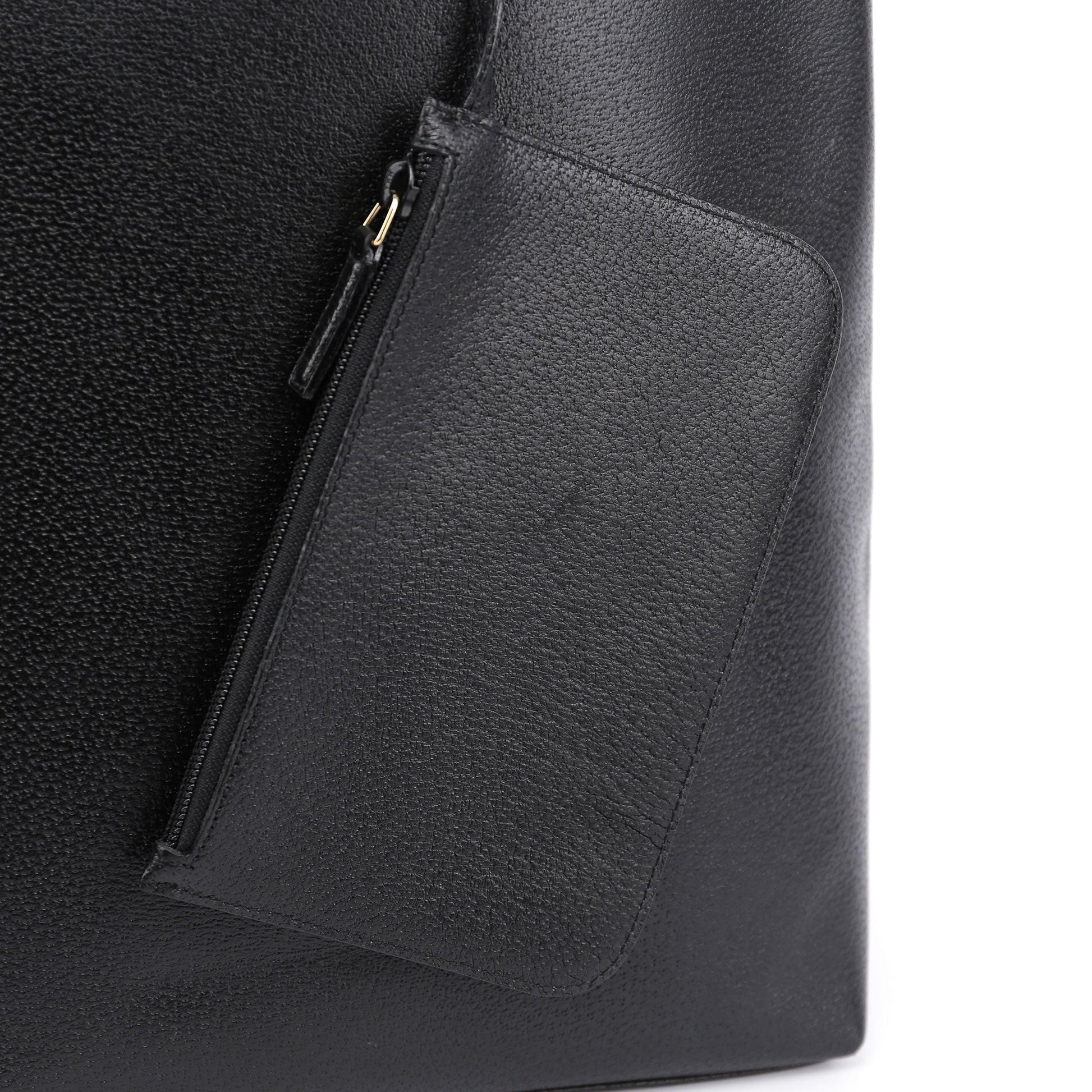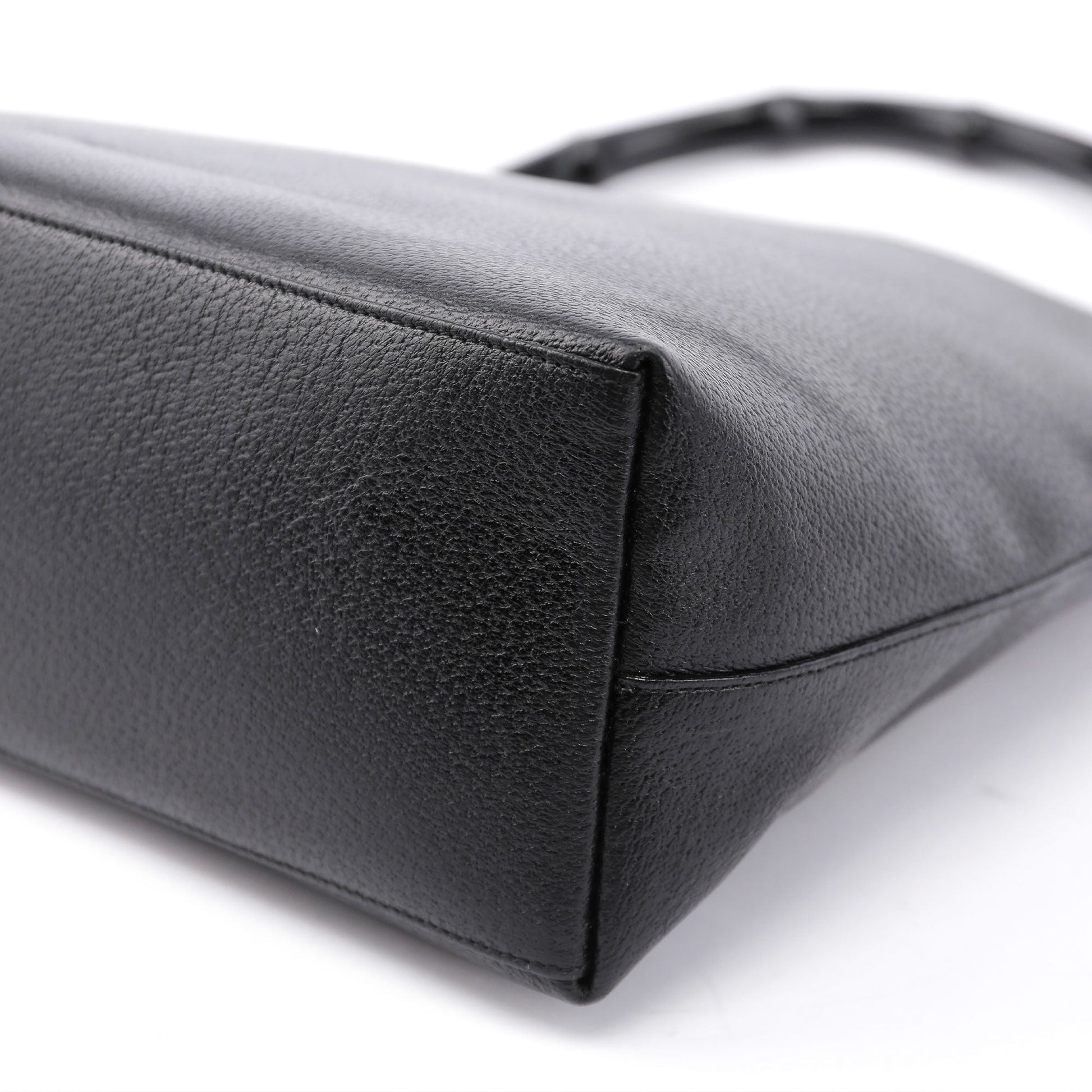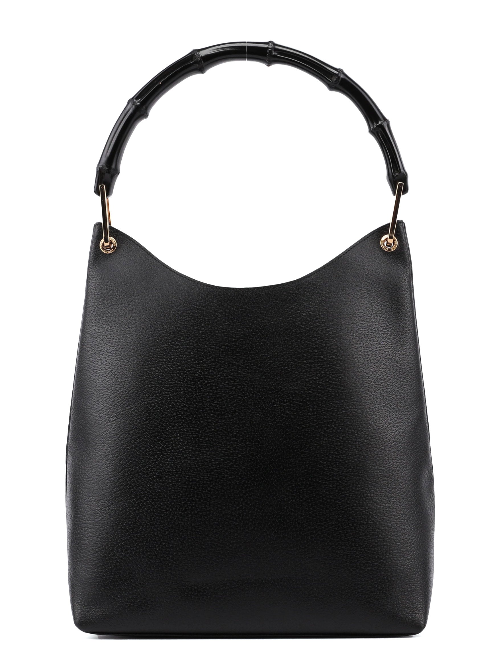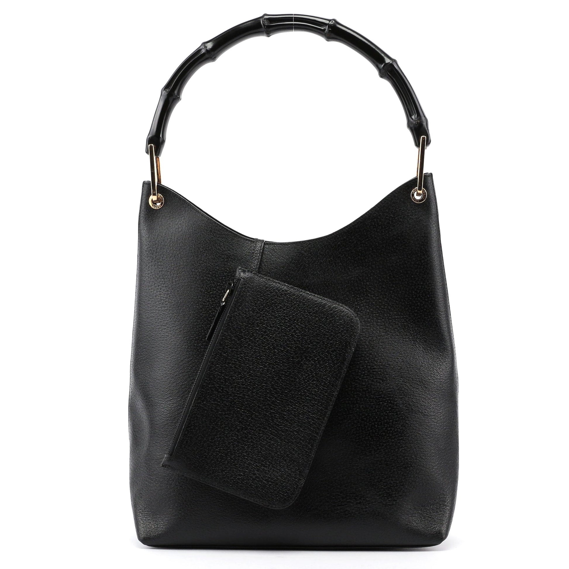 This Gucci black leather bamboo hobo bag, crafted under Tom Ford's vision in the late 1990s, features gold-tone hardware adorned with the Gucci logo engraving. A bamboo handle adds an iconic touch, while the design includes an attached pouch for practicality. The interior is elegantly lined with suede, embodying luxury and timeless style.