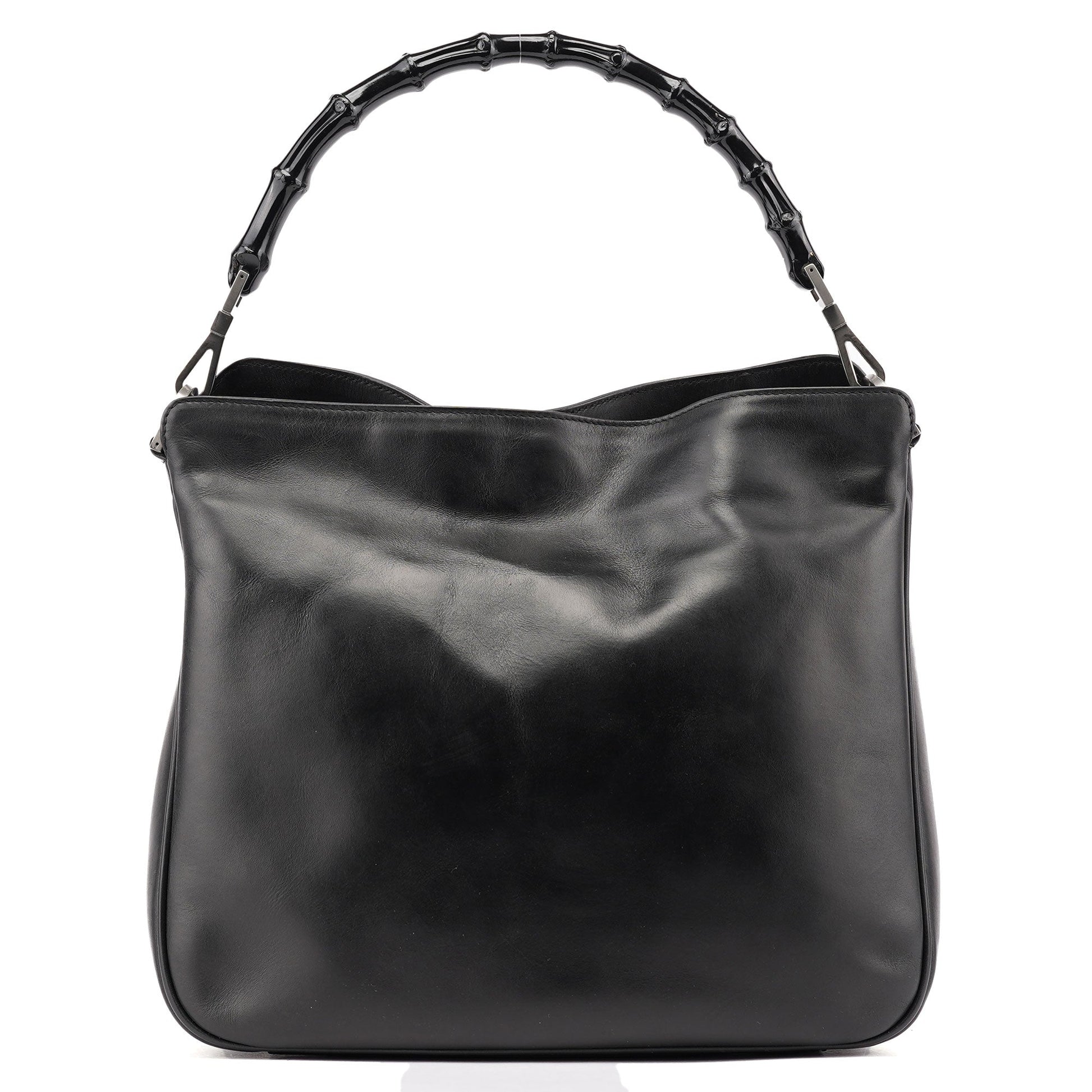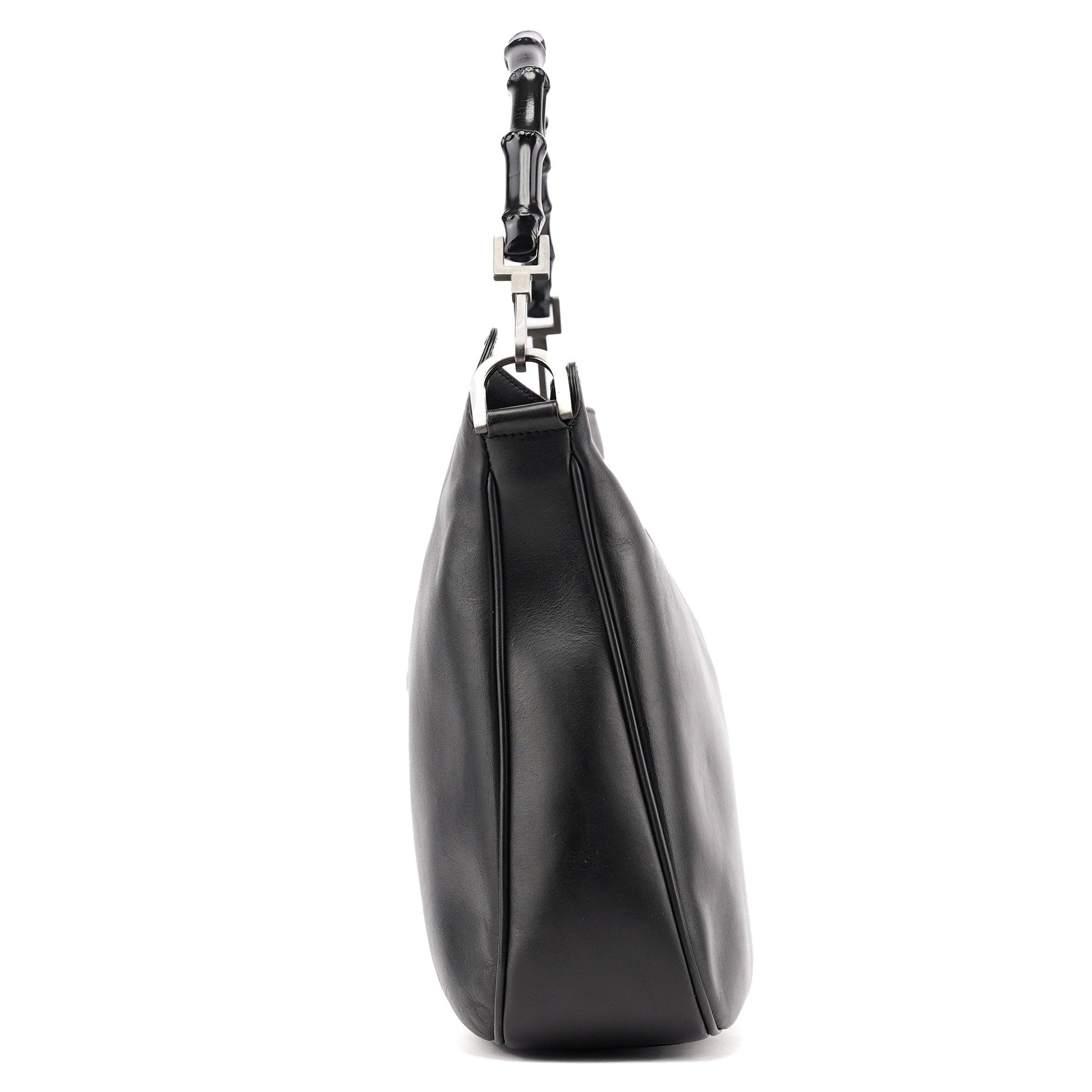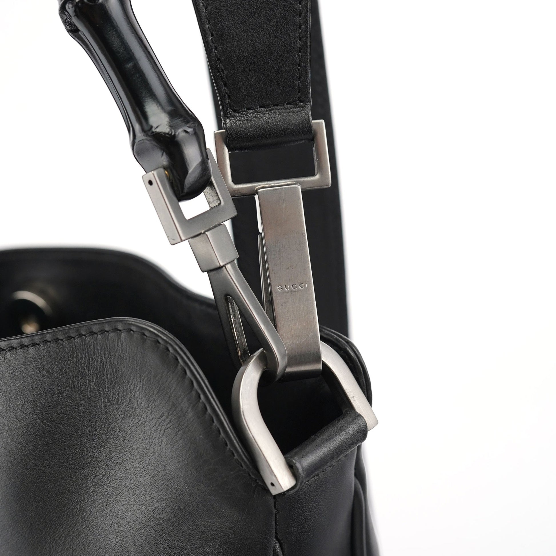 Designed by Tom Ford in the late 1990s, the Gucci Bamboo bag is crafted from black calfskin leather with silver-tone hardware and the house’s iconic bamboo handle. Featuring a magnetic closure and detachable strap, it opens to a satin-lined interior with a zip pocket—balancing refined elegance with everyday utility.
