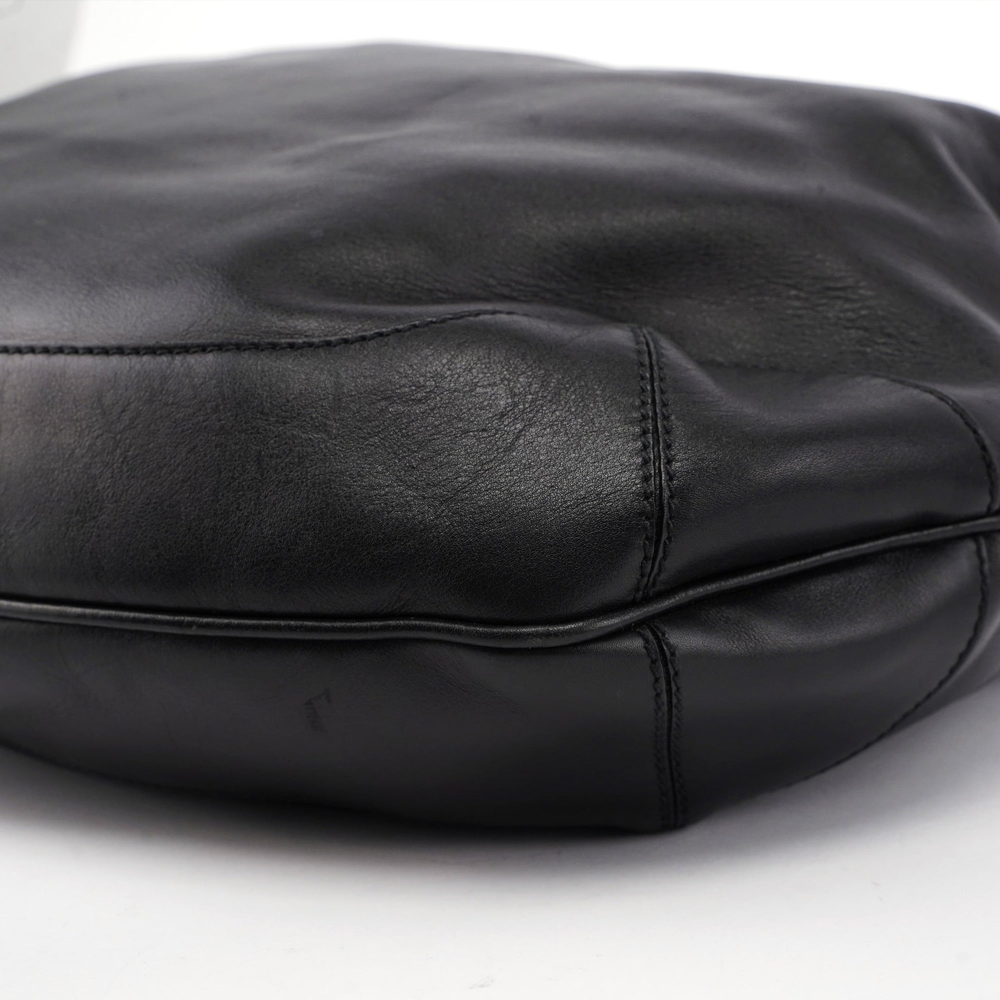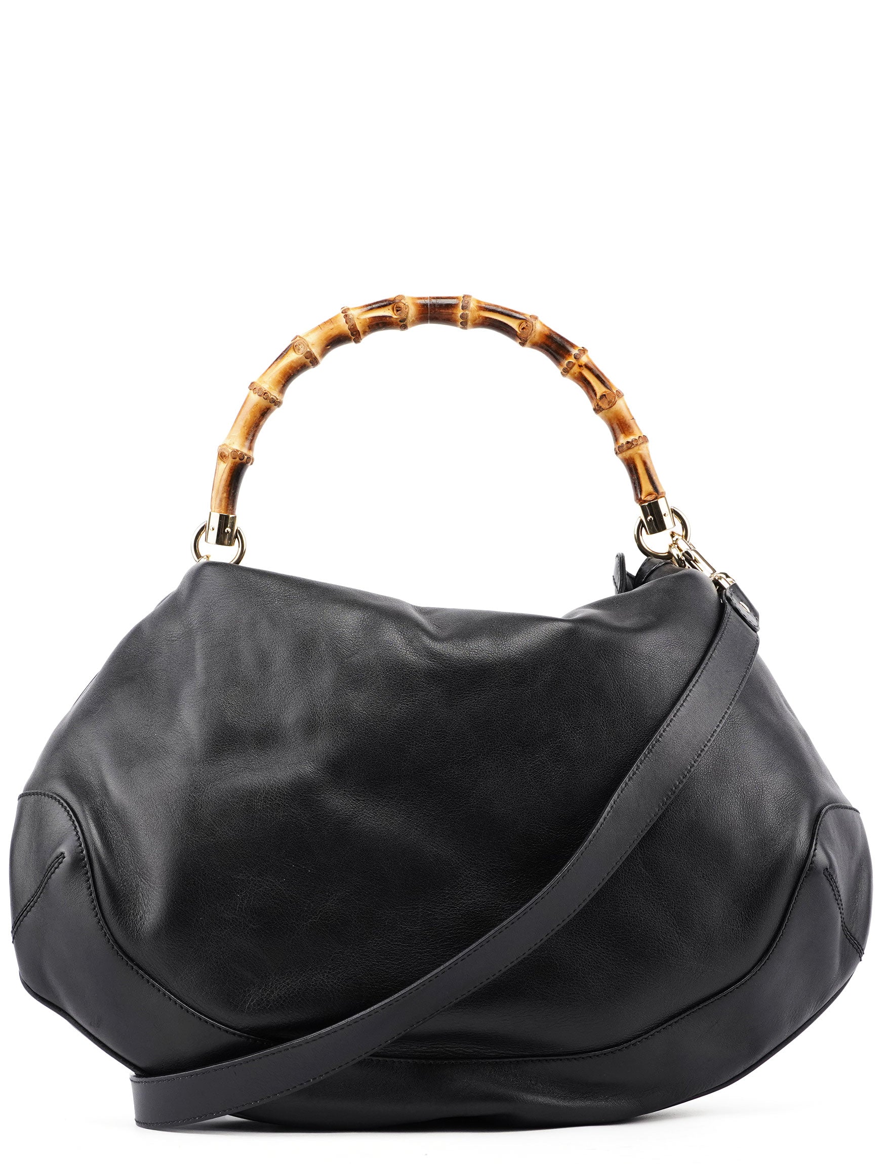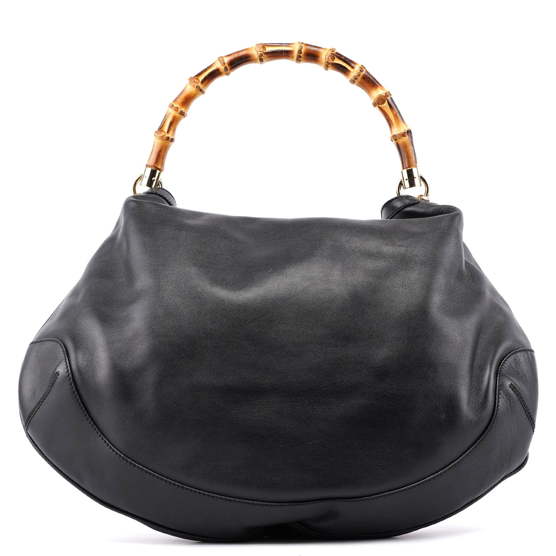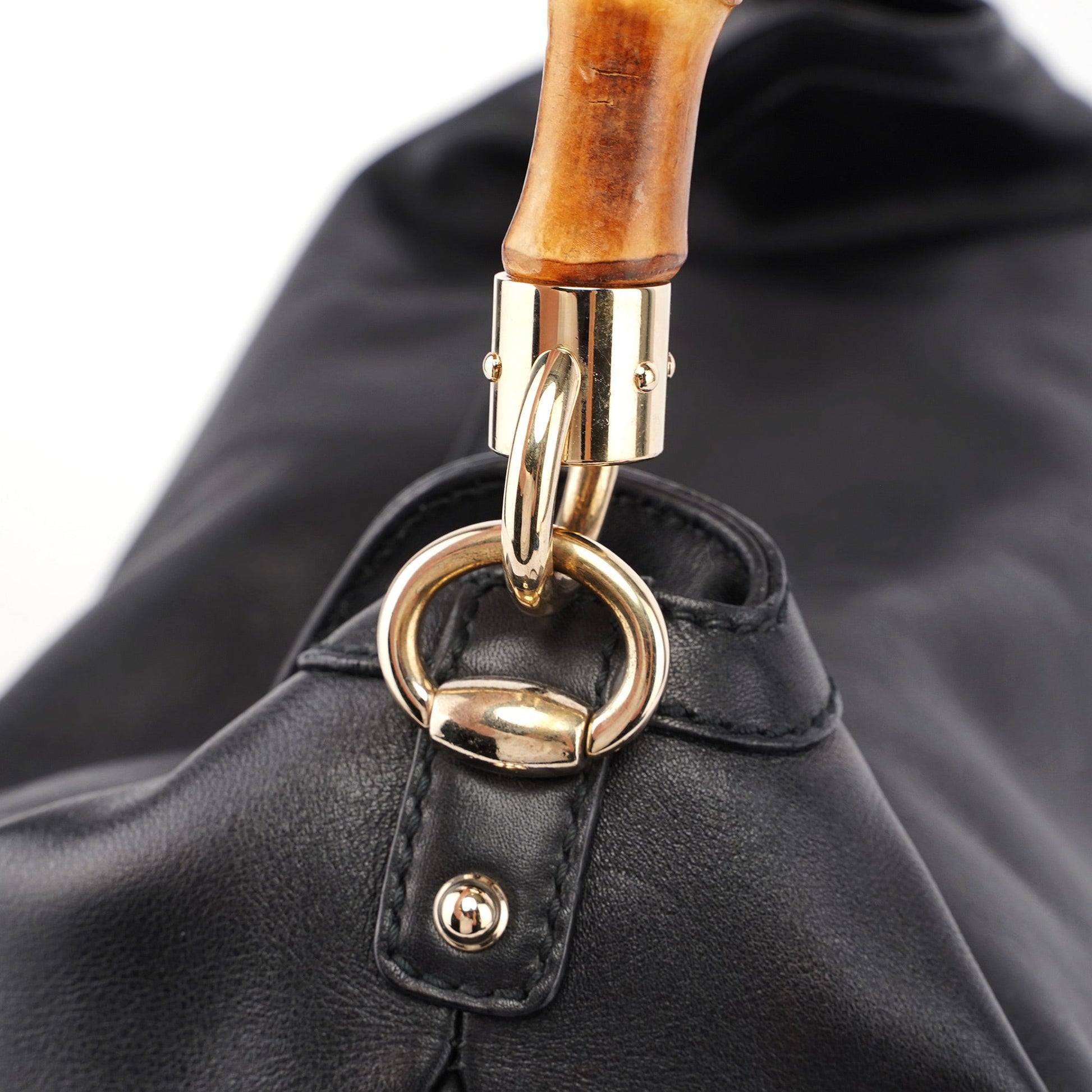 Handcrafted from black calfskin leather, this Gucci Vitello Bamboo bag by Tom Ford from the late 1990s, features a bamboo handle, a leather strap, and gold-tone hardware. The bag has a cotton-lined interior, and an interior zipper pocket, showcasing timeless elegance.