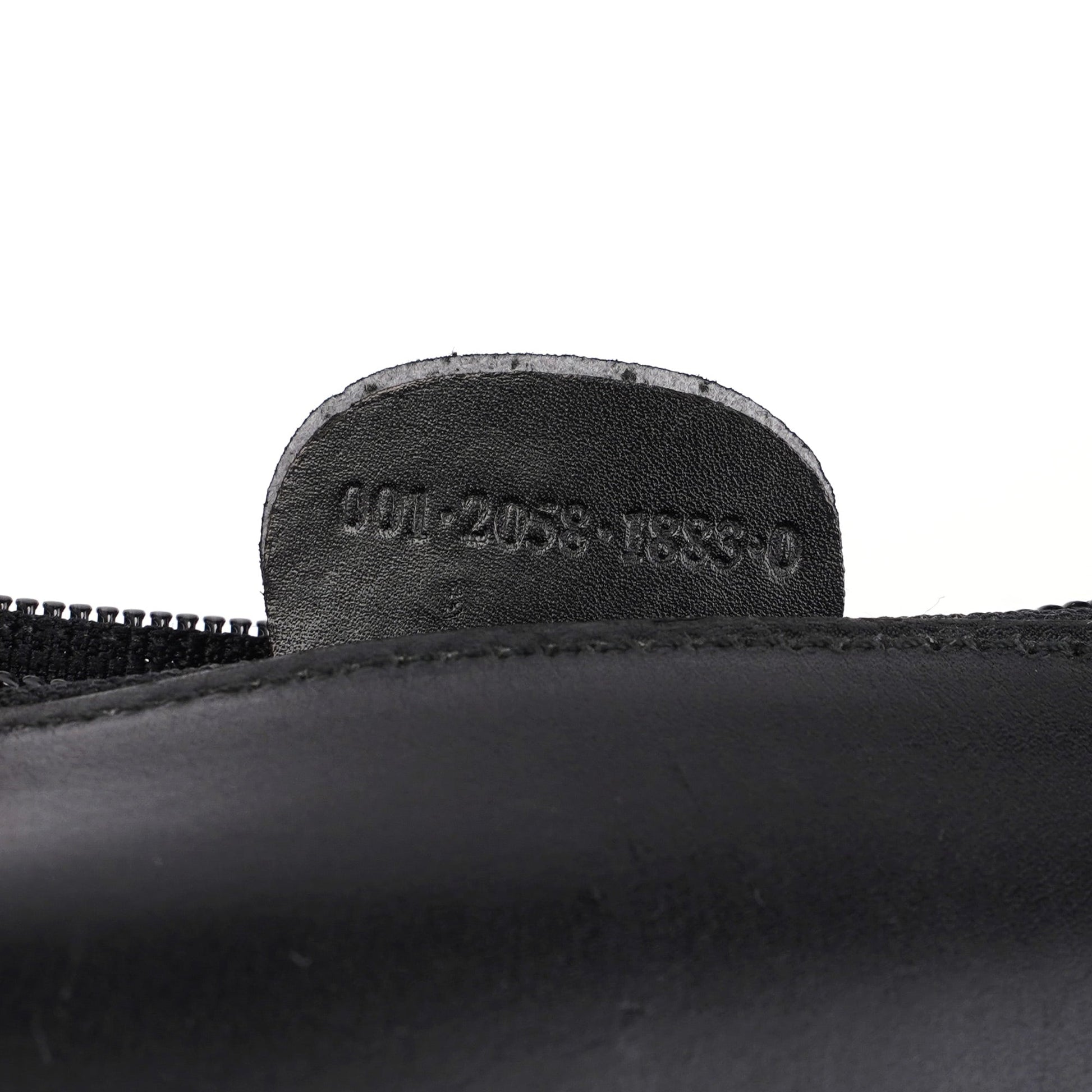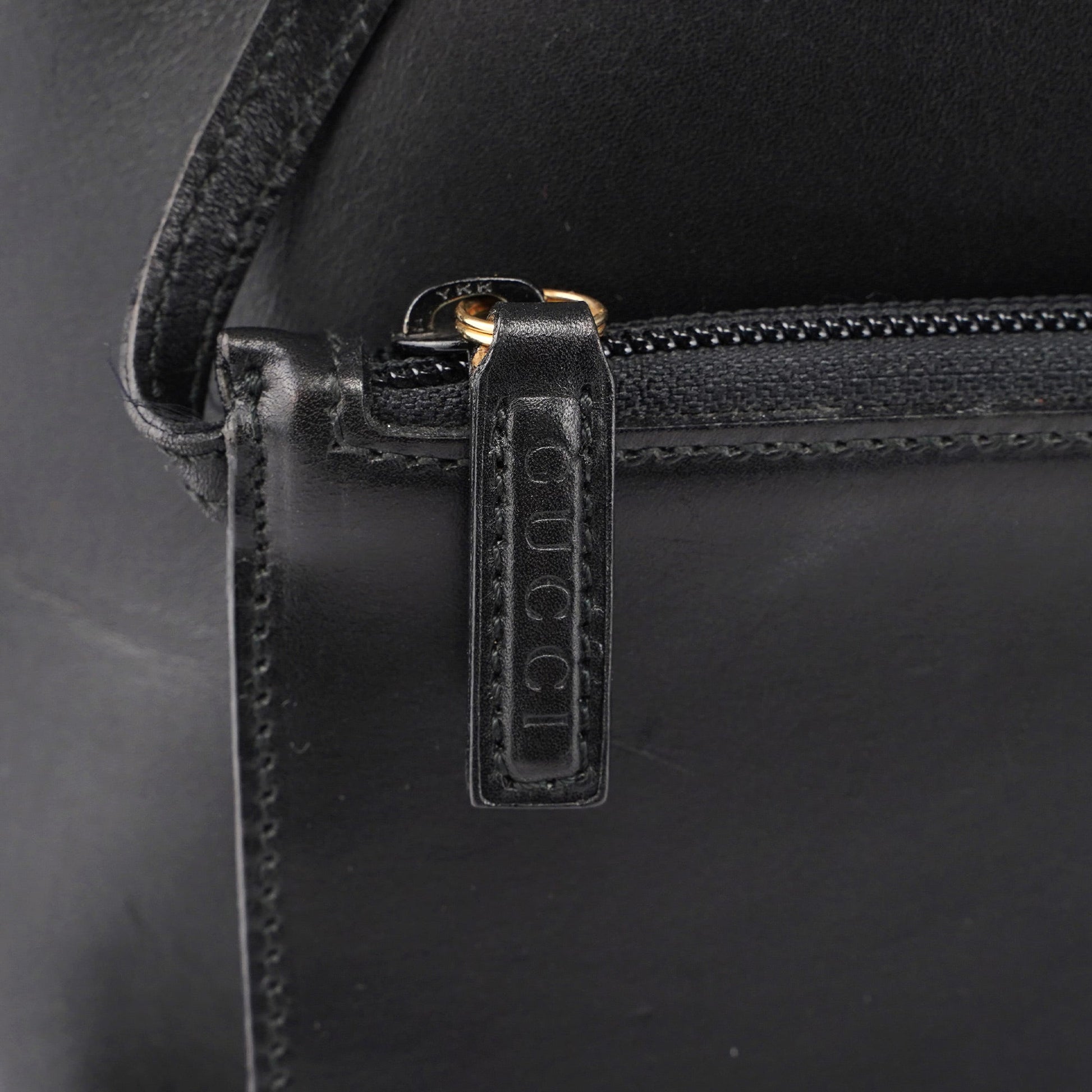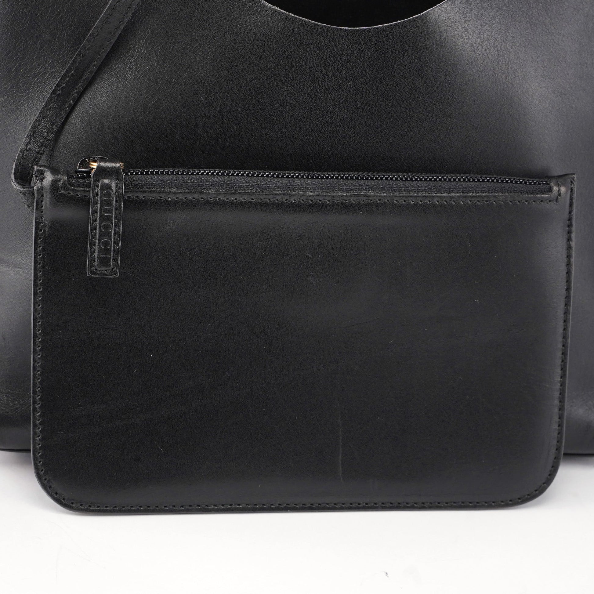 This Gucci black leather Bamboo hobo bag, designed by Tom Ford in the late 1990s, features gold-tone hardware adorned with the Gucci logo engraving. The black bamboo handle adds an iconic touch, while the design includes an attached pouch for practicality. The interior is elegantly lined with suede.
