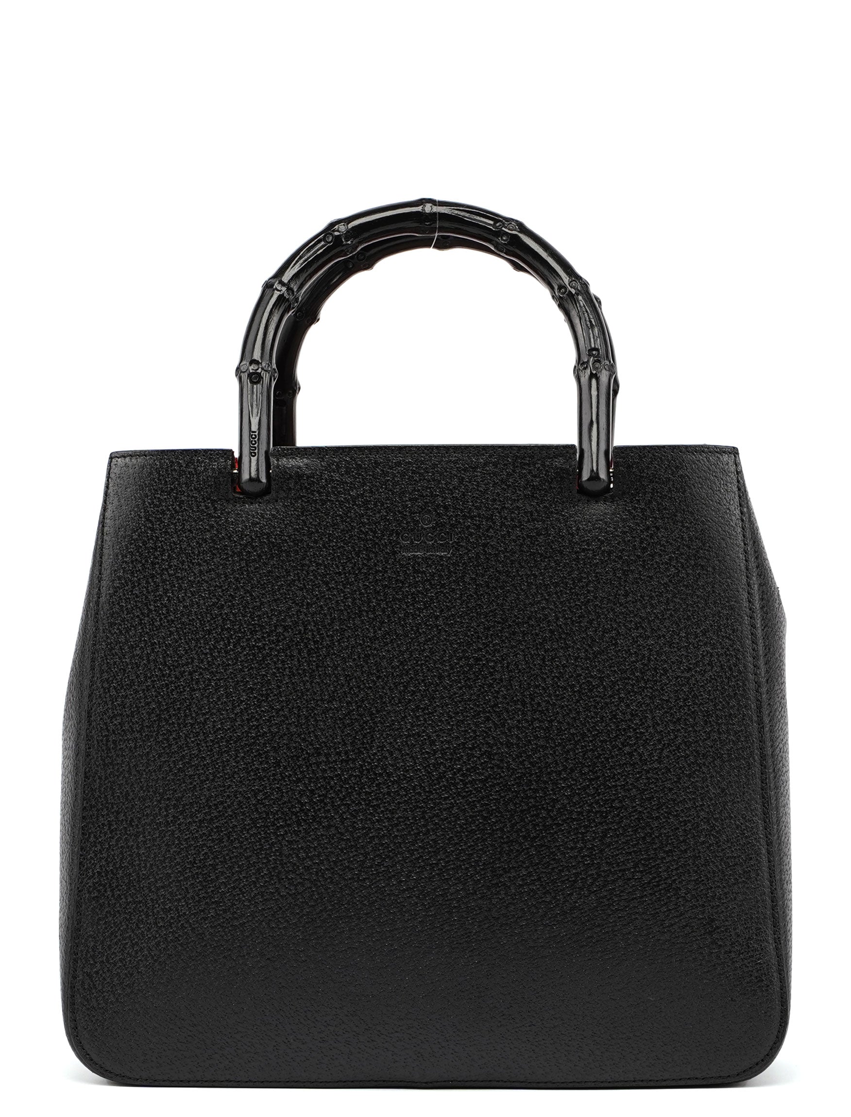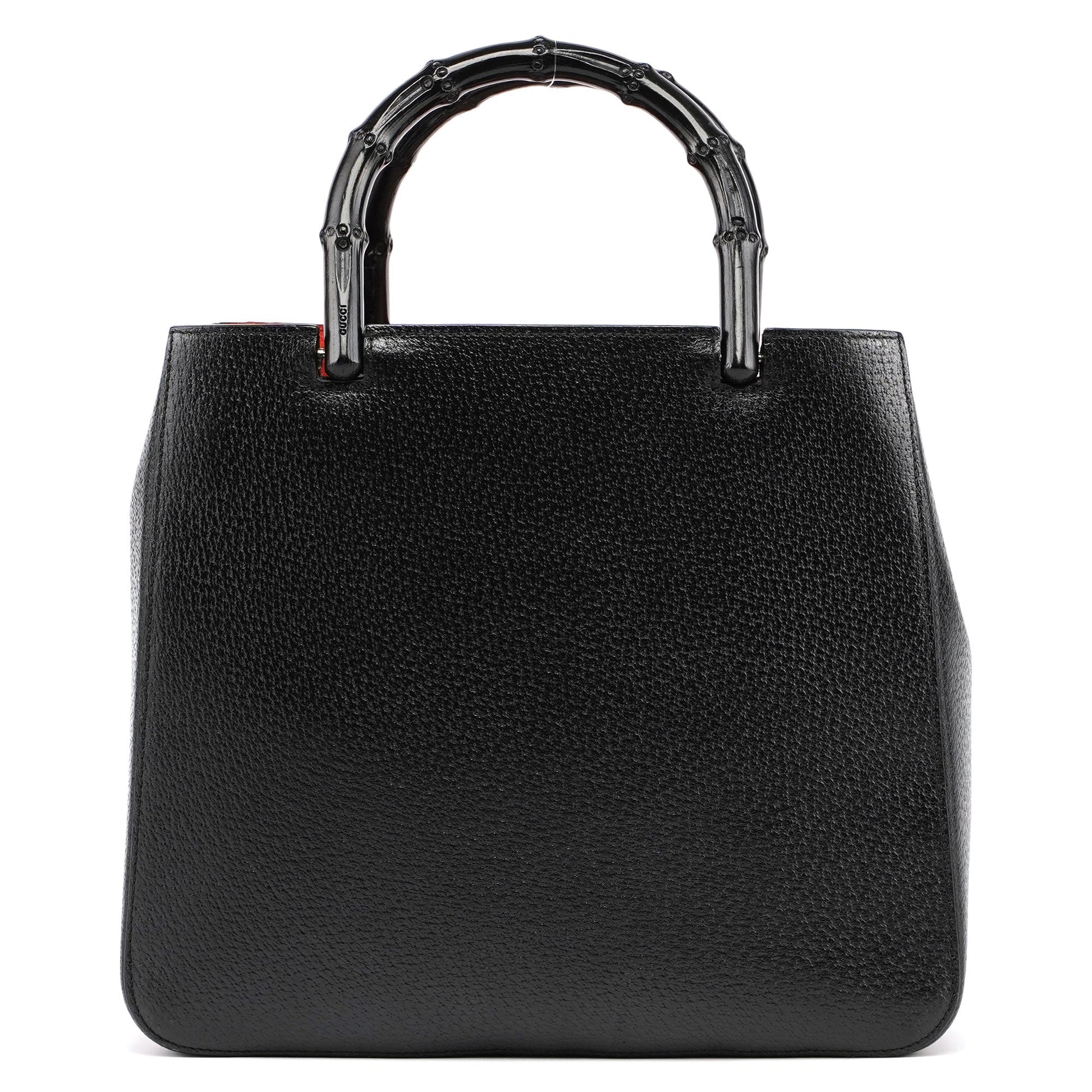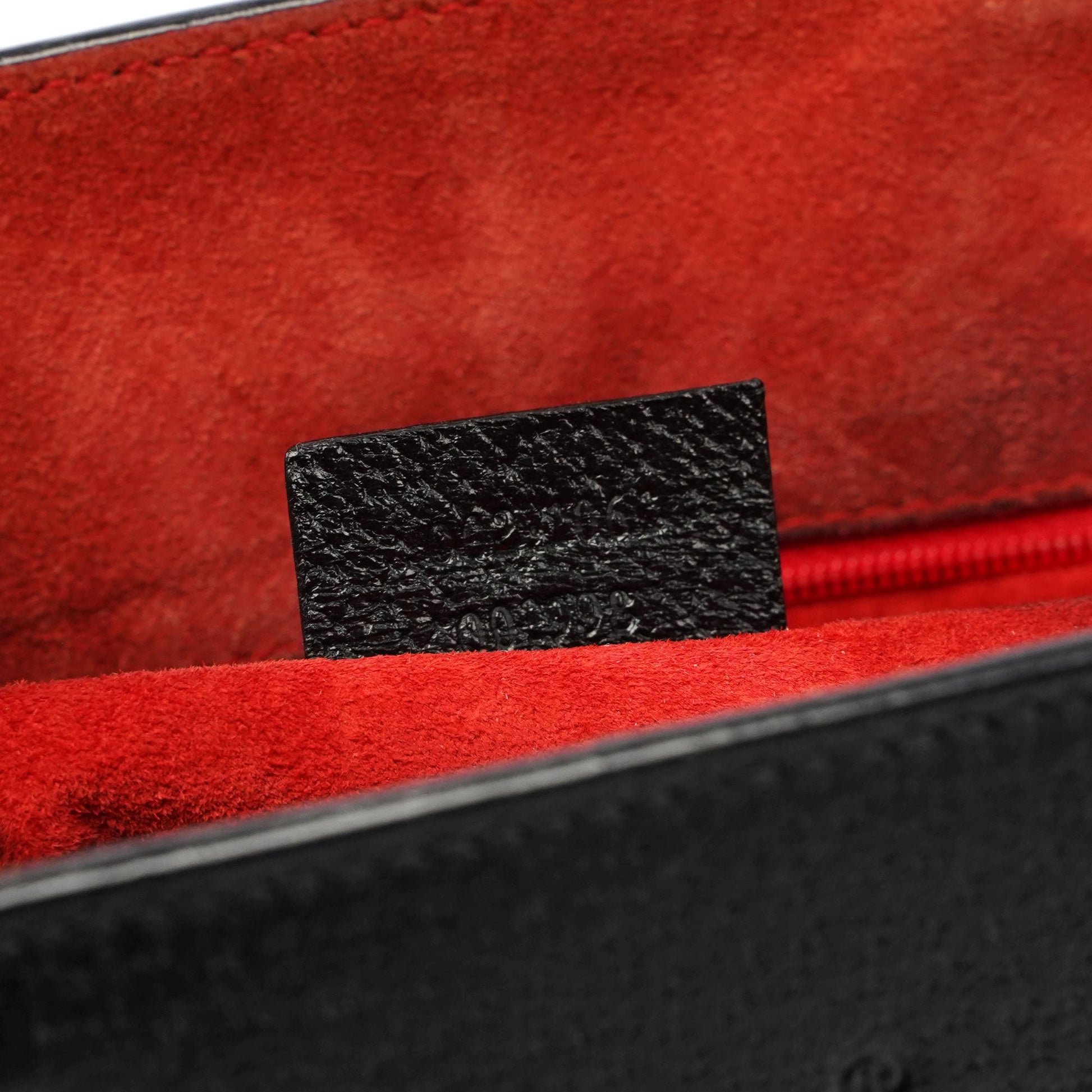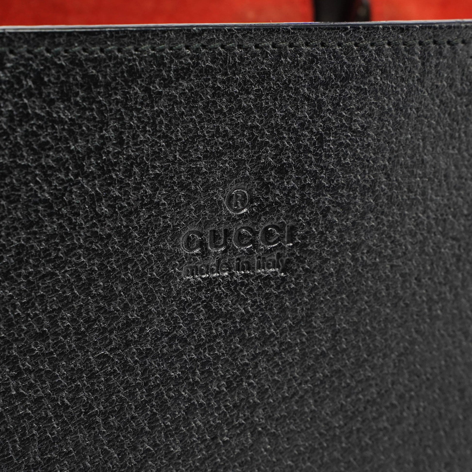 This Gucci black leather bamboo tote features two gloss black bamboo handles with Gucci logo engraving. Inside, it boasts two compartments lined with red suede, including an interior zipper pocket, and the Gucci logo embossed on the front for a signature touch.