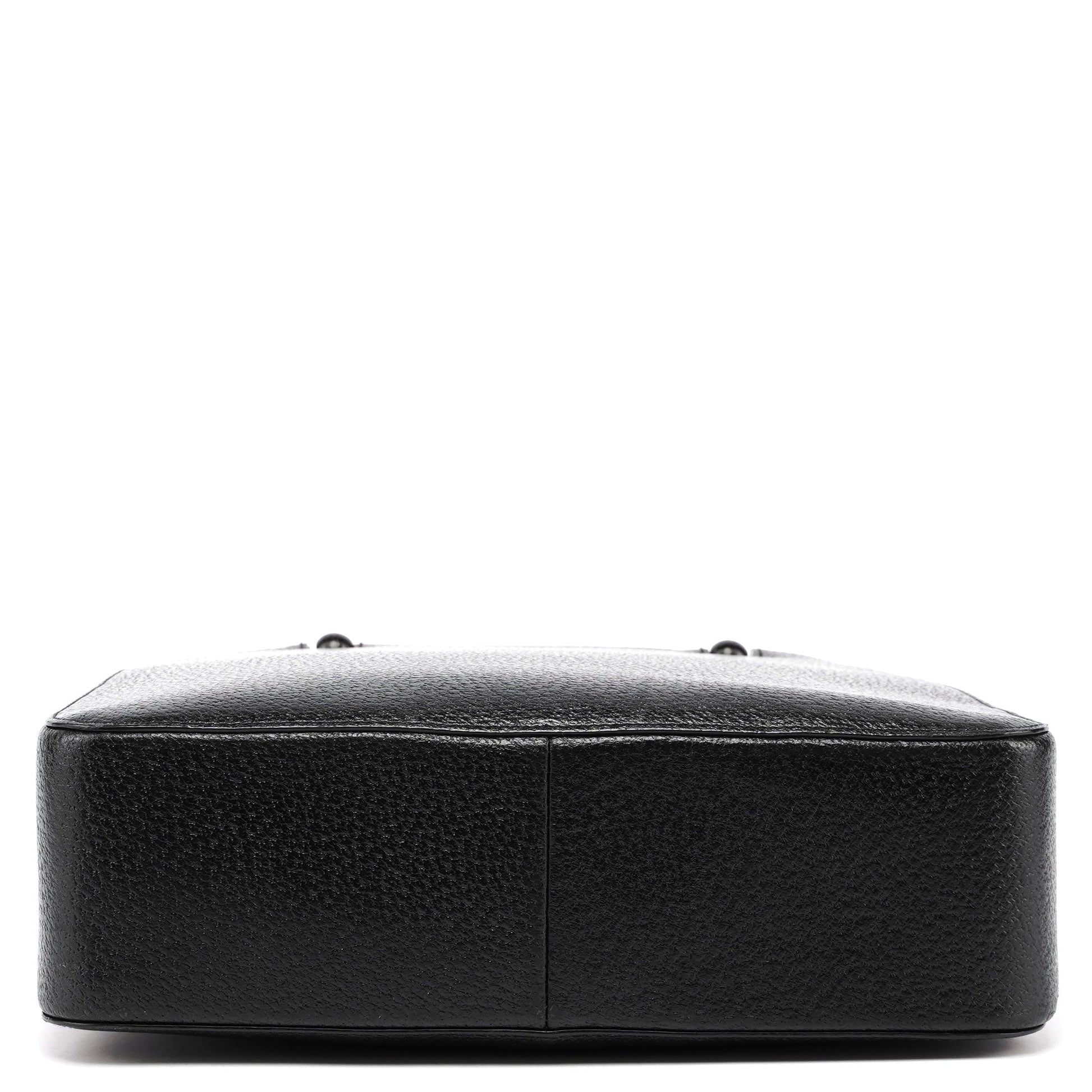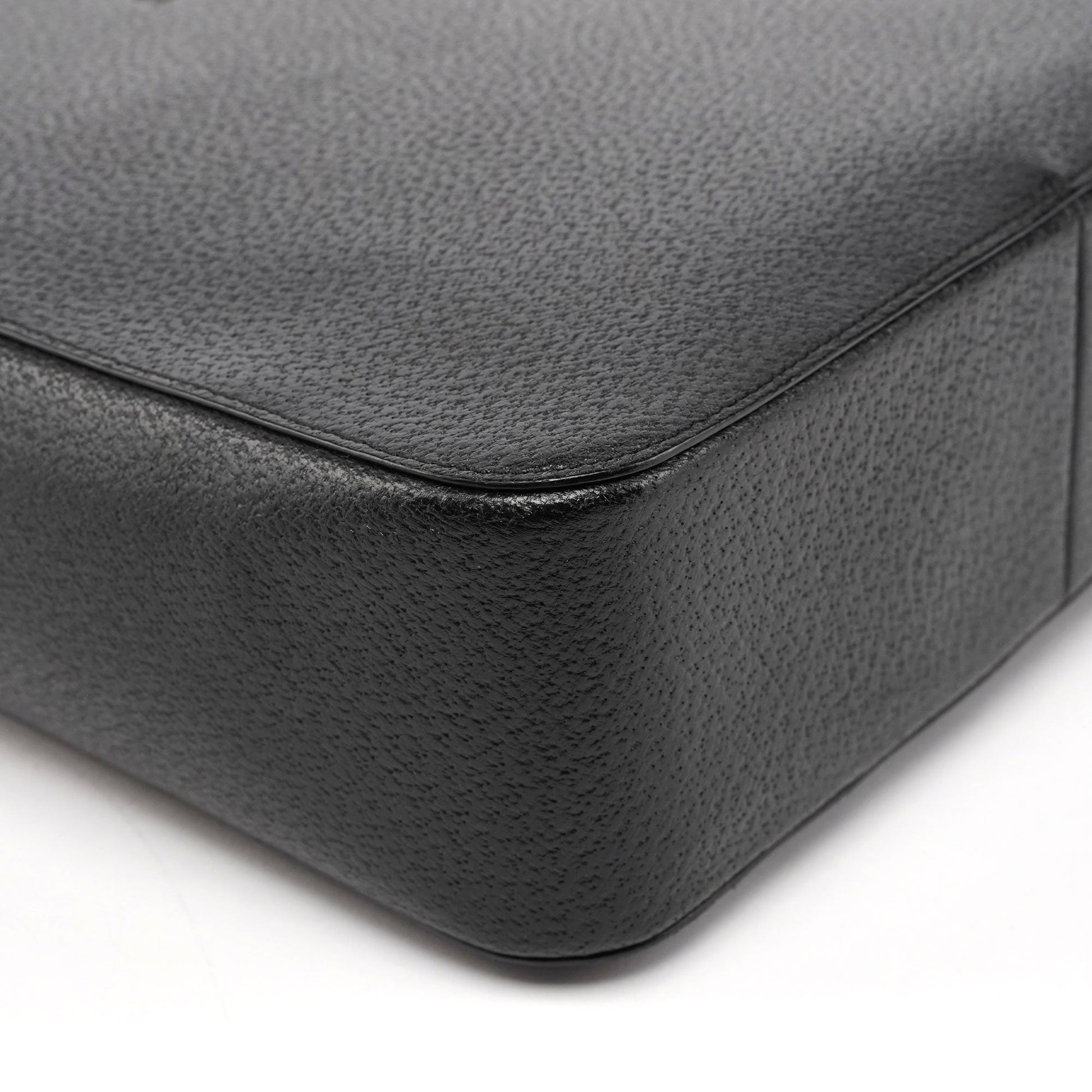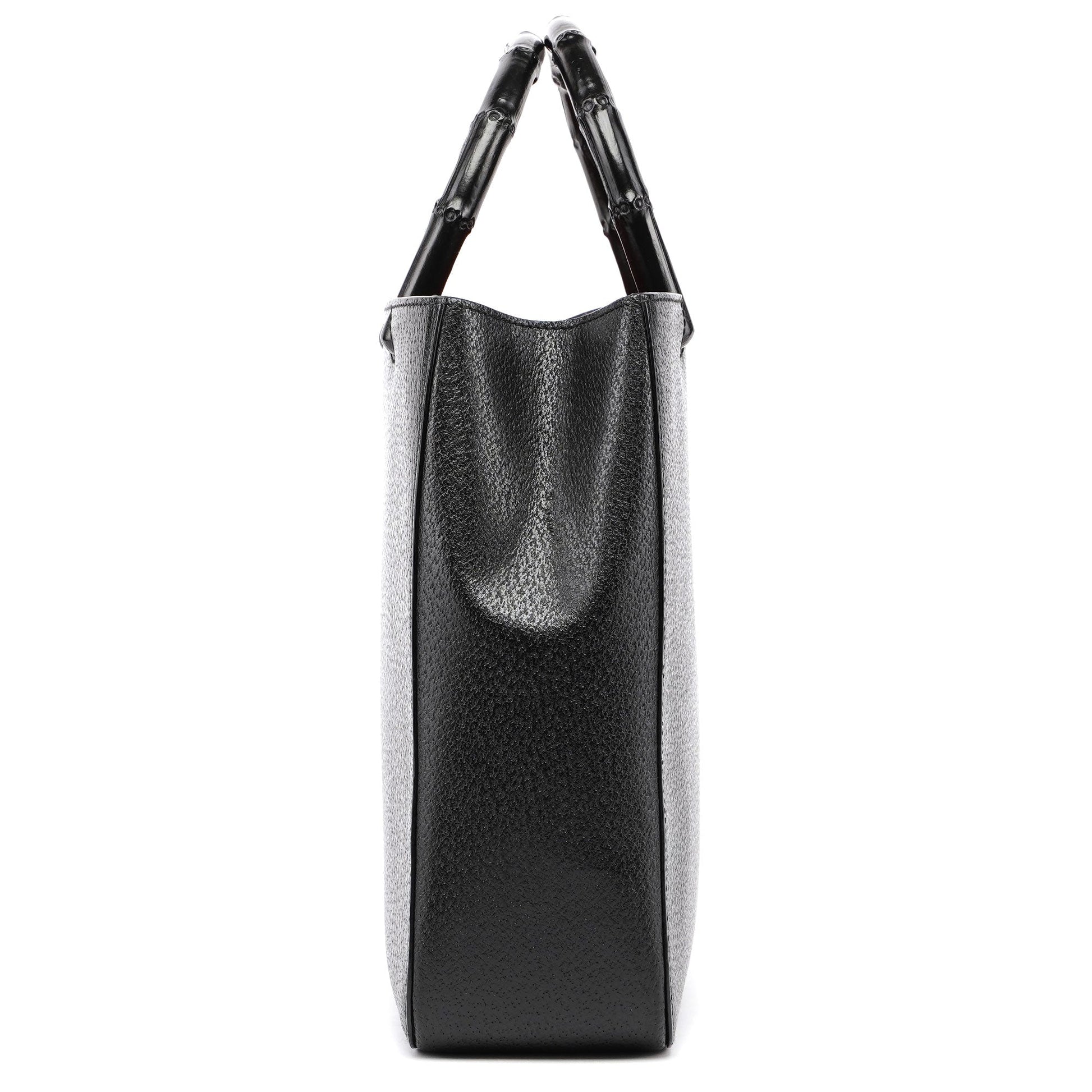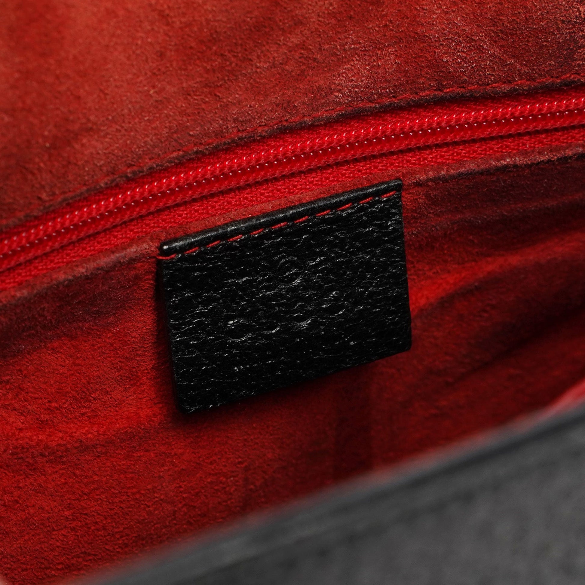 This Gucci black leather bamboo tote features two gloss black bamboo handles with Gucci logo engraving. Inside, it boasts two compartments lined with red suede, including an interior zipper pocket, and the Gucci logo embossed on the front for a signature touch.