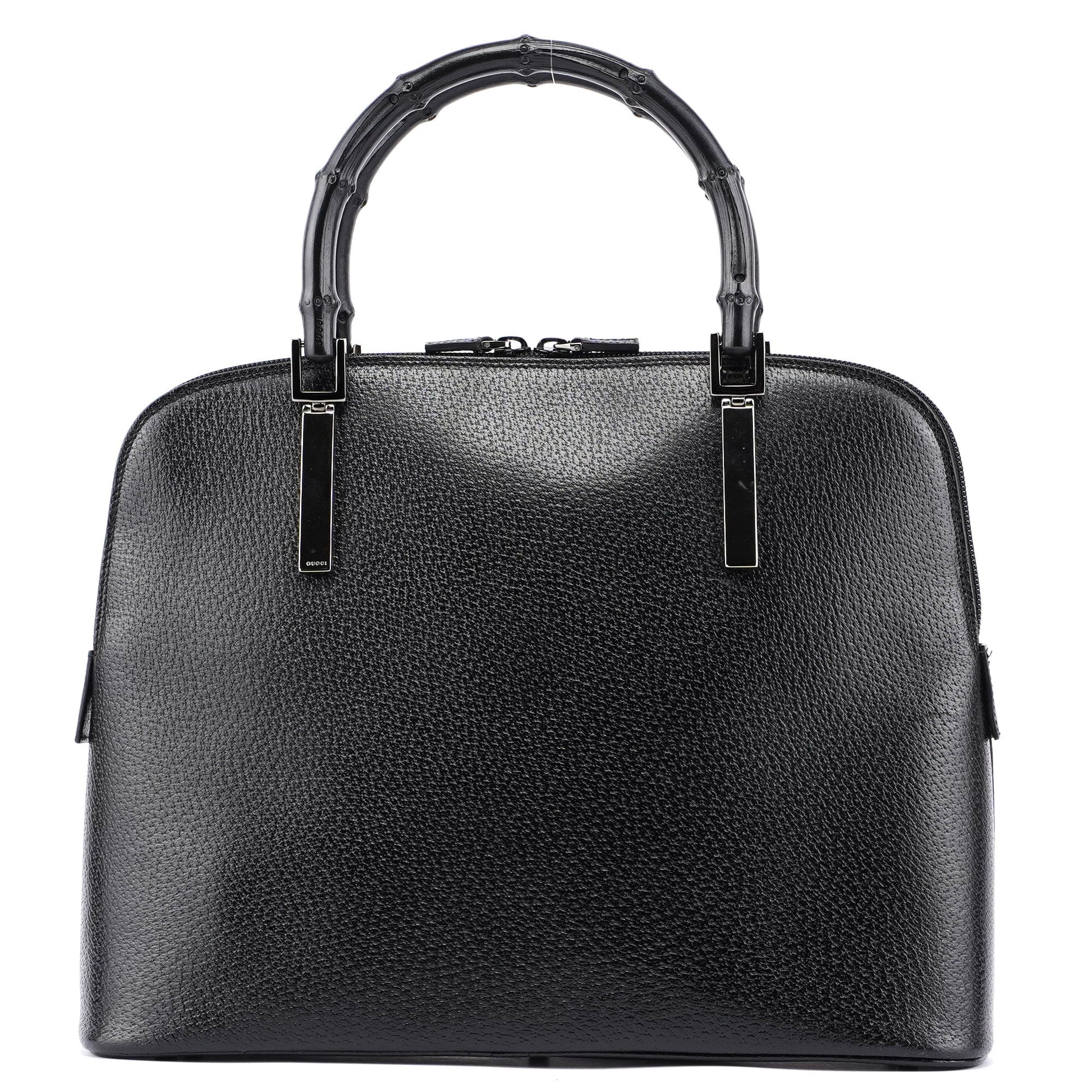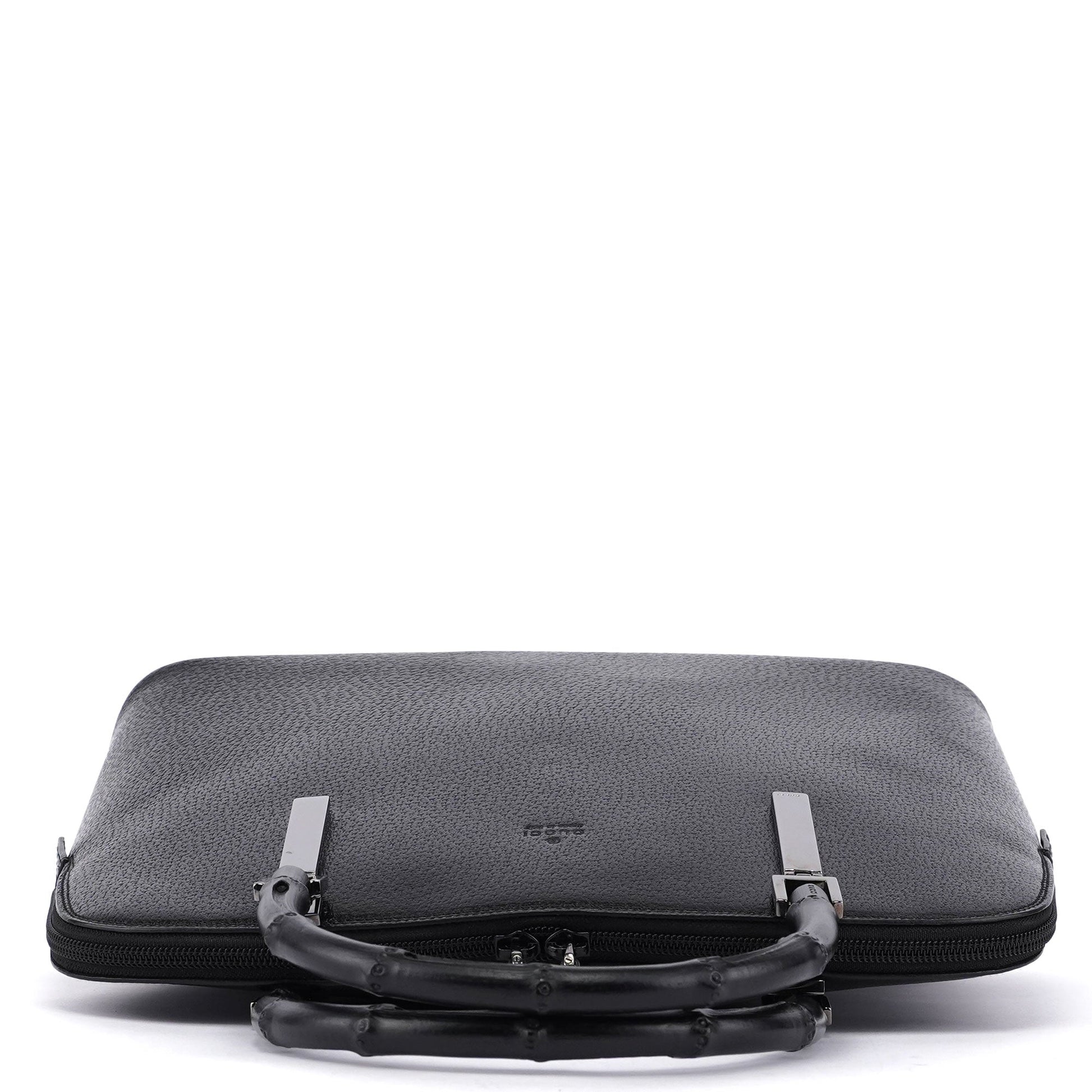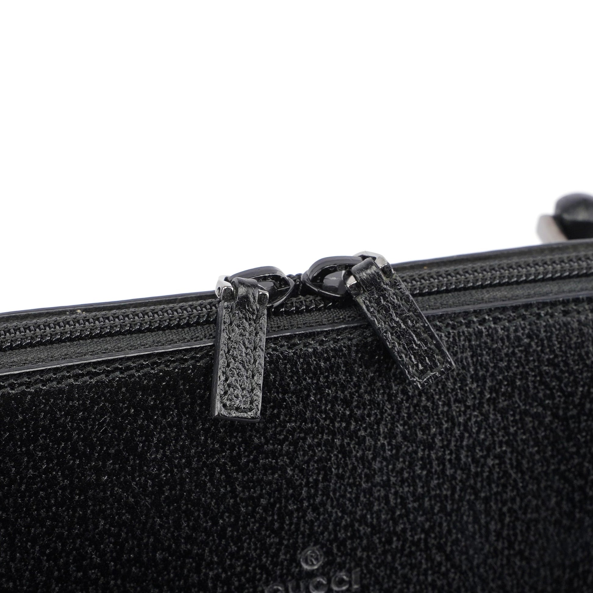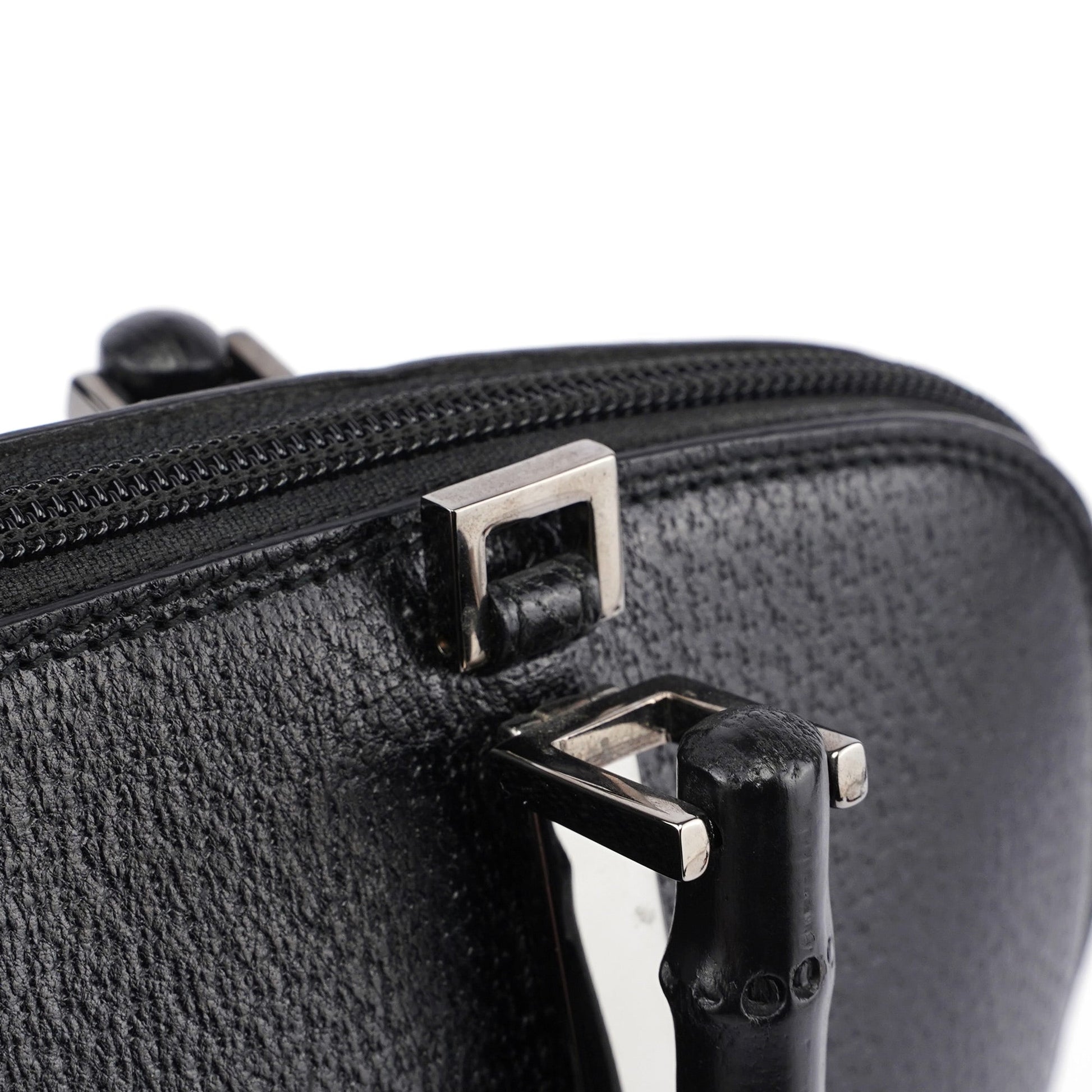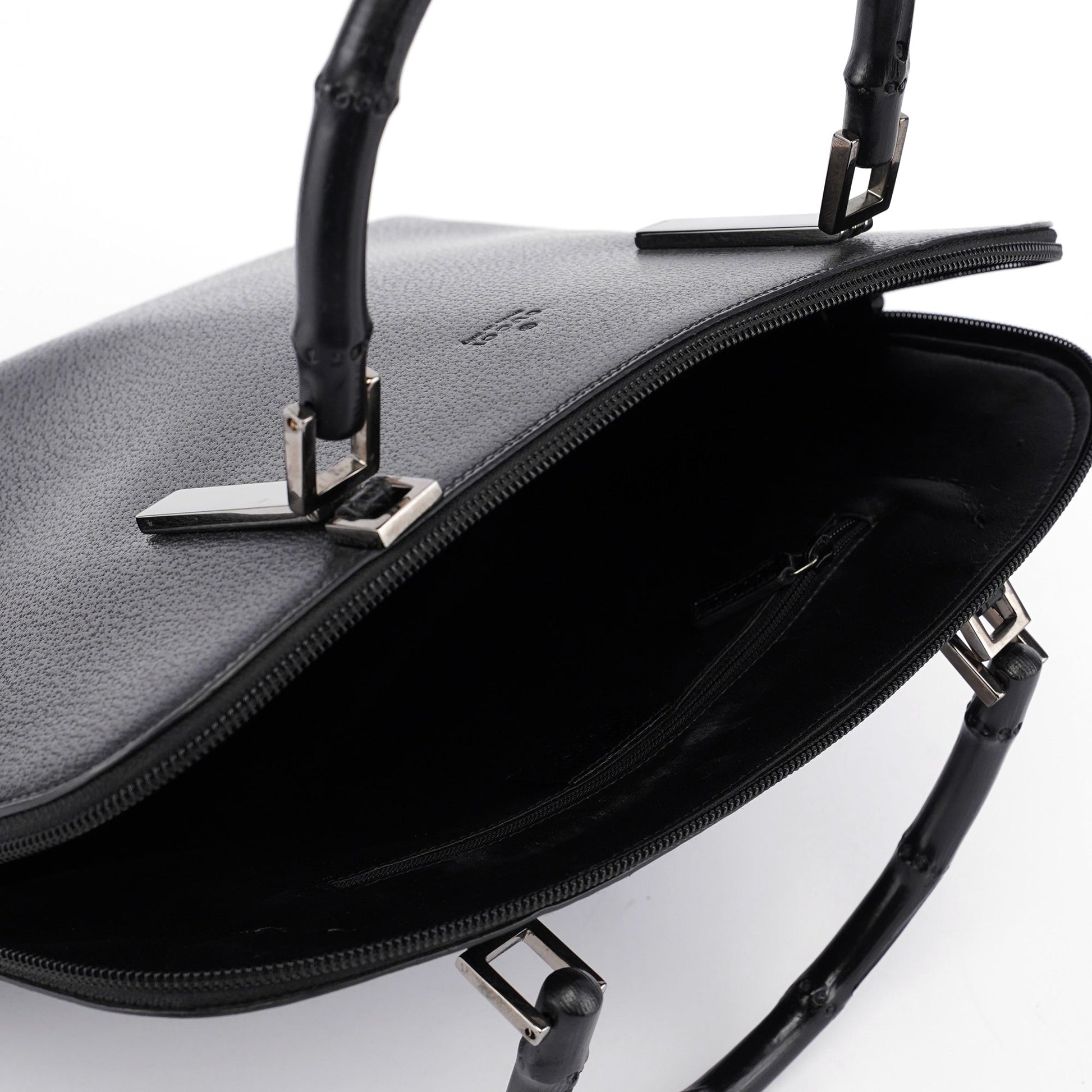 Handcrafted in black leather, this Gucci Bamboo 2-Way bag by Tom Ford from the late 1990s features dual black bamboo handles with Gucci logo engraving, silver-tone hardware, and a zipper closure. The interior is lined in leather with a zipper pocket. The Gucci logo is embossed at the front, showcasing timeless elegance. The bag comes with a removable shoulder strap.