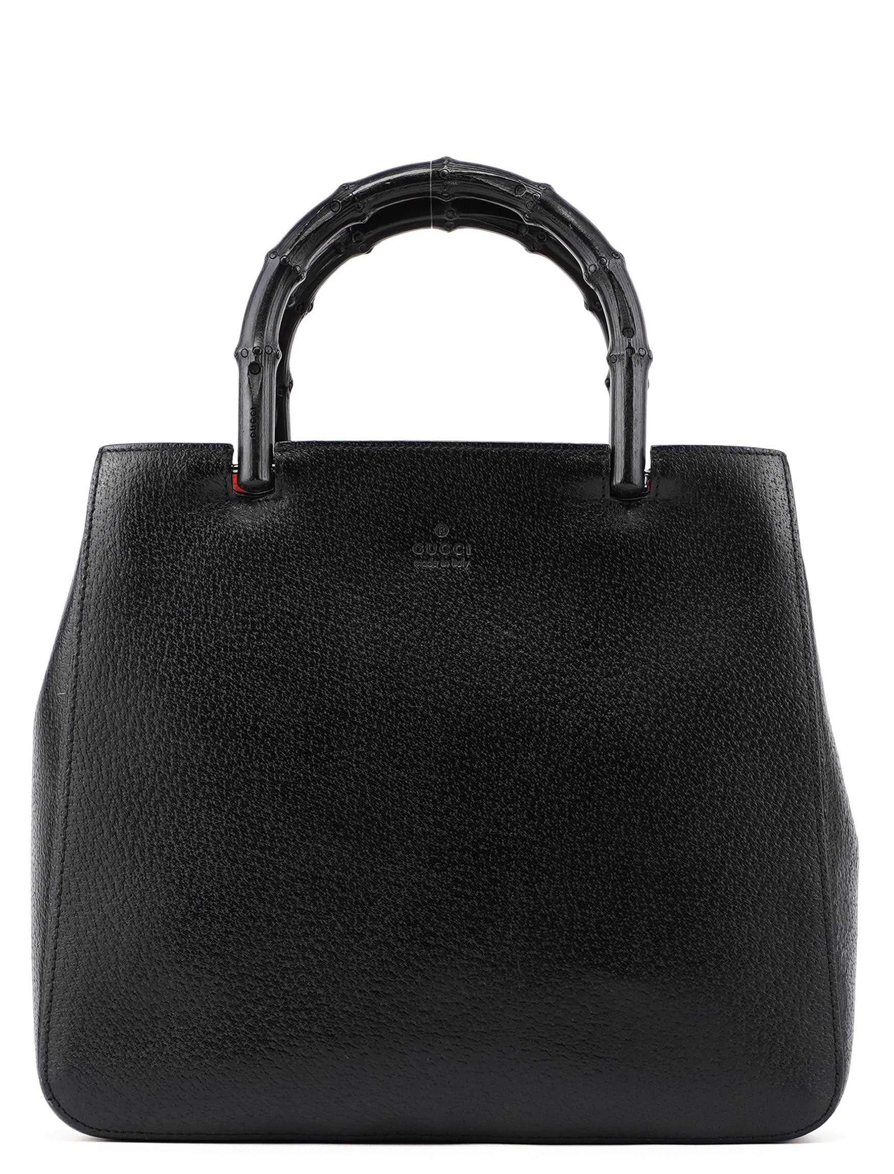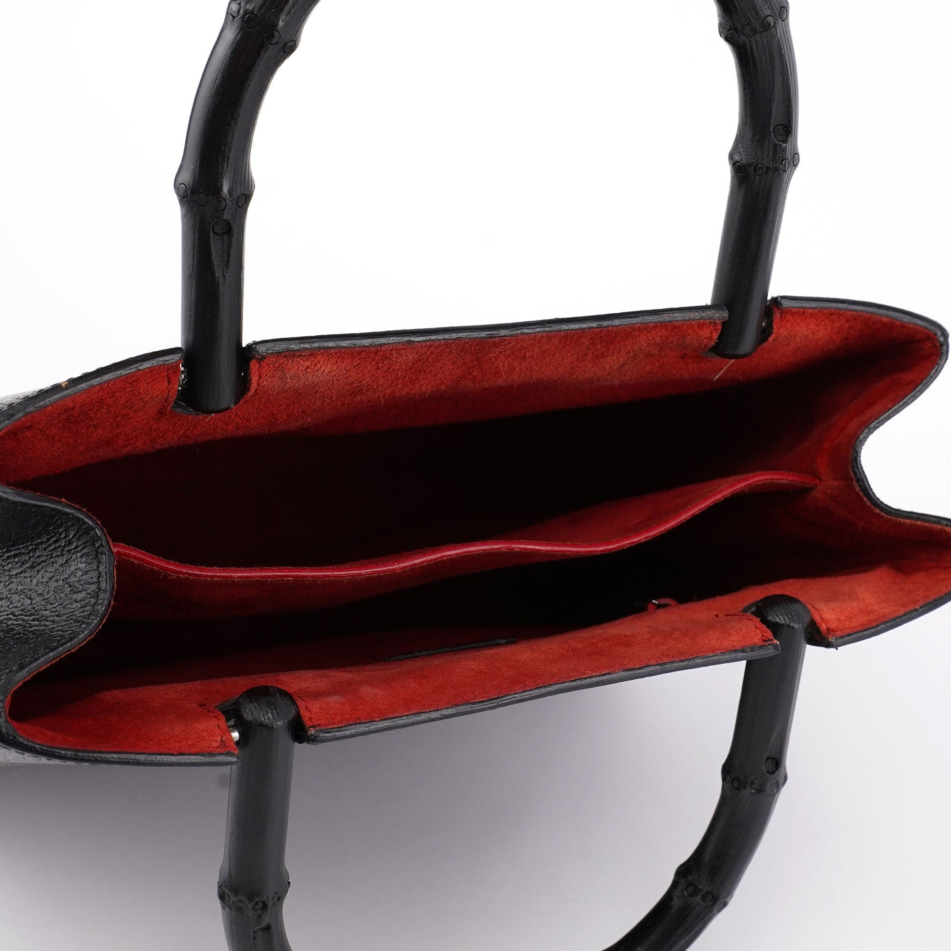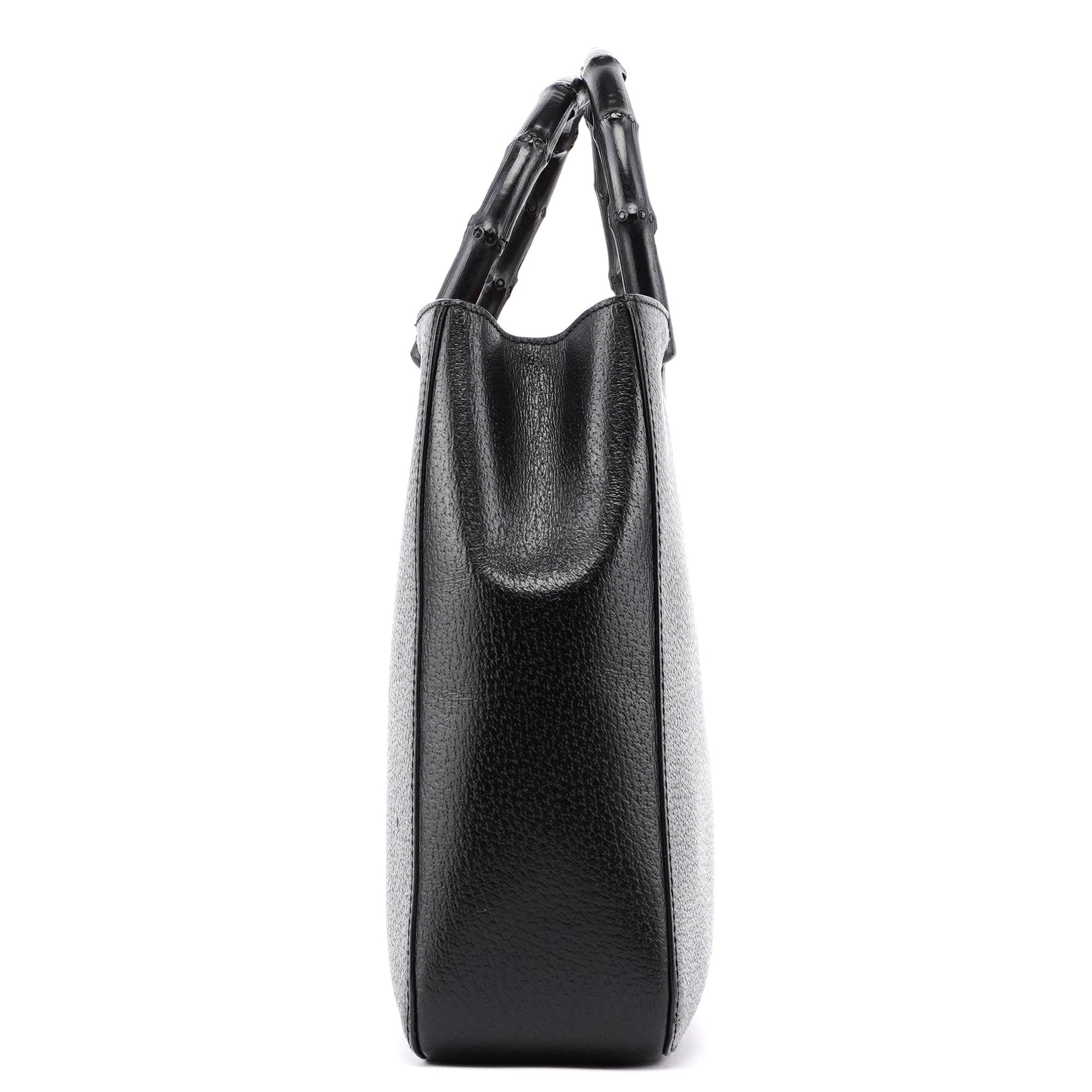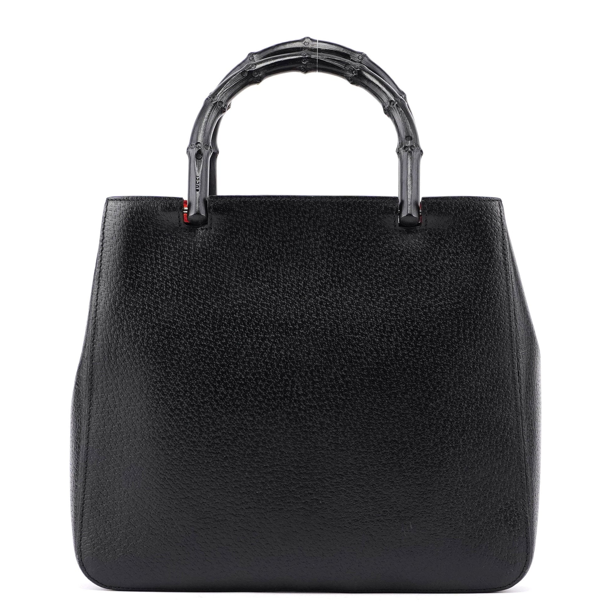 Designed by Tom Ford in the late '90s, this Gucci Bamboo tote bag handcrafted in black leather features bamboo handles. The two interior compartments, lined with red suede and include a zipper pocket. The Gucci logo embossed at the front highlights its distinguished design.
