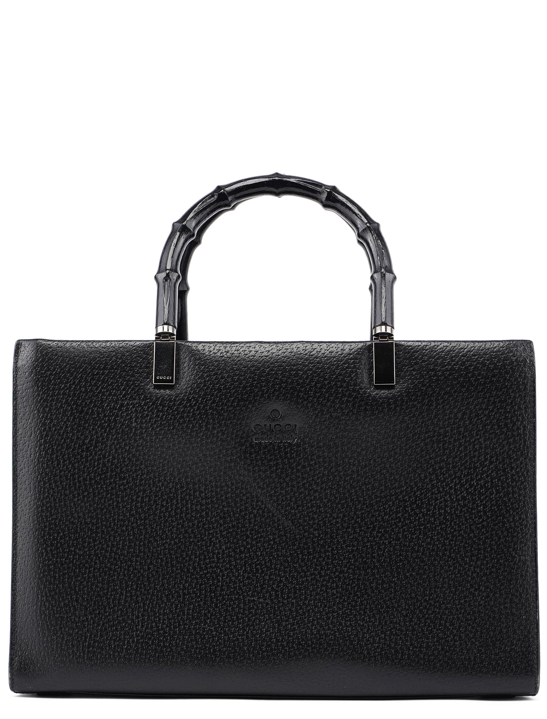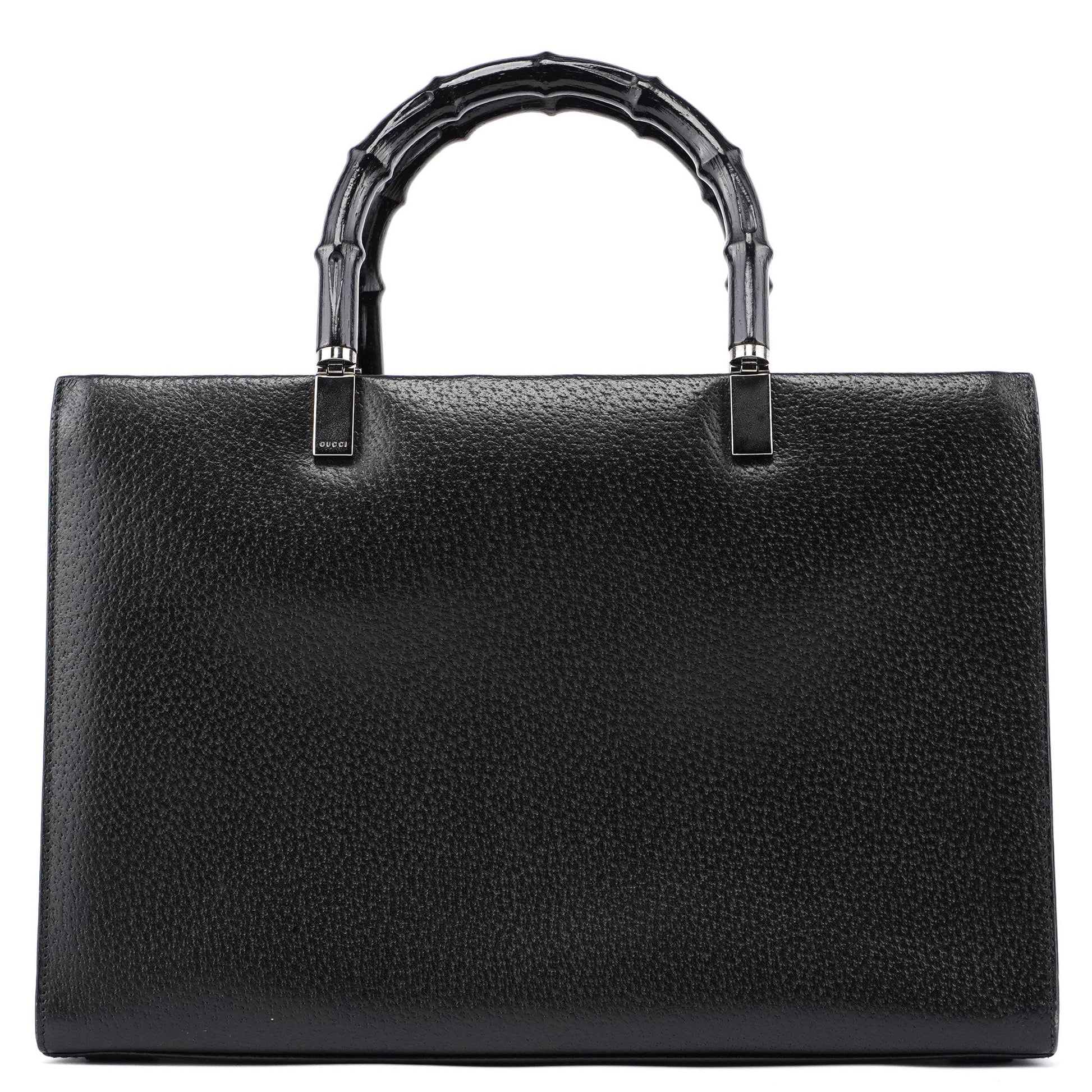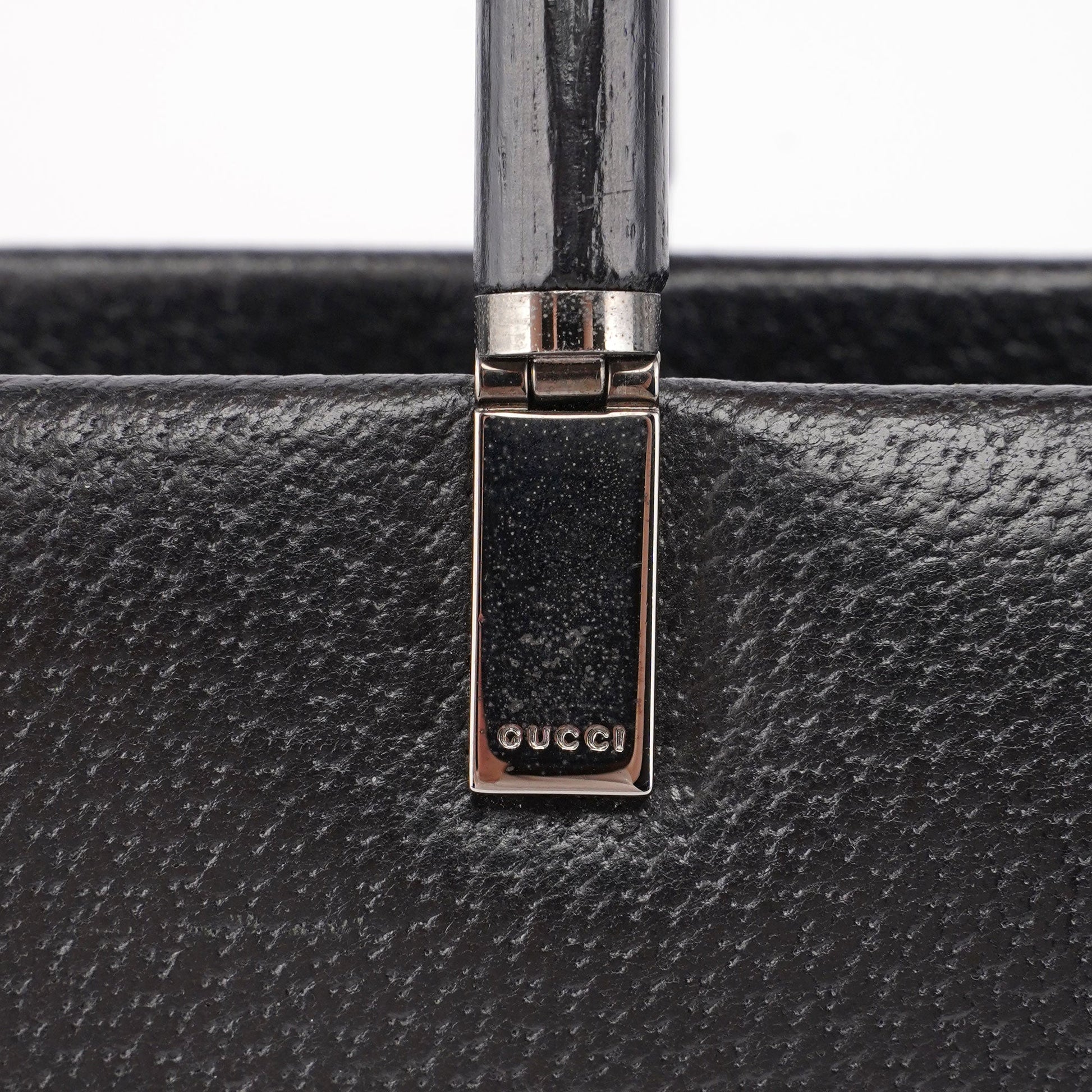 This Gucci Bamboo tote bag, a late 1990s creation by Tom Ford, is crafted from black leather, it features silver-tone hardware with Gucci logo engraving. It boasts bamboo handles, with provisions for attaching a crossbody strap. The bag's clip closure secures the interior, lined with calfskin leather, which includes two pockets. The Gucci logo, embossed on the front, marks this piece as a symbol of craftsmanship.