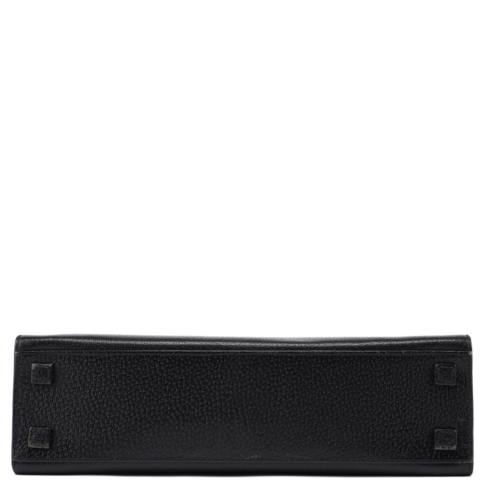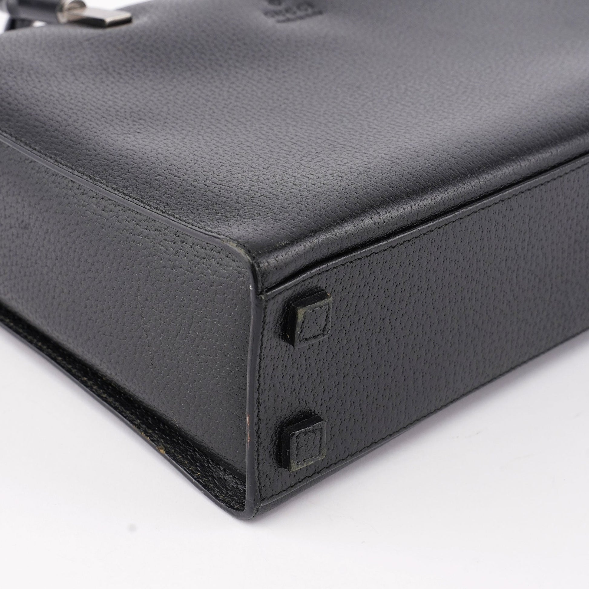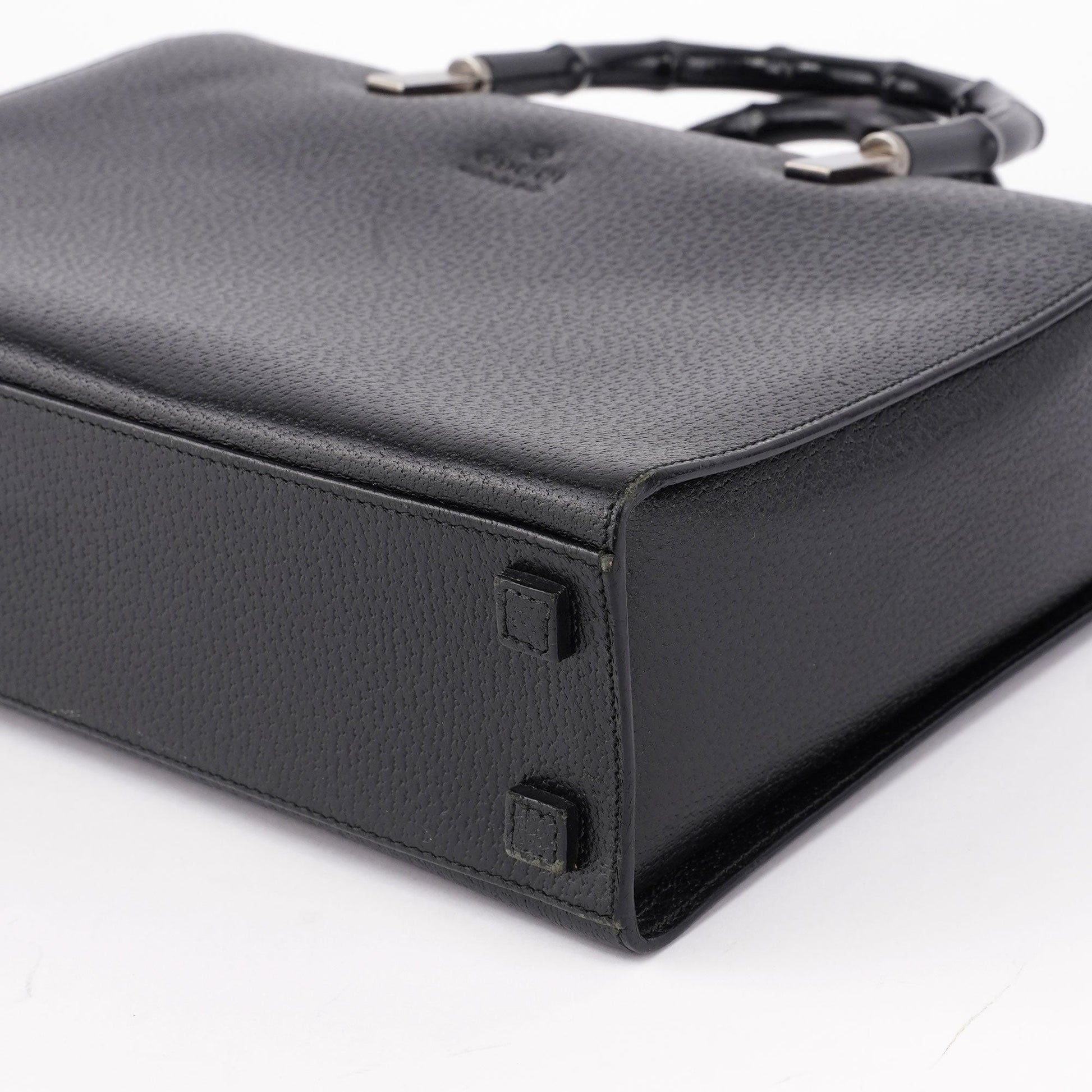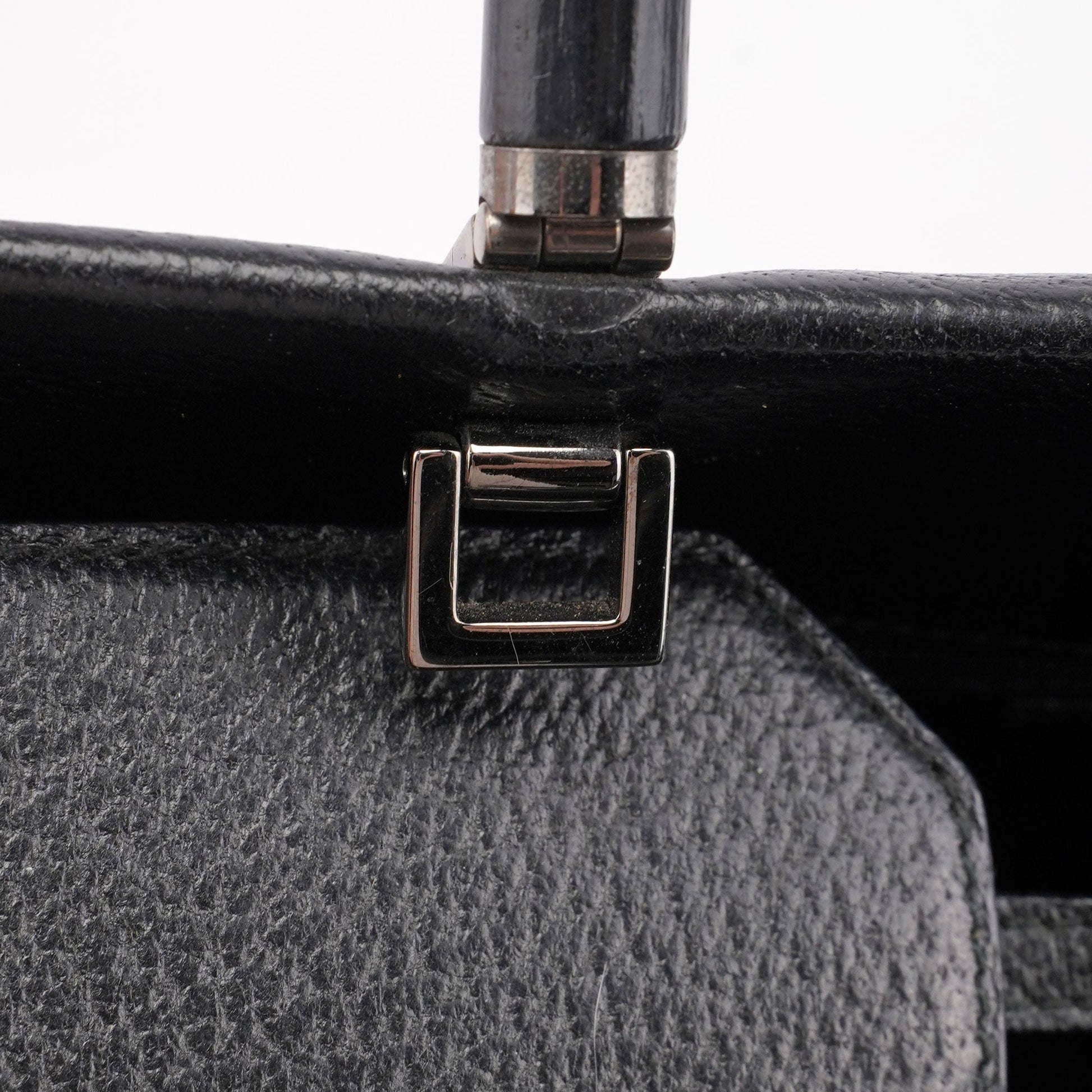 This Gucci Bamboo tote bag, a late 1990s creation by Tom Ford, is crafted from black leather, it features silver-tone hardware with Gucci logo engraving. It boasts bamboo handles, with provisions for attaching a crossbody strap. The bag's clip closure secures the interior, lined with calfskin leather, which includes two pockets. The Gucci logo, embossed on the front, marks this piece as a symbol of craftsmanship.