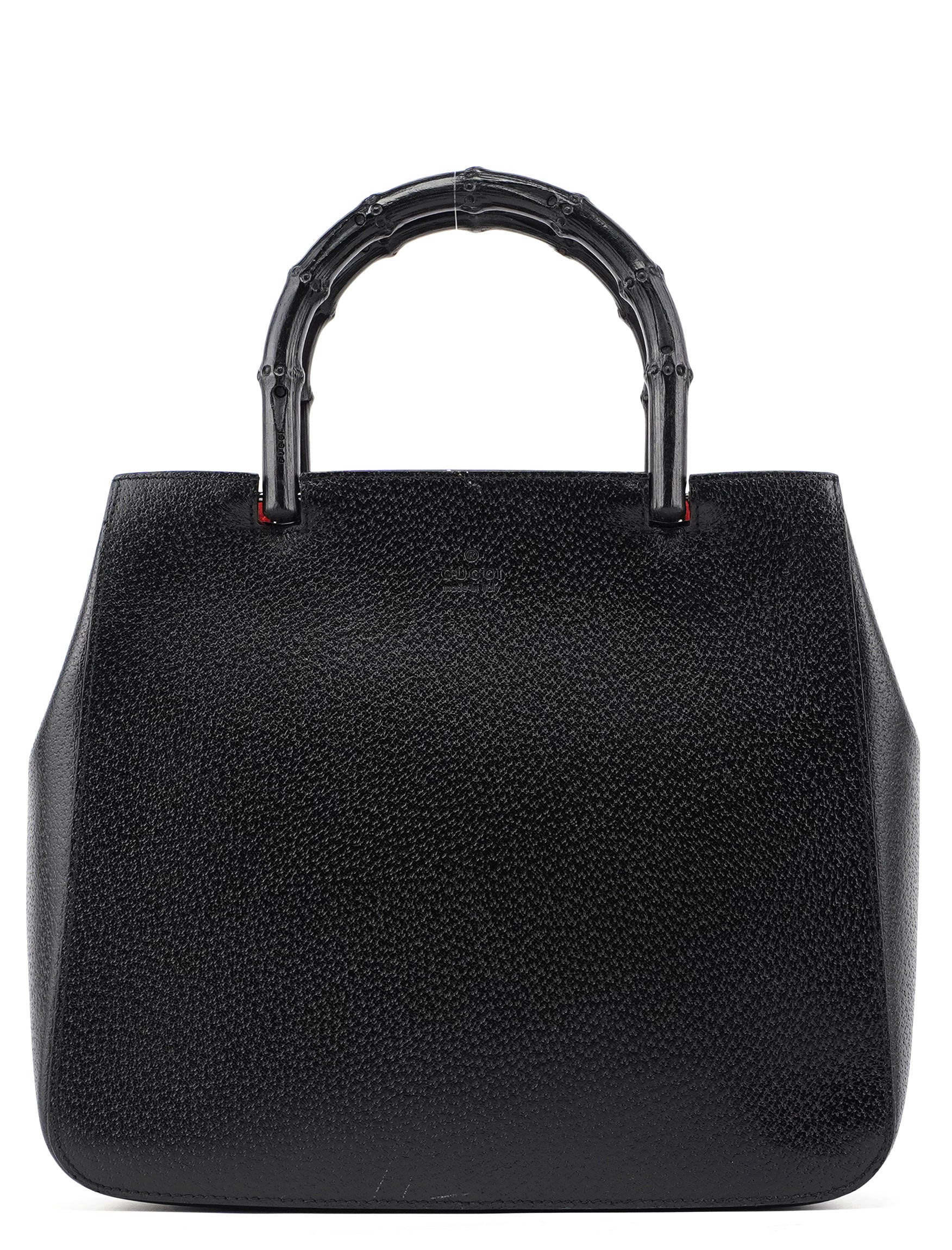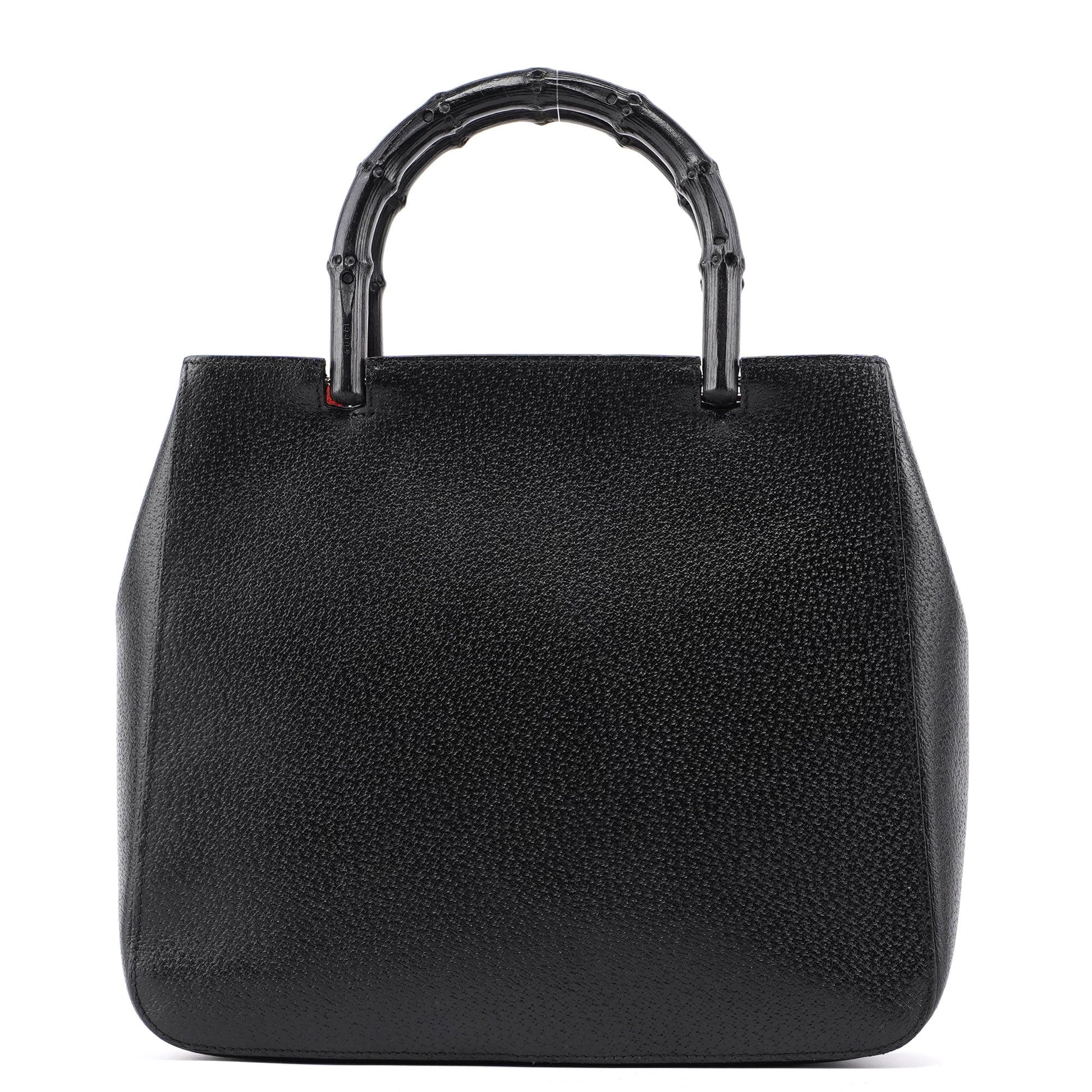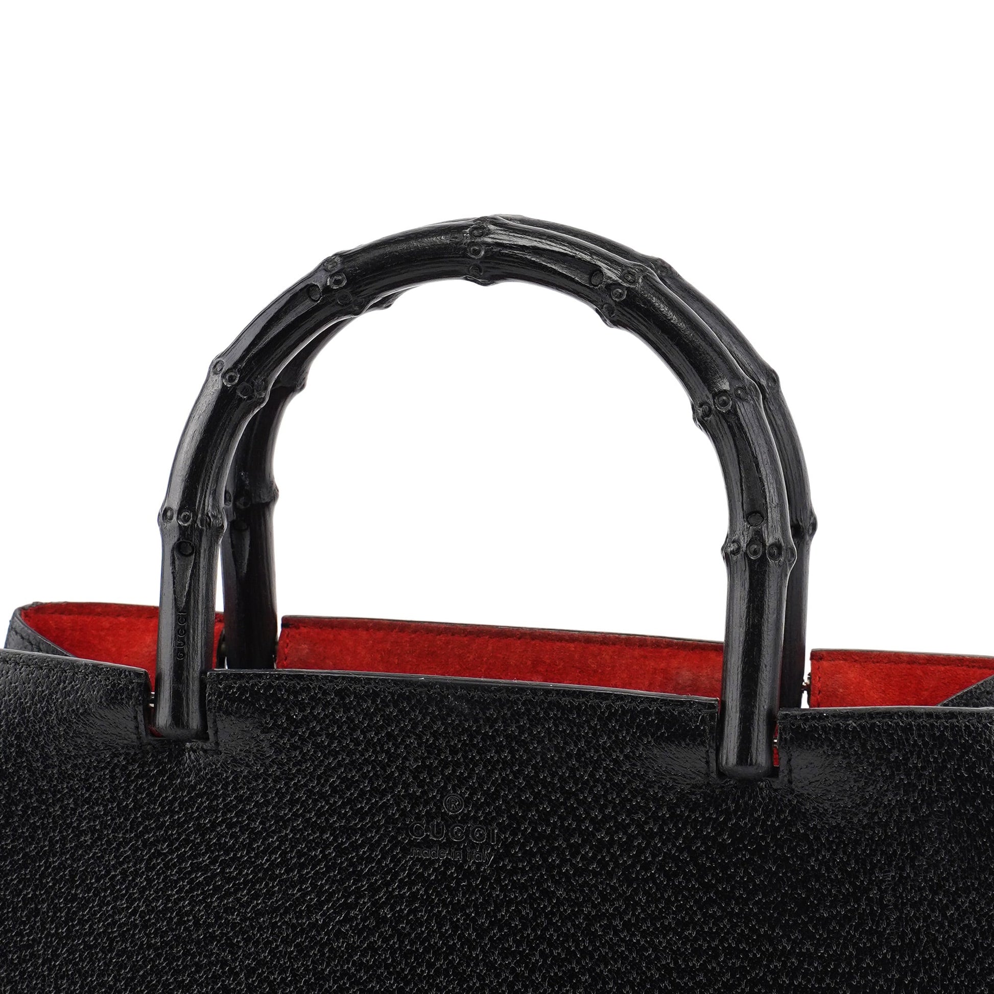 Designed by Tom Ford in the late '90s, this Gucci Bamboo tote bag handcrafted in black leather features bamboo handles. The two interior compartments, lined with red suede and include a zipper pocket. The Gucci logo embossed at the front highlights its distinguished design.