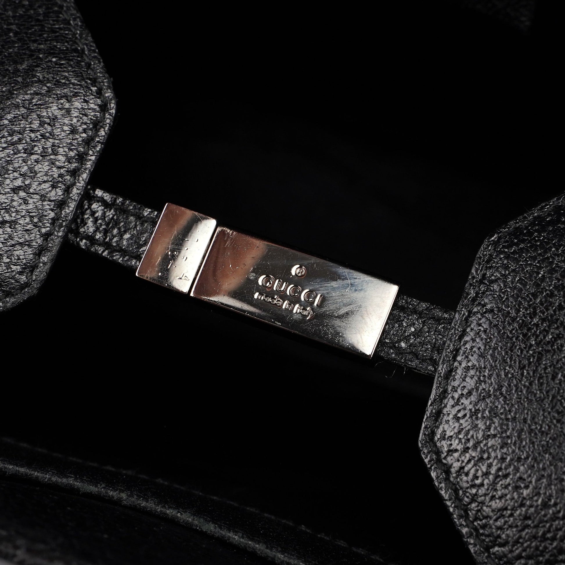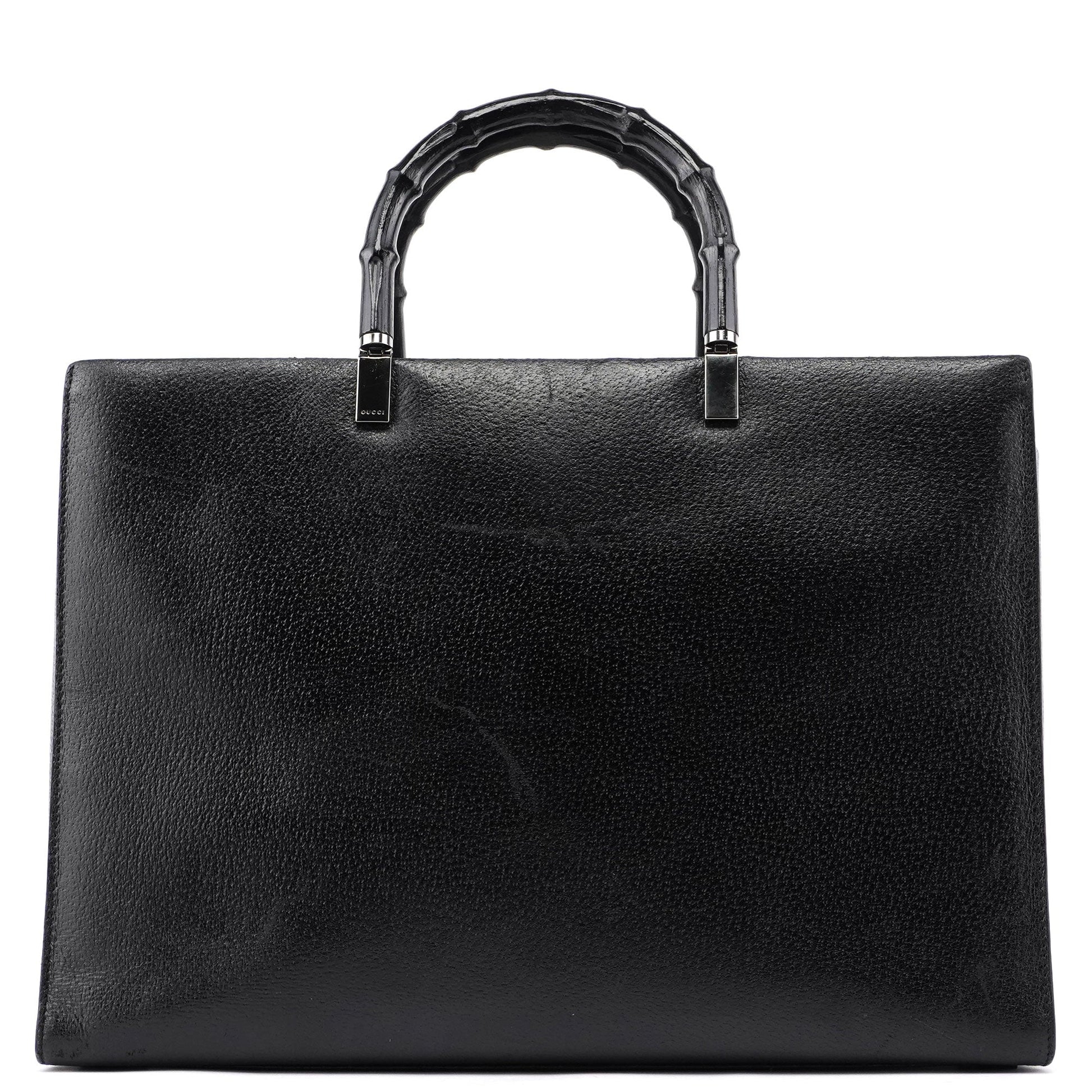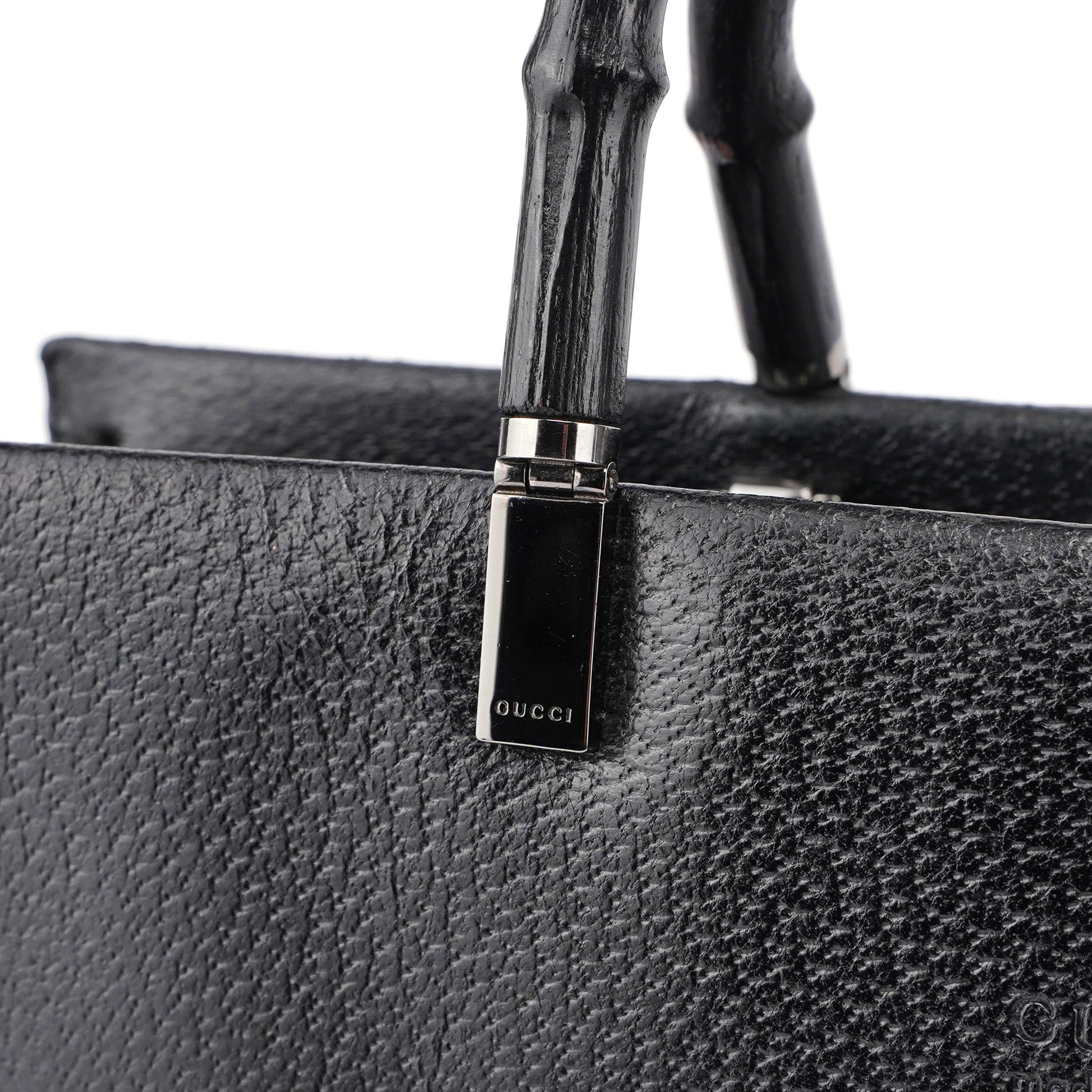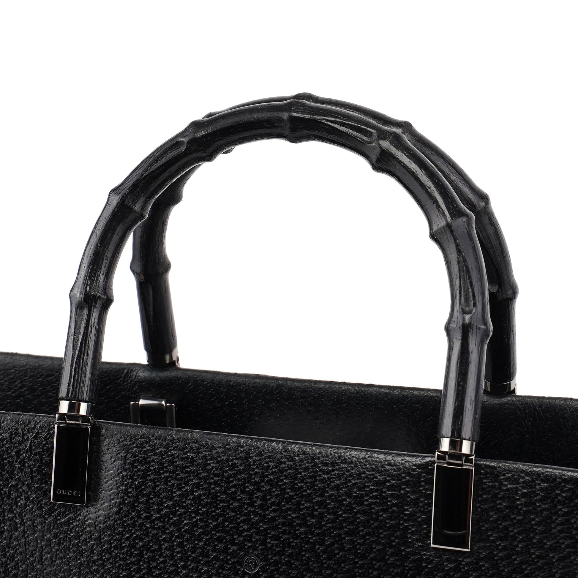 This Gucci Bamboo tote bag, designed by Tom Ford in the late 1990s, is crafted from textured black leather, and features silver-tone hardware with Gucci logo engraving, bamboo handles, and provisions for attaching a crossbody strap. The bag's clip closure secures the contents, the interior is lined with calfskin leather and includes two pockets. The Gucci logo is embossed on the front.