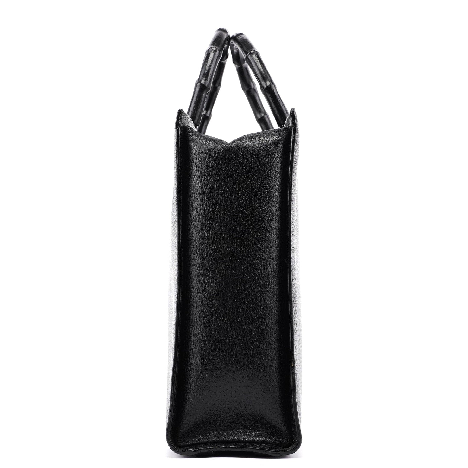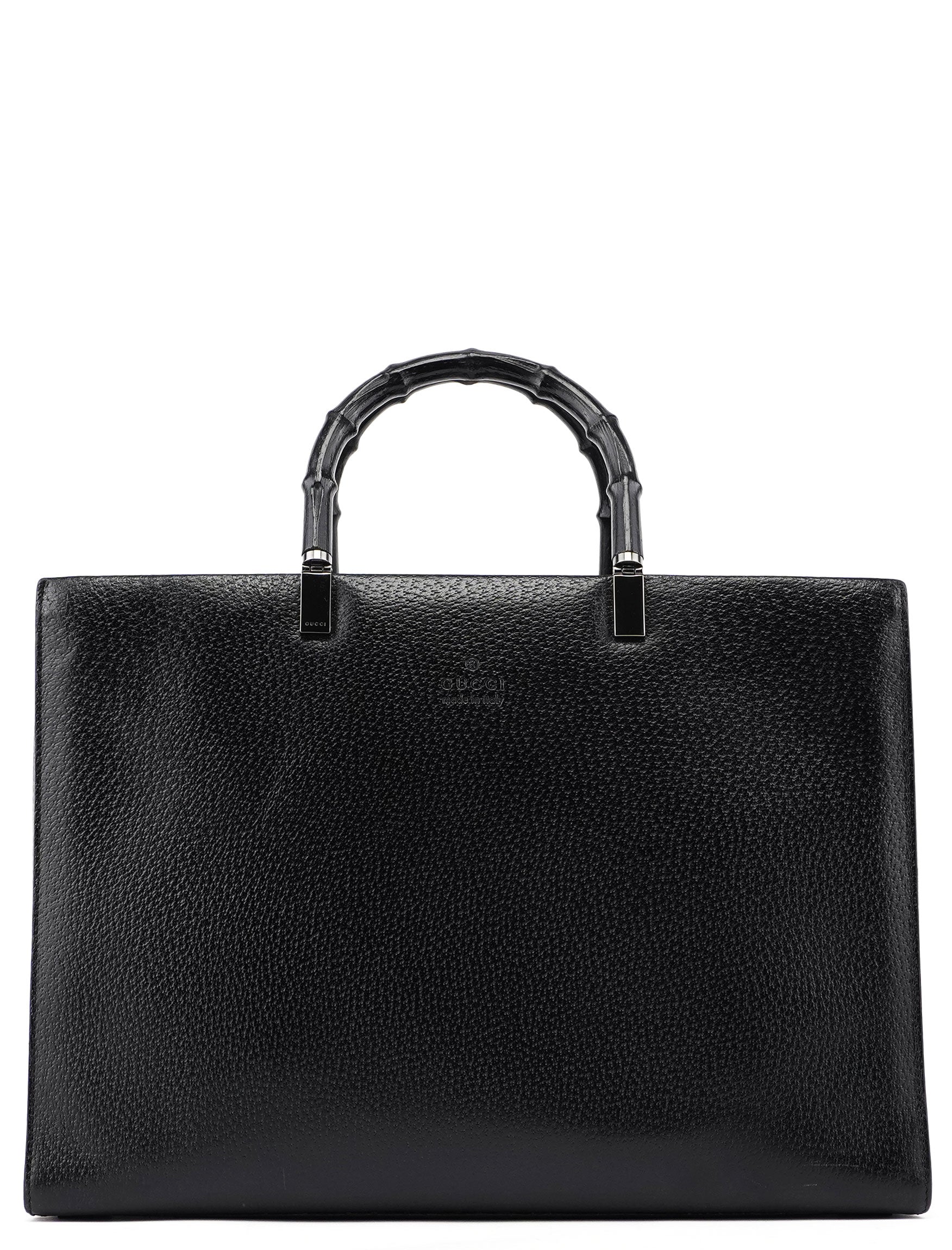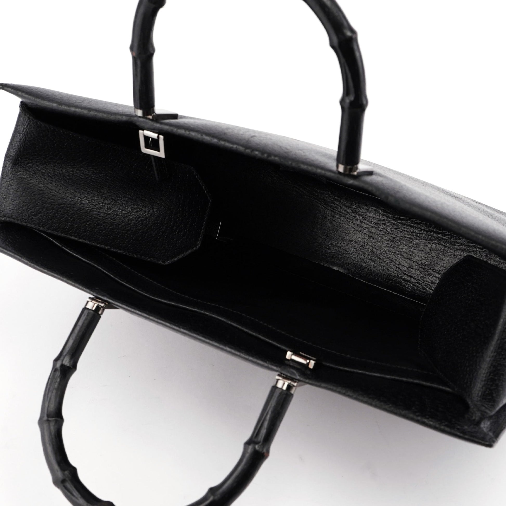 This Gucci Bamboo tote bag, designed by Tom Ford in the late 1990s, is crafted from textured black leather, and features silver-tone hardware with Gucci logo engraving, bamboo handles, and provisions for attaching a crossbody strap. The bag's clip closure secures the contents, the interior is lined with calfskin leather and includes two pockets. The Gucci logo is embossed on the front.
