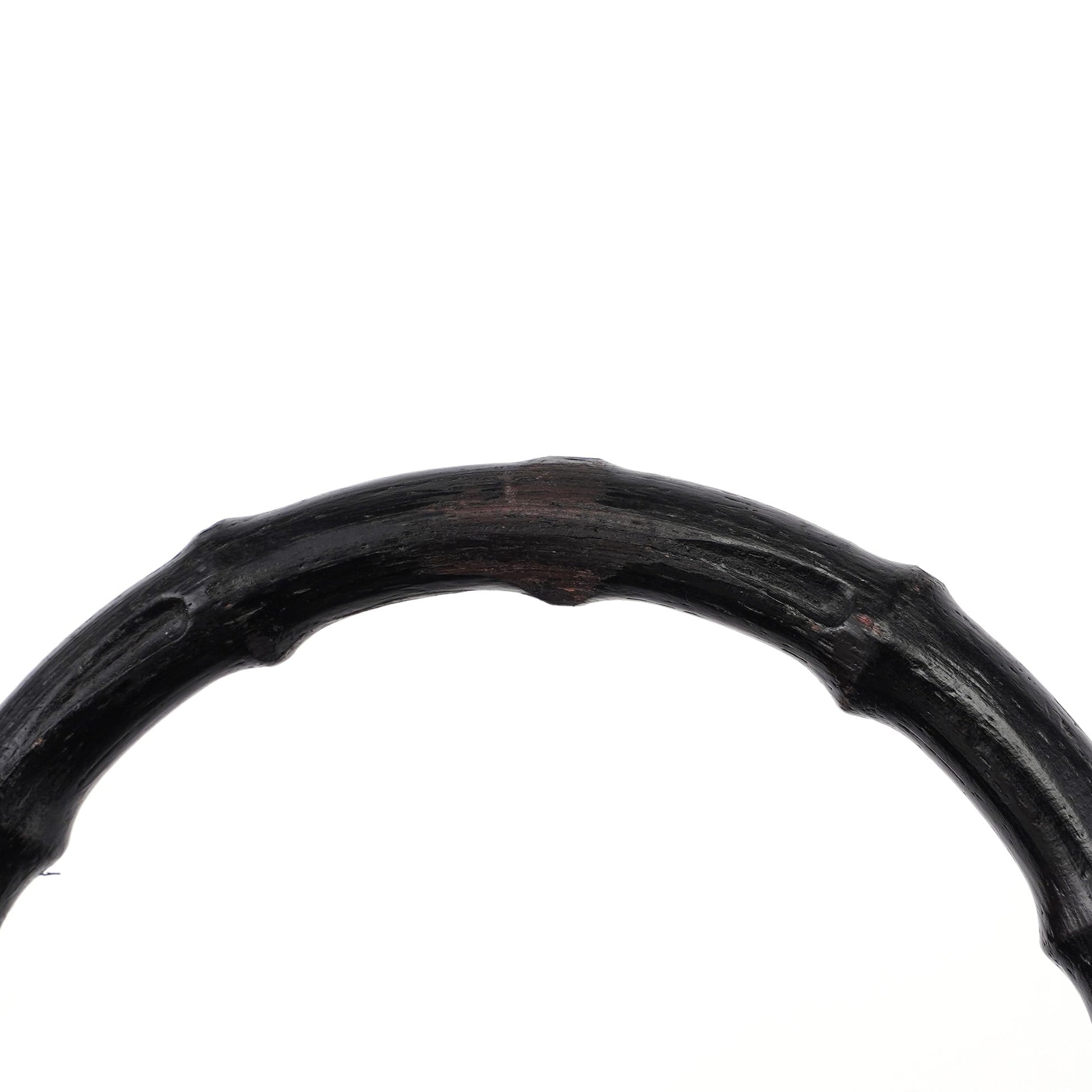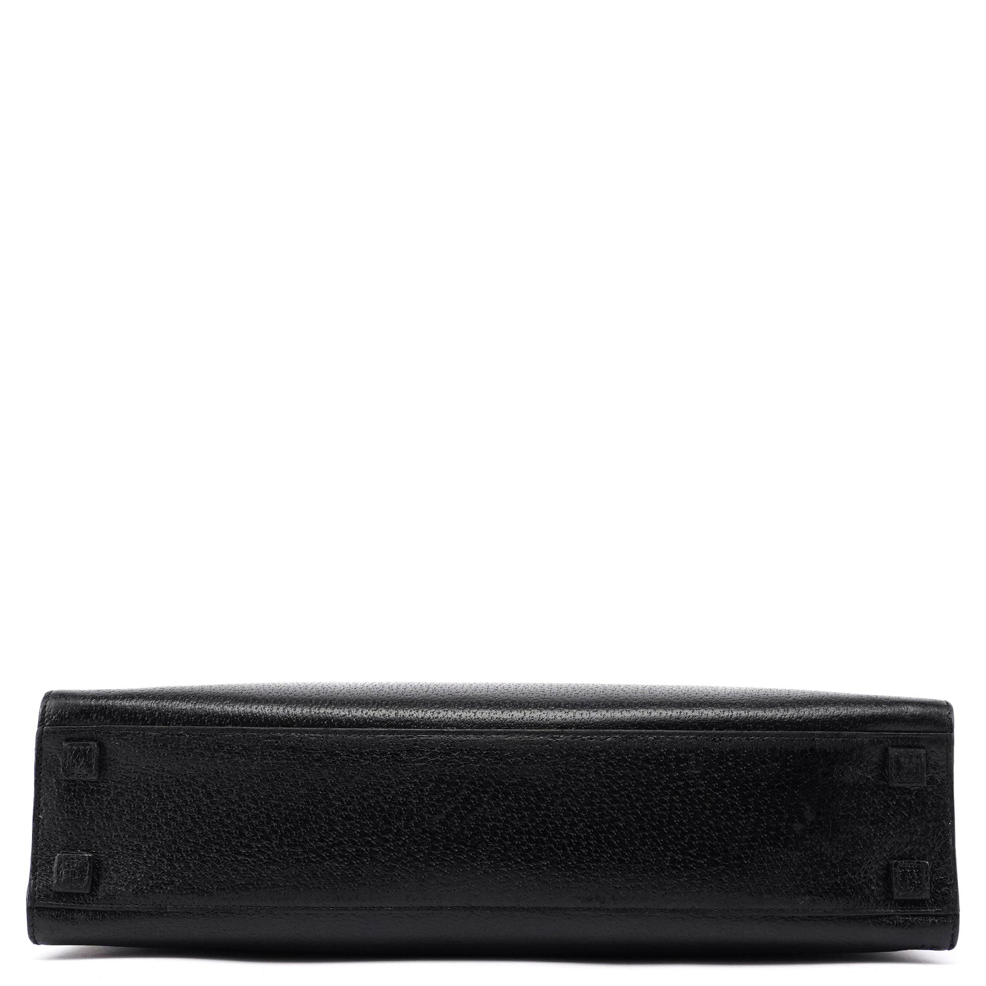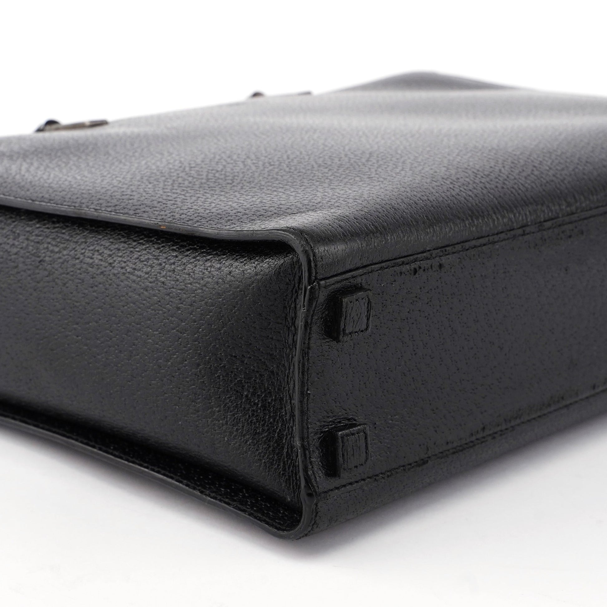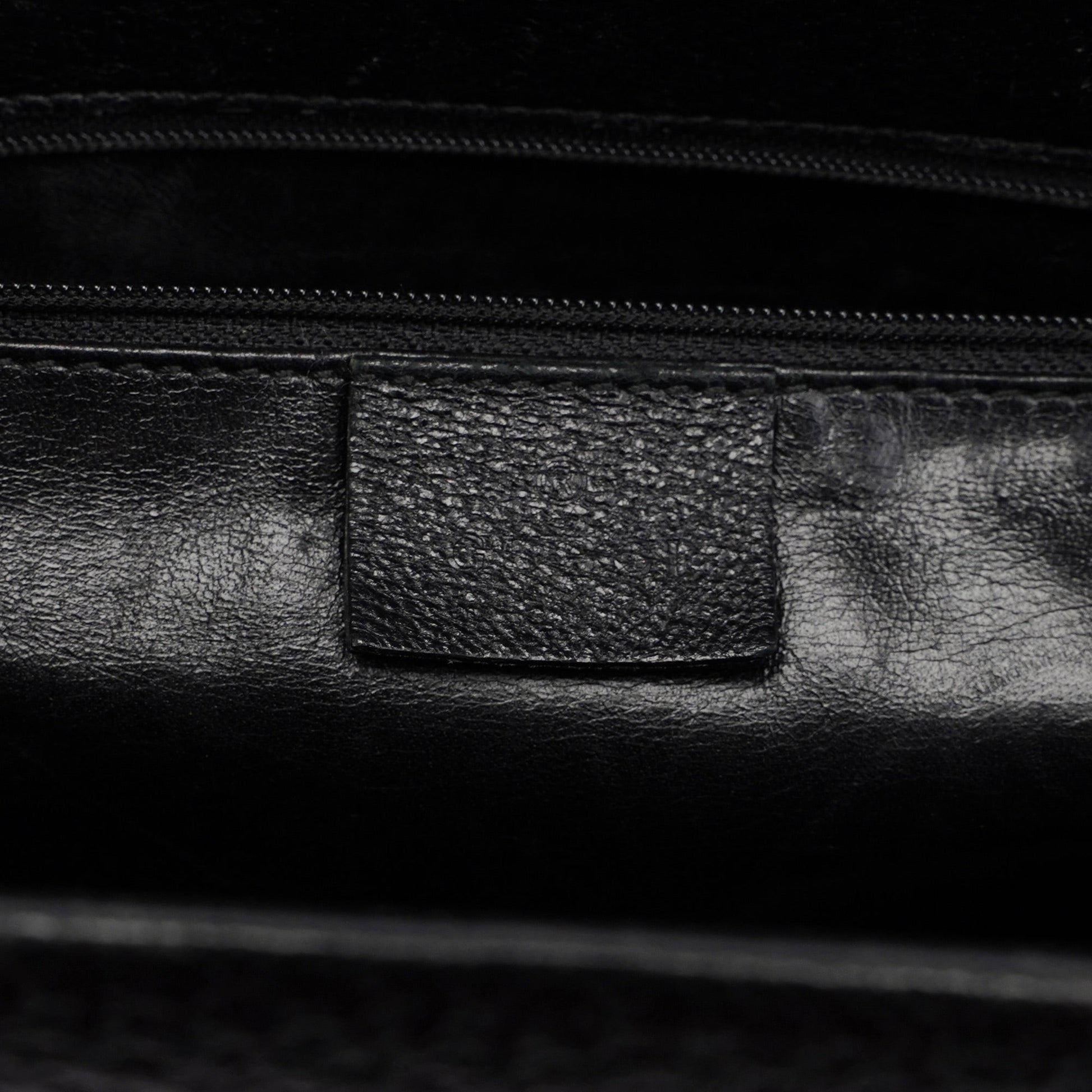 This Gucci Bamboo tote bag, designed by Tom Ford in the late 1990s, is crafted from textured black leather, and features silver-tone hardware with Gucci logo engraving, bamboo handles, and provisions for attaching a crossbody strap. The bag's clip closure secures the contents, the interior is lined with calfskin leather and includes two pockets. The Gucci logo is embossed on the front.
