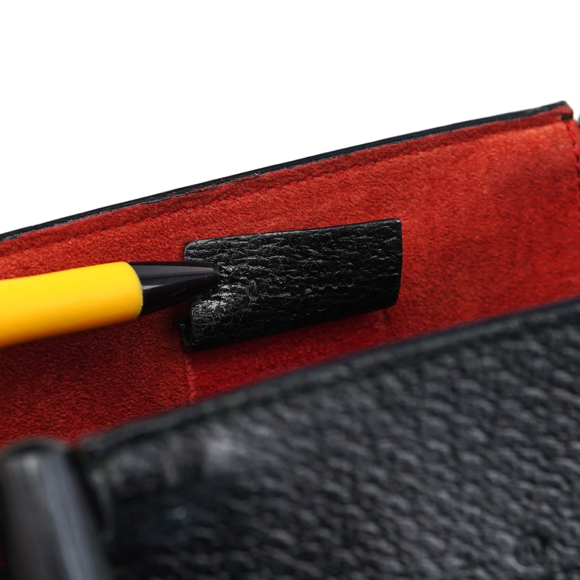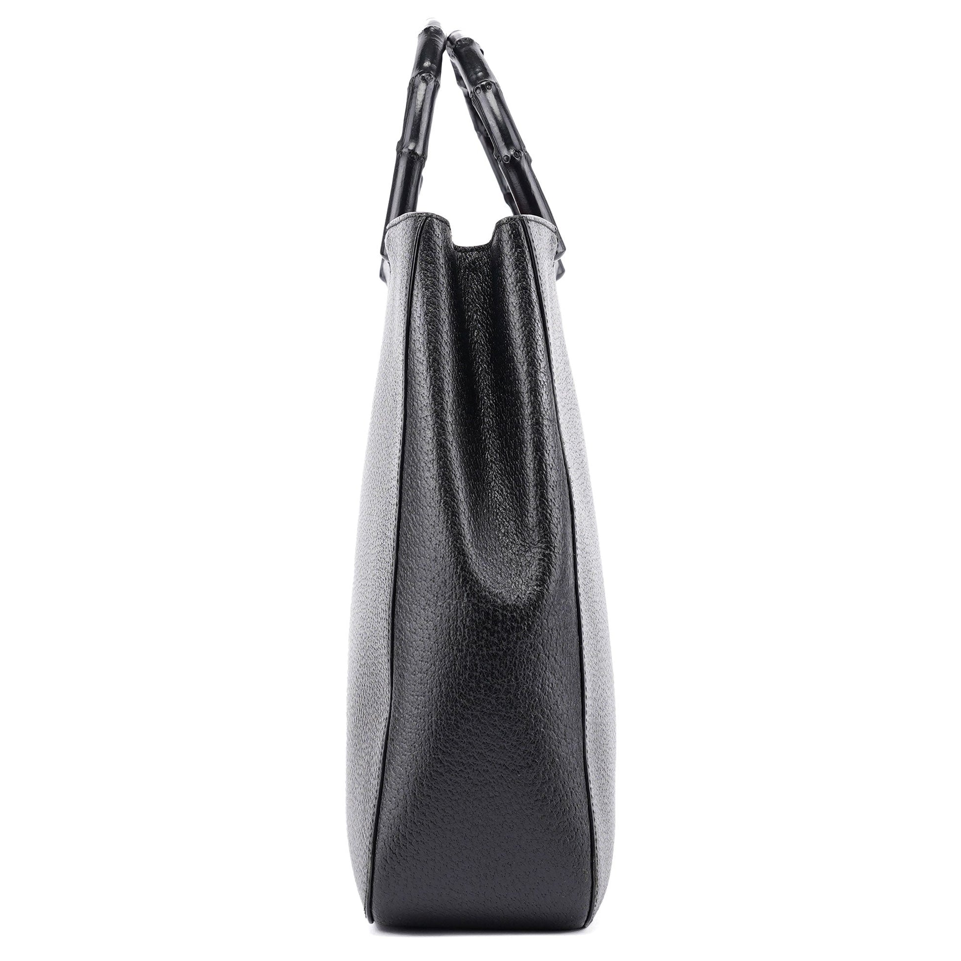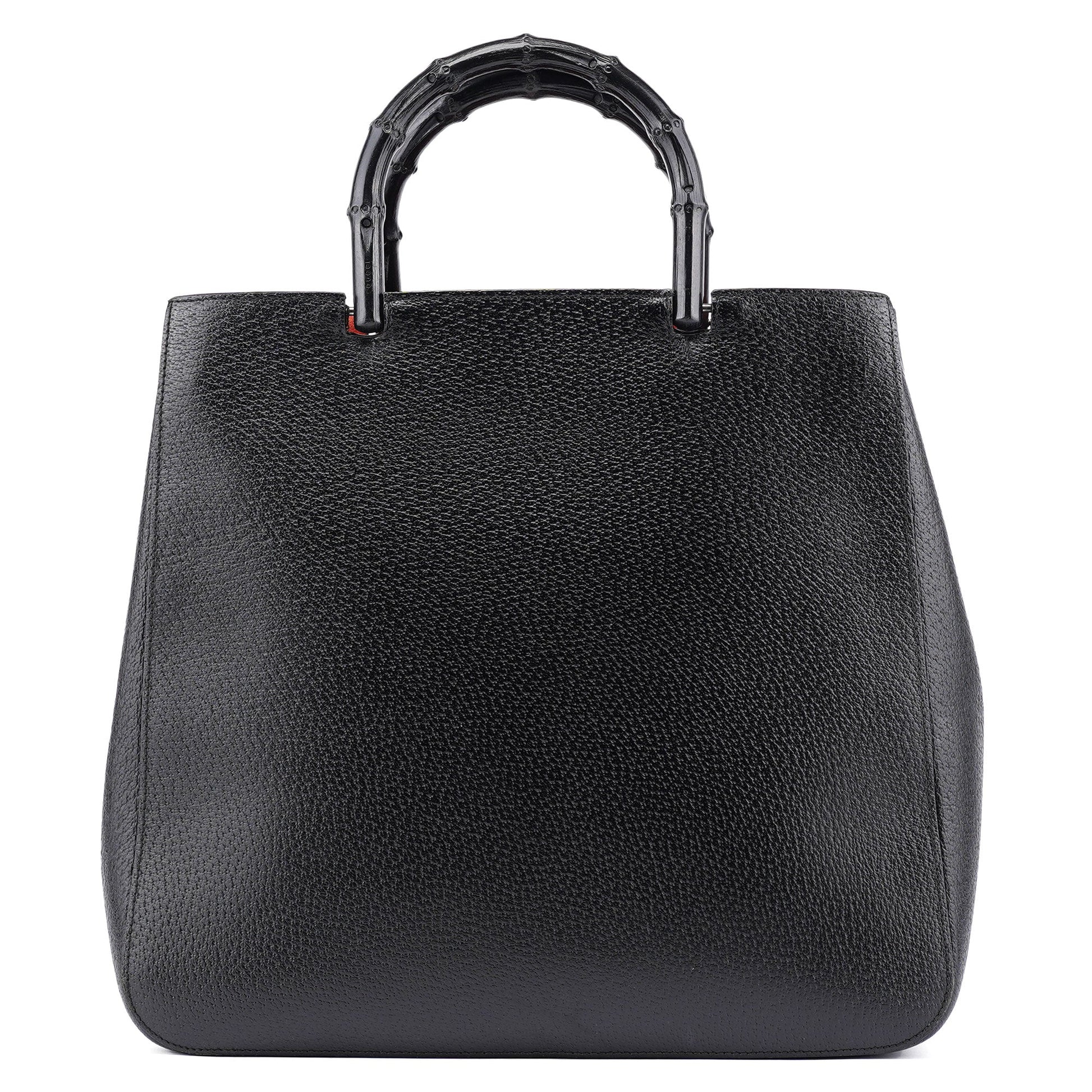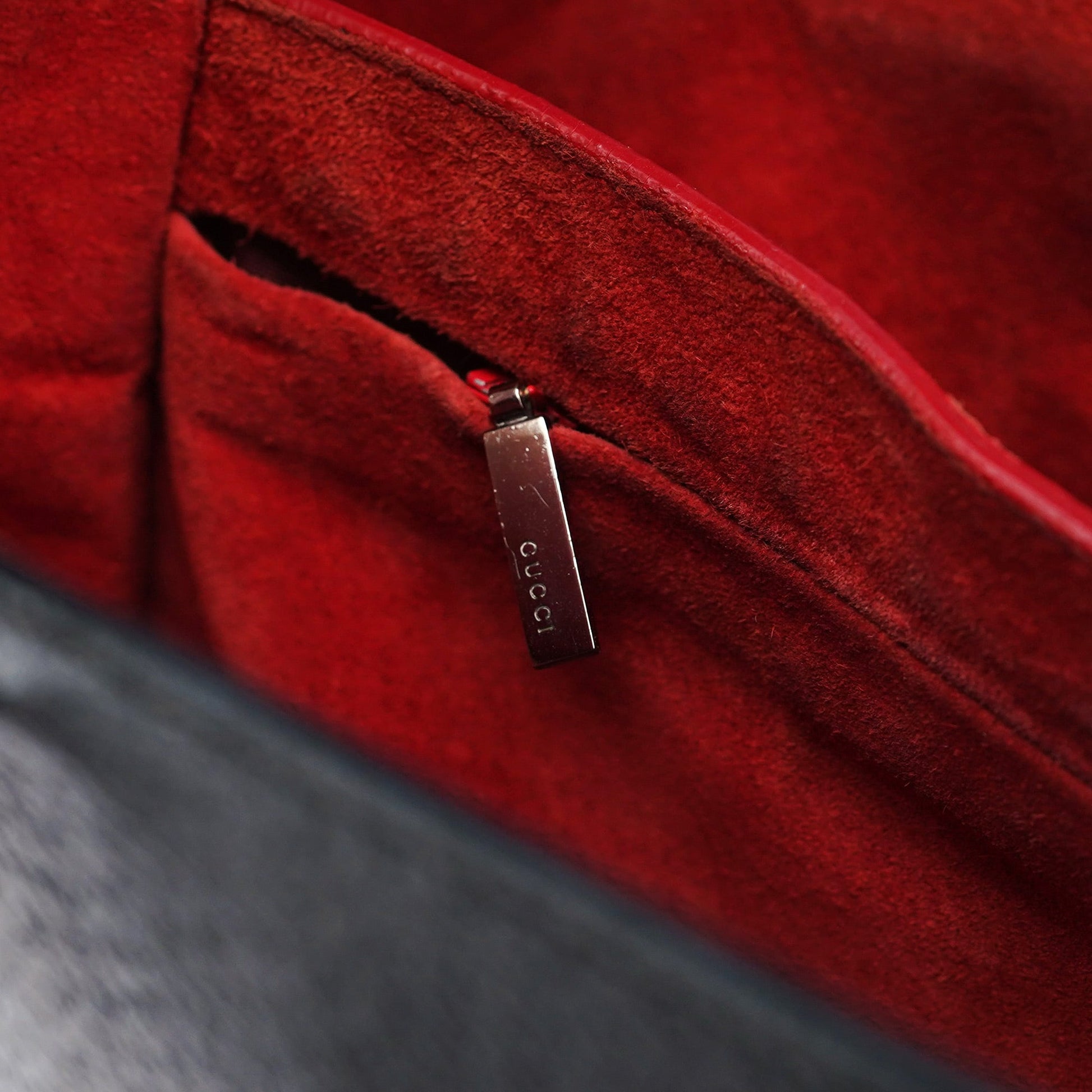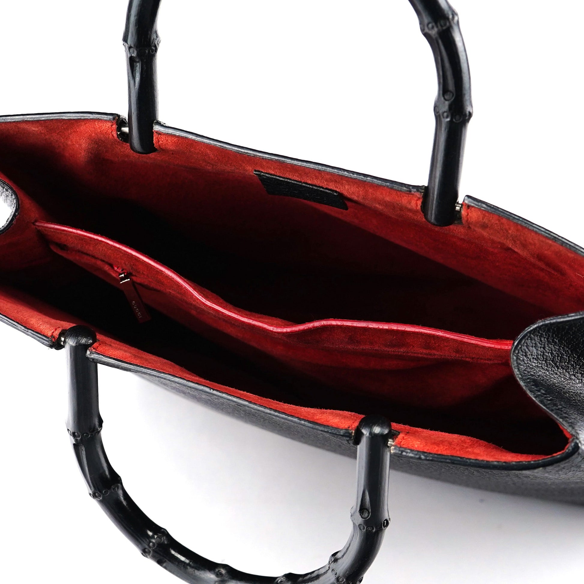 Designed by Tom Ford in the late '90s, this Gucci Bamboo tote bag handcrafted in black leather features two bamboo handles and two compartments. The interior, lined with red suede and including a zipper pocket, adds a bold contrast. The Gucci logo embossed at the front highlights its distinguished design.