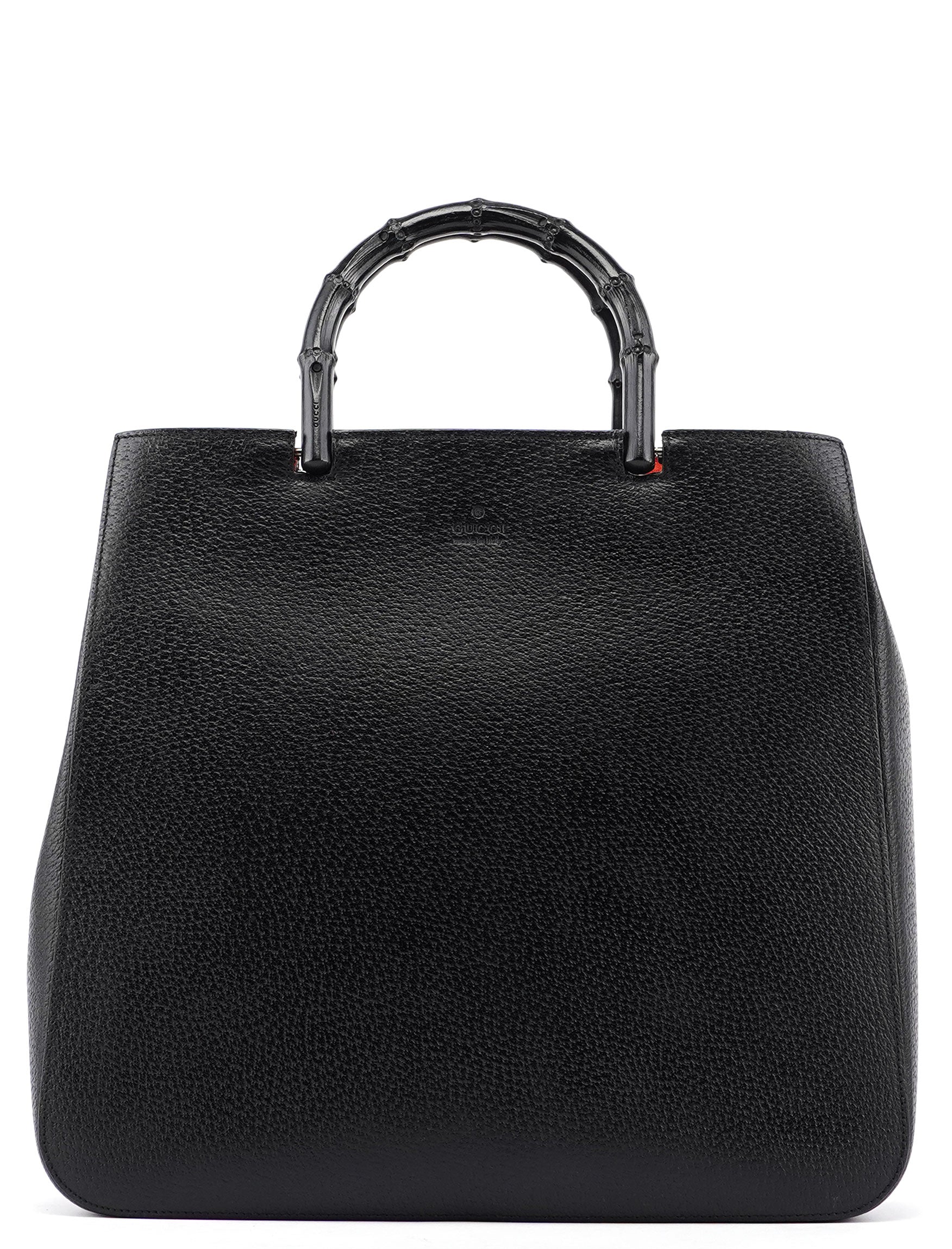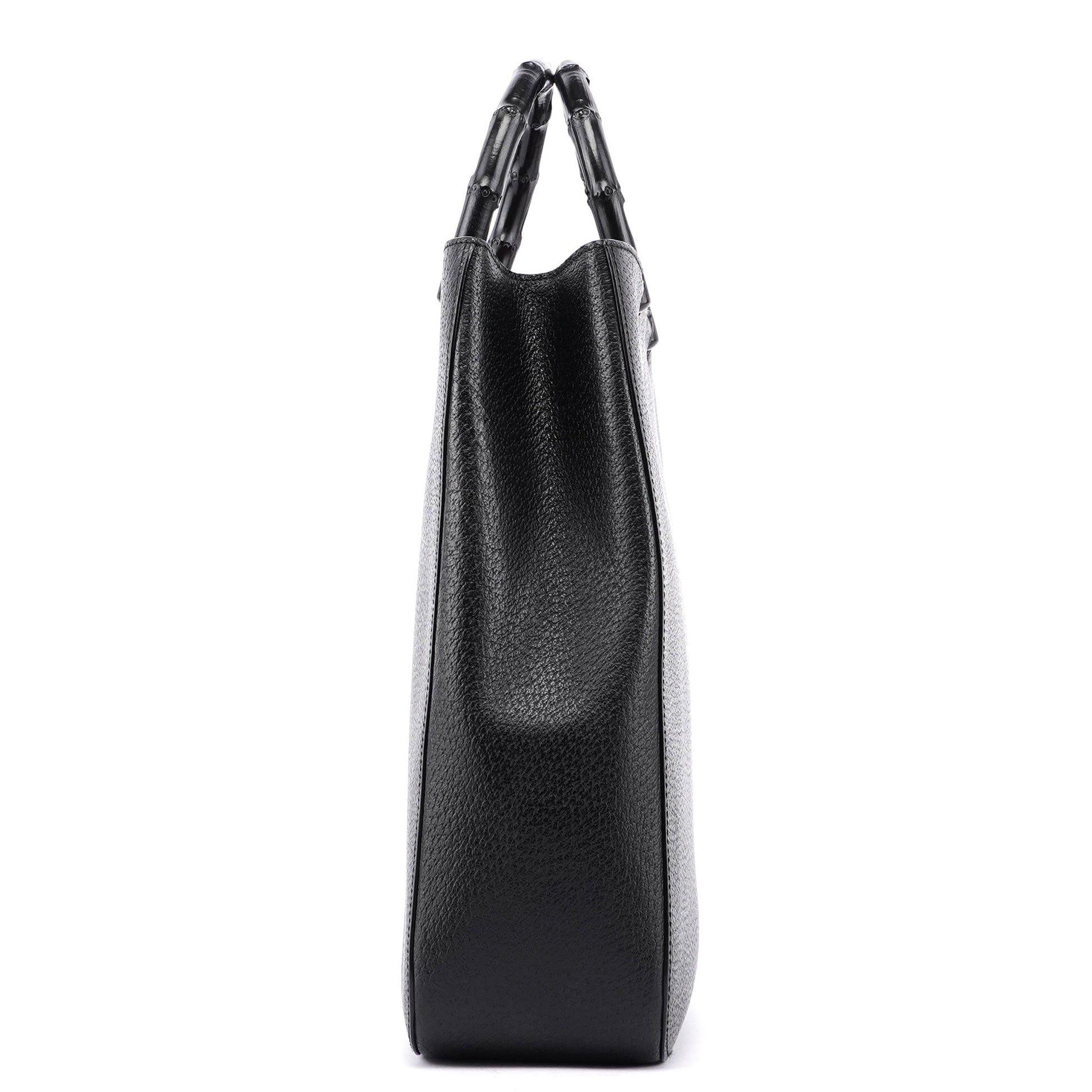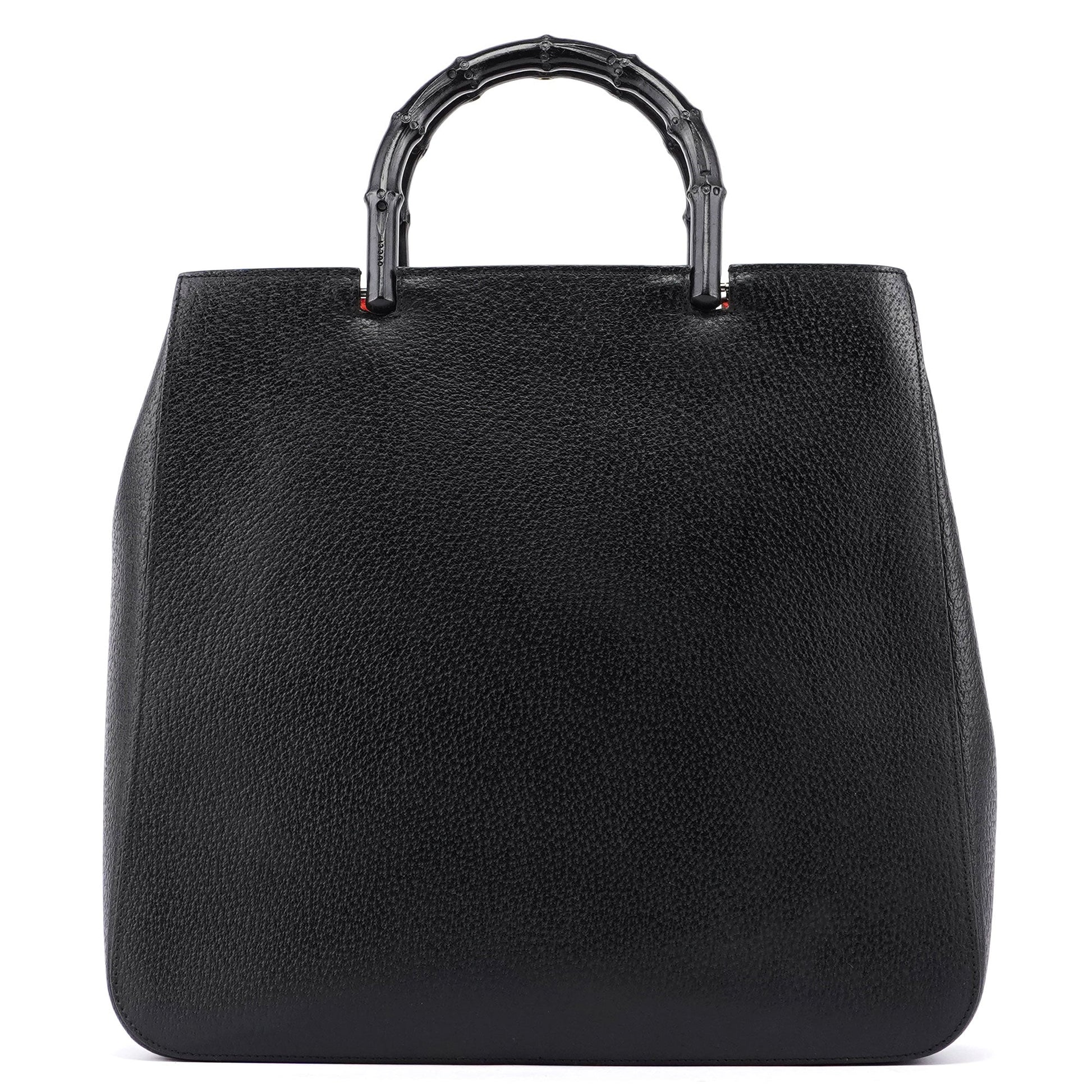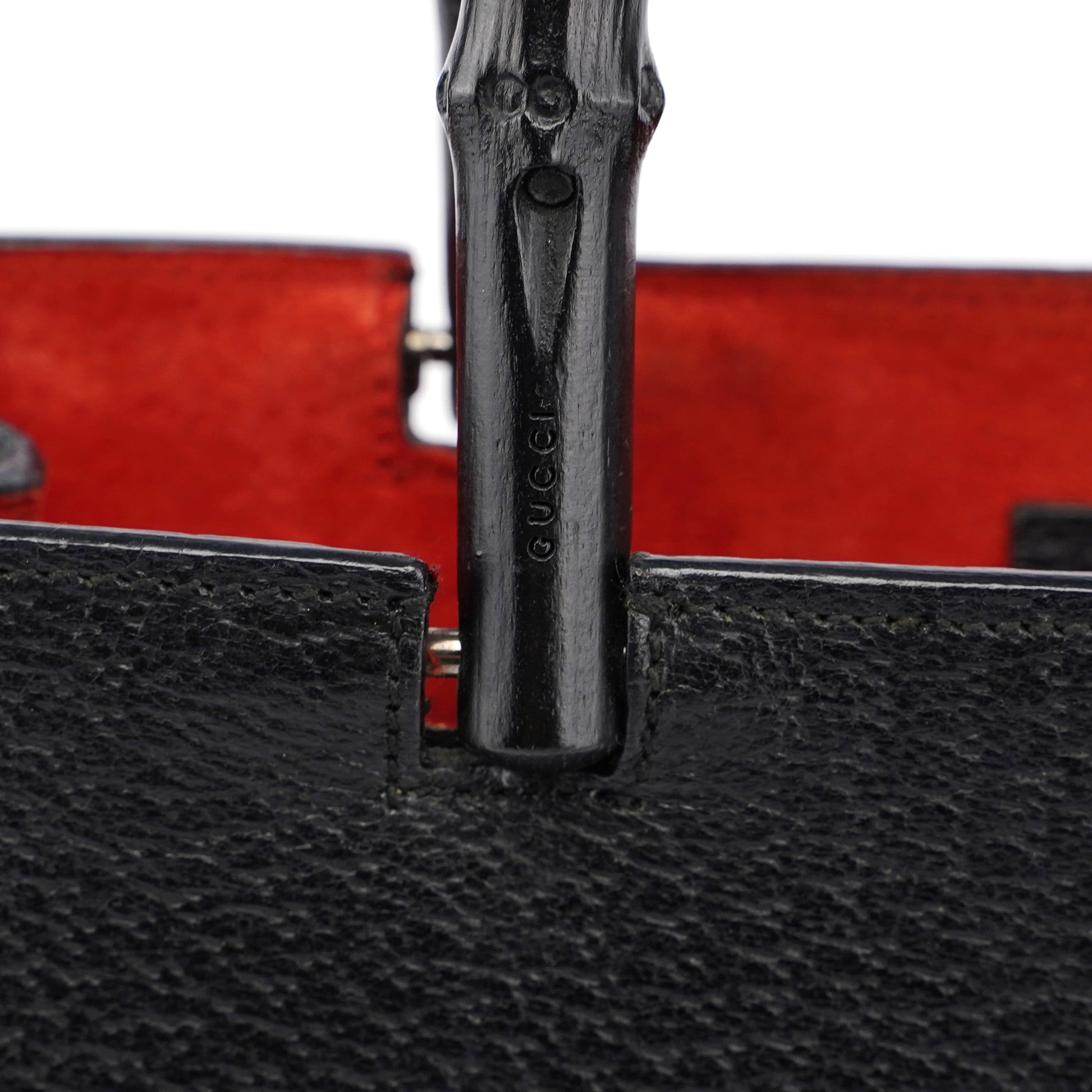 Designed by Tom Ford in the late '90s, this Gucci Bamboo tote bag handcrafted in black leather features two bamboo handles and two compartments. The interior, lined with red suede and including a zipper pocket, adds a bold contrast. The Gucci logo embossed at the front highlights its distinguished design.