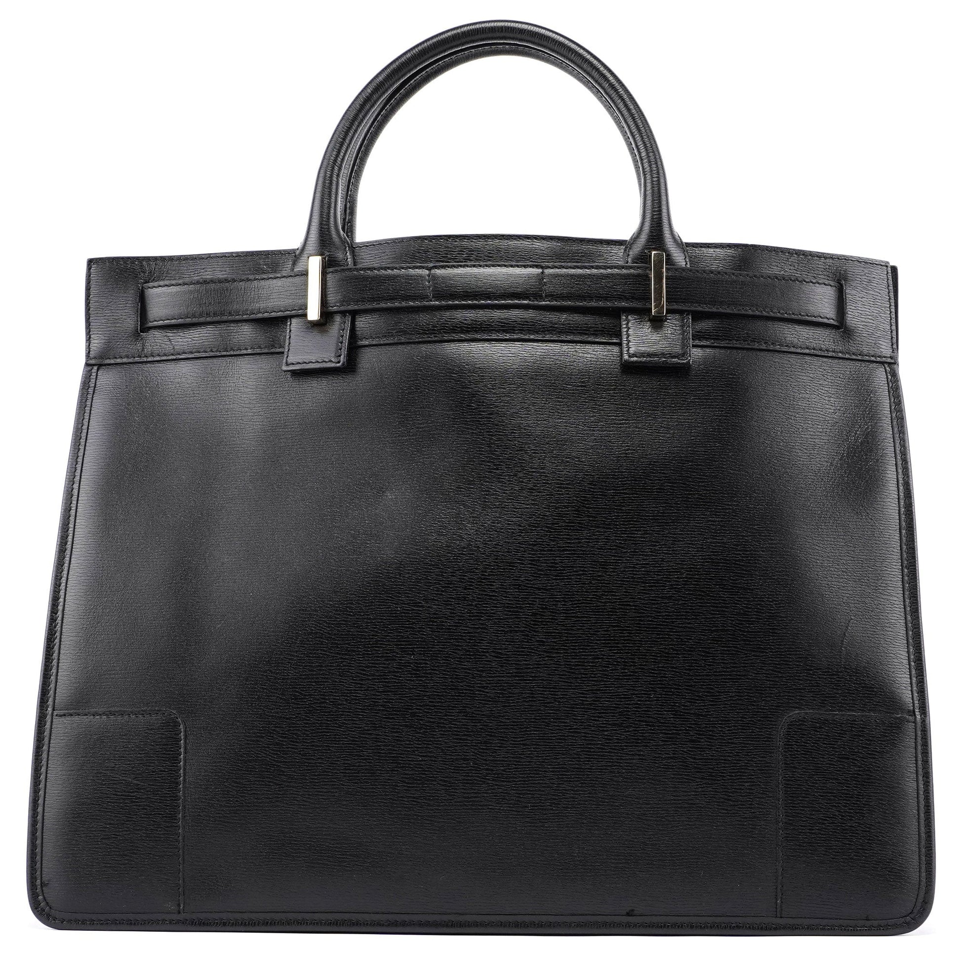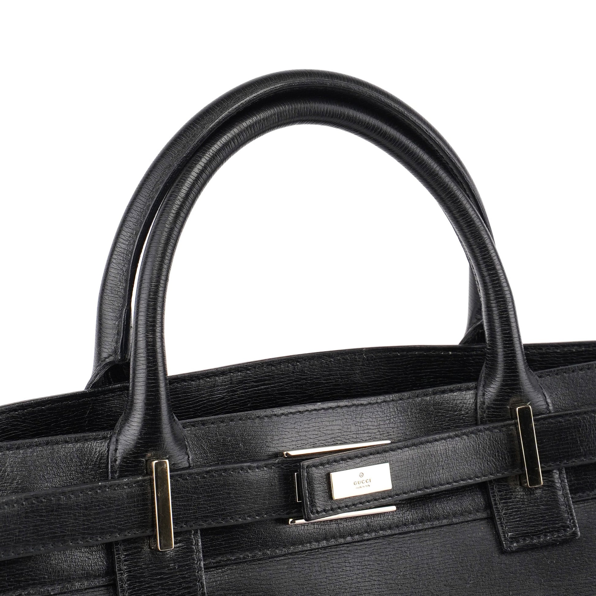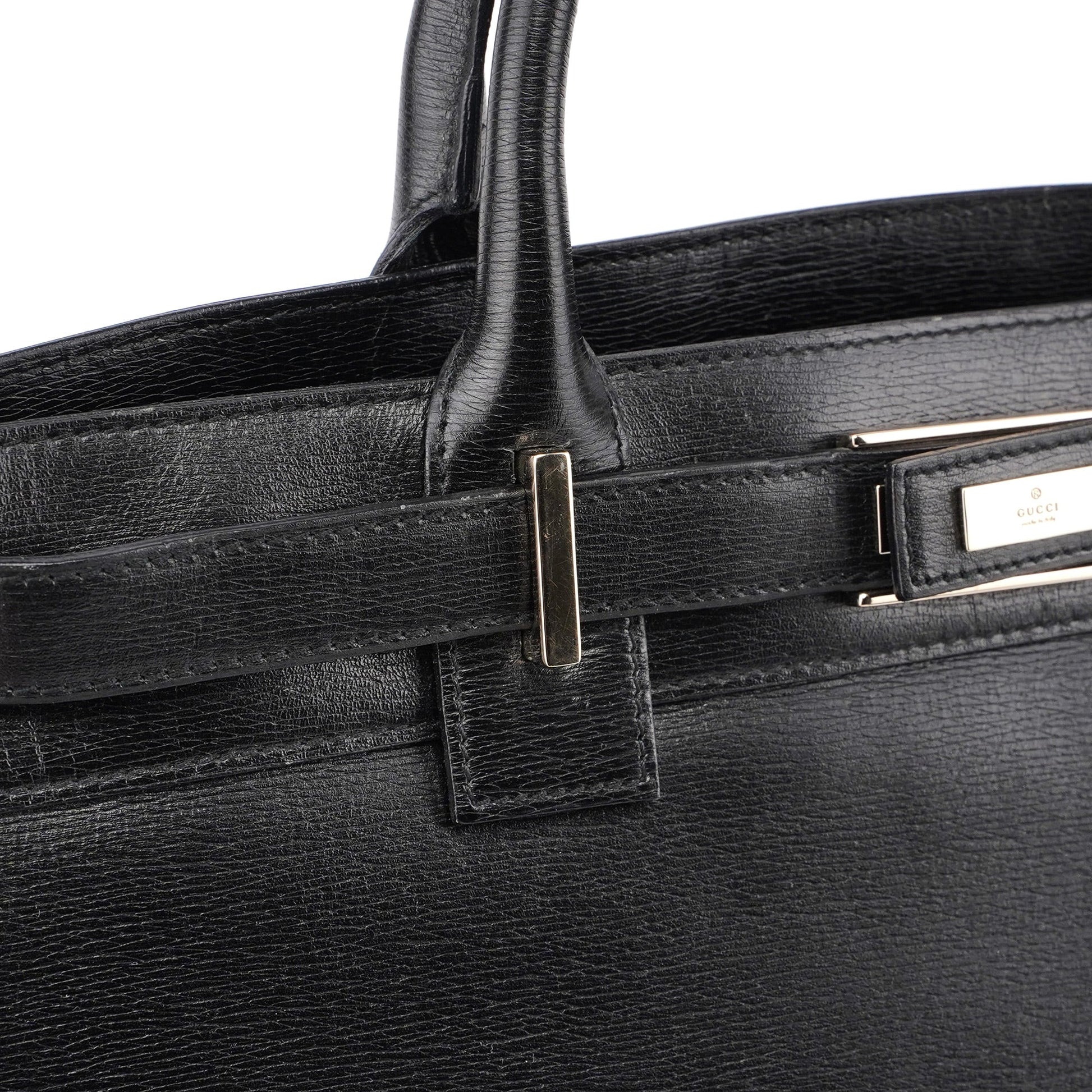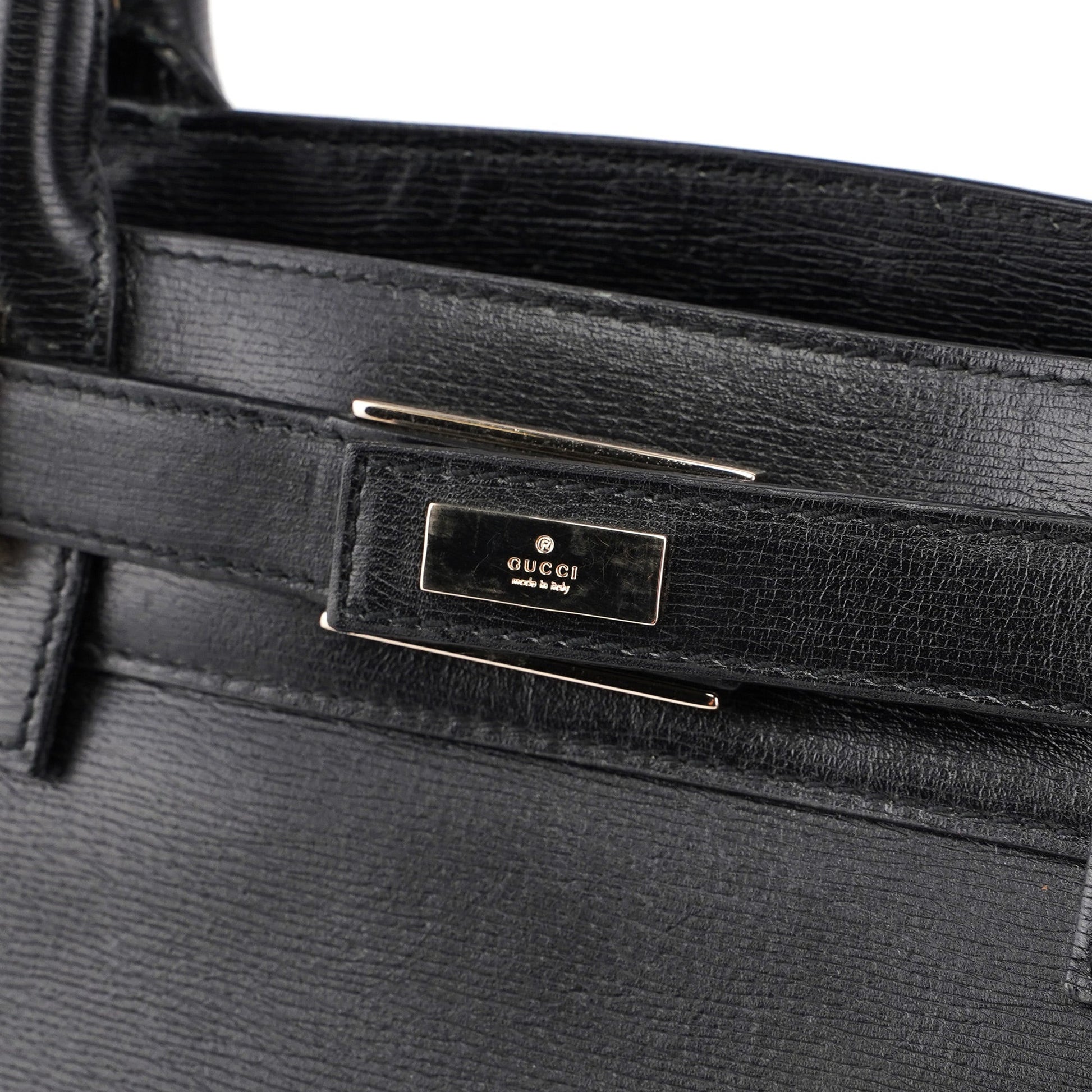 Handcrafted from black leather, this Gucci tote bag by Tom Ford from the late 1990s features gold-tone hardware engraved with Gucci logo. Inside, a satin-lined interior, and an interior zipper pocket, showcasing timeless elegance.
