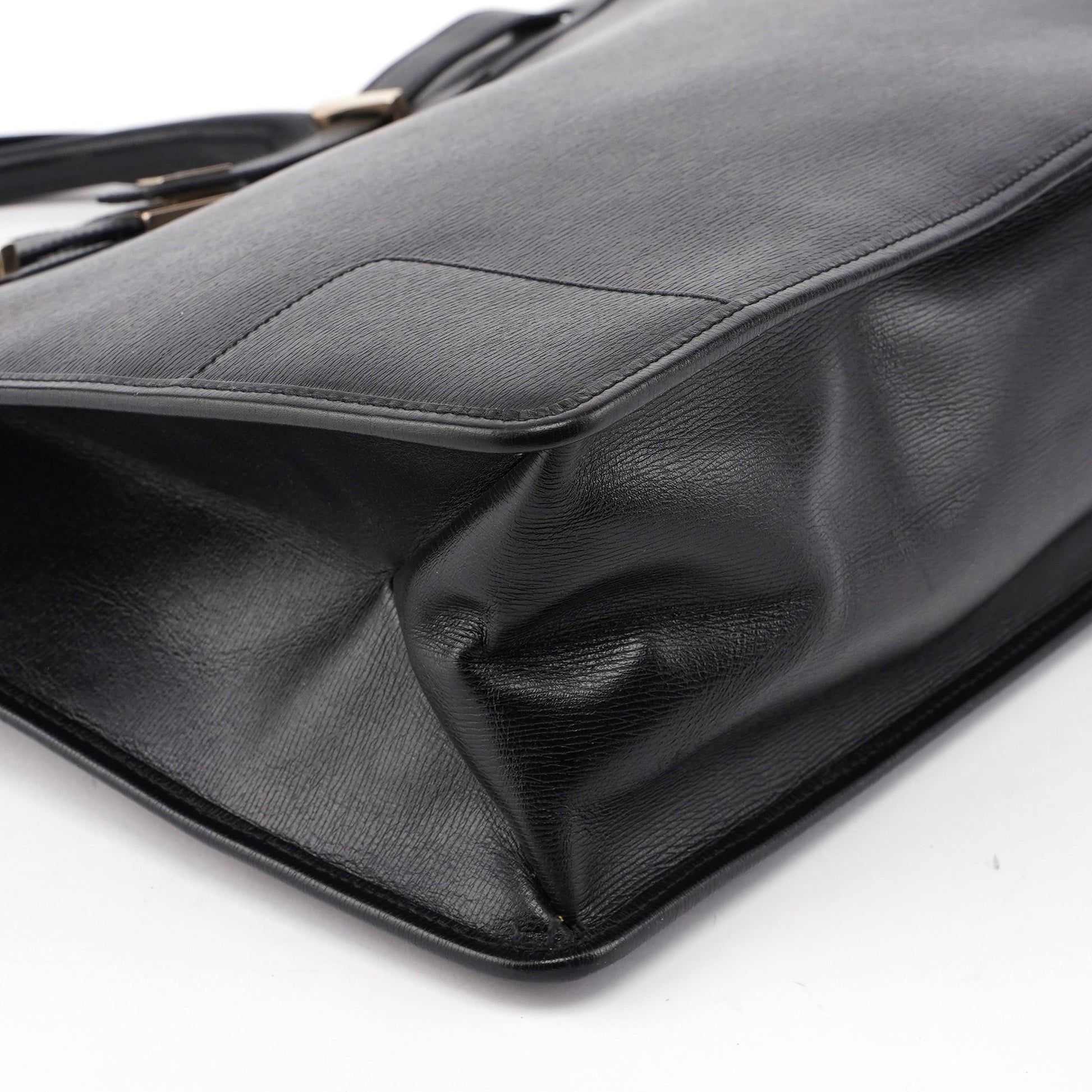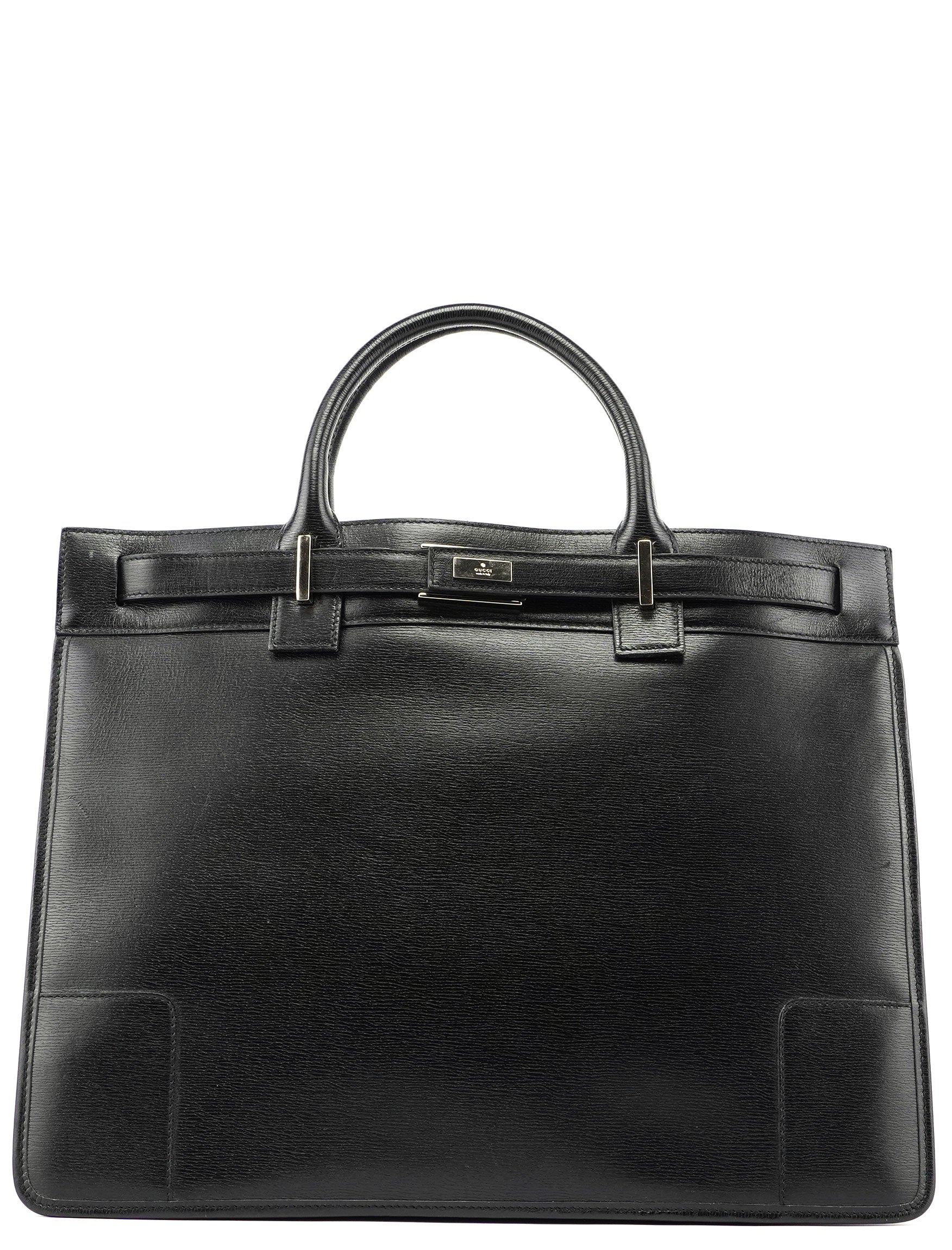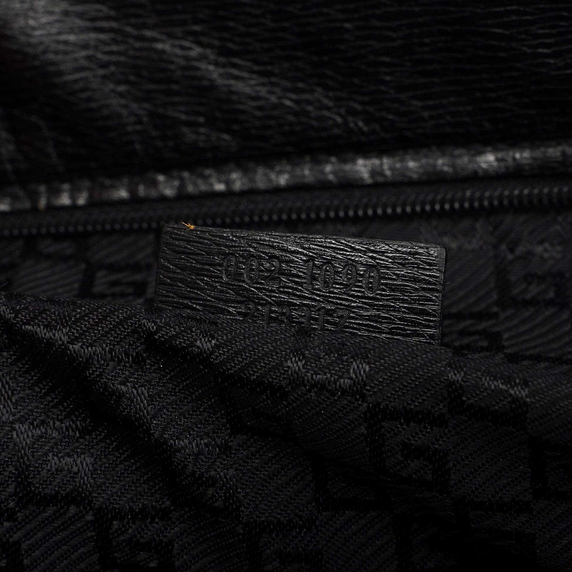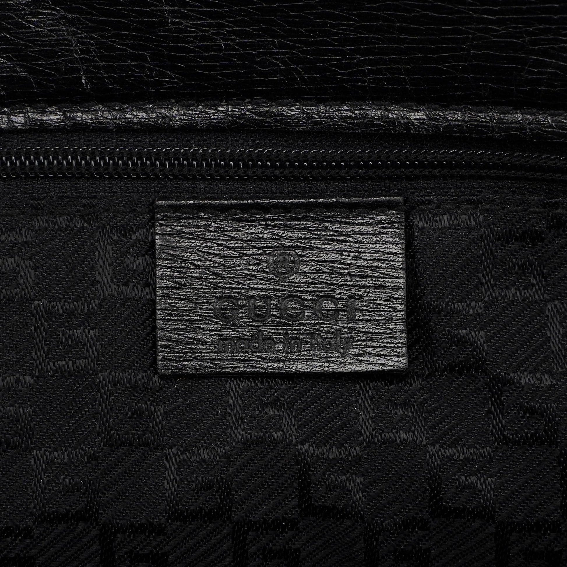 Handcrafted from black leather, this Gucci tote bag by Tom Ford from the late 1990s features gold-tone hardware engraved with Gucci logo. Inside, a satin-lined interior, and an interior zipper pocket, showcasing timeless elegance.