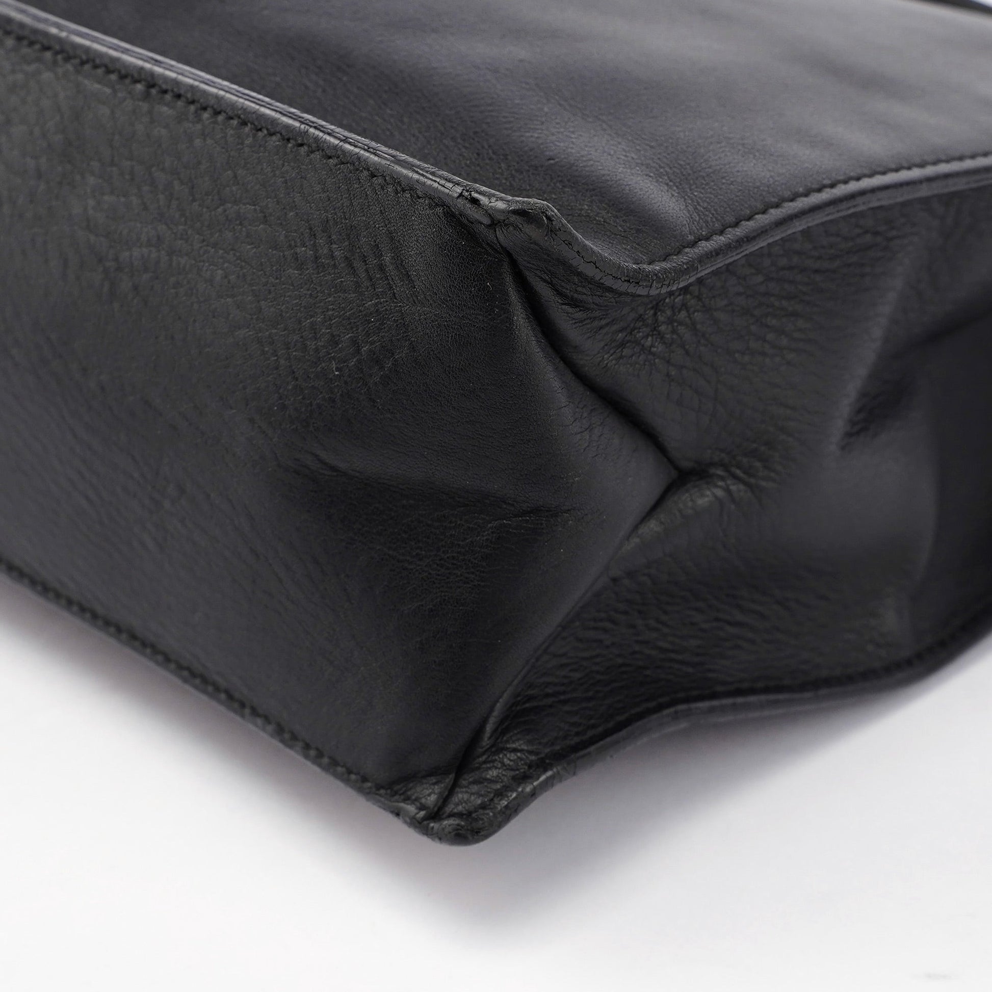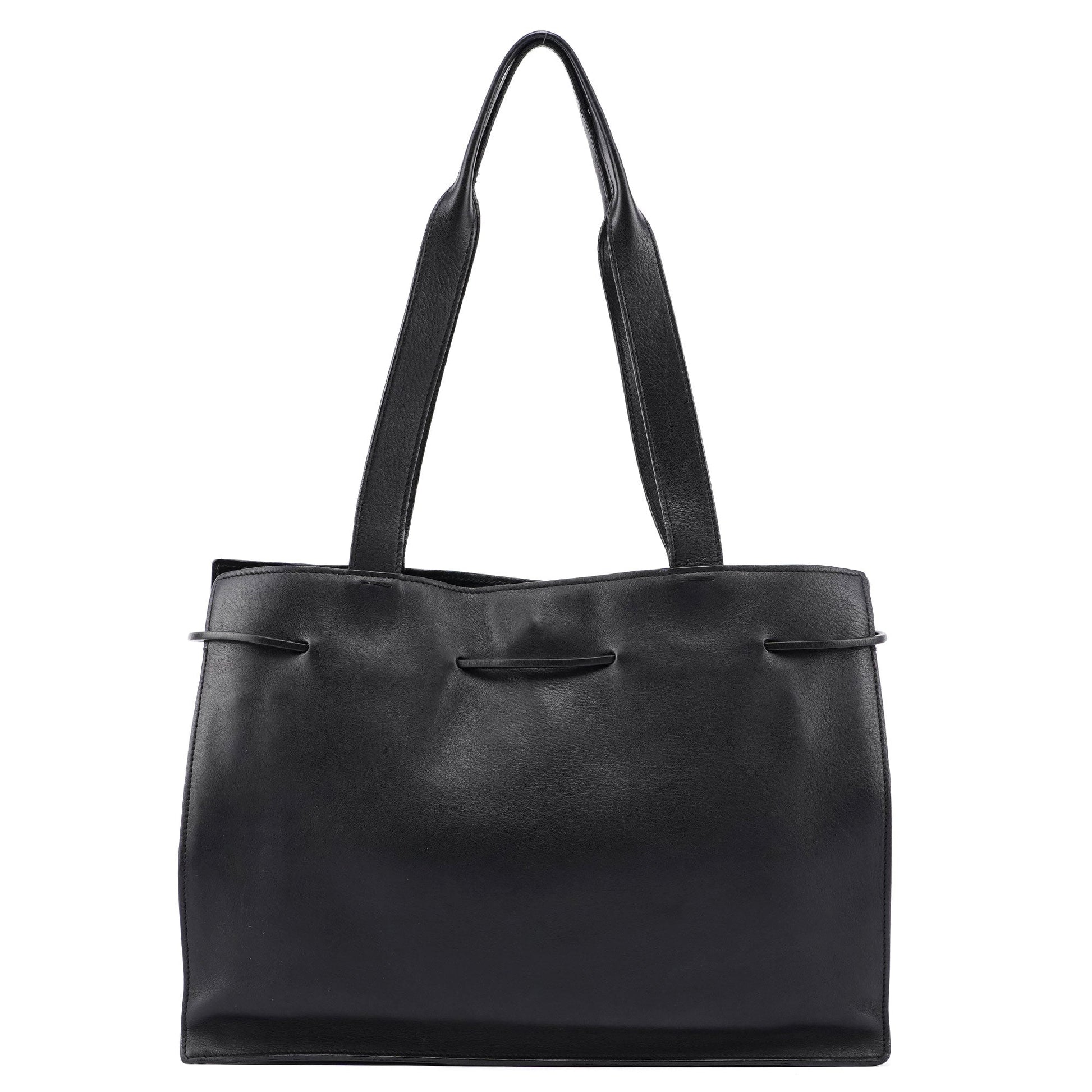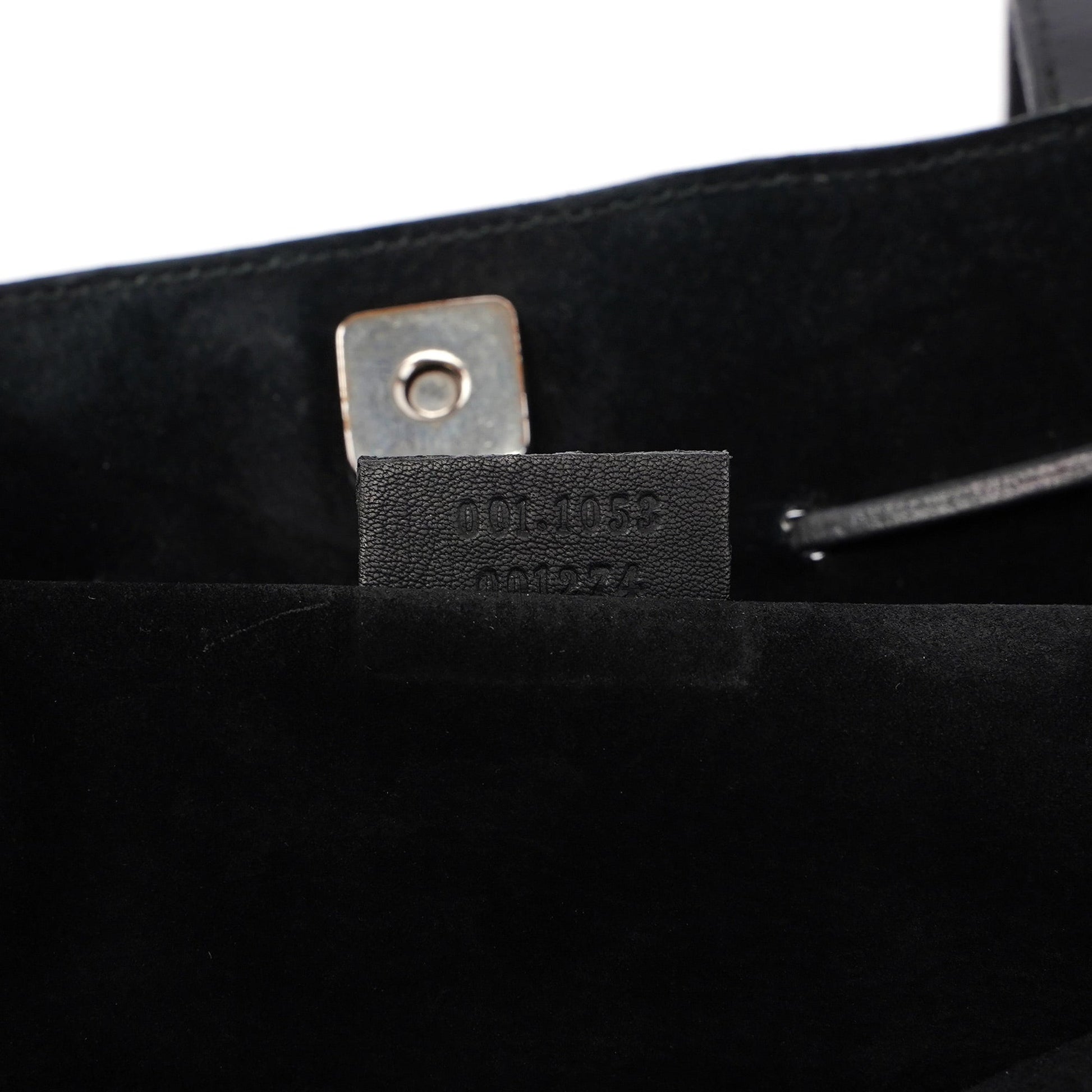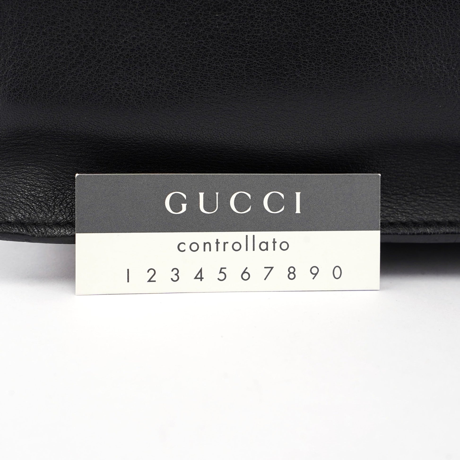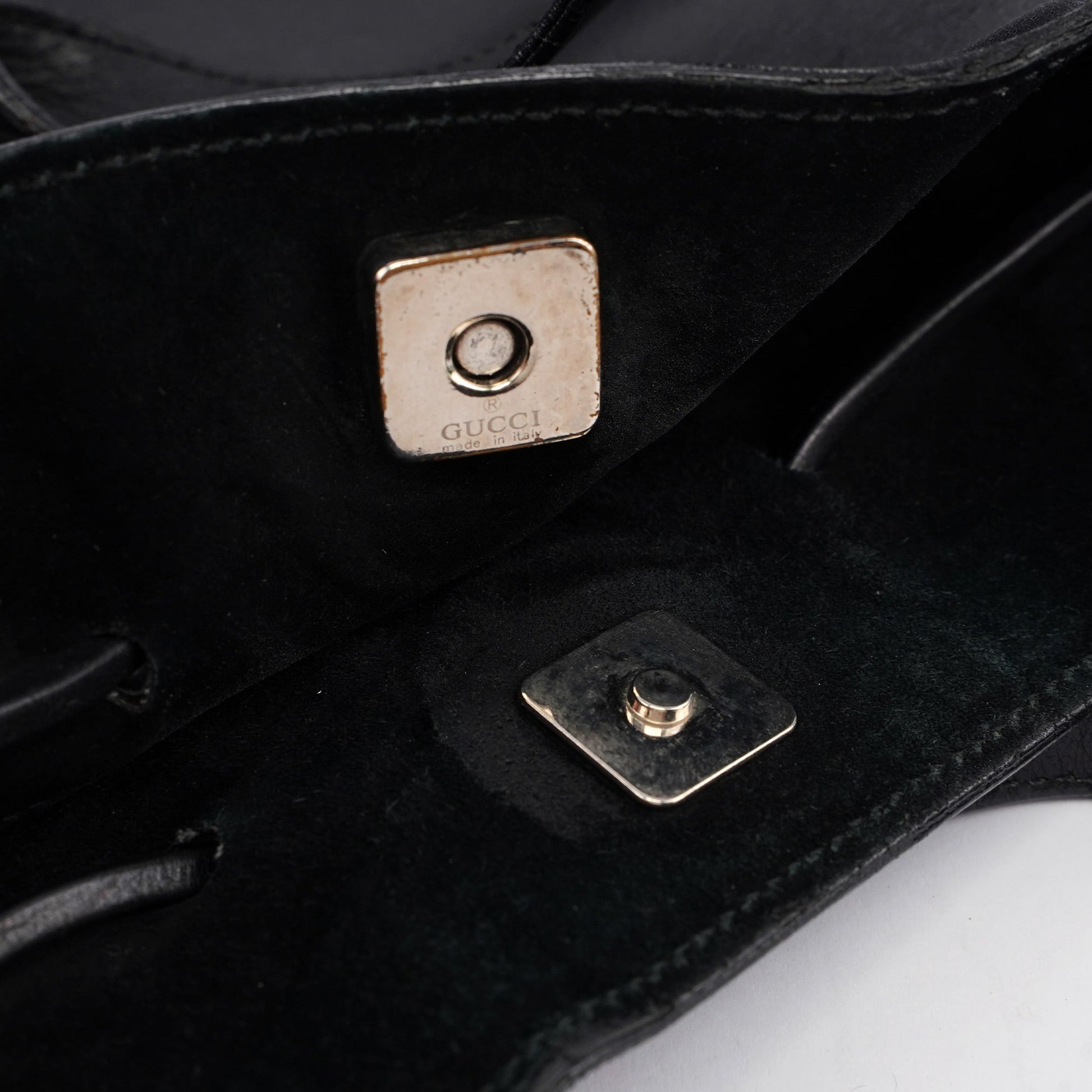 Introducing the Gucci Vitello bag, designed by Tom Ford in the late 1990s. Handcrafted from black calfskin leather with silver-tone hardware, it features a drawstring closure for easy access. The suede-lined interior includes a zipper pocket, combining luxury with practicality. The Gucci logo is subtly embossed on the front.