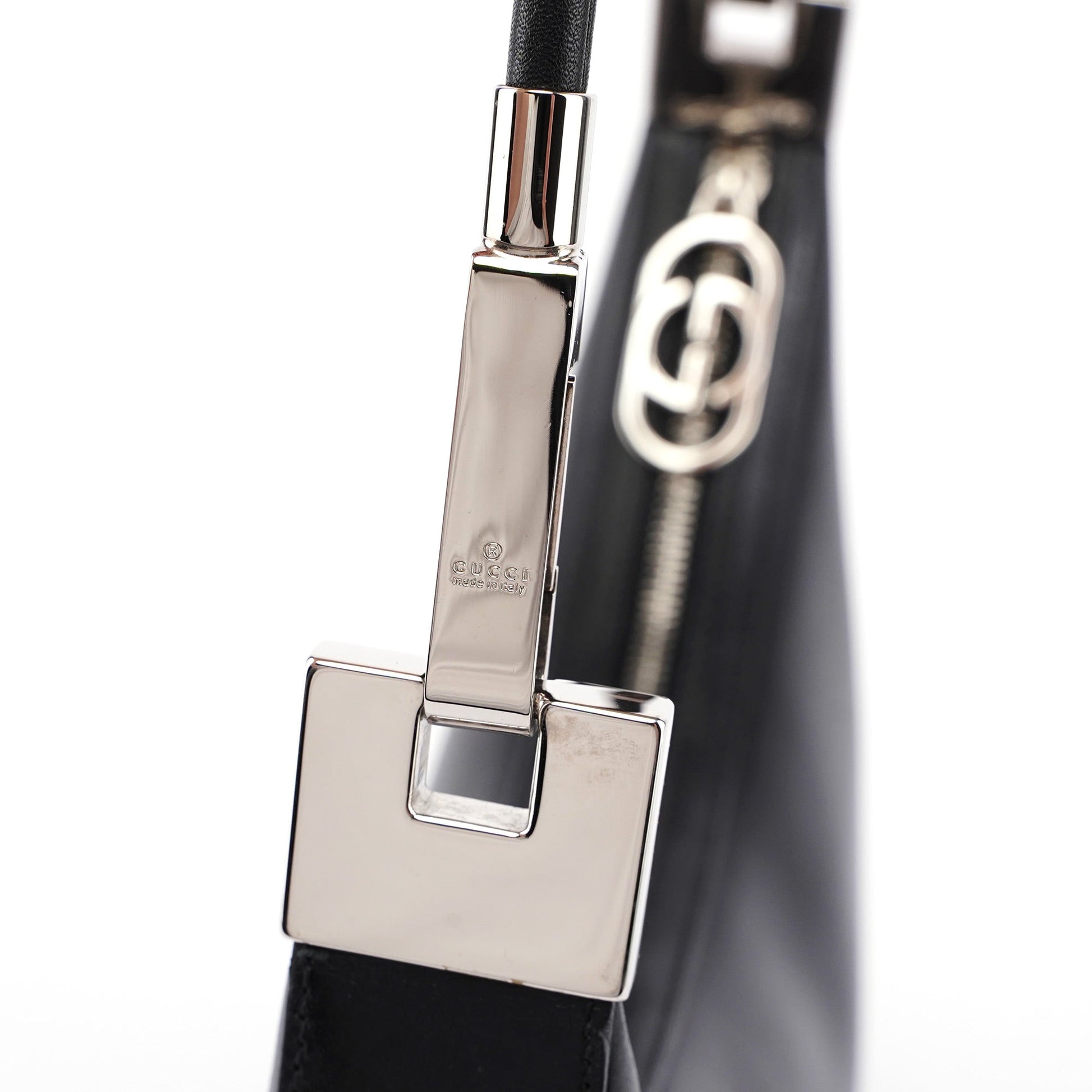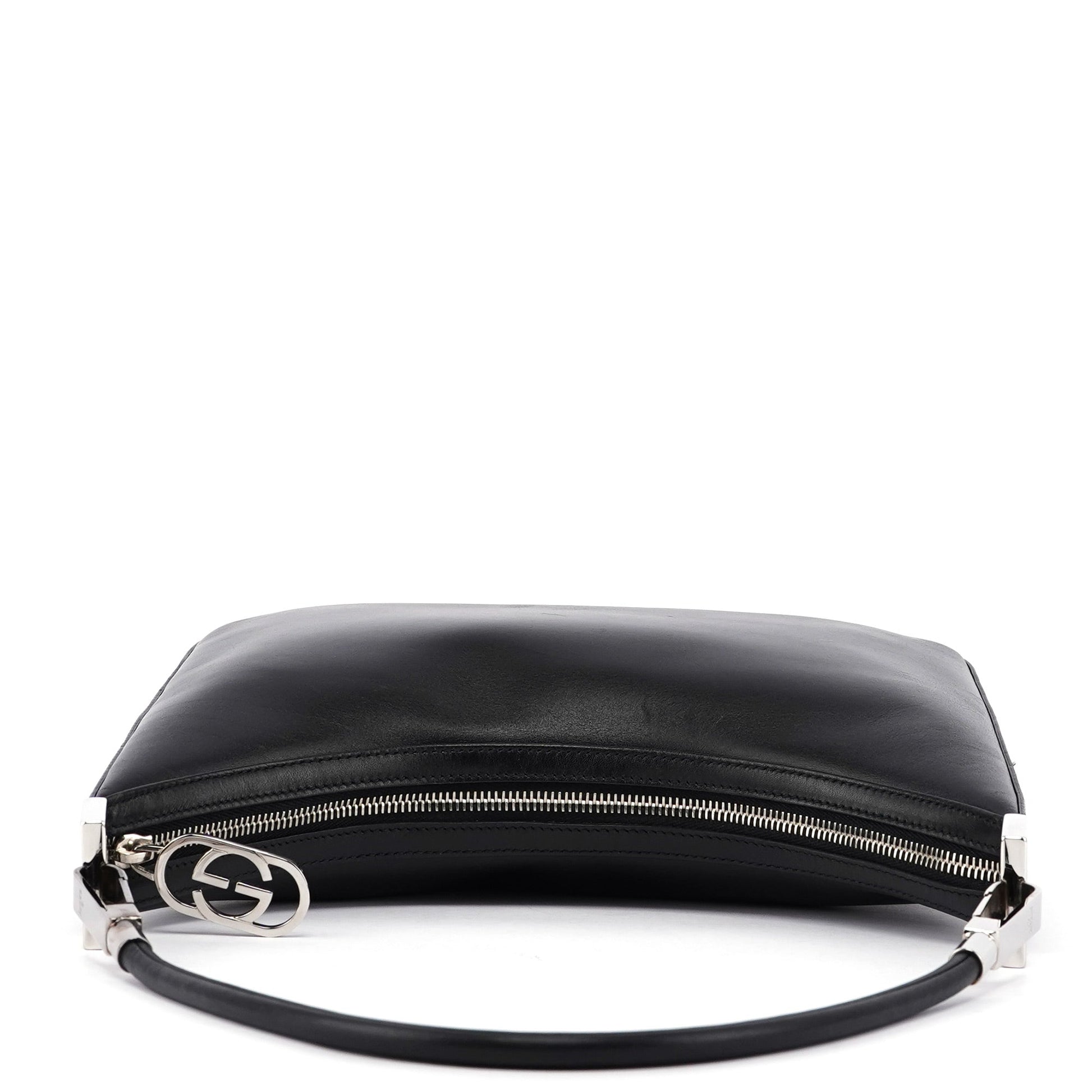 Introducing the Gucci Vitello hobo shoulder bag, designed by Tom Ford in the late 1990's, handcrafted from black calfskin leather. It boasts silver-tone hardware and a zipper closure for added sophistication. Inside, the satin-lined interior offers a zipper pocket for organization.