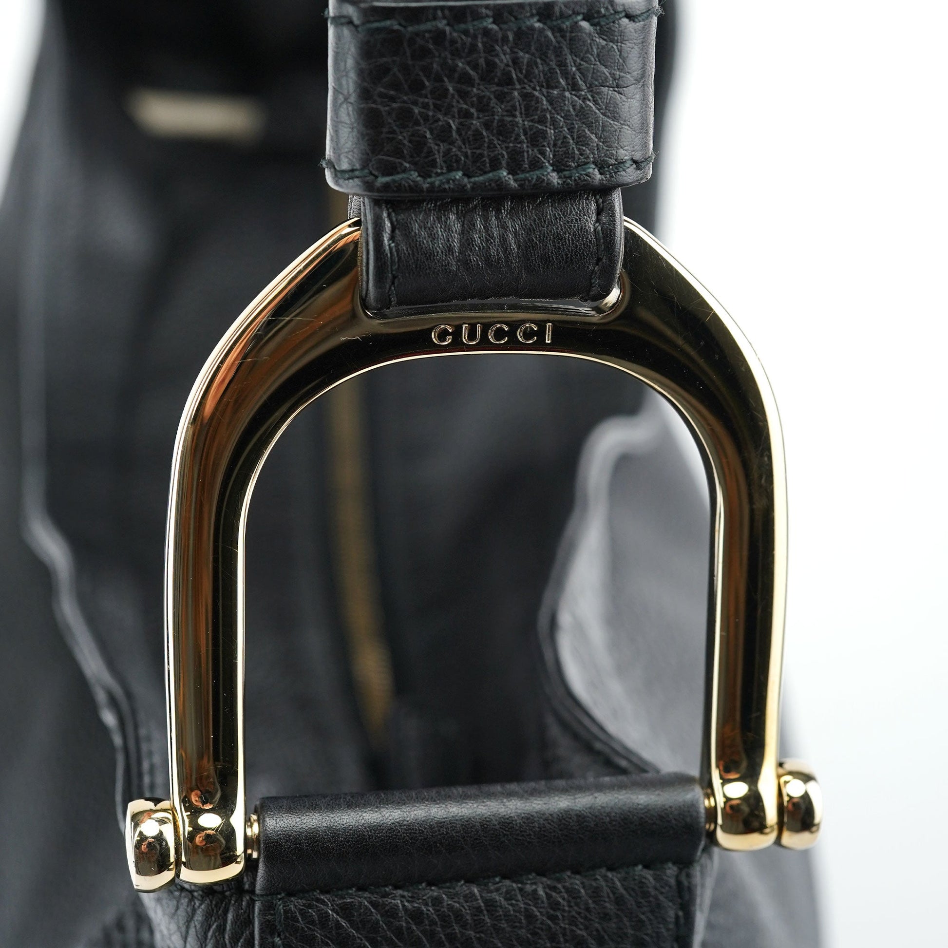 Handcrafted in black leather and designed by Tom Ford, this Gucci Hobo bag features gold-tone hardware with Gucci logo engraving and an asymmetrical shoulder strap. It's secured with a zipper closure and boasts a cotton canvas-lined interior with an interior zipper pocket.