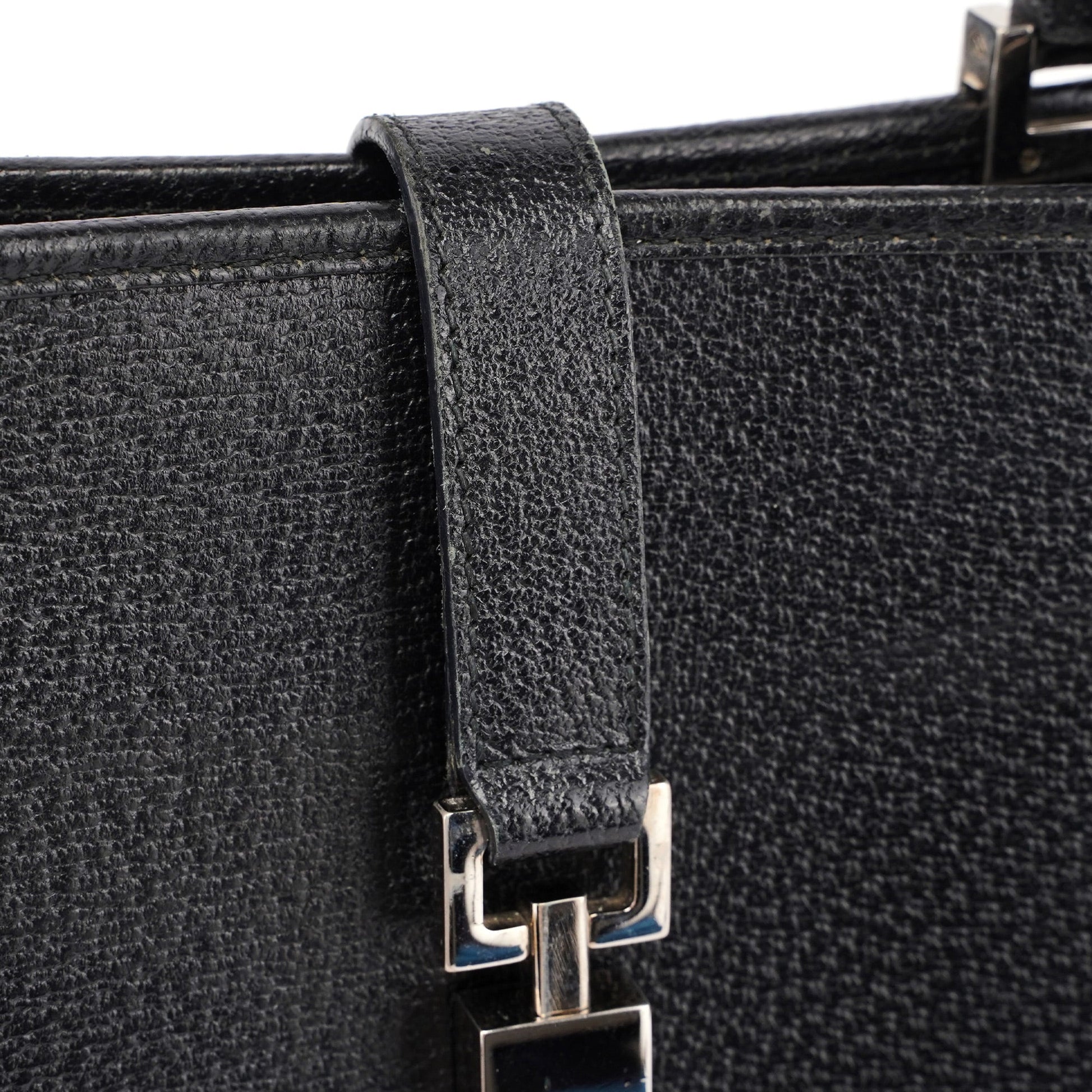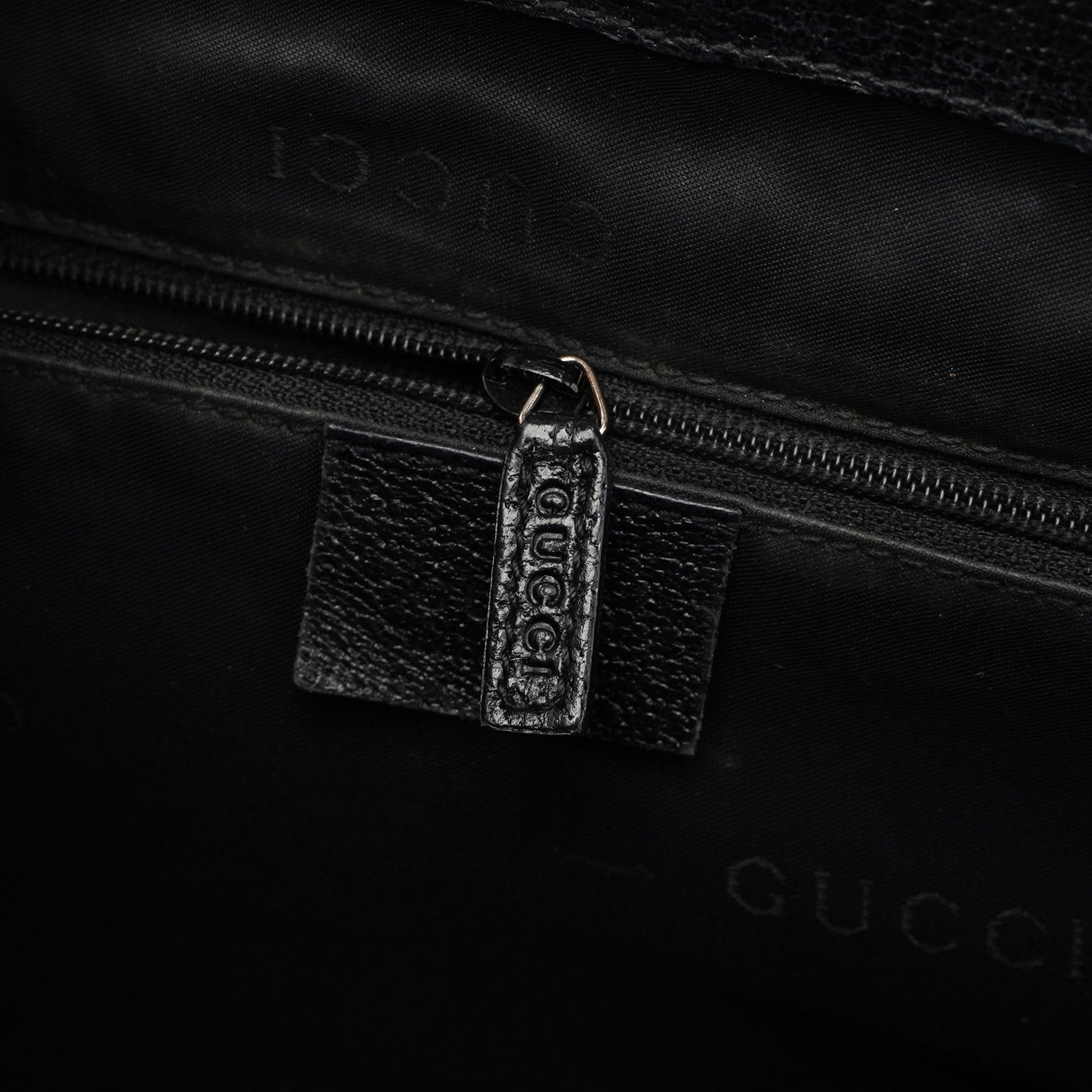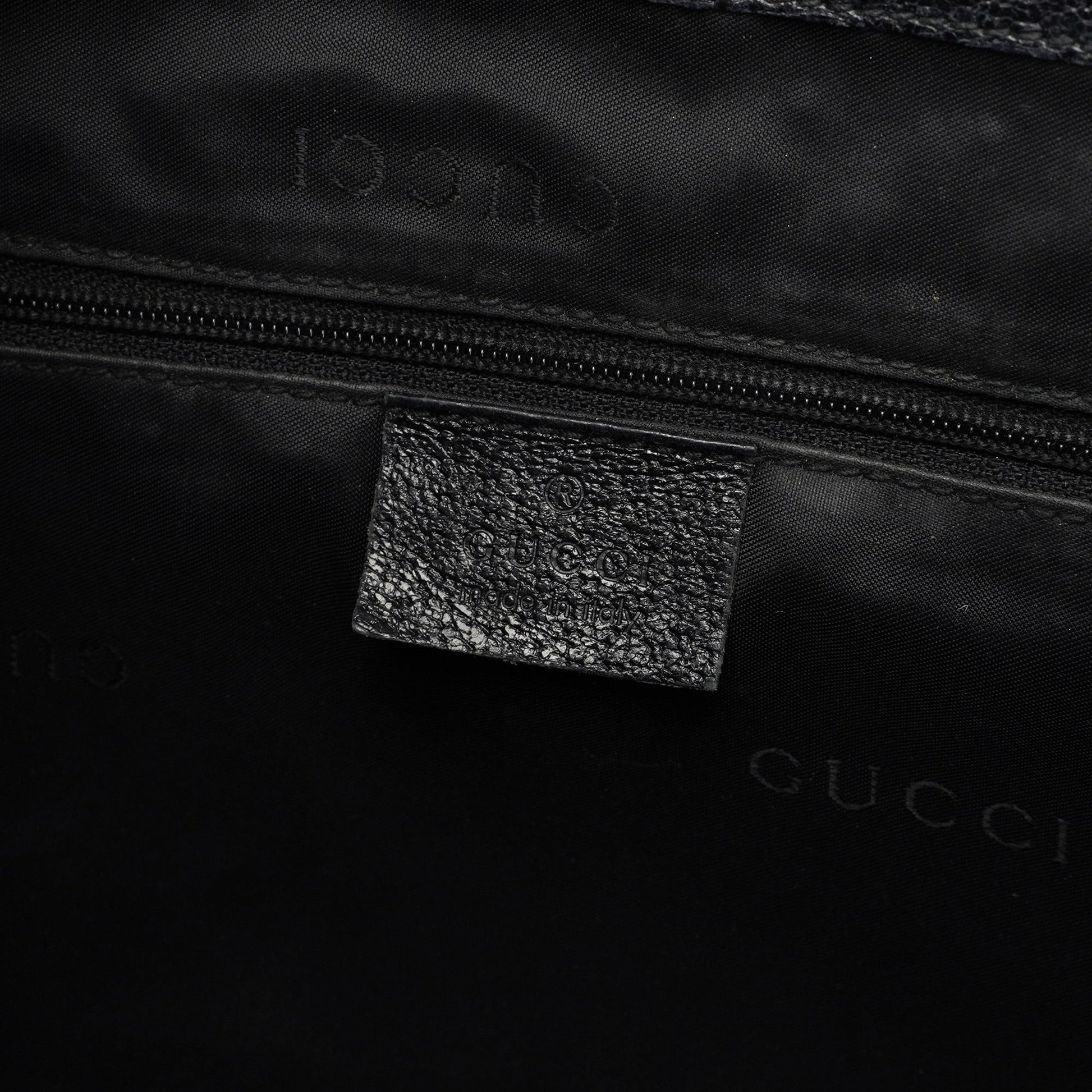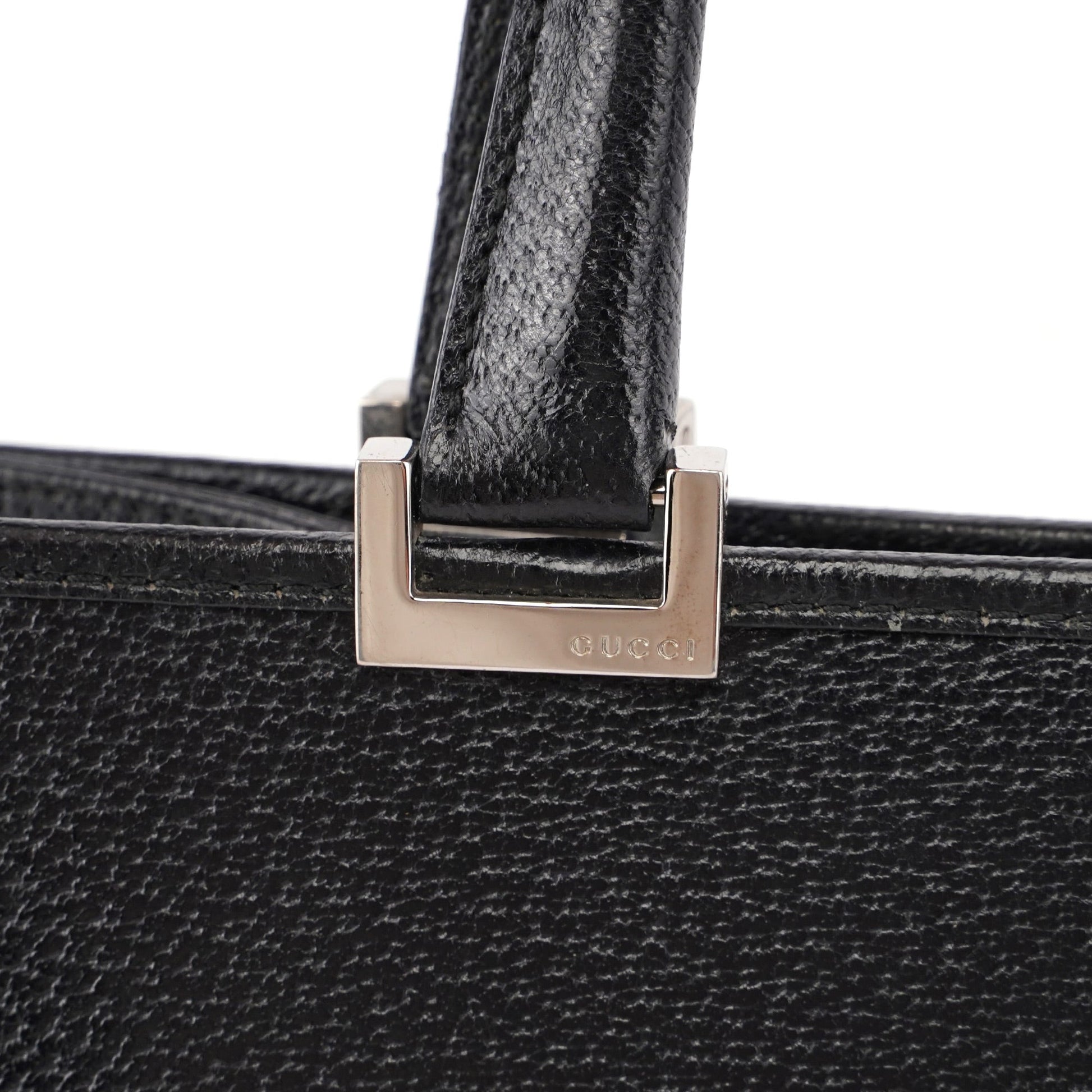 Designed by Tom Ford in the late 1990s, the Gucci Jackie tote is handcrafted from black textured leather and features silver-tone hardware engraved with the Gucci logo. It has a signature Jackie closure, a satin-lined interior, and an interior zipper pocket, showcasing timeless elegance.