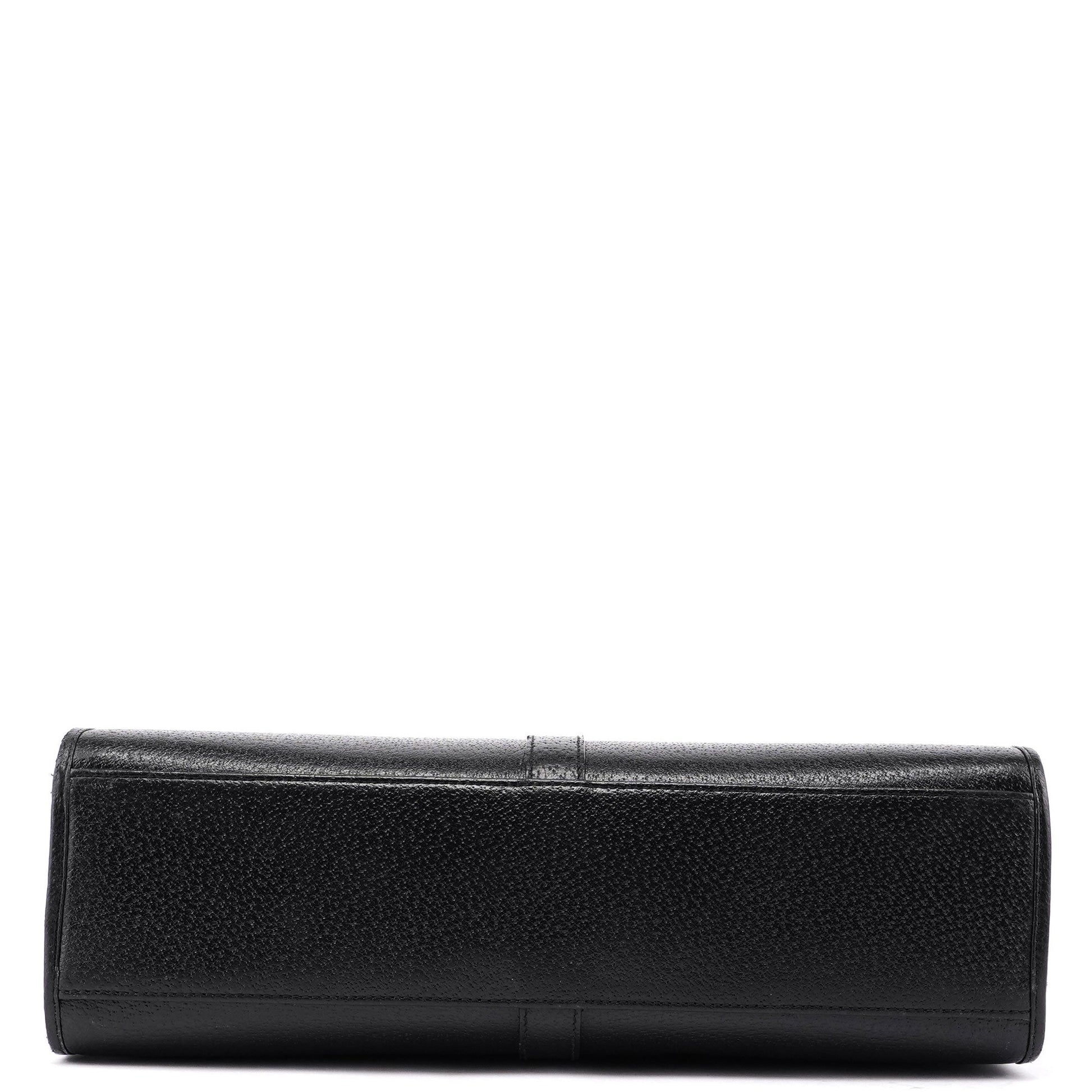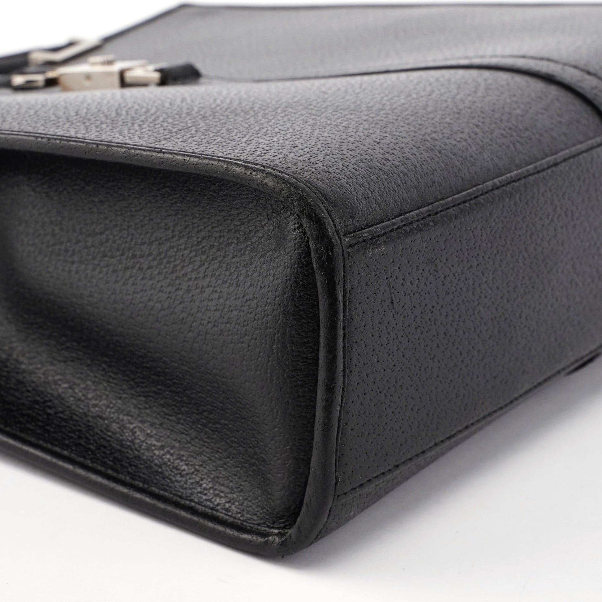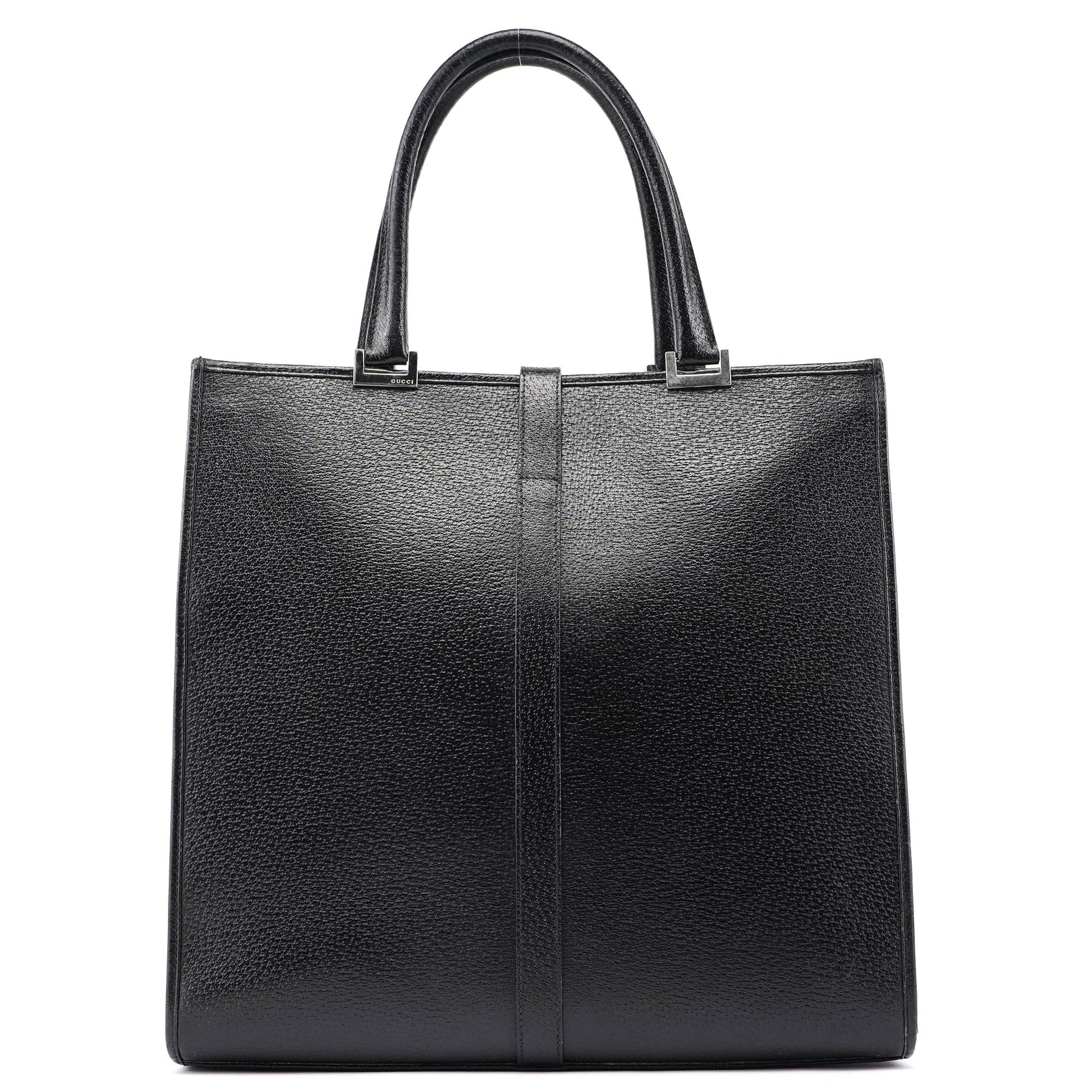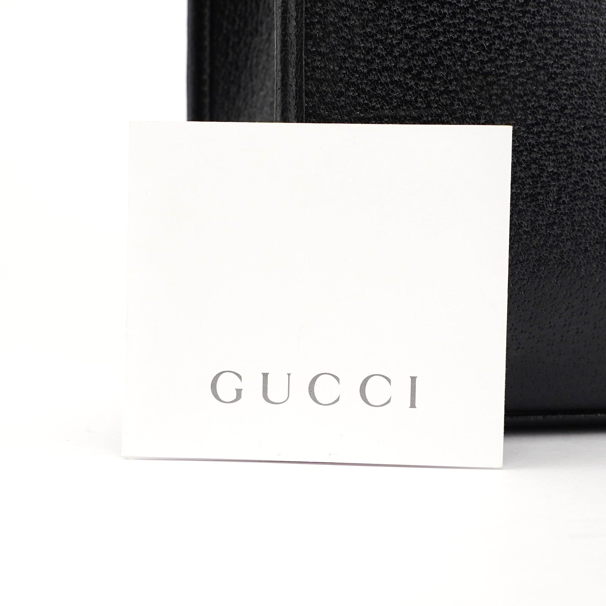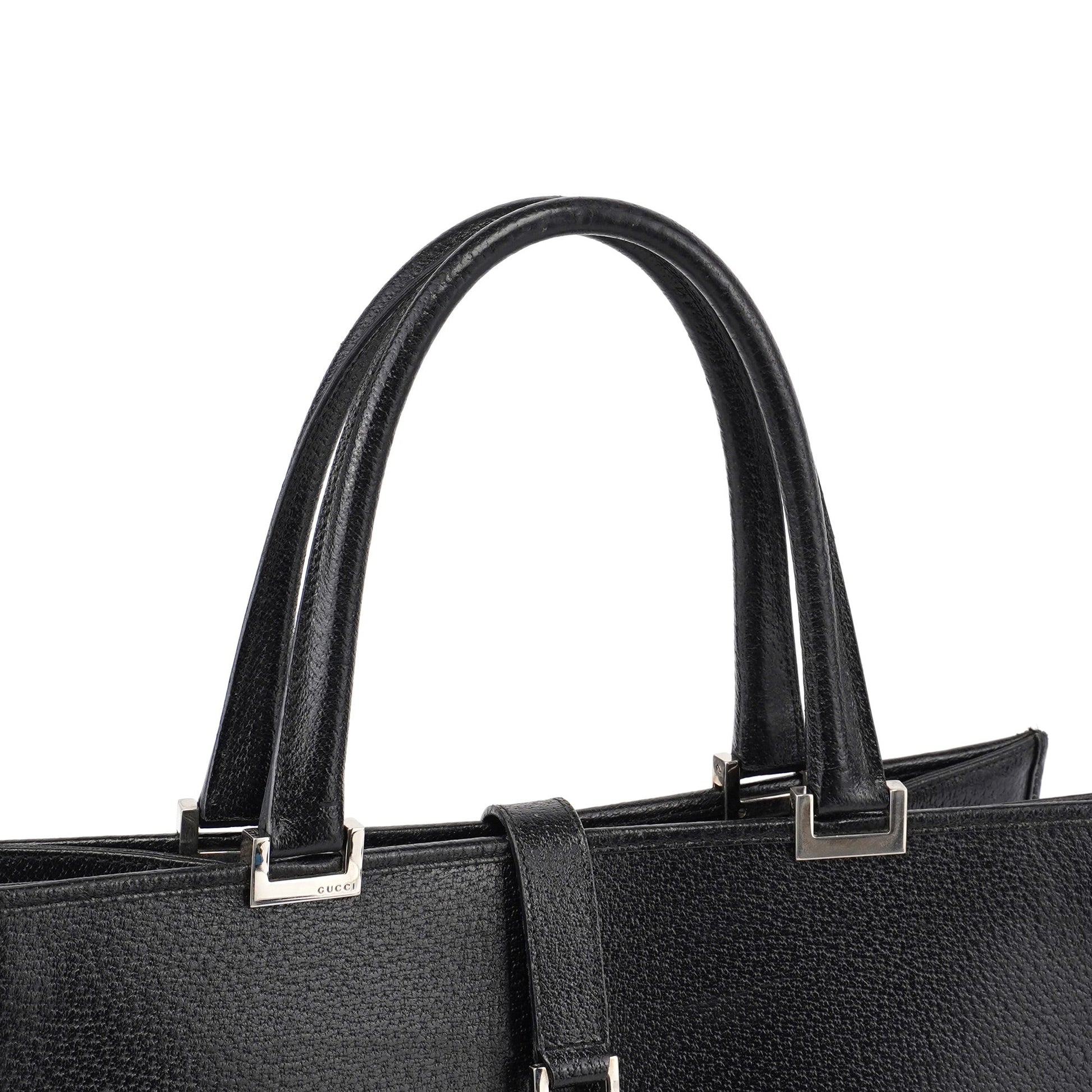 Designed by Tom Ford in the late 1990s, the Gucci Jackie tote is handcrafted from black textured leather and features silver-tone hardware engraved with the Gucci logo. It has a signature Jackie closure, a satin-lined interior, and an interior zipper pocket, showcasing timeless elegance.