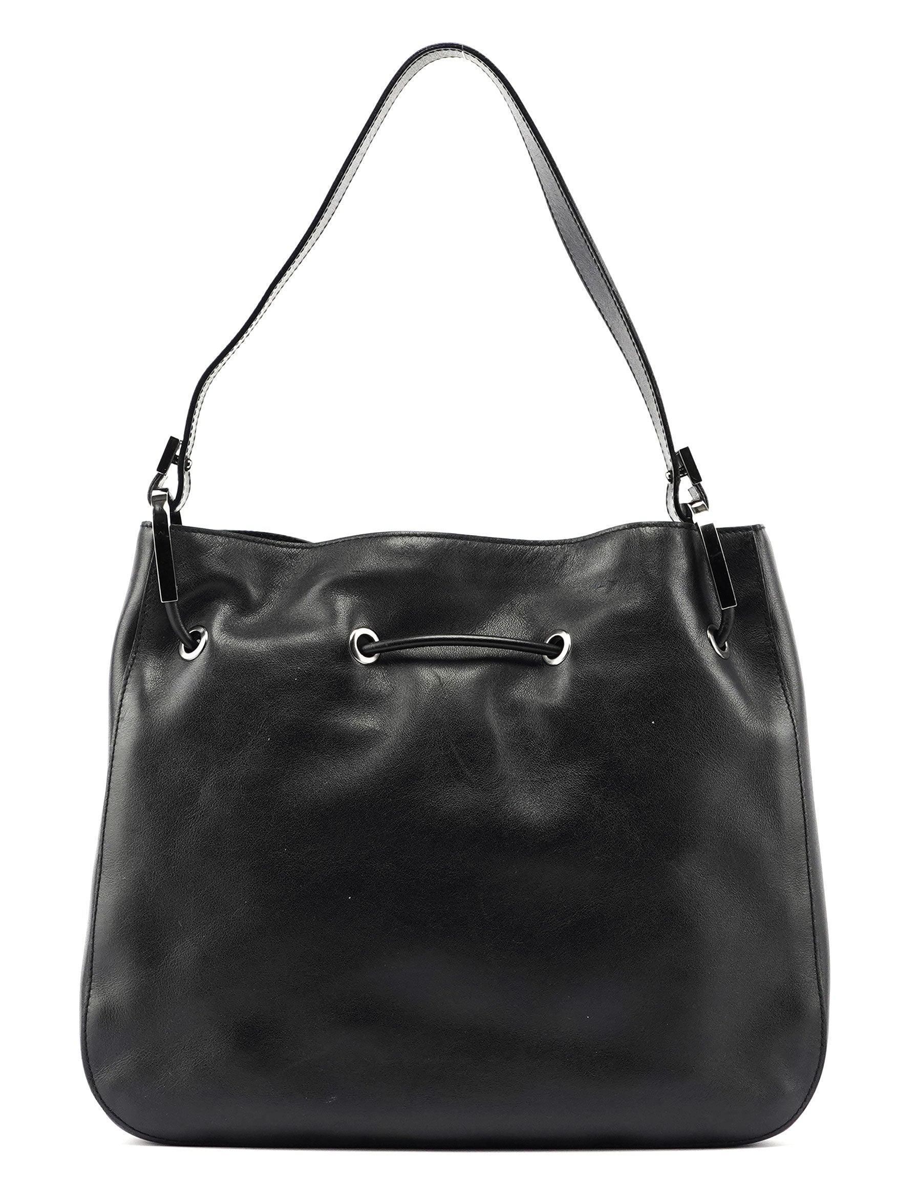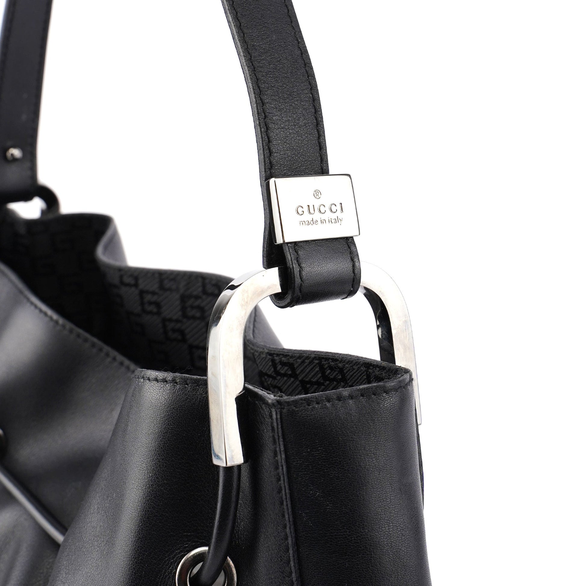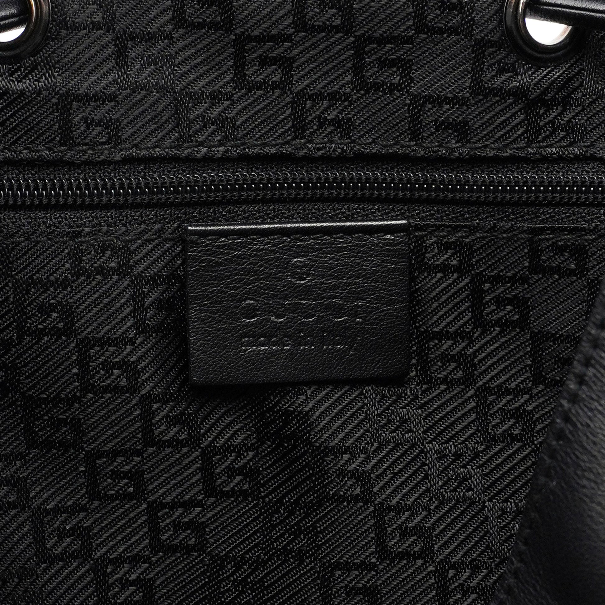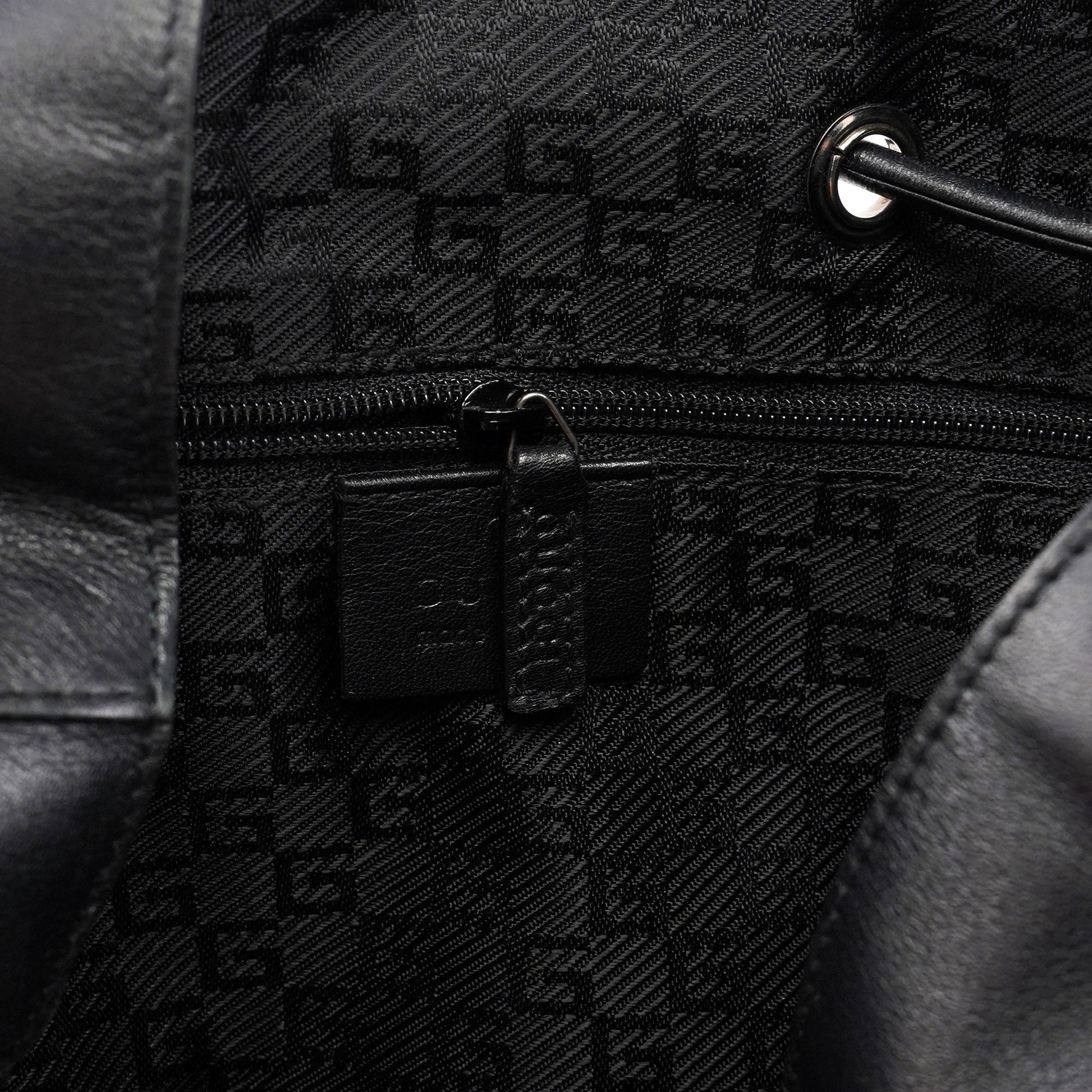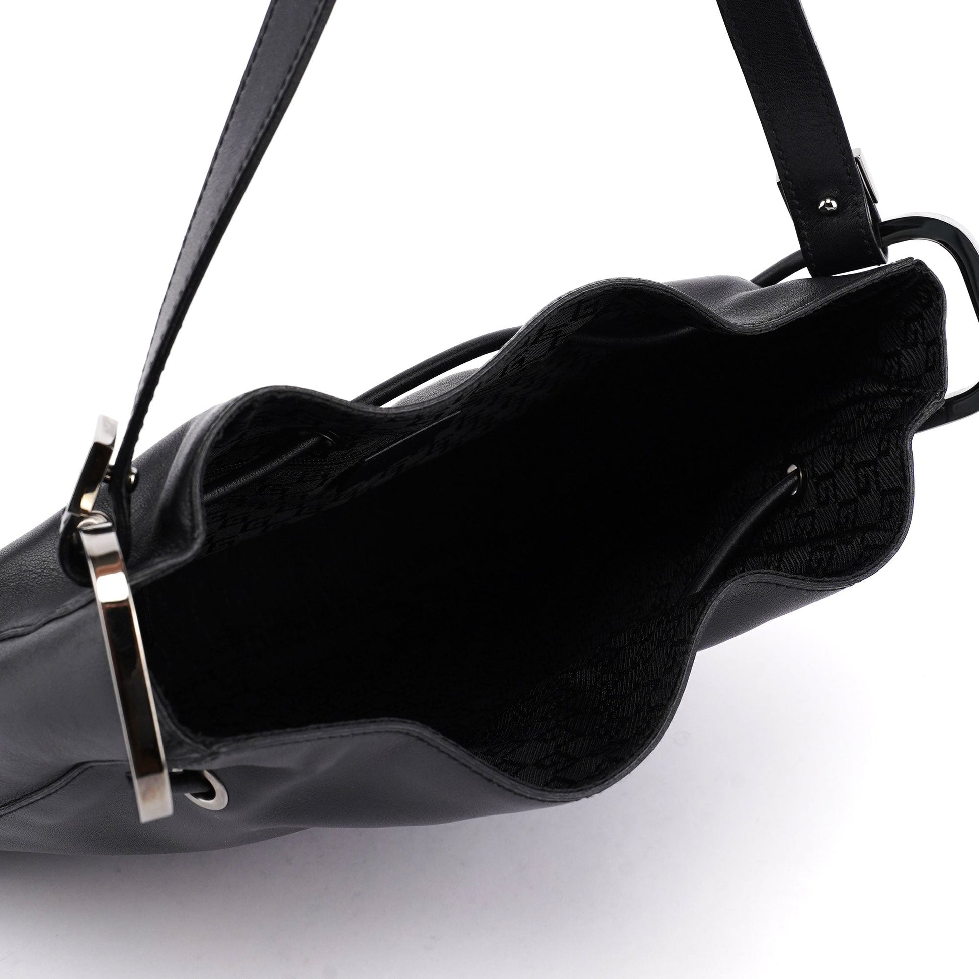 Introducing the Gucci Vitello bag, designed by Tom Ford in the late 1990s. Handcrafted from black calfskin leather with silver-tone hardware, it features a drawstring closure for easy access. The satin-lined interior includes a zipper pocket, combining luxury with practicality. The Gucci logo is subtly embossed on the front.