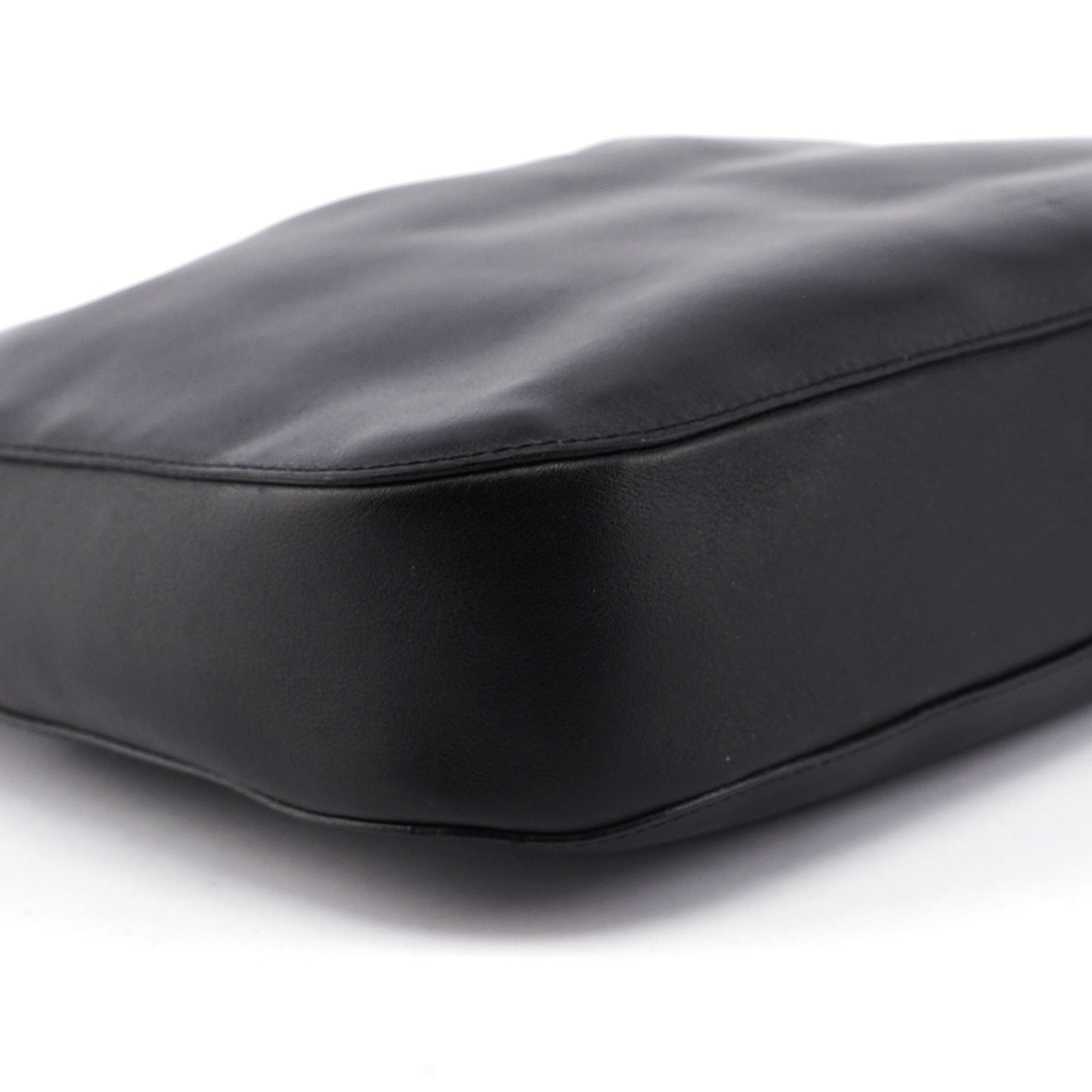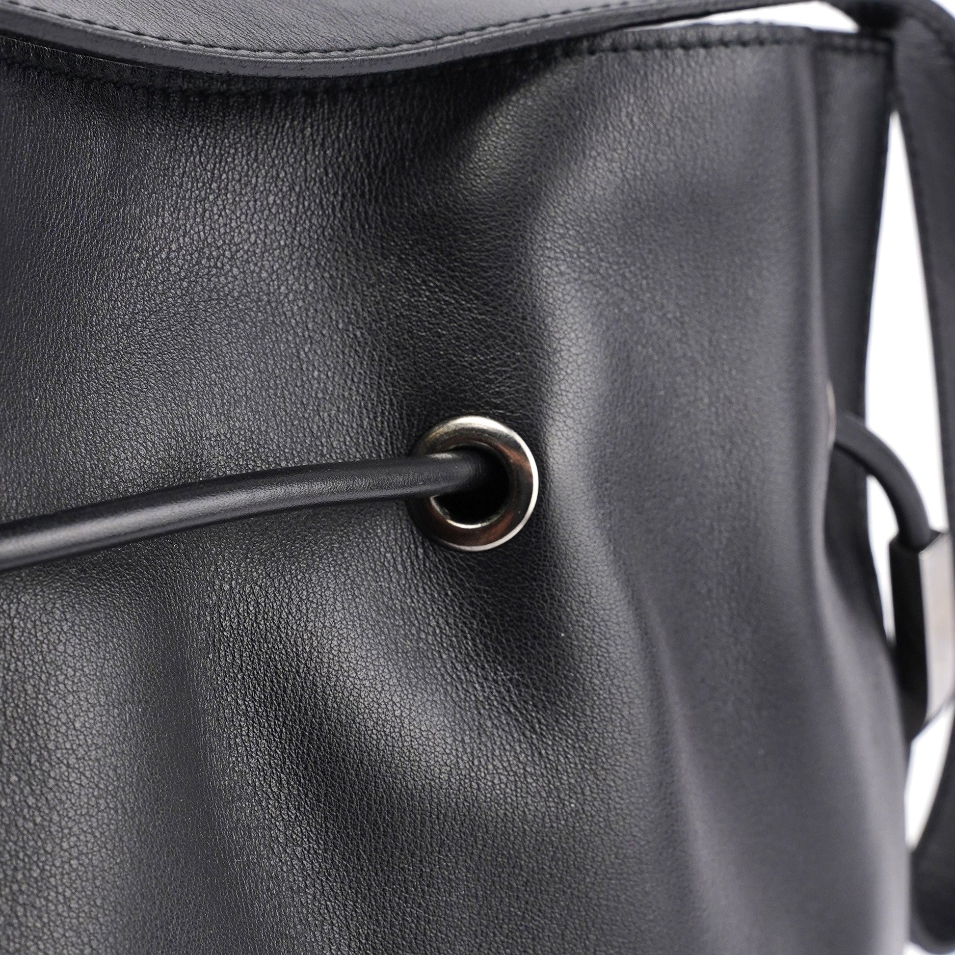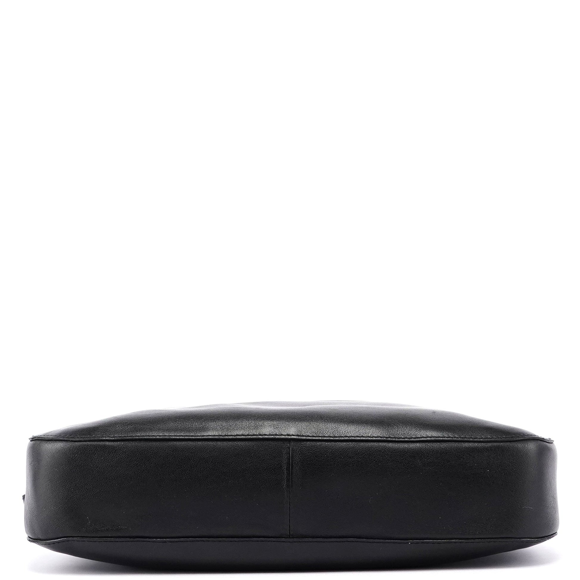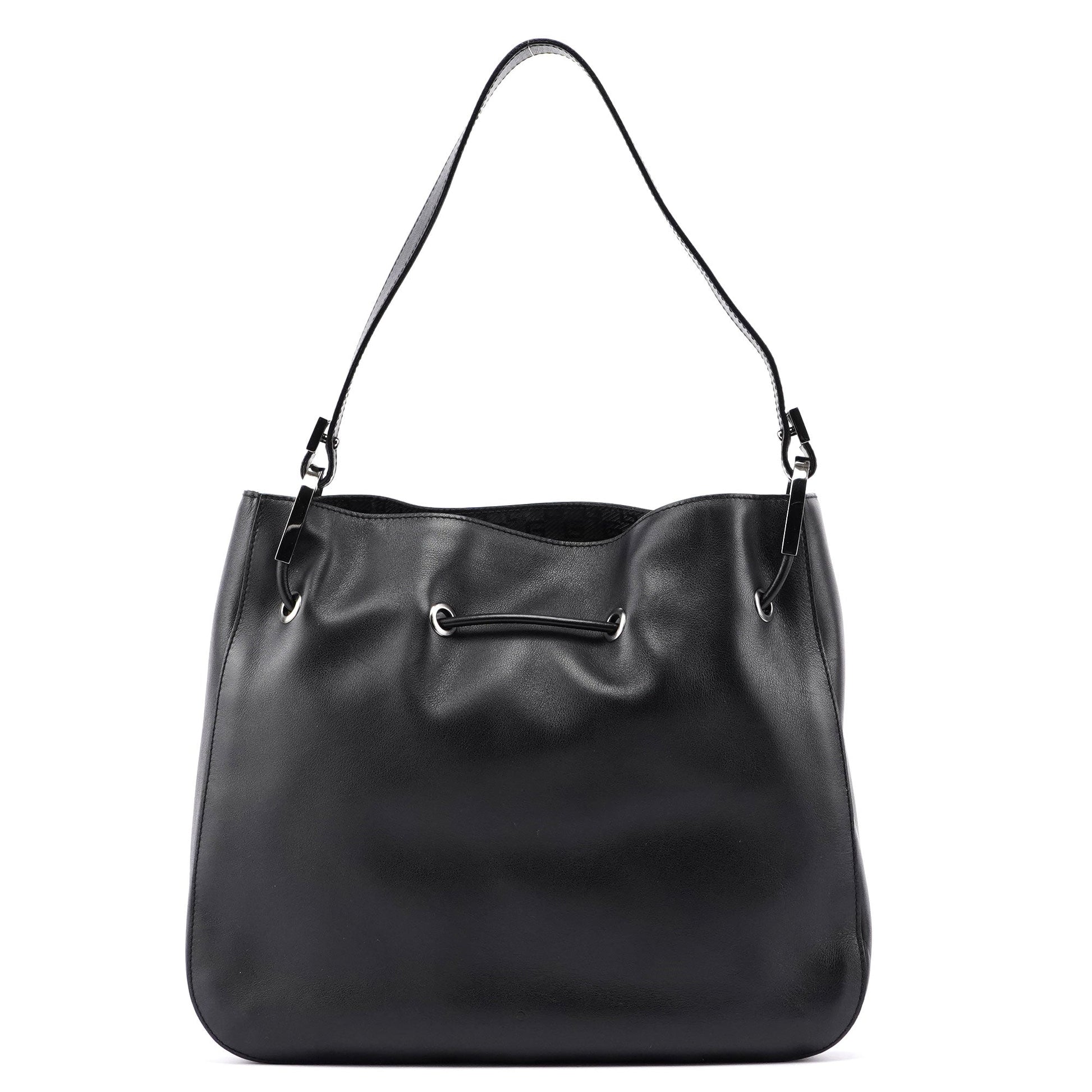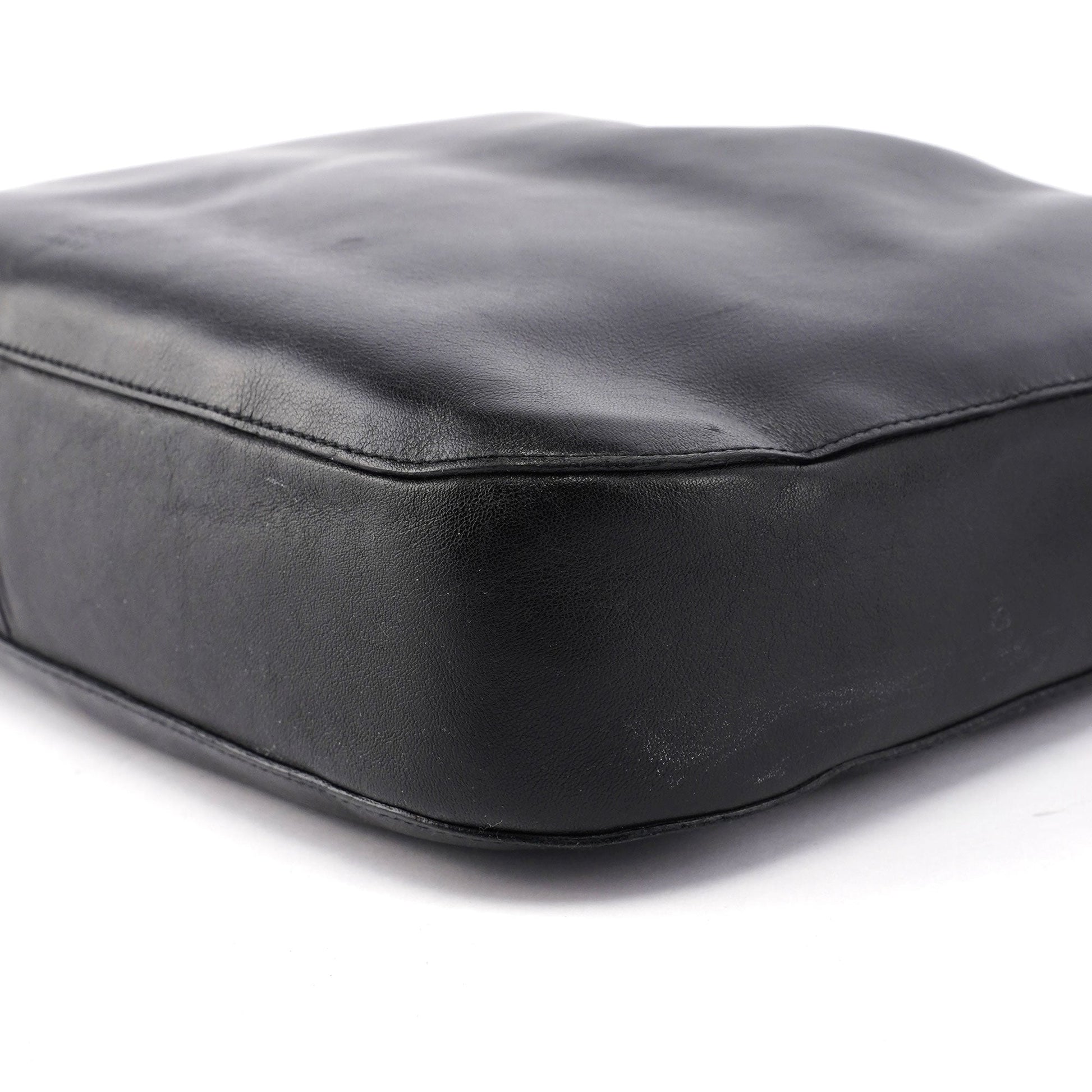 Introducing the Gucci Vitello bag, designed by Tom Ford in the late 1990s. Handcrafted from black calfskin leather with silver-tone hardware, it features a drawstring closure for easy access. The satin-lined interior includes a zipper pocket, combining luxury with practicality. The Gucci logo is subtly embossed on the front.