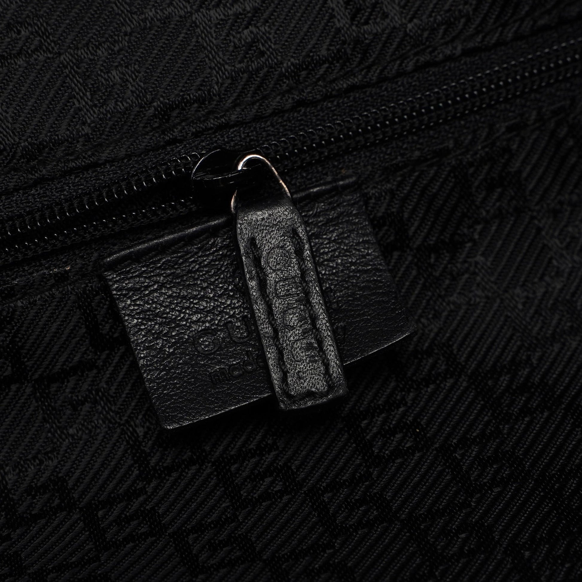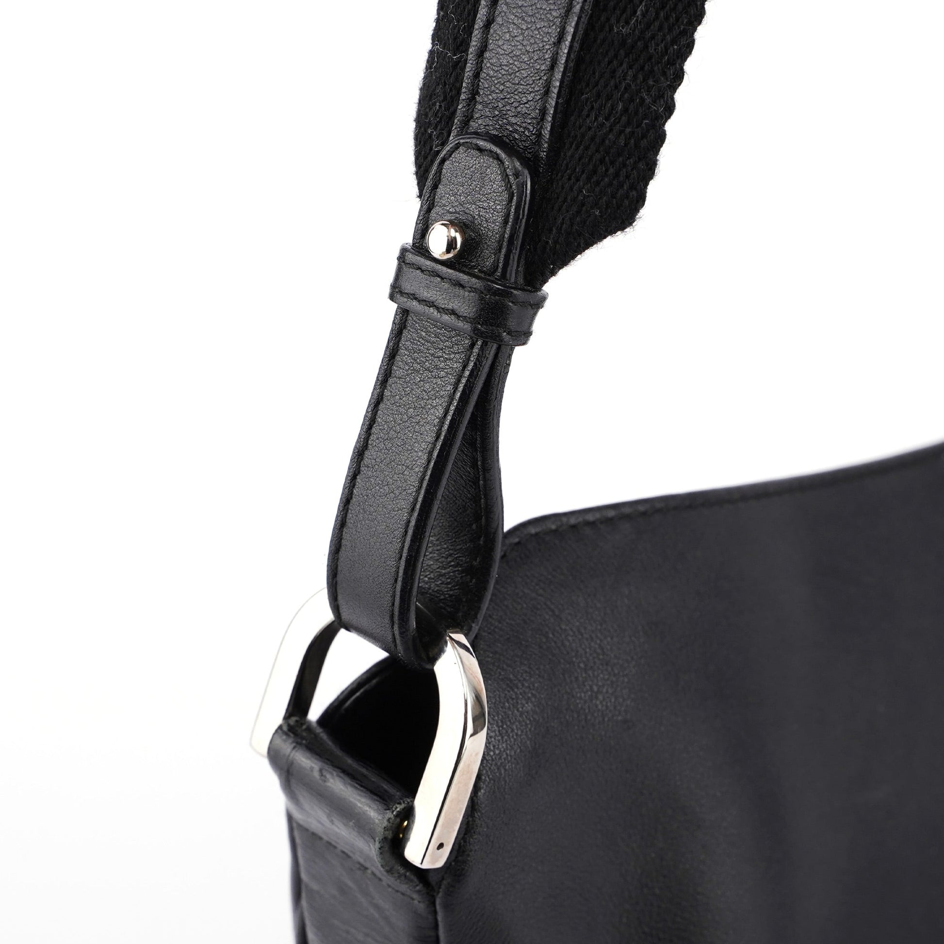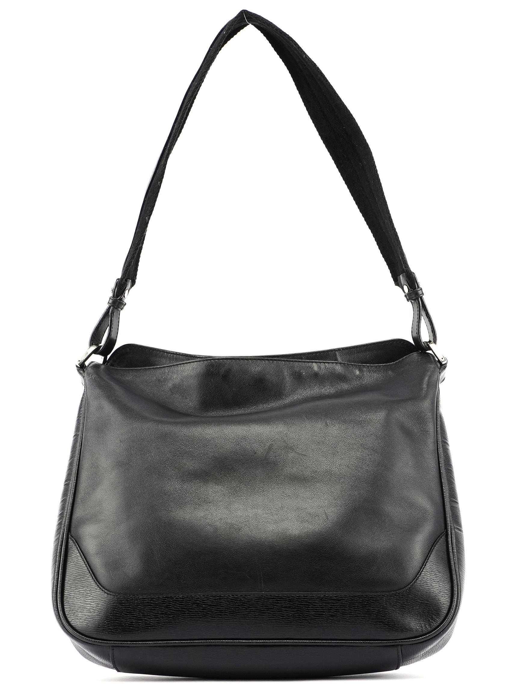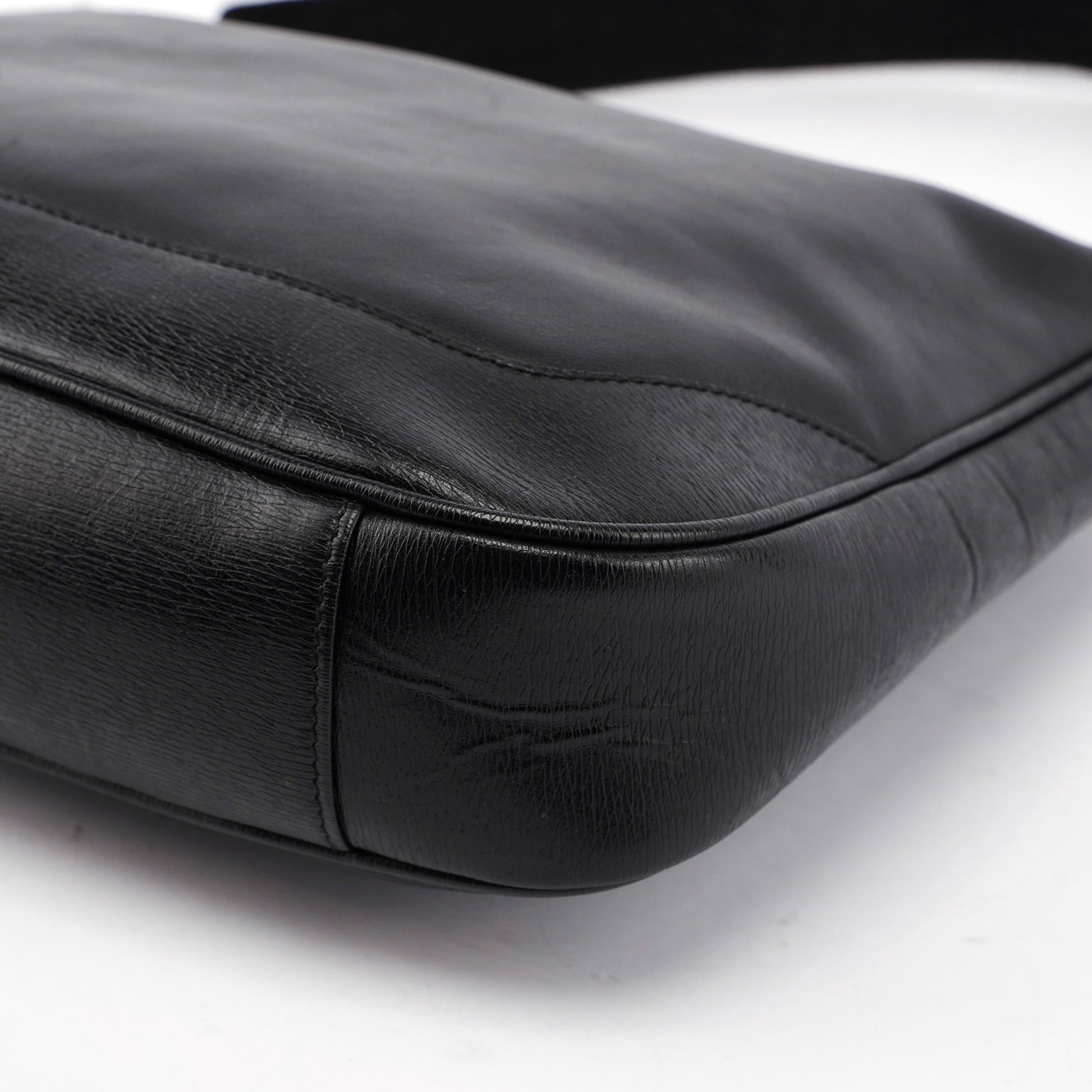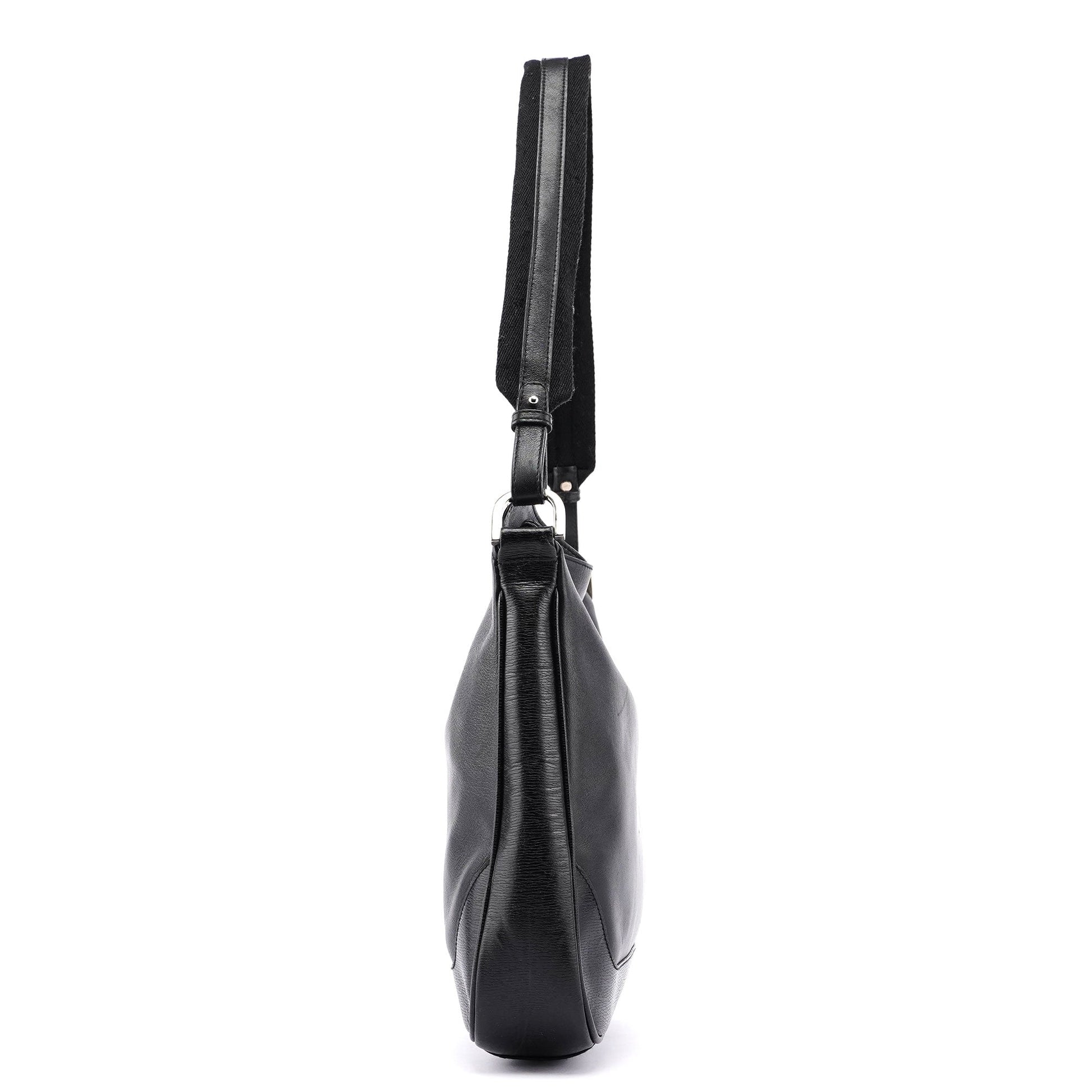 Introducing the Gucci leather hobo bag, designed by Tom Ford in the late 1990s. Handcrafted from black textured leather with silver-tone hardware, it features a magnetic closure for easy access. The satin-lined interior includes a zipper pocket, combining luxury with practicality.