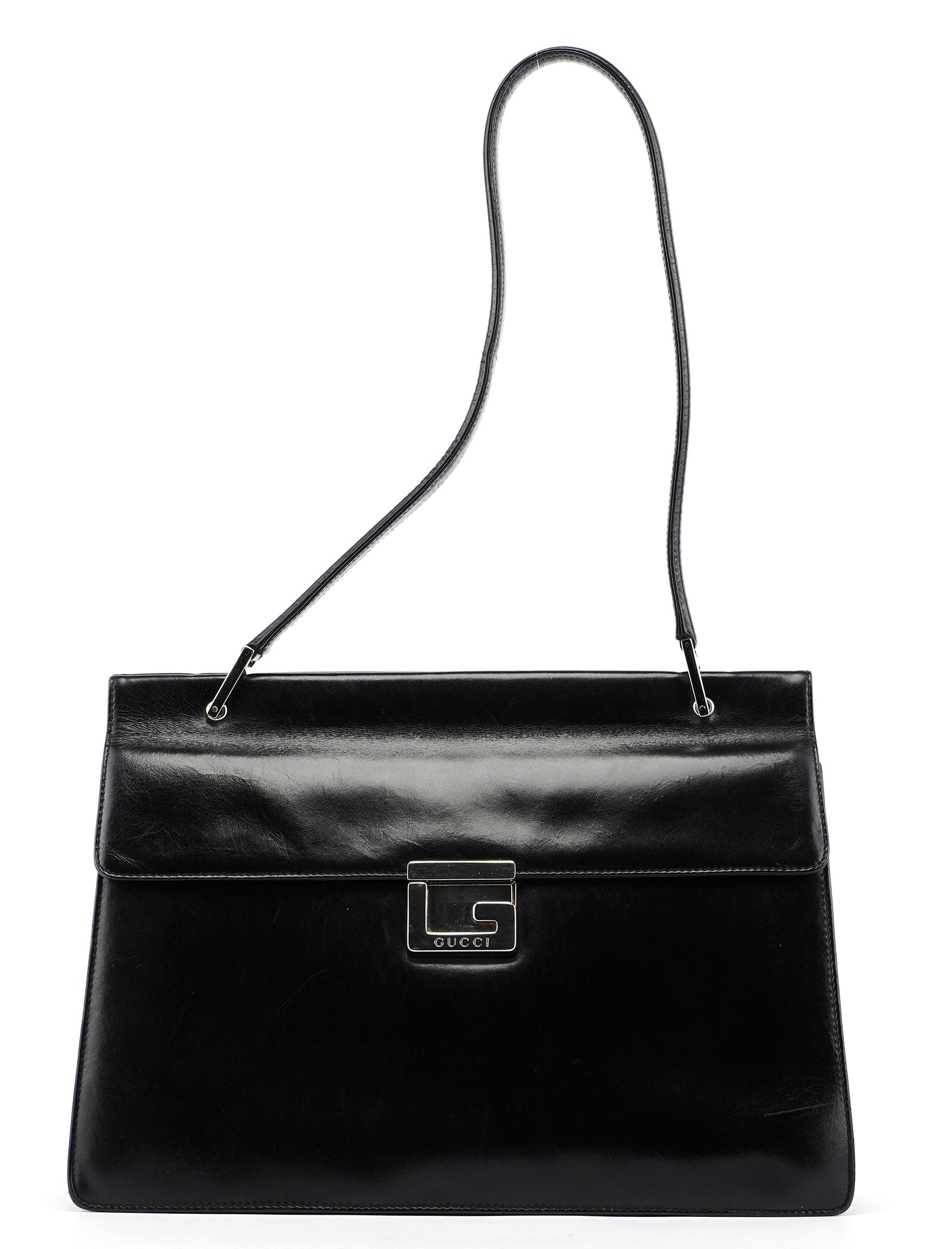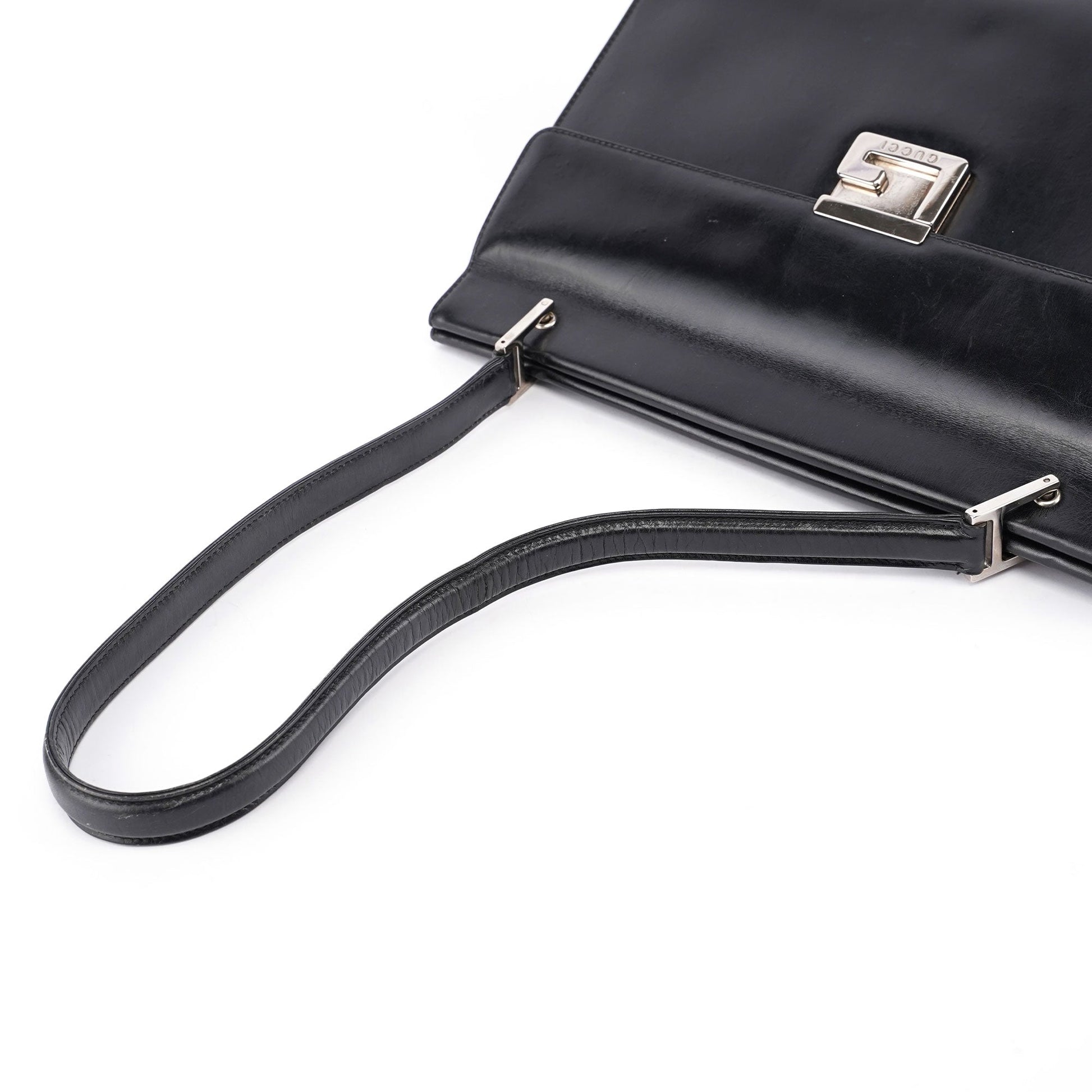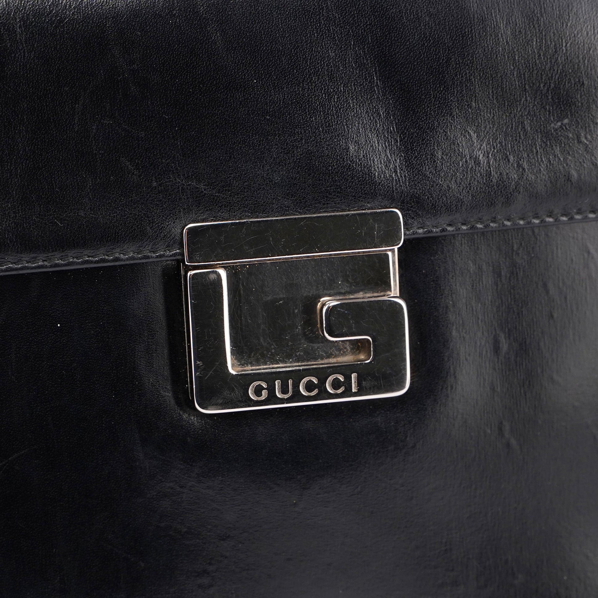 Introducing the Gucci Square G shoulder bag, designed by Tom Ford in the late 1990s. Crafted from black leather, it features silver-tone hardware engraved with the Gucci logo. The interior is lined in red leather and boasts two compartments along with an interior pocket, marrying style with functionality.