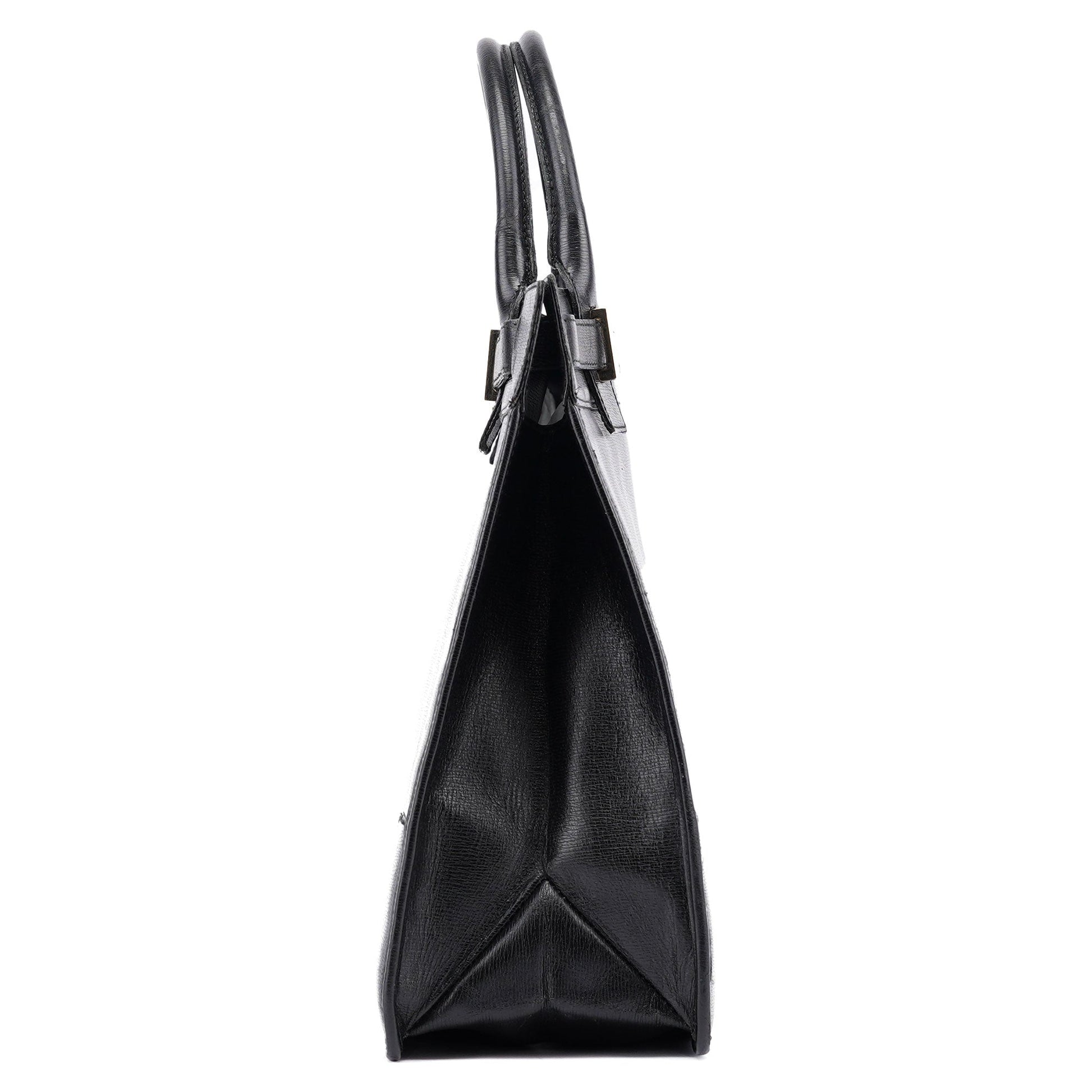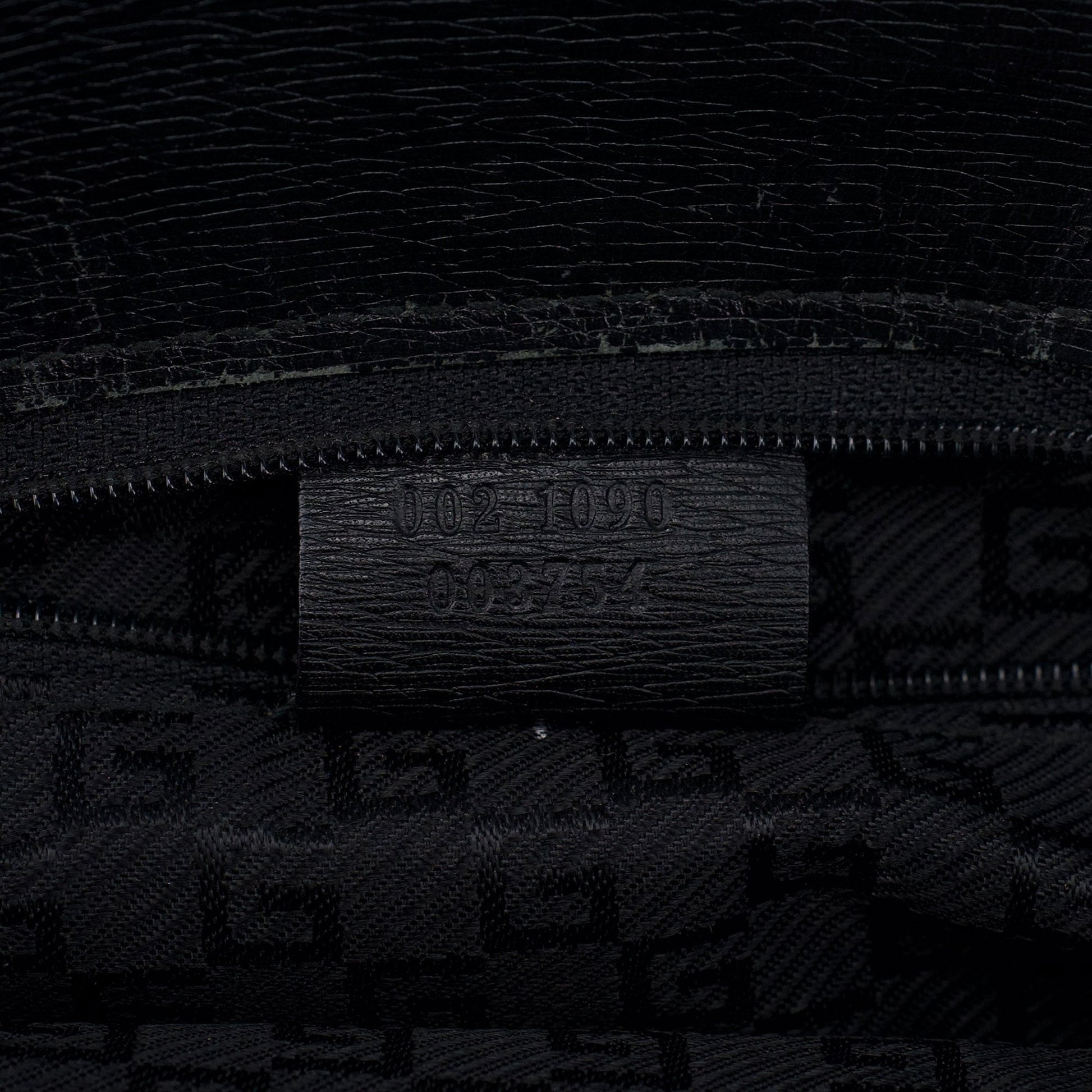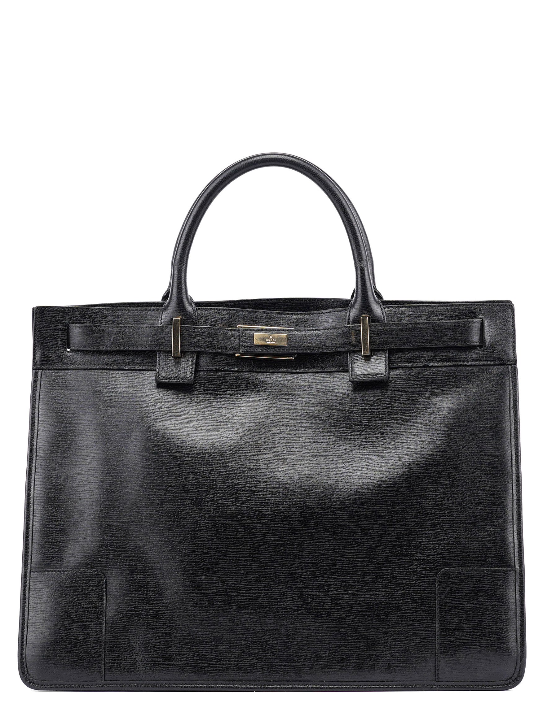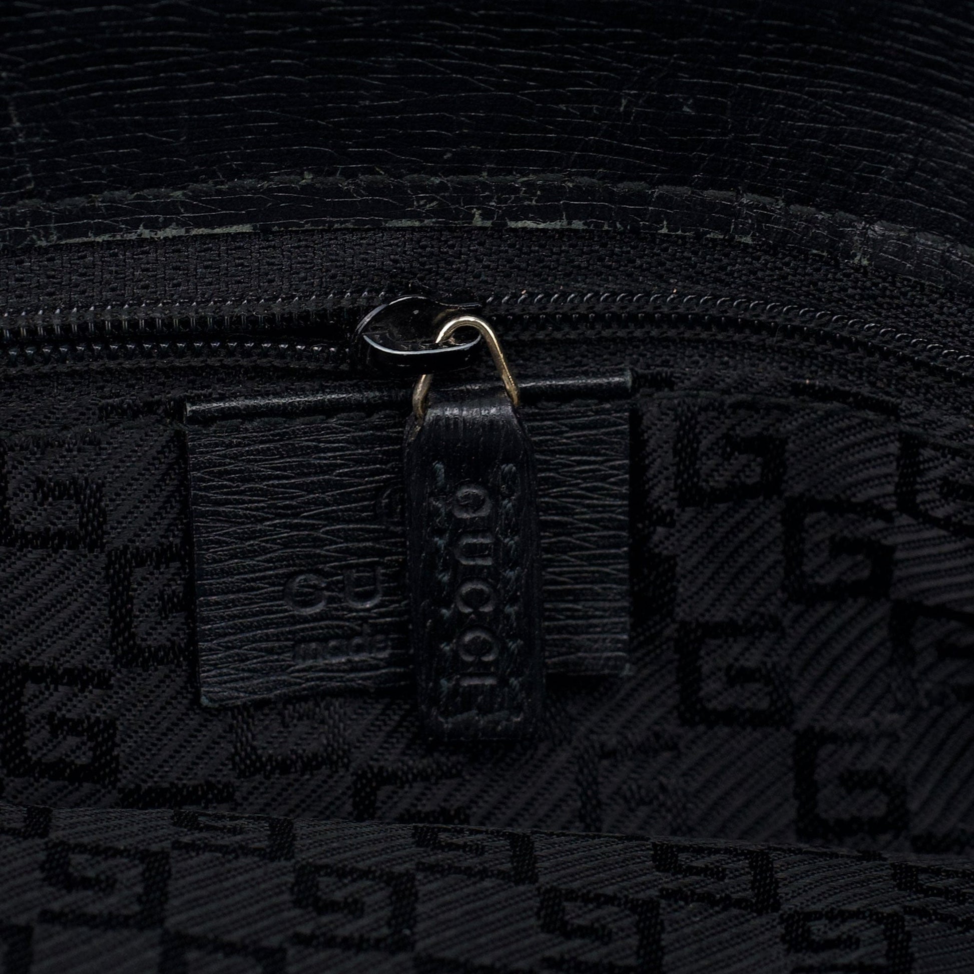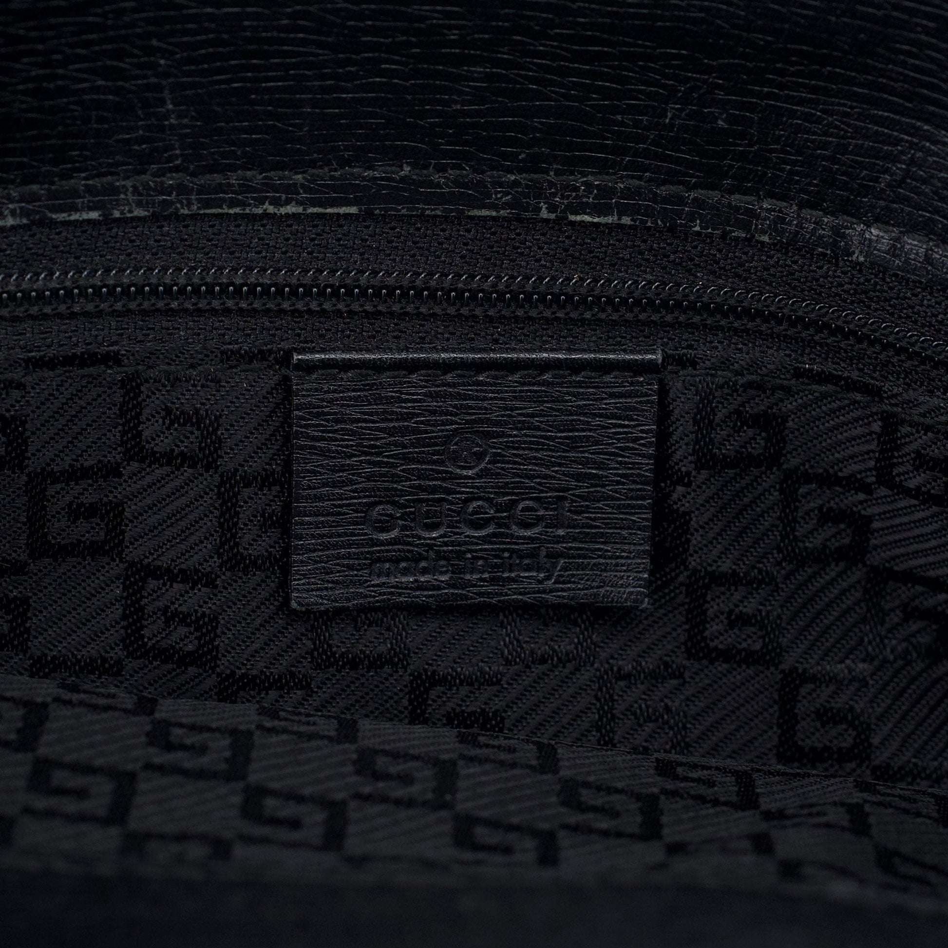 Designed by Tom Ford in the late 1990s, this Gucci tote bag is handcrafted from black leather and features gold-tone hardware engraved with the Gucci logo. The satin-lined interior includes a zipper pocket, blending timeless elegance with practical functionality.