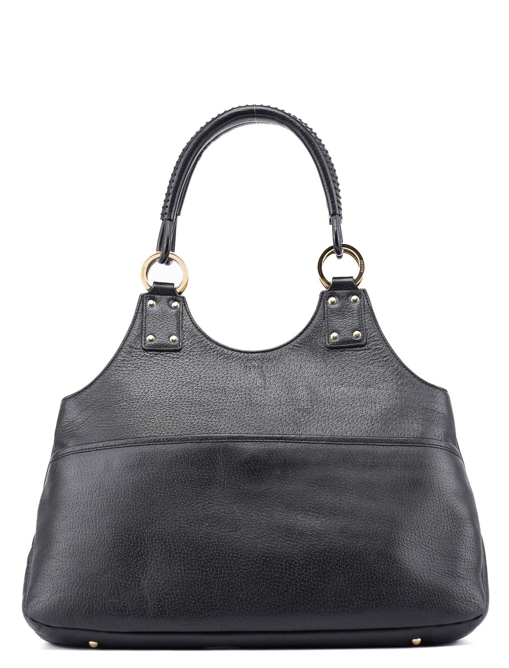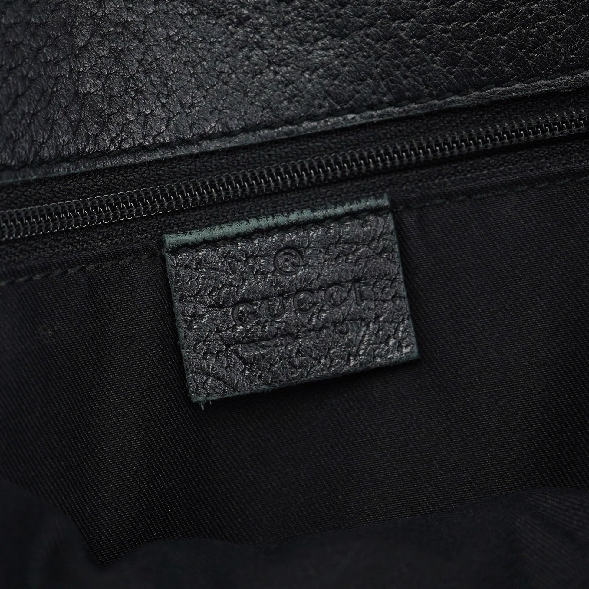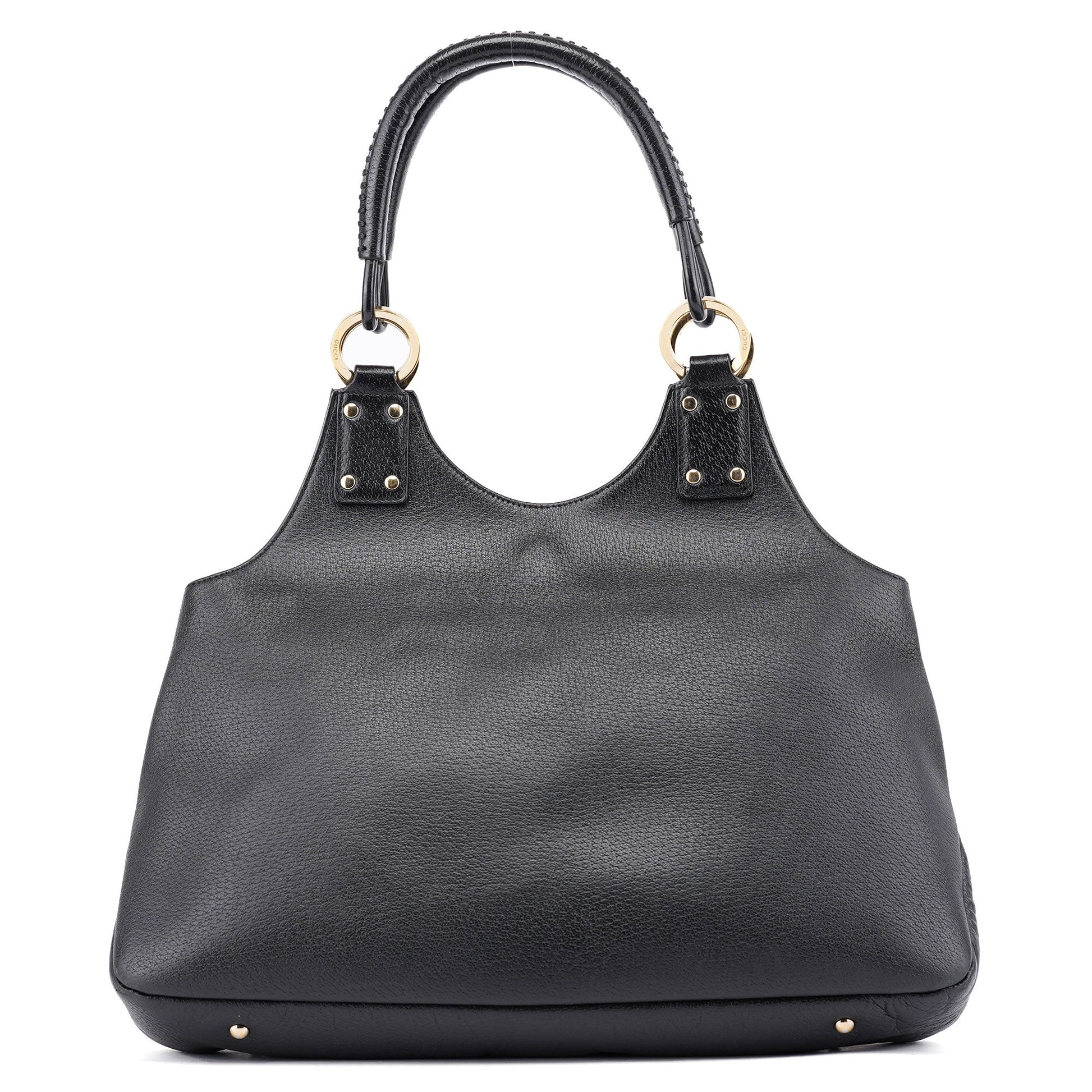 Designed by Tom Ford in the late 1990s, this Gucci tote bag is handcrafted from black leather and features gold-tone hardware engraved with the Gucci logo. It includes a front pocket, magnetic closure, and a cotton-lined interior with an interior zipper pocket, combining style and functionality with timeless elegance.