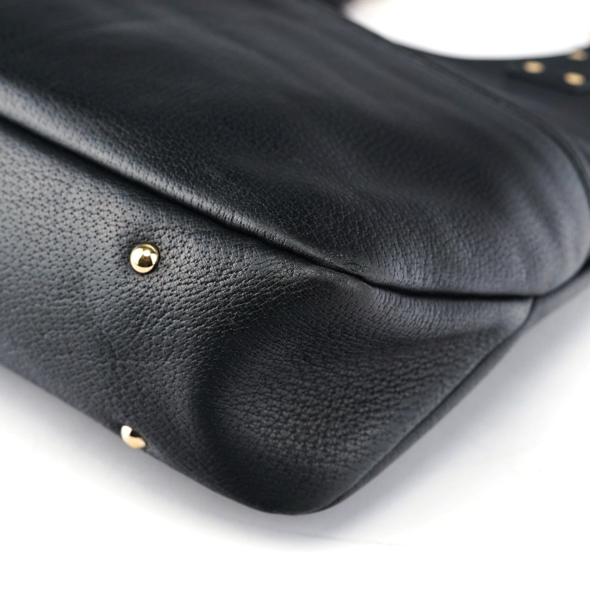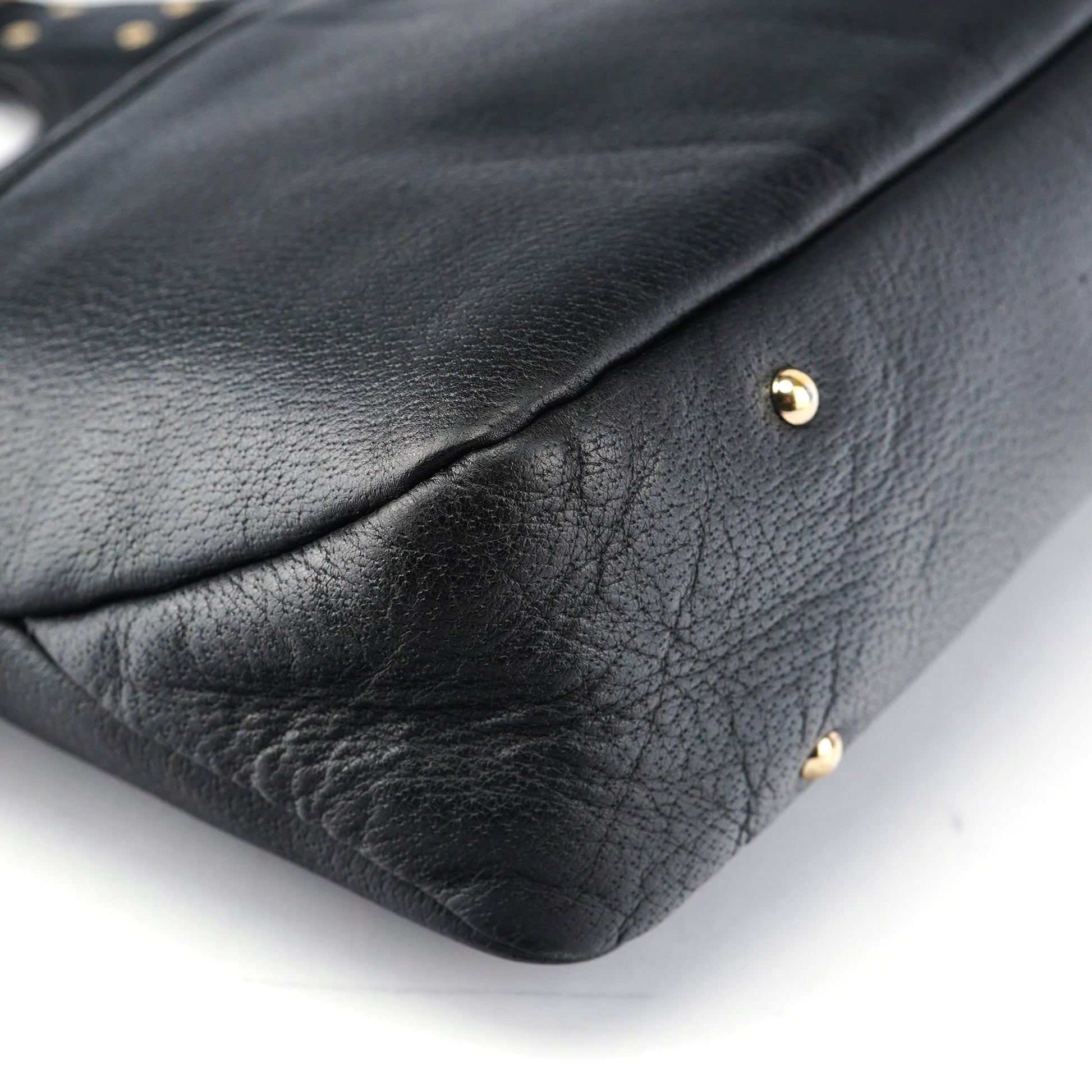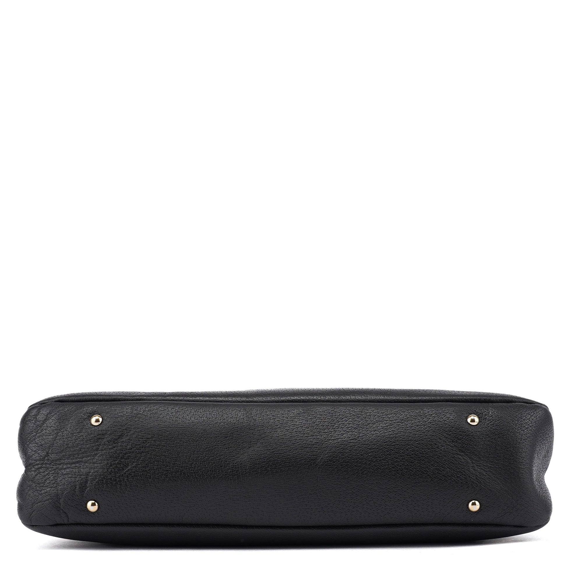 Designed by Tom Ford in the late 1990s, this Gucci tote bag is handcrafted from black leather and features gold-tone hardware engraved with the Gucci logo. It includes a front pocket, magnetic closure, and a cotton-lined interior with an interior zipper pocket, combining style and functionality with timeless elegance.