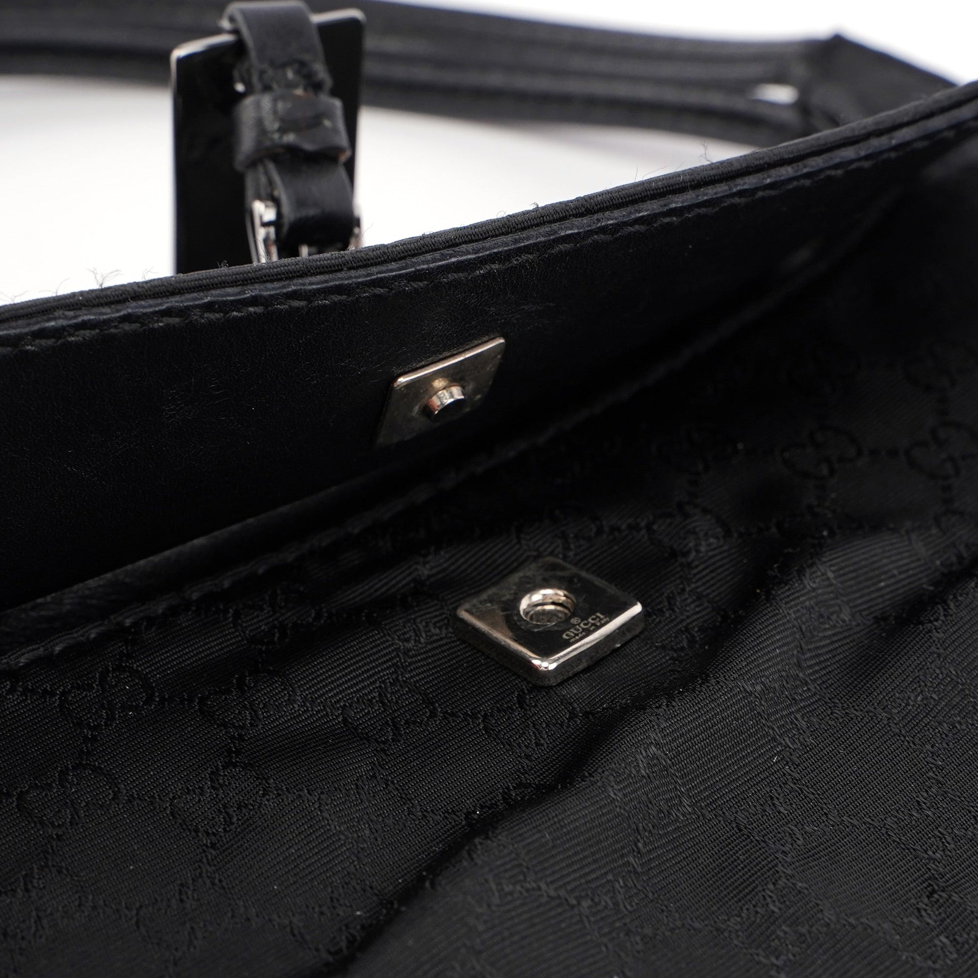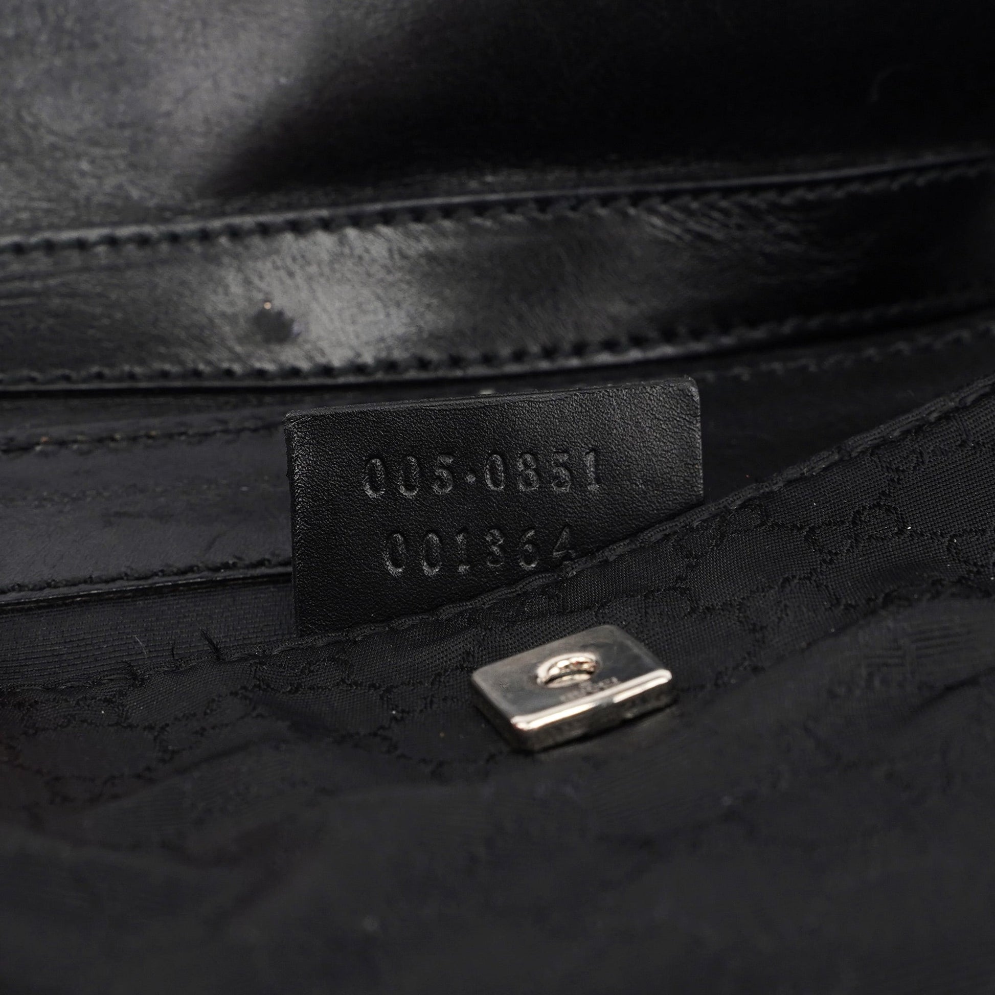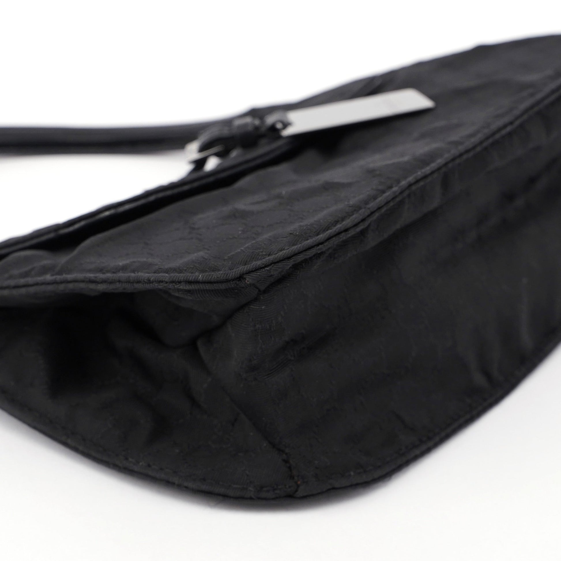 Handcrafted from black micro GG monogram canvas, this Gucci Micro GG bag by Tom Ford from the late 1990s features silver-tone hardware engraved with the Gucci logo, a dual leather handle and trim, and a magnetic closure. The interior is lined in cotton with an interior pocket, showcasing timeless elegance. A silver-tone Gucci logo bangle graces the front.