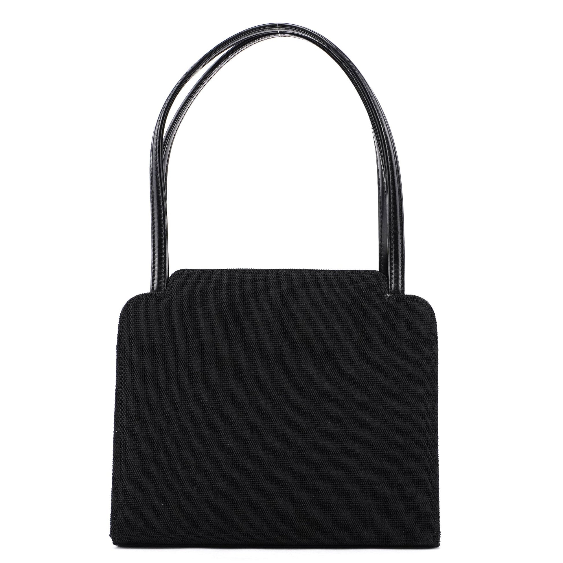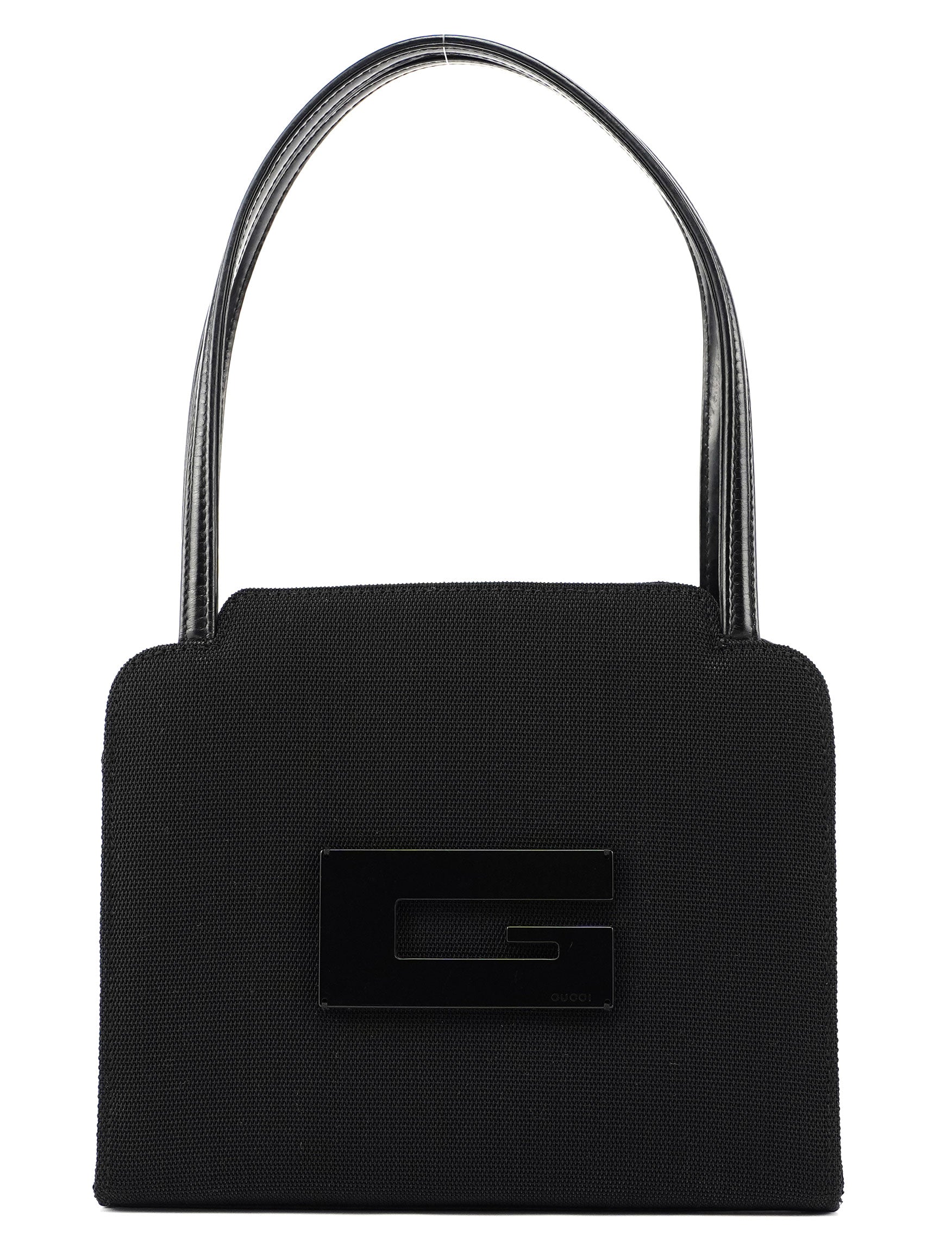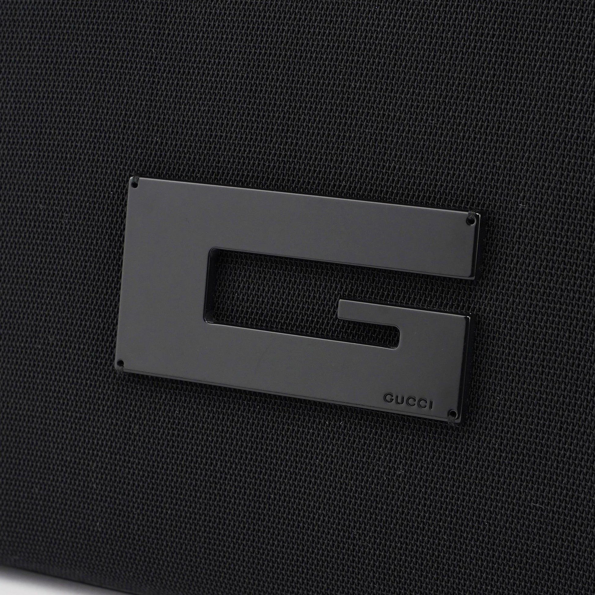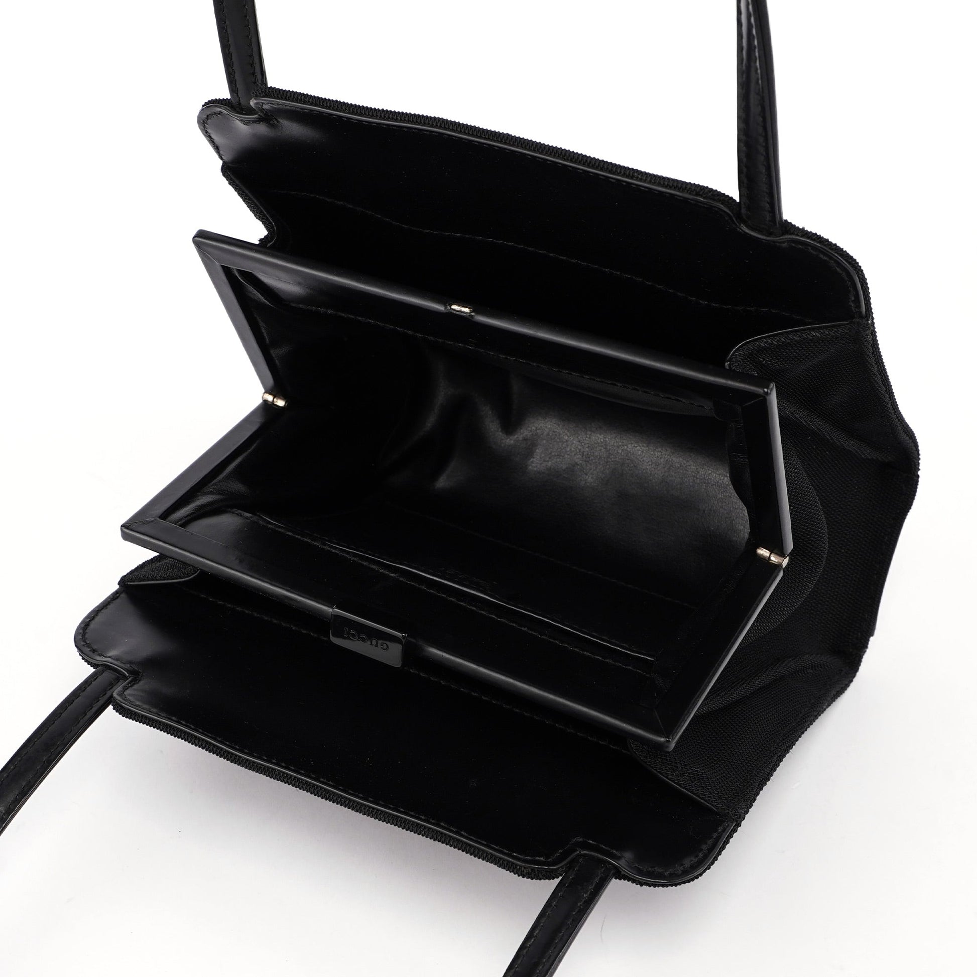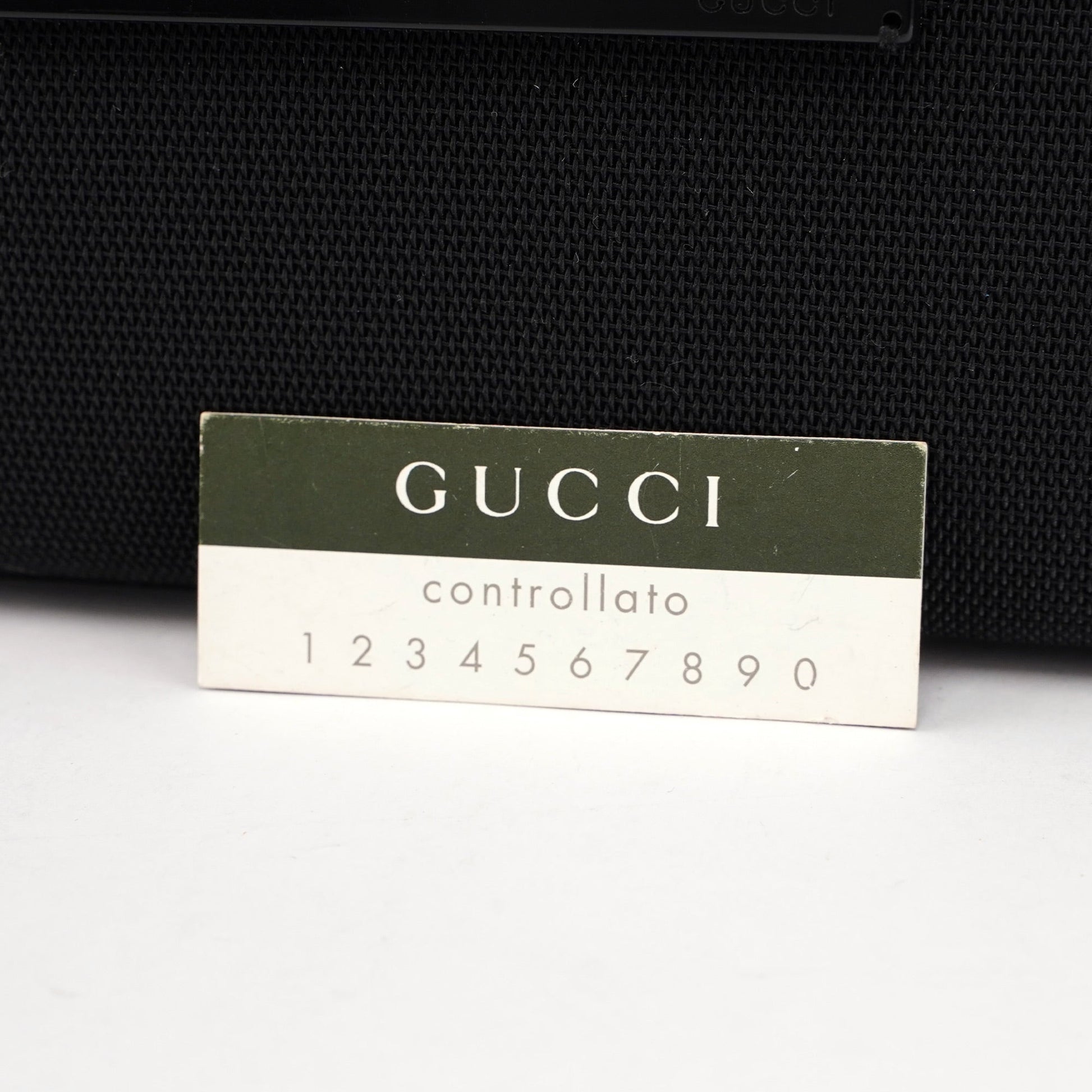 Handcrafted from black nylon mesh with calfskin leather trim, this Gucci Square G bag by Tom Ford from the late 1990s features silver-tone hardware engraved with the Gucci logo. The interior has three leather-lined compartments, one of which closes as a clutch style closure and an interior pocket.