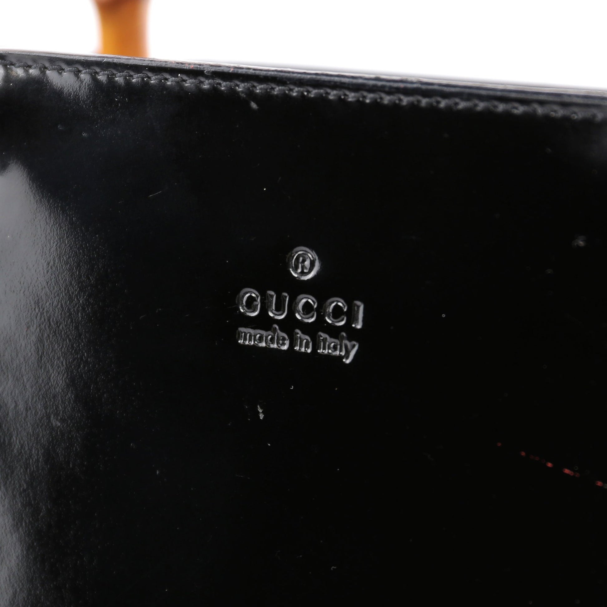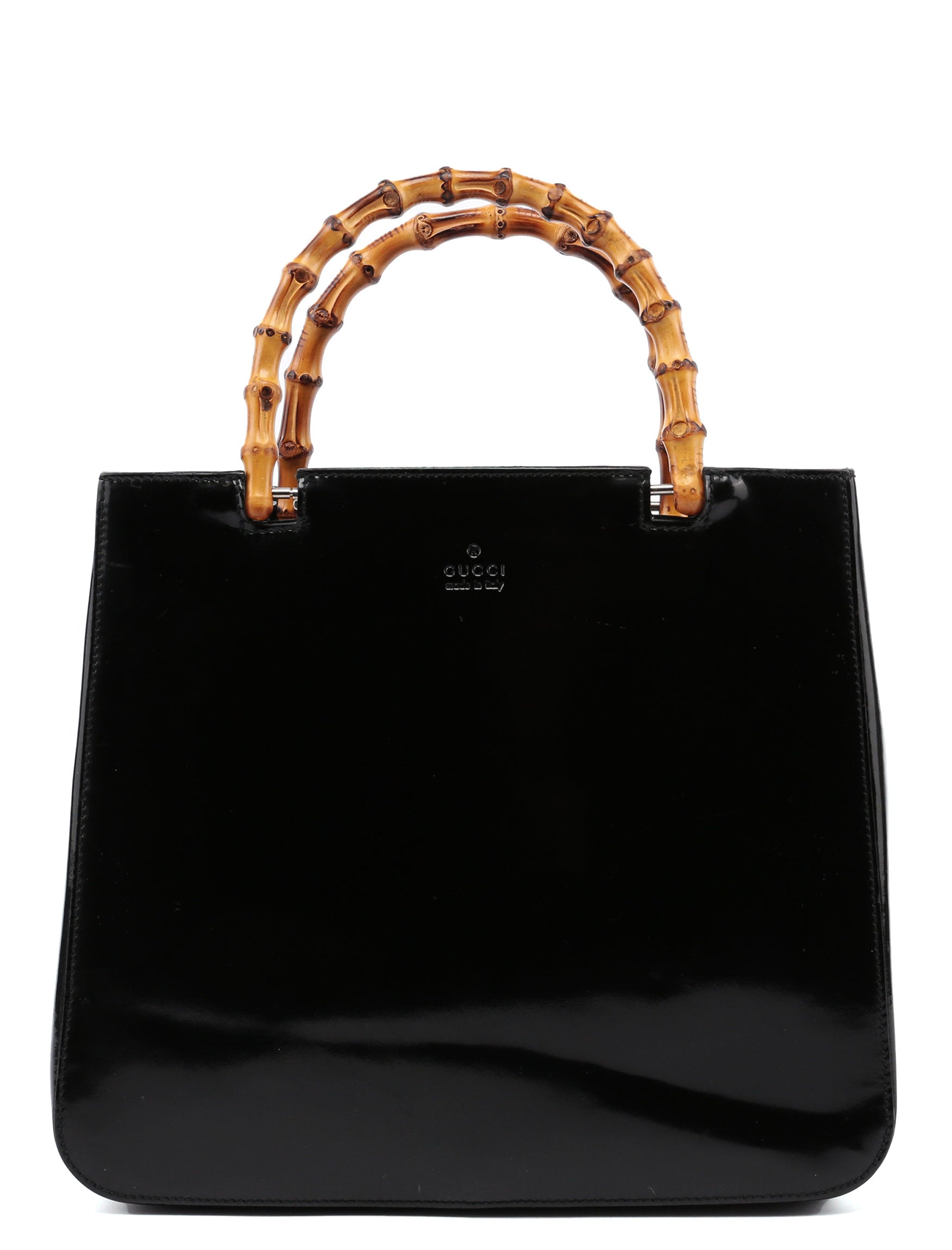 Designed by Tom Ford in the late '90s, this Gucci Bamboo tote bag is handcrafted black patent leather, featuring two iconic bamboo handles. The interior i lined with satin and includes an interior zipper pocket The Gucci logo embossed at the front blends sophisticated style with practicality.