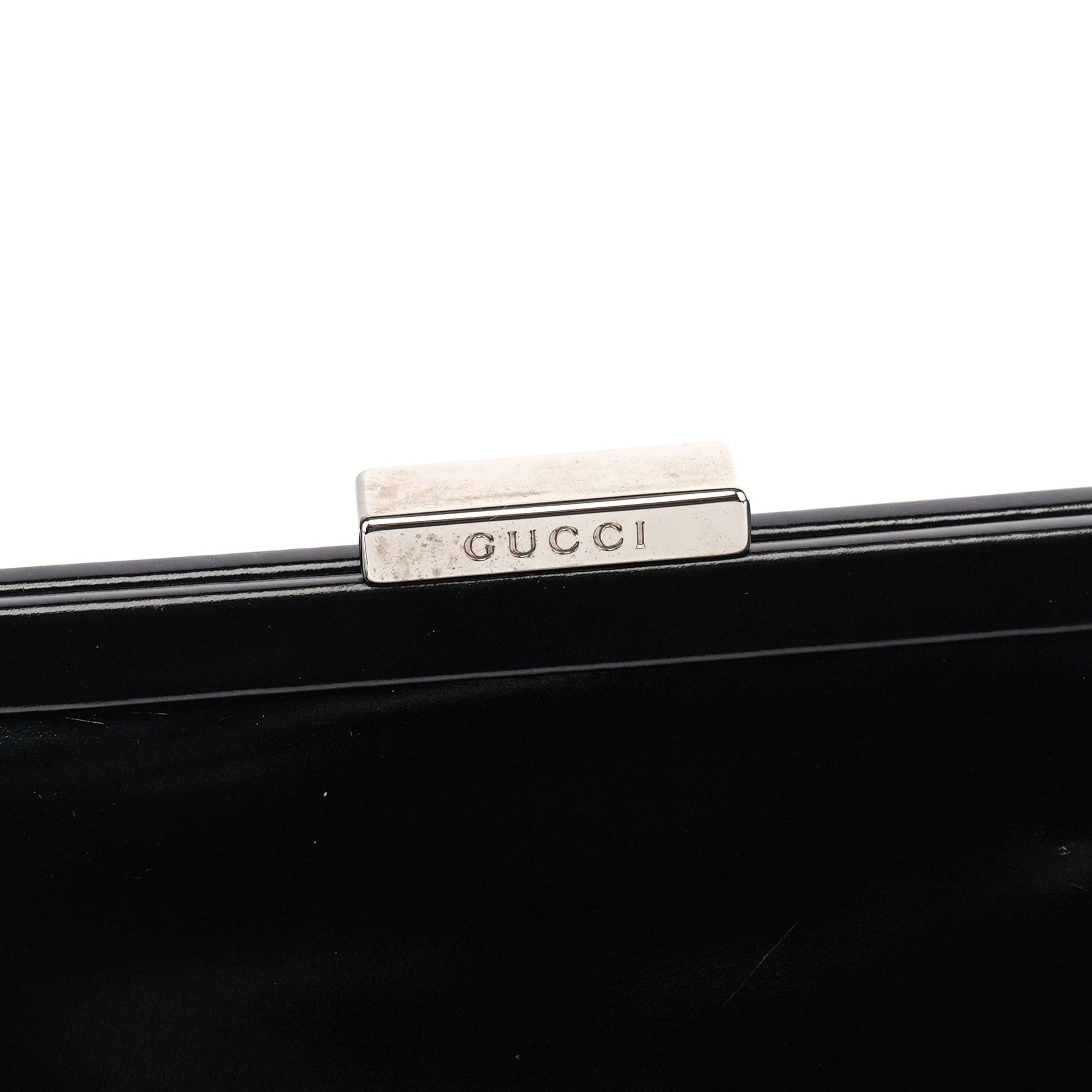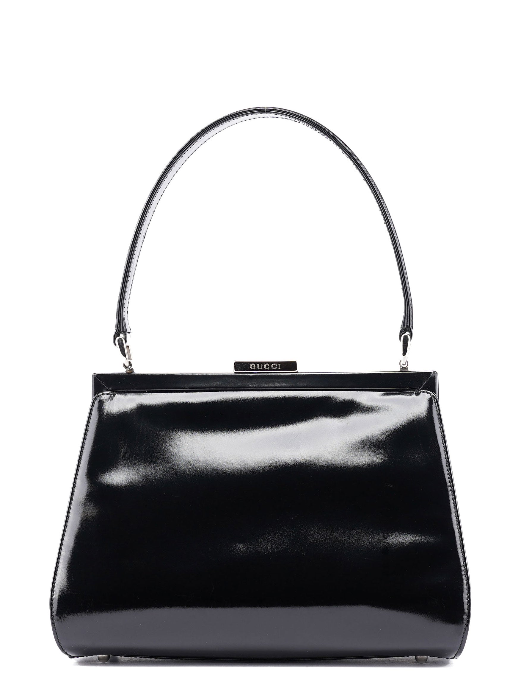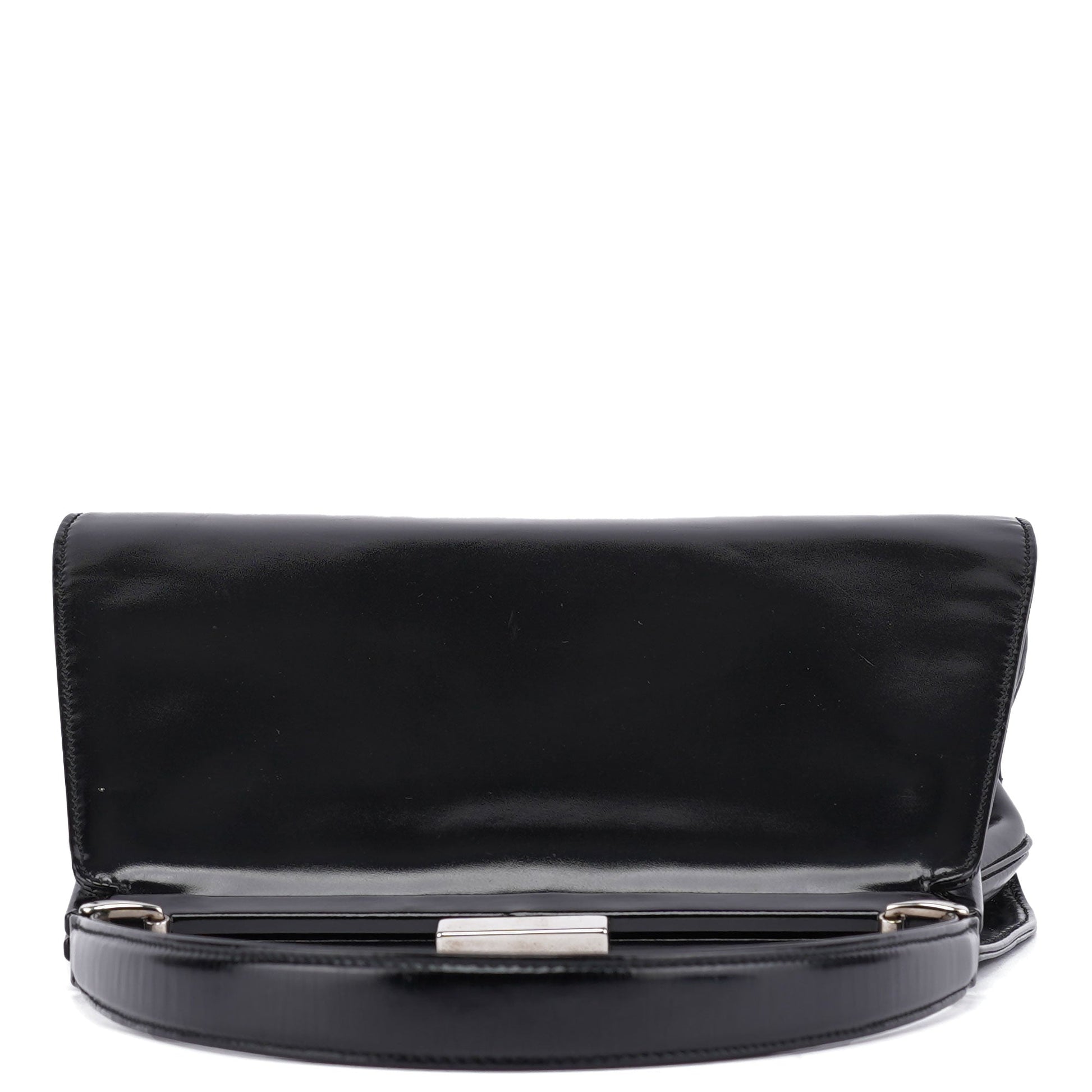 Designed by Tom Ford in the mid-1990s, this Gucci shoulder bag is crafted from black patent leather with silver-tone hardware engraved with the Gucci logo. Featuring a clutch-style closure and a calfskin-lined interior, it effortlessly combines elegance with timeless sophistication.