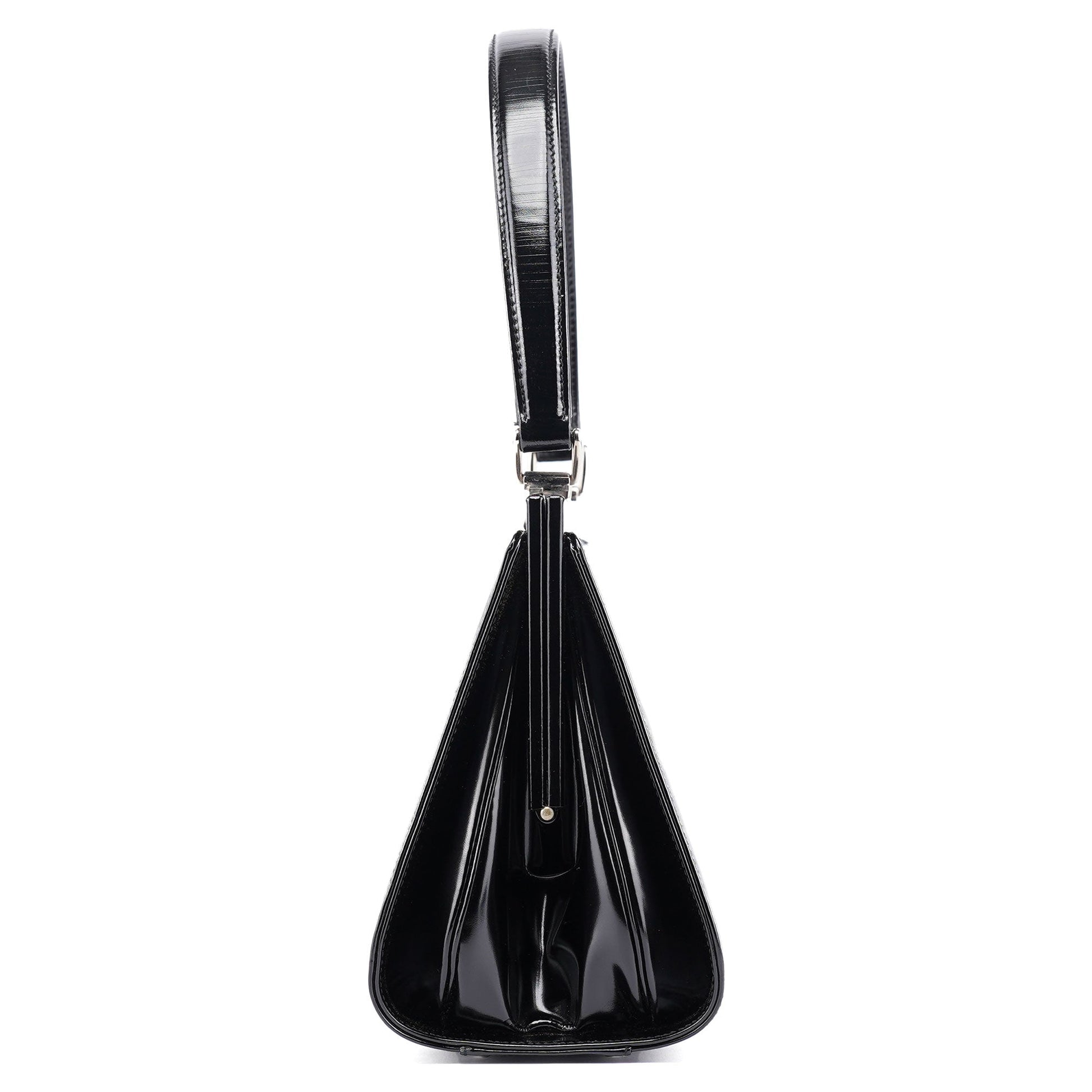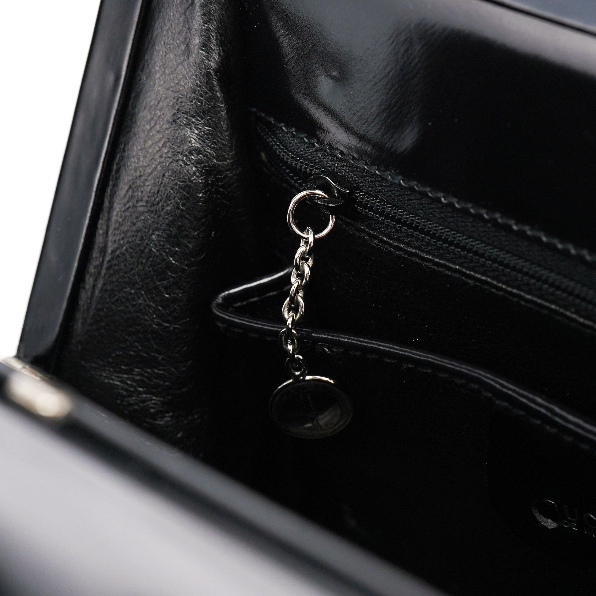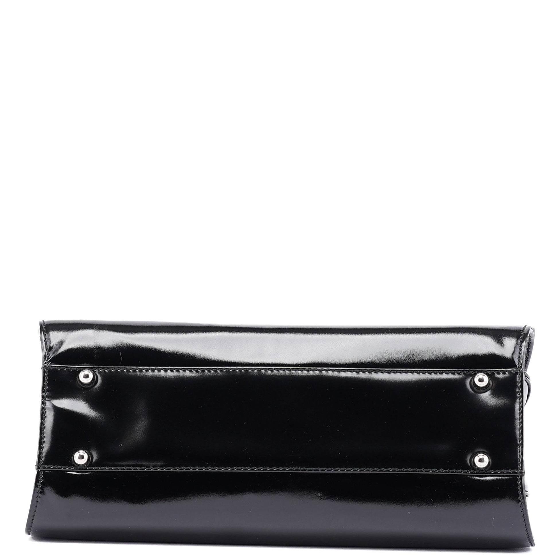 Designed by Tom Ford in the mid-1990s, this Gucci shoulder bag is crafted from black patent leather with silver-tone hardware engraved with the Gucci logo. Featuring a clutch-style closure and a calfskin-lined interior, it effortlessly combines elegance with timeless sophistication.