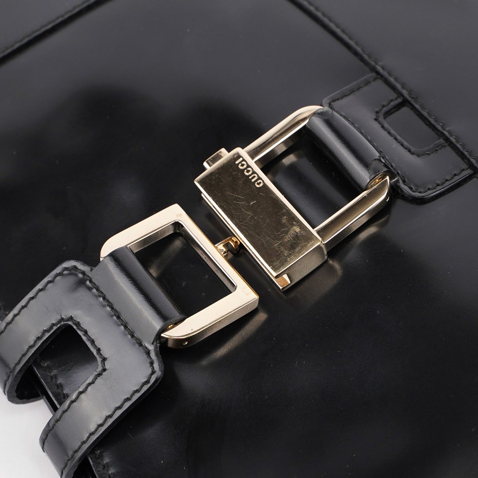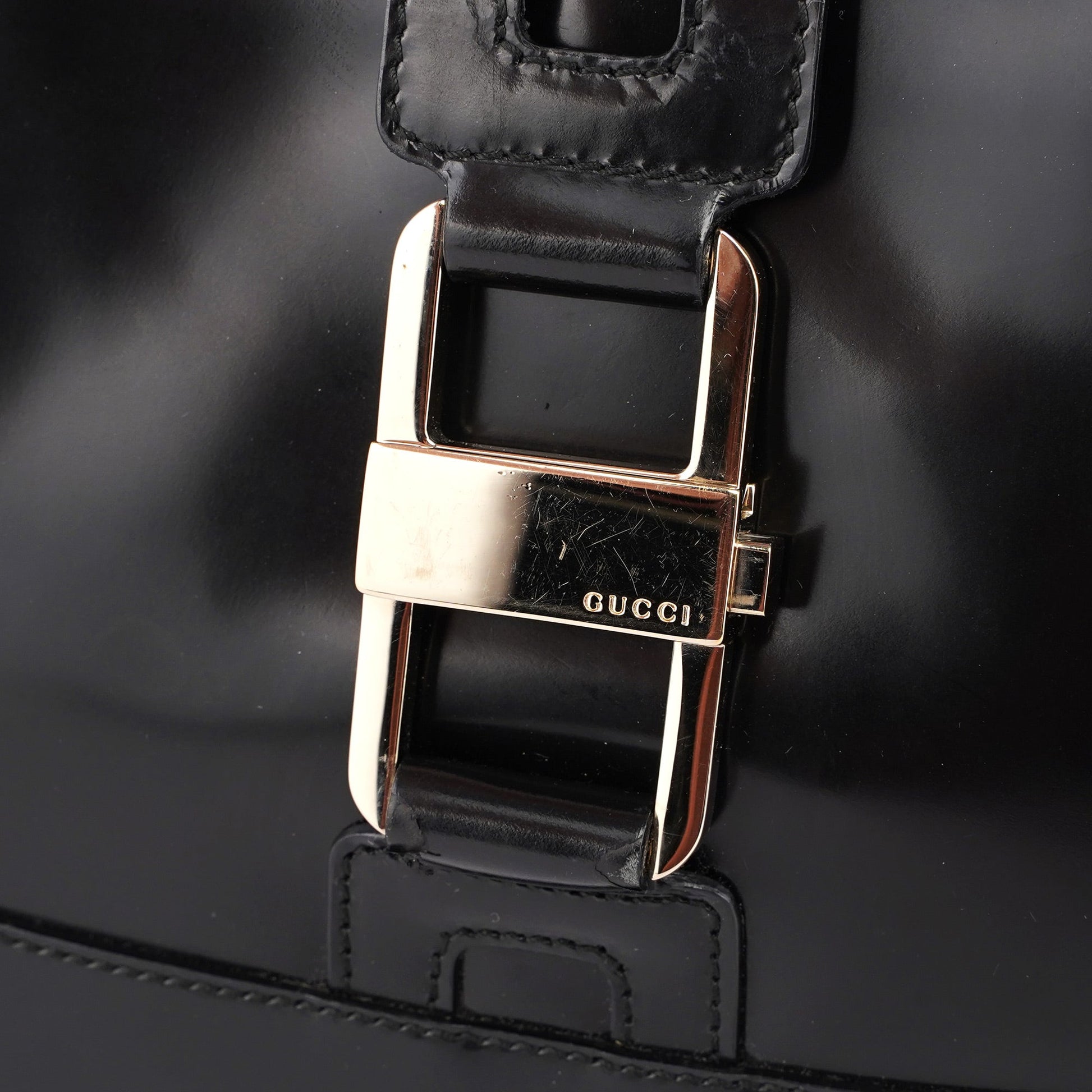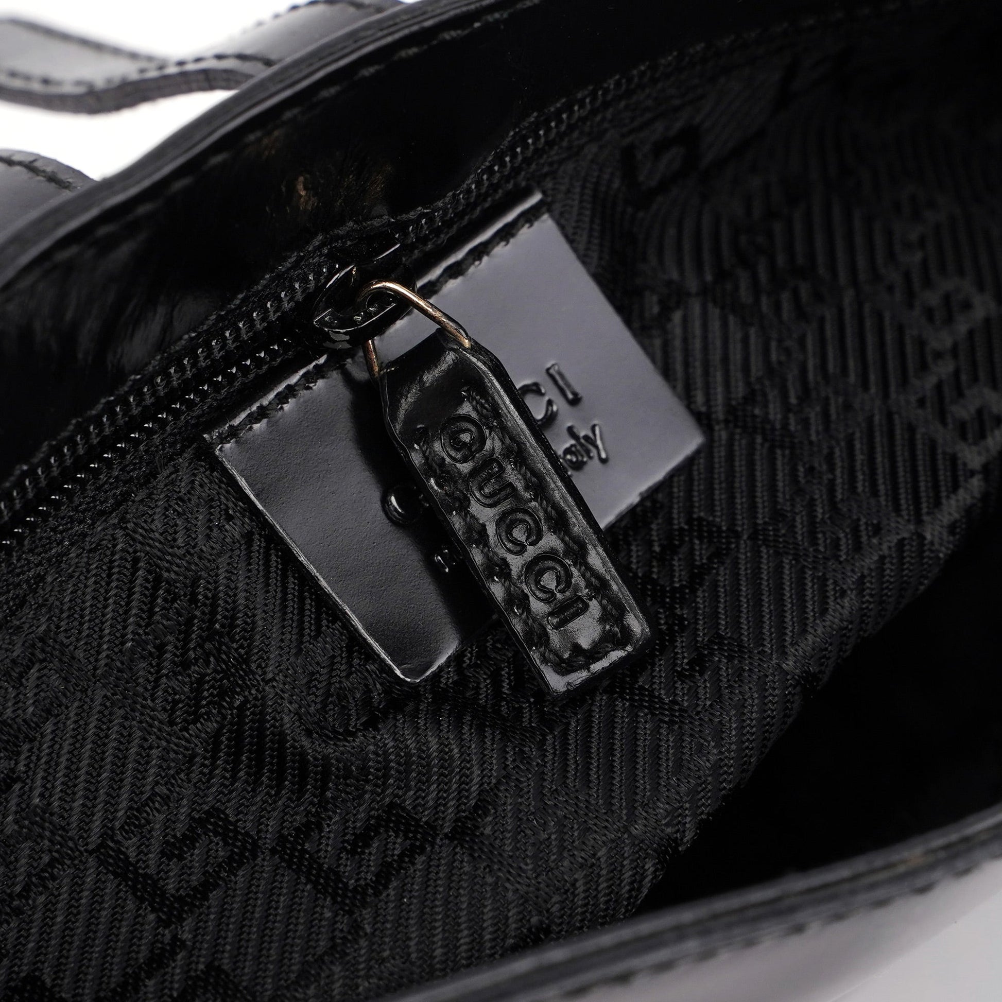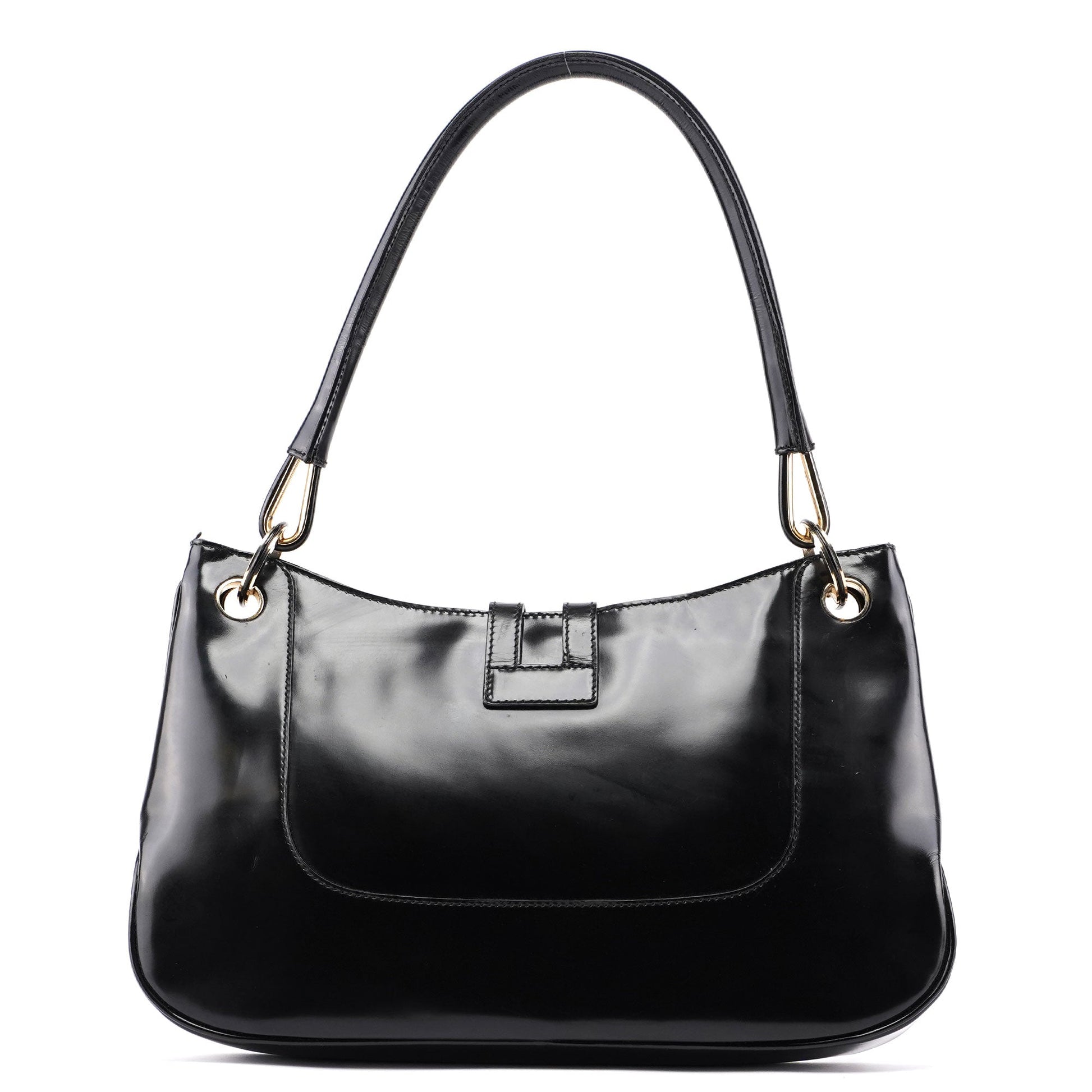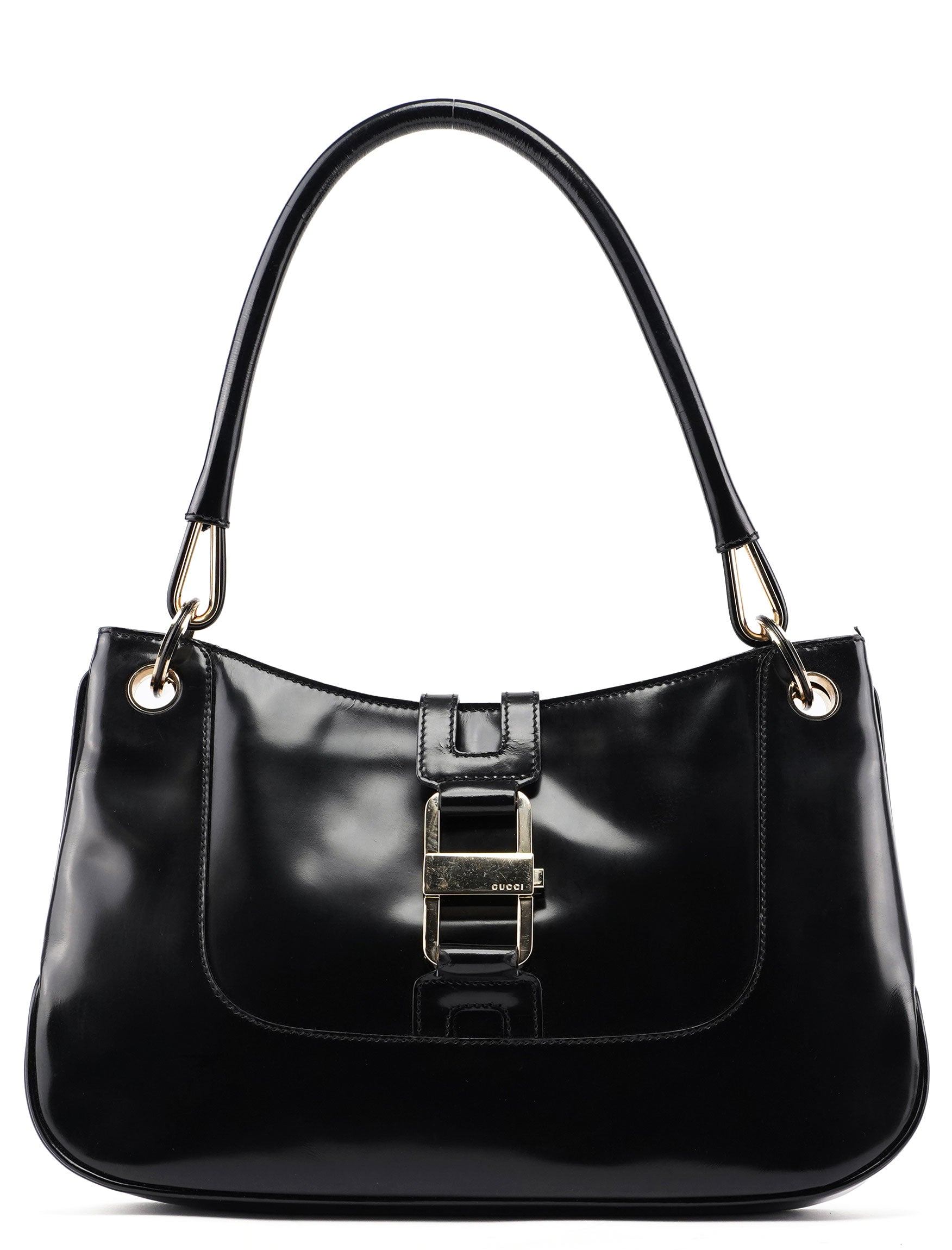 Designed by Tom Ford in the late 1990s, the Gucci Jackie shoulder bag exudes sophistication. Made from black patent leather with gold-tone hardware engraved with the Gucci logo, it features the signature Jackie clasp closure. Inside, the satin-lined interior offers practicality with a convenient interior zipper pocket.