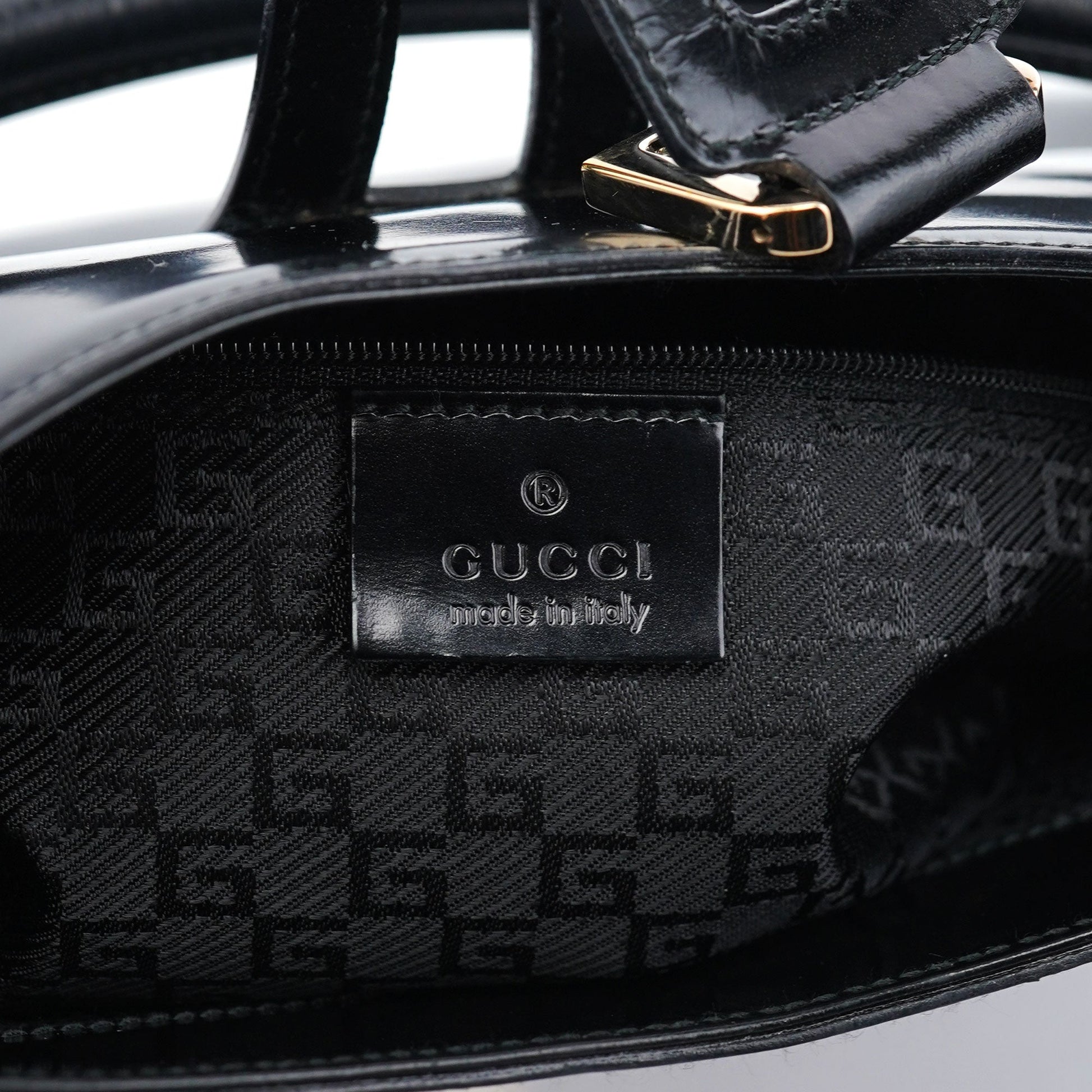 Designed by Tom Ford in the late 1990s, the Gucci Jackie shoulder bag exudes sophistication. Made from black patent leather with gold-tone hardware engraved with the Gucci logo, it features the signature Jackie clasp closure. Inside, the satin-lined interior offers practicality with a convenient interior zipper pocket.