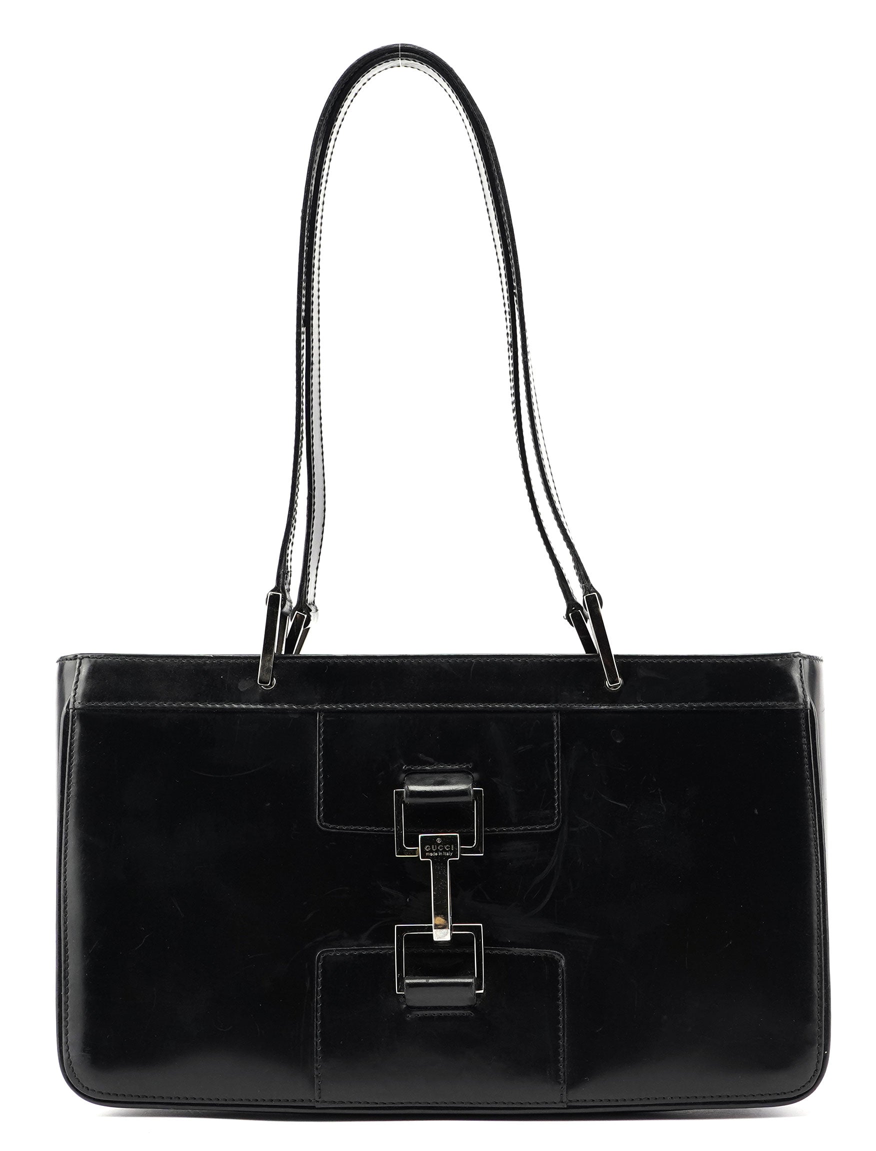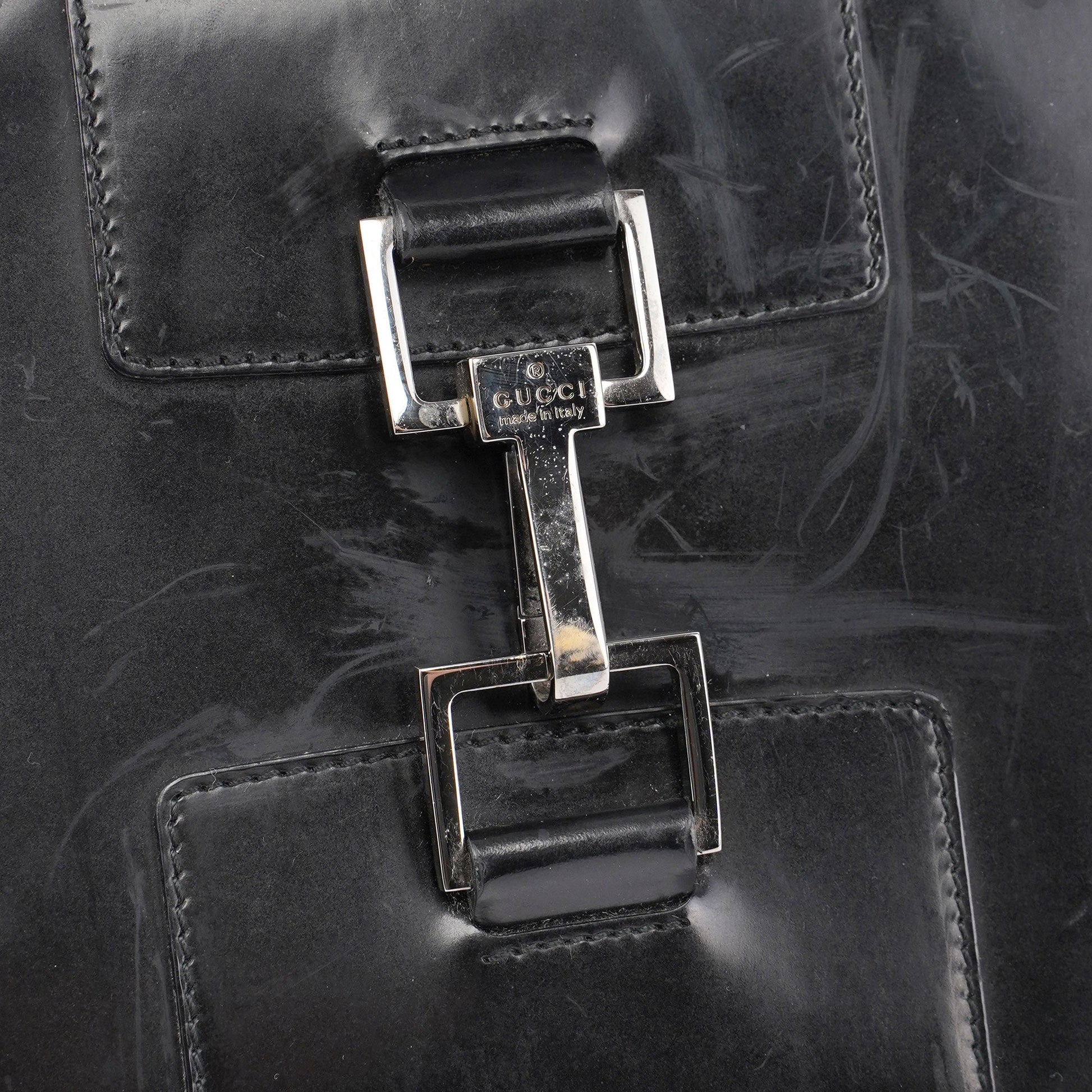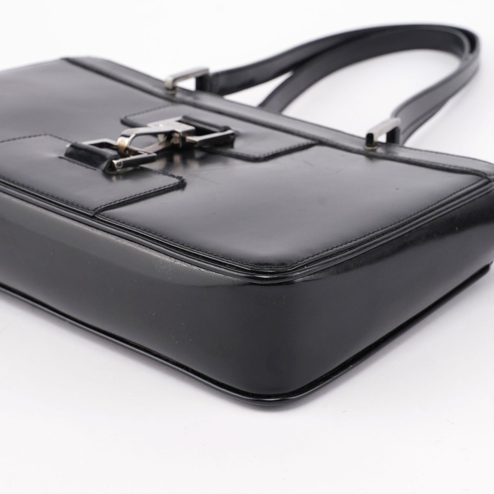 Designed by Tom Ford in the late 1990s, the Gucci Jackie tote epitomizes elegance. Handcrafted in black patent leather, it features silver-tone hardware engraved with the Gucci logo. The Jackie clasp closure adds a touch of sophistication, while the satin-lined interior boasts a convenient zipper pocket.