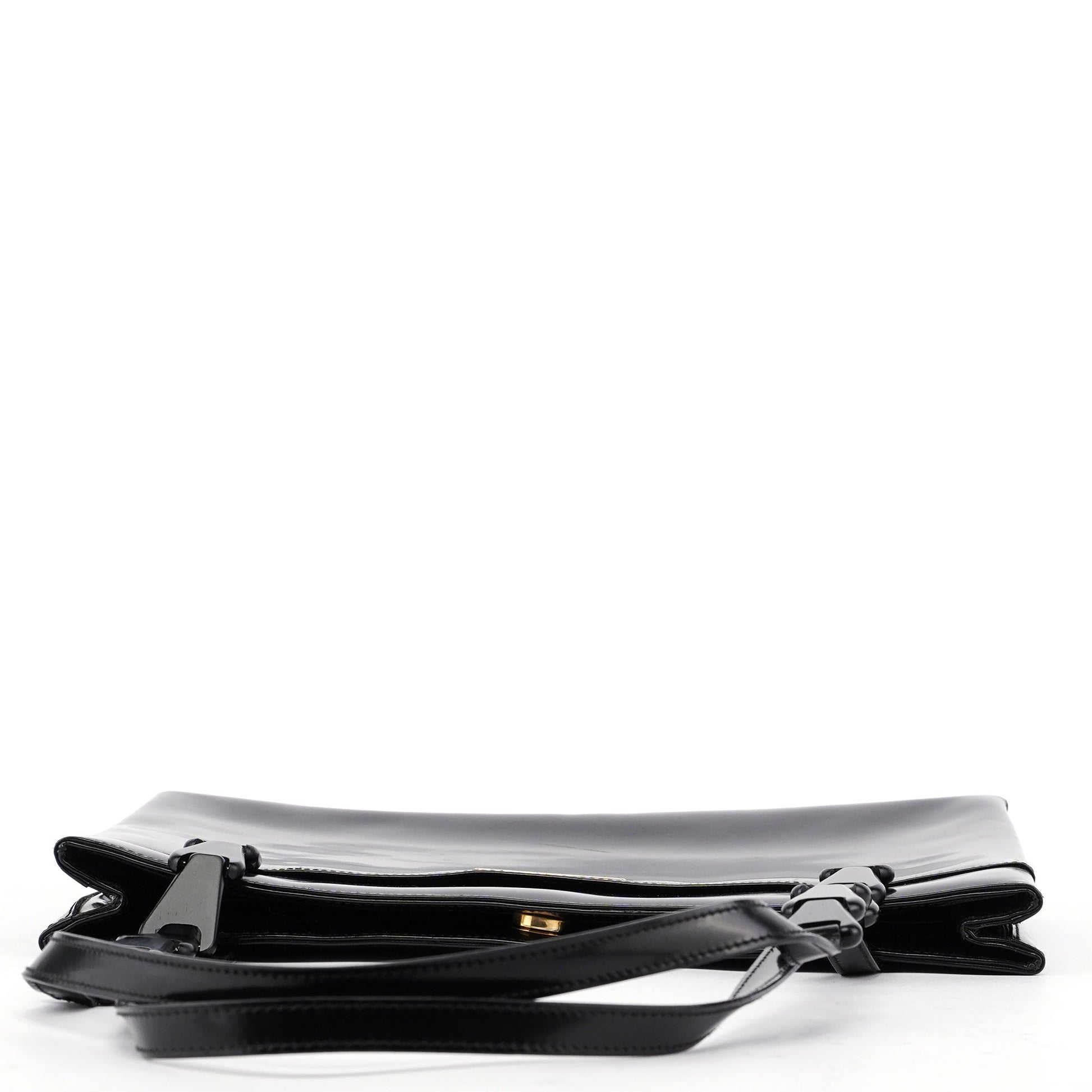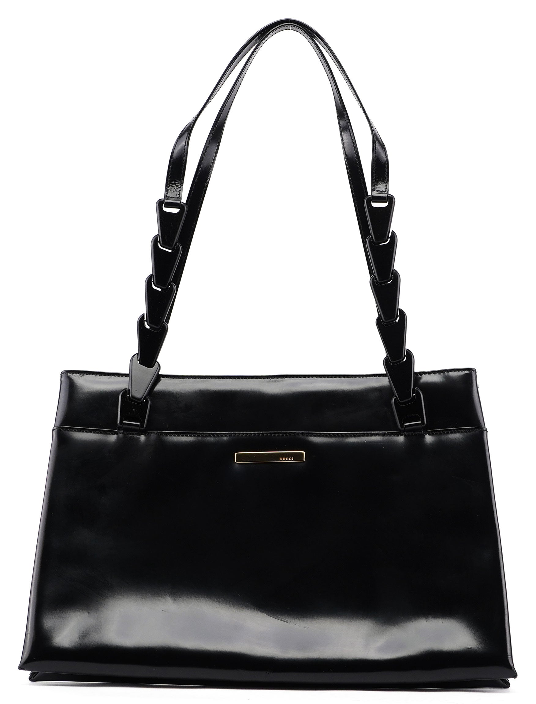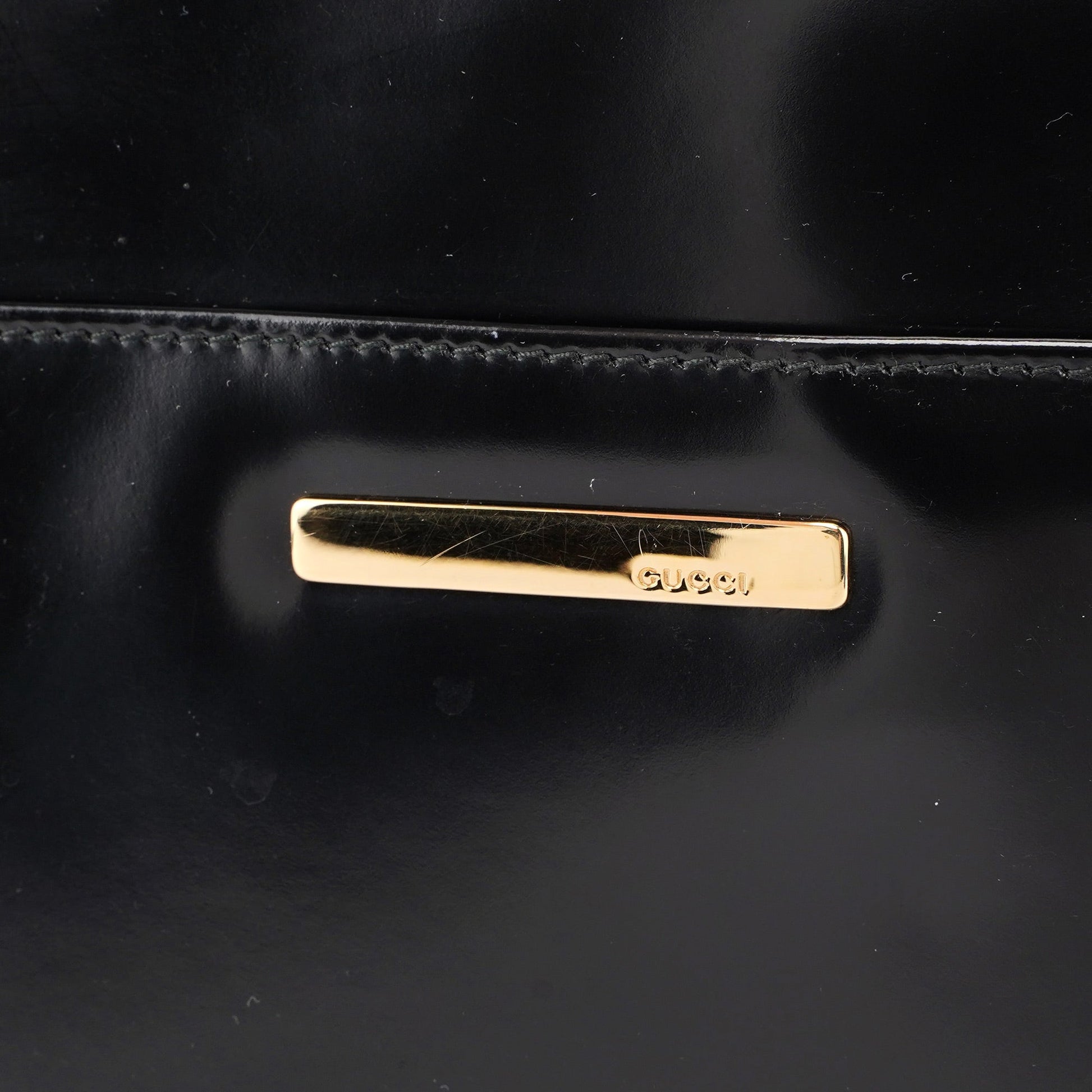 Handcrafted from black patent leather, this Gucci Spazzolato bag by Tom Ford from the late 1990s features wood details on the handle, a magnetic closure, and a satin-lined interior with an interior pocket. The Gucci logo plate adorns the front, showcasing timeless elegance.