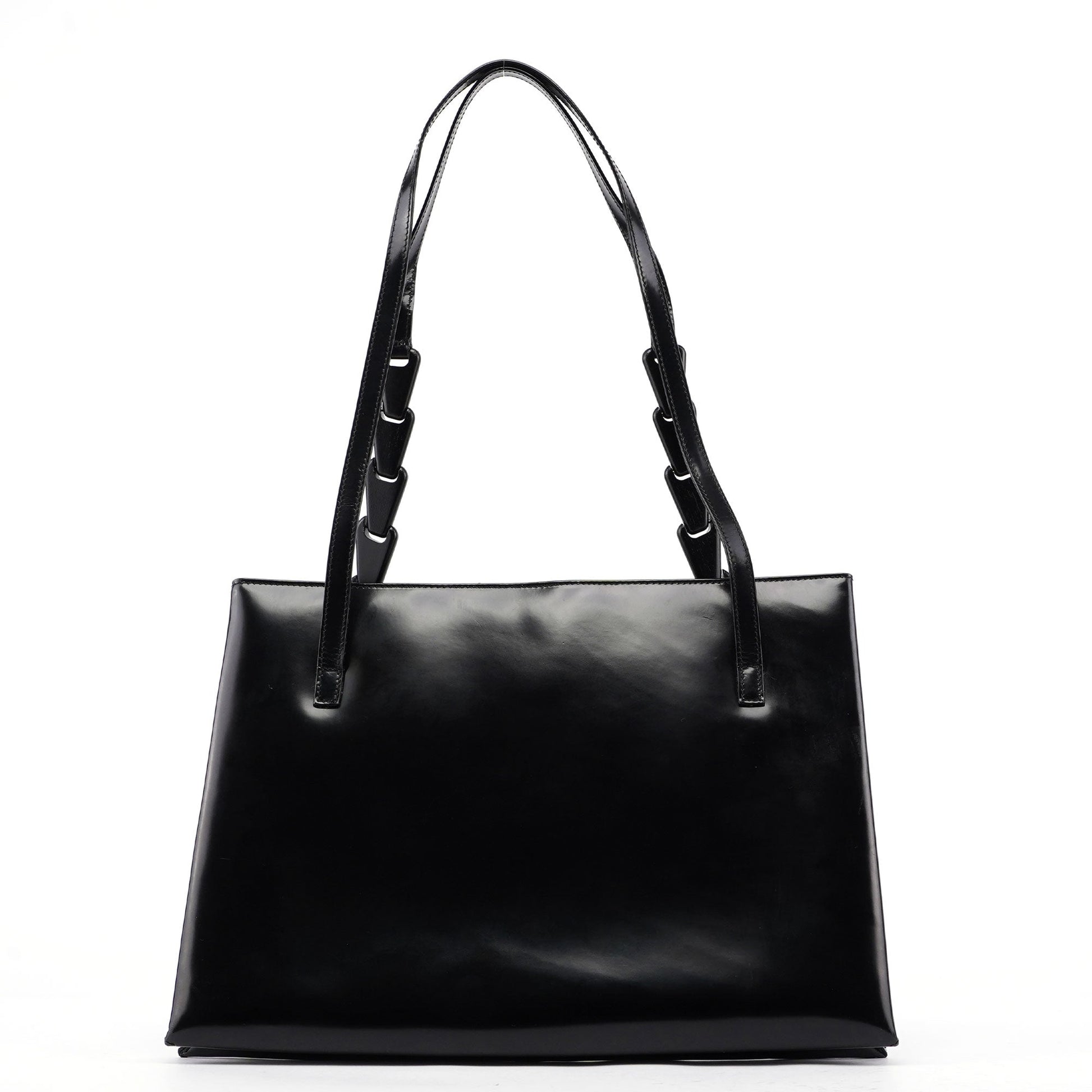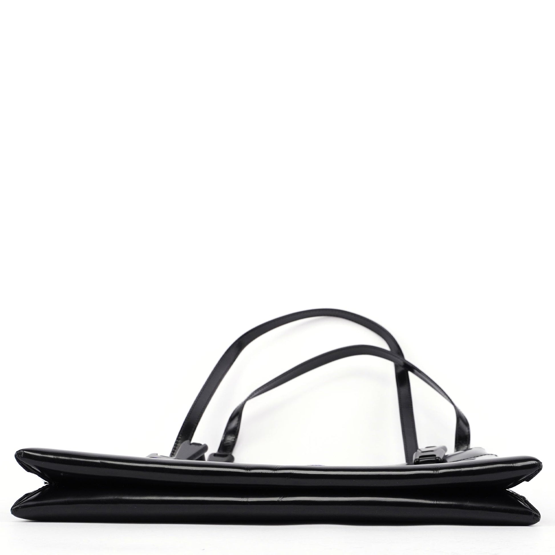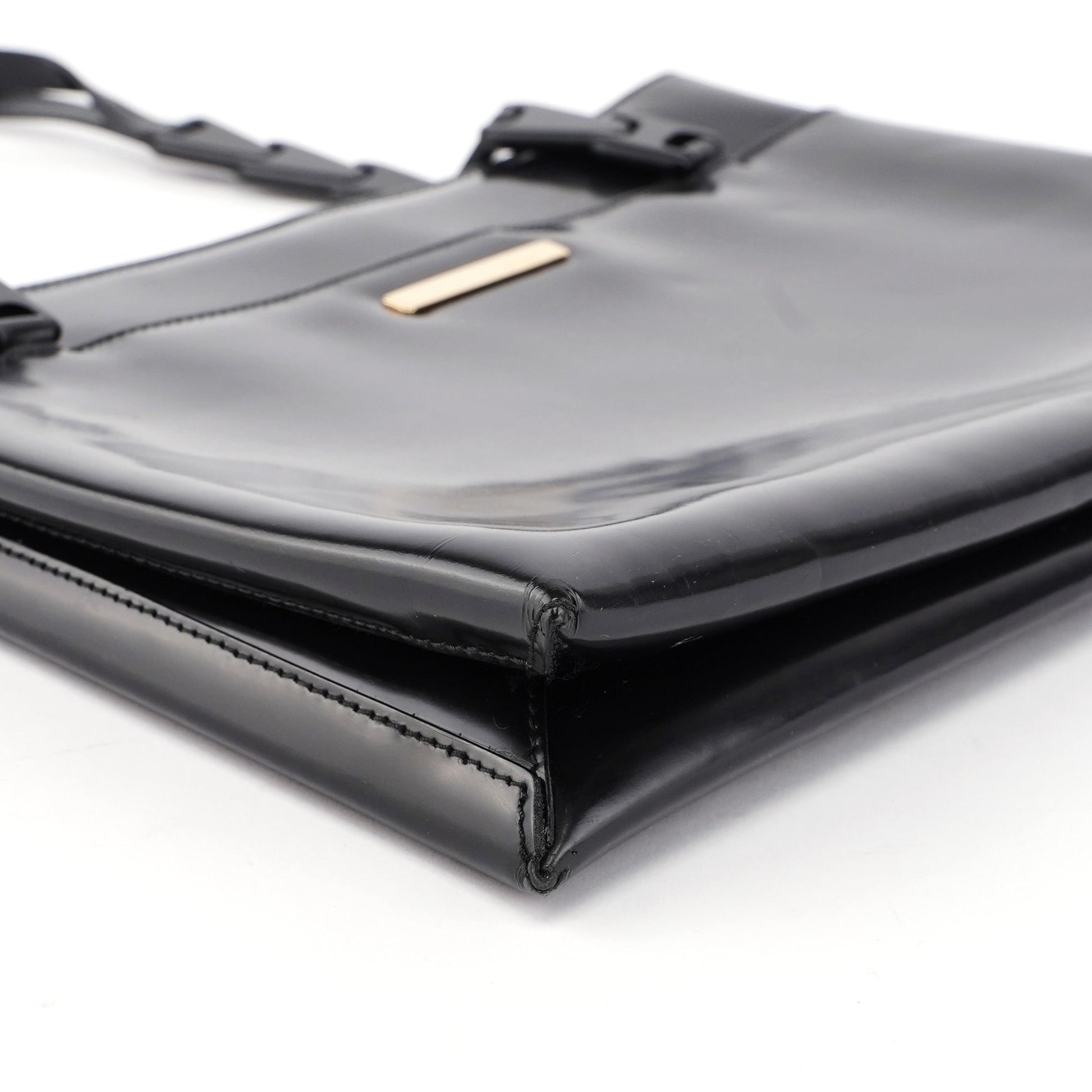 Handcrafted from black patent leather, this Gucci Spazzolato bag by Tom Ford from the late 1990s features wood details on the handle, a magnetic closure, and a satin-lined interior with an interior pocket. The Gucci logo plate adorns the front, showcasing timeless elegance.