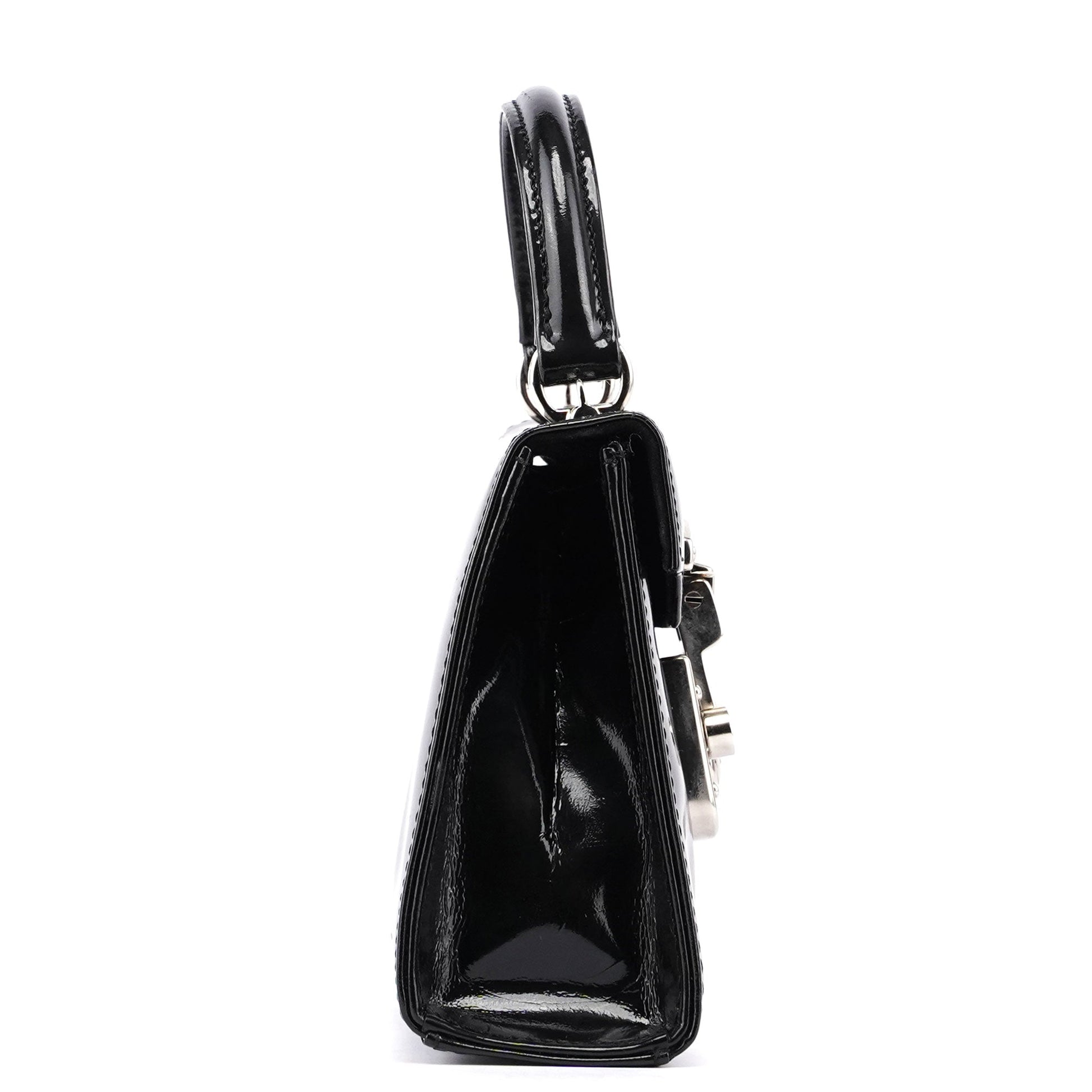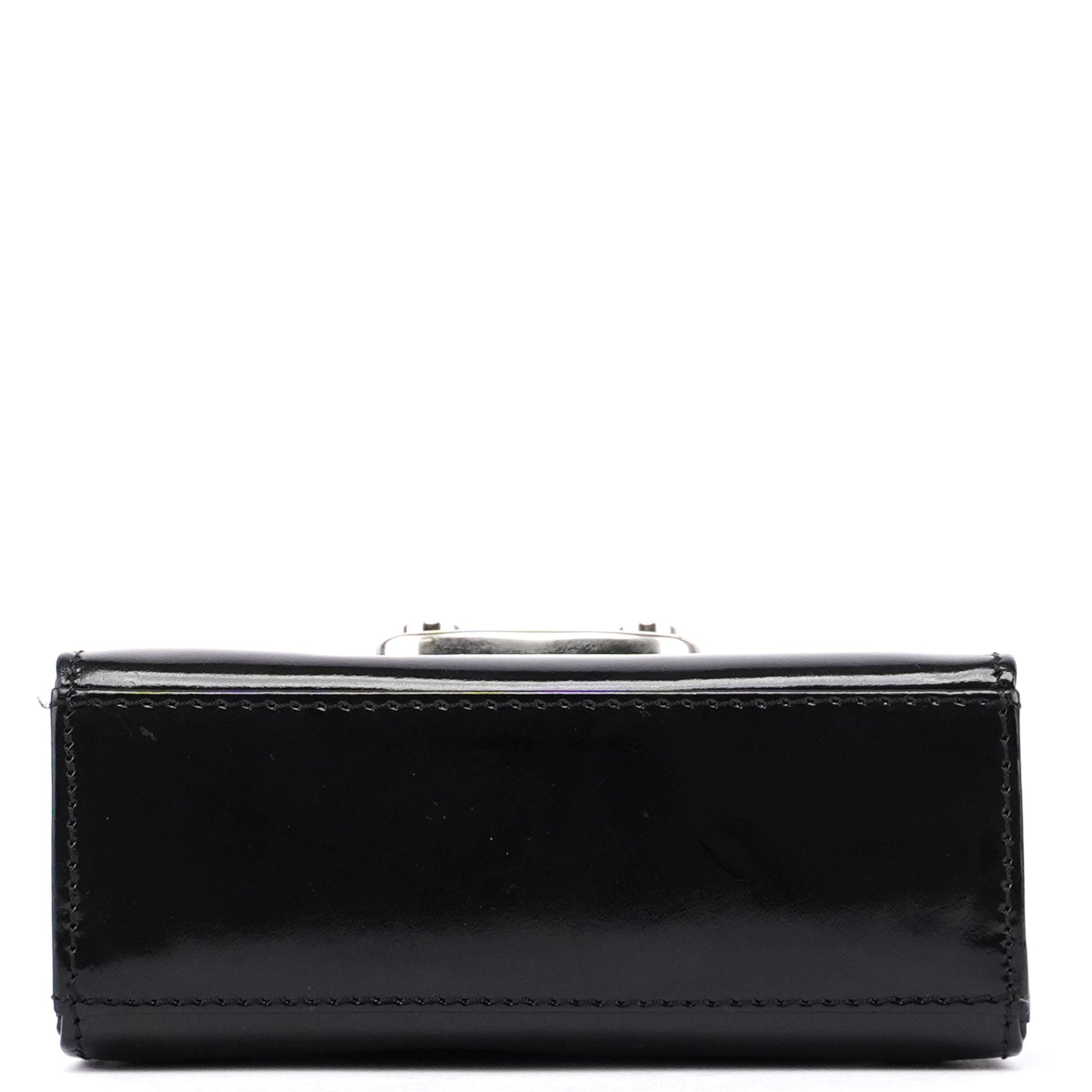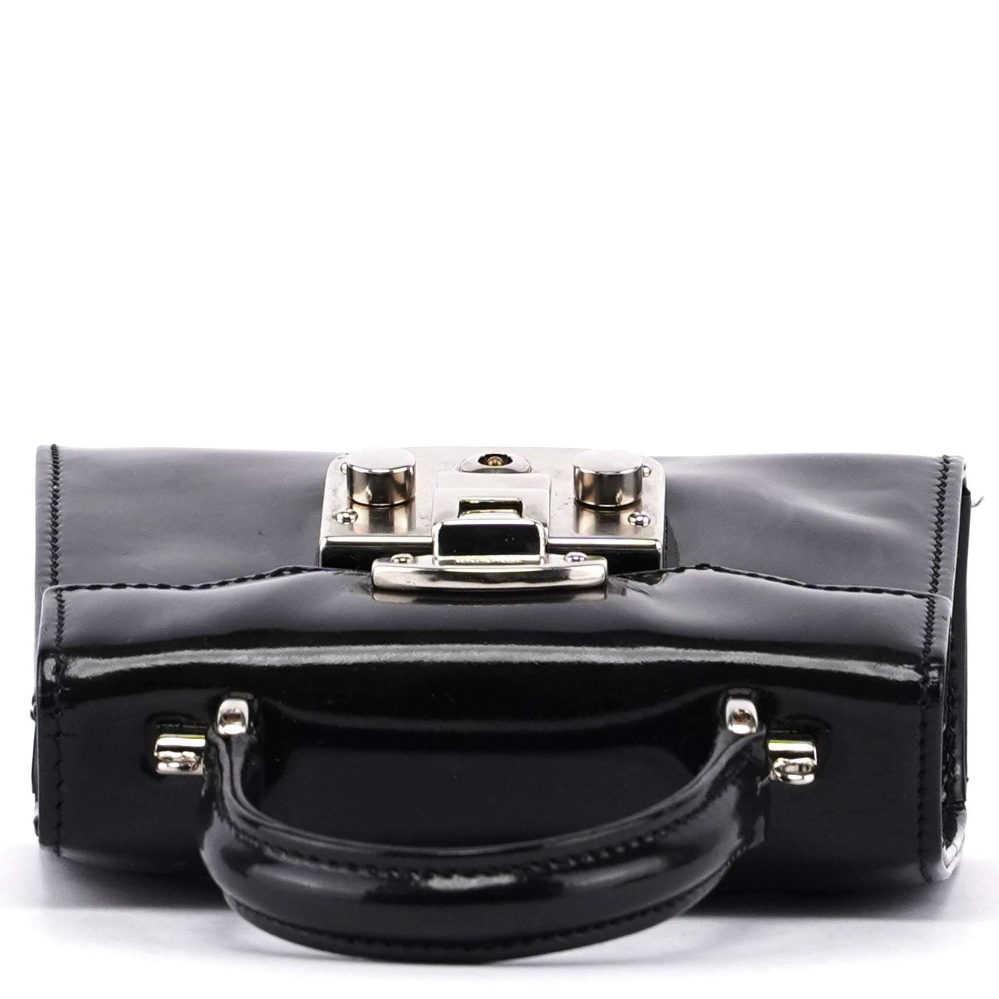 Introducing the Gucci Micro Ladylock handbag, handcrafted from black patent leather and designed by Tom Ford in the mid 1990s. Adorned with silver-tone hardware engraved with the Gucci logo, it features a lock and key closure for security. The bag offers versatility with a top handle and crossbody strap, while the interior is lined with calfskin leather for a luxurious finish.