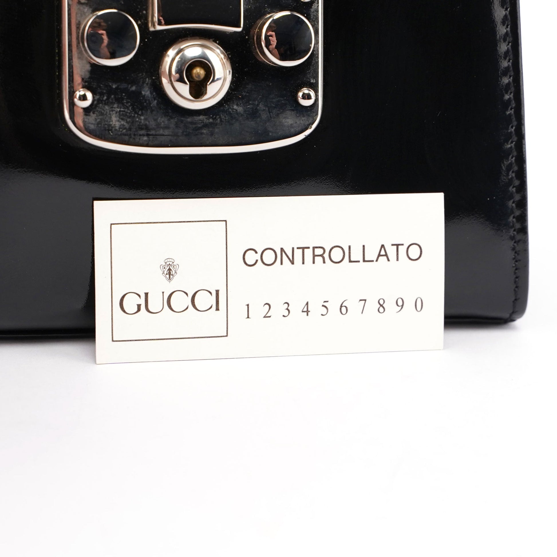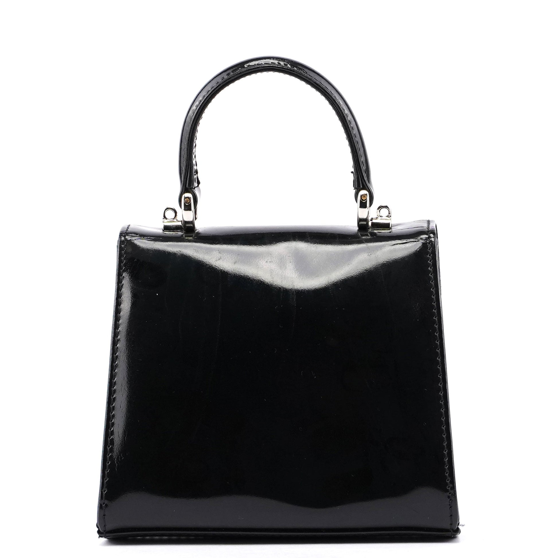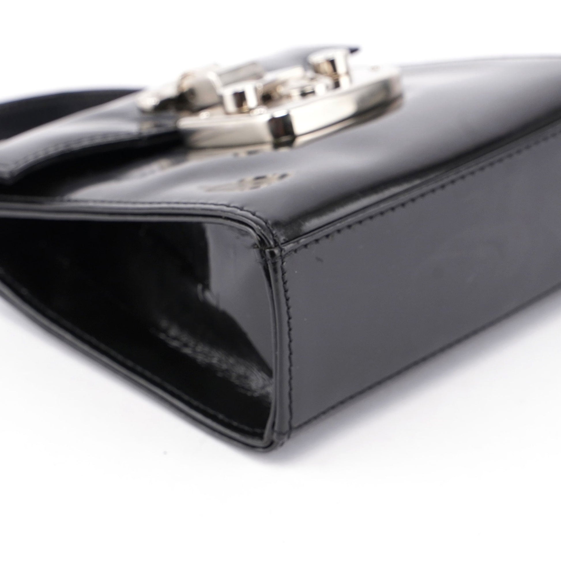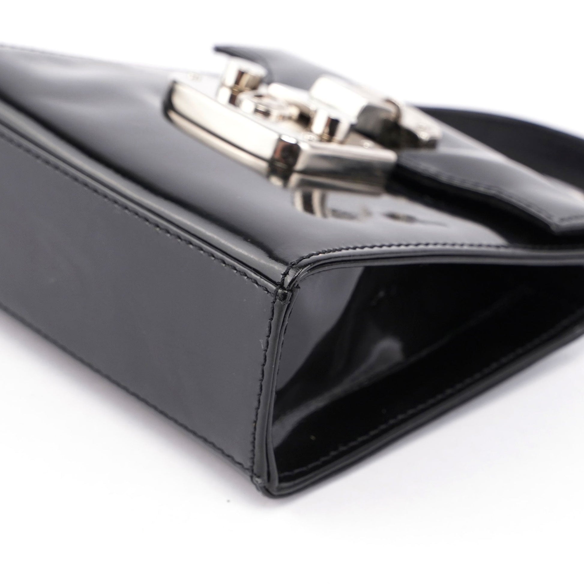 Introducing the Gucci Micro Ladylock handbag, handcrafted from black patent leather and designed by Tom Ford in the mid 1990s. Adorned with silver-tone hardware engraved with the Gucci logo, it features a lock and key closure for security. The bag offers versatility with a top handle and crossbody strap, while the interior is lined with calfskin leather for a luxurious finish.