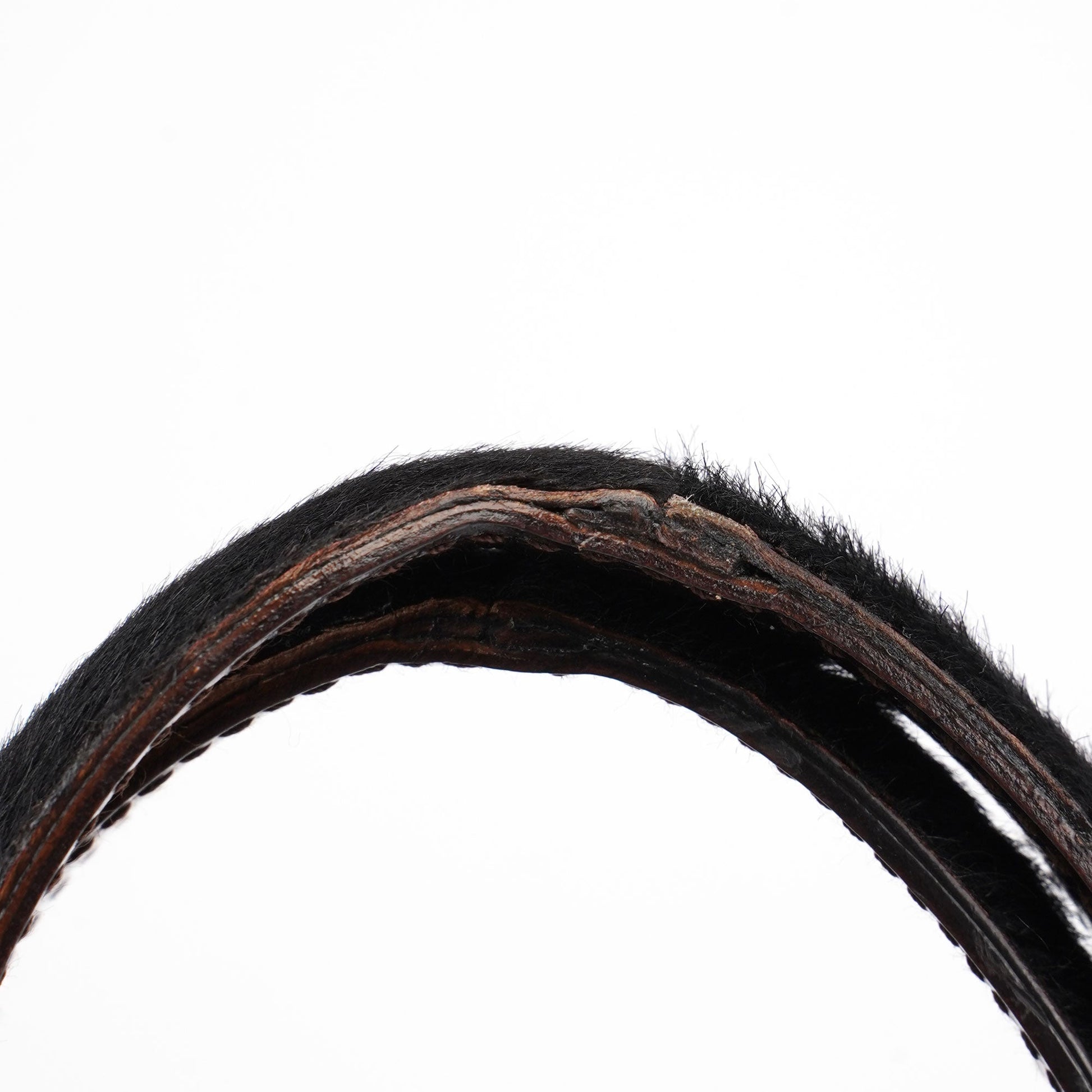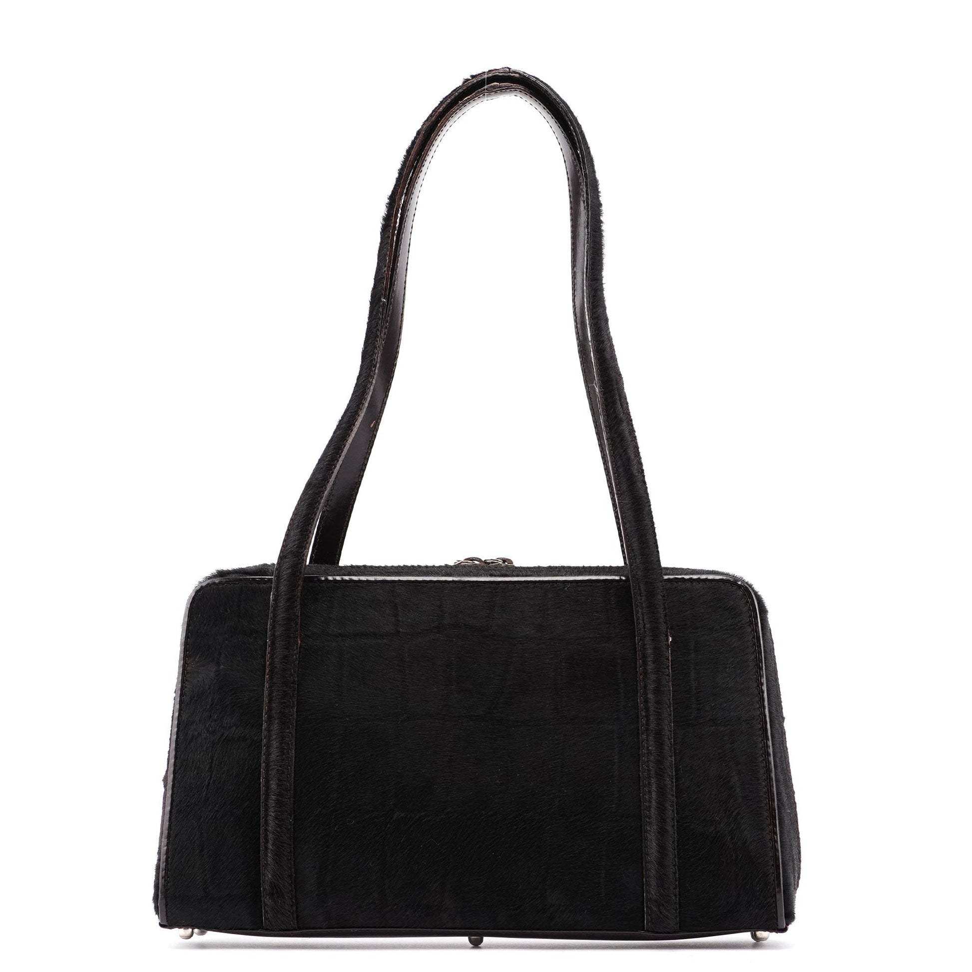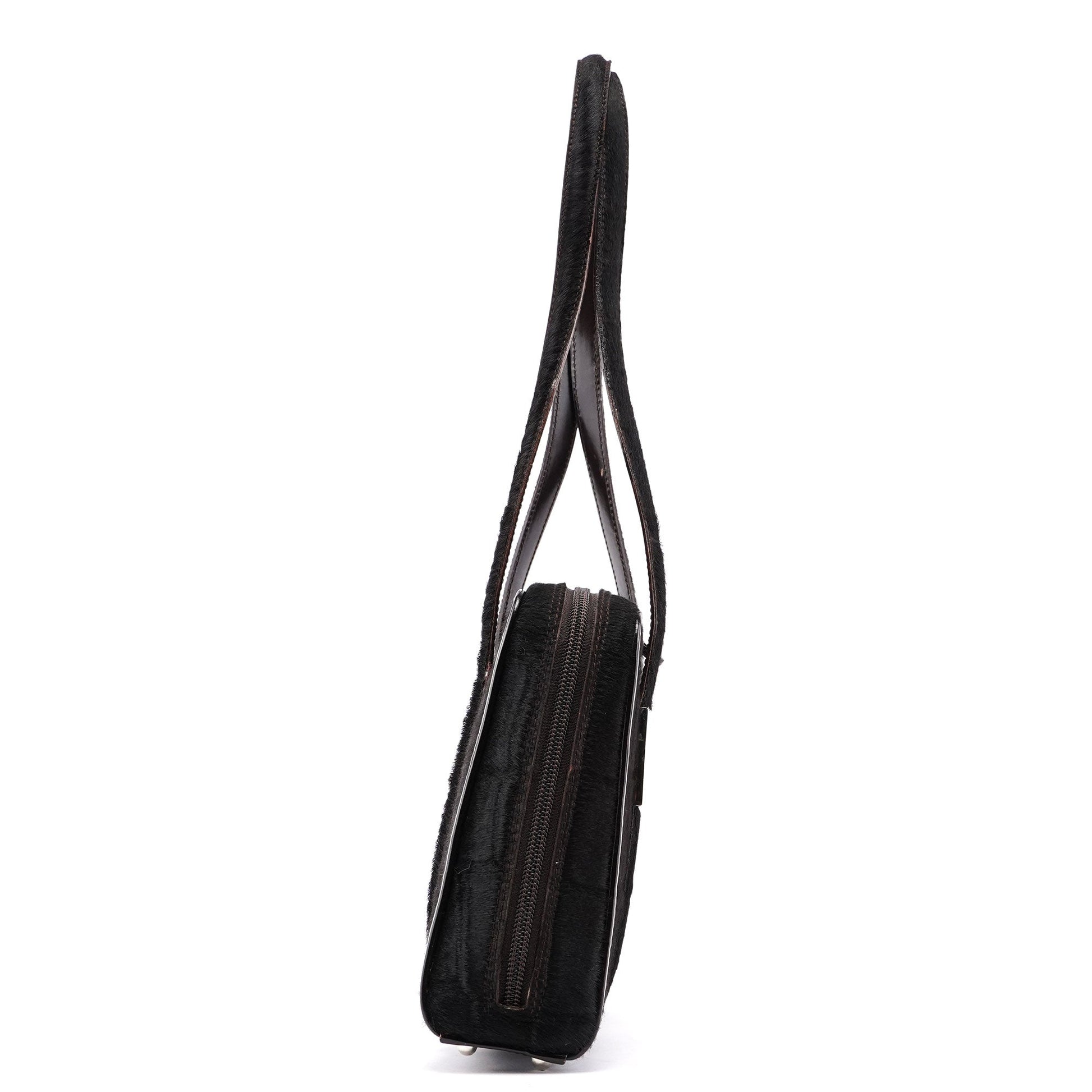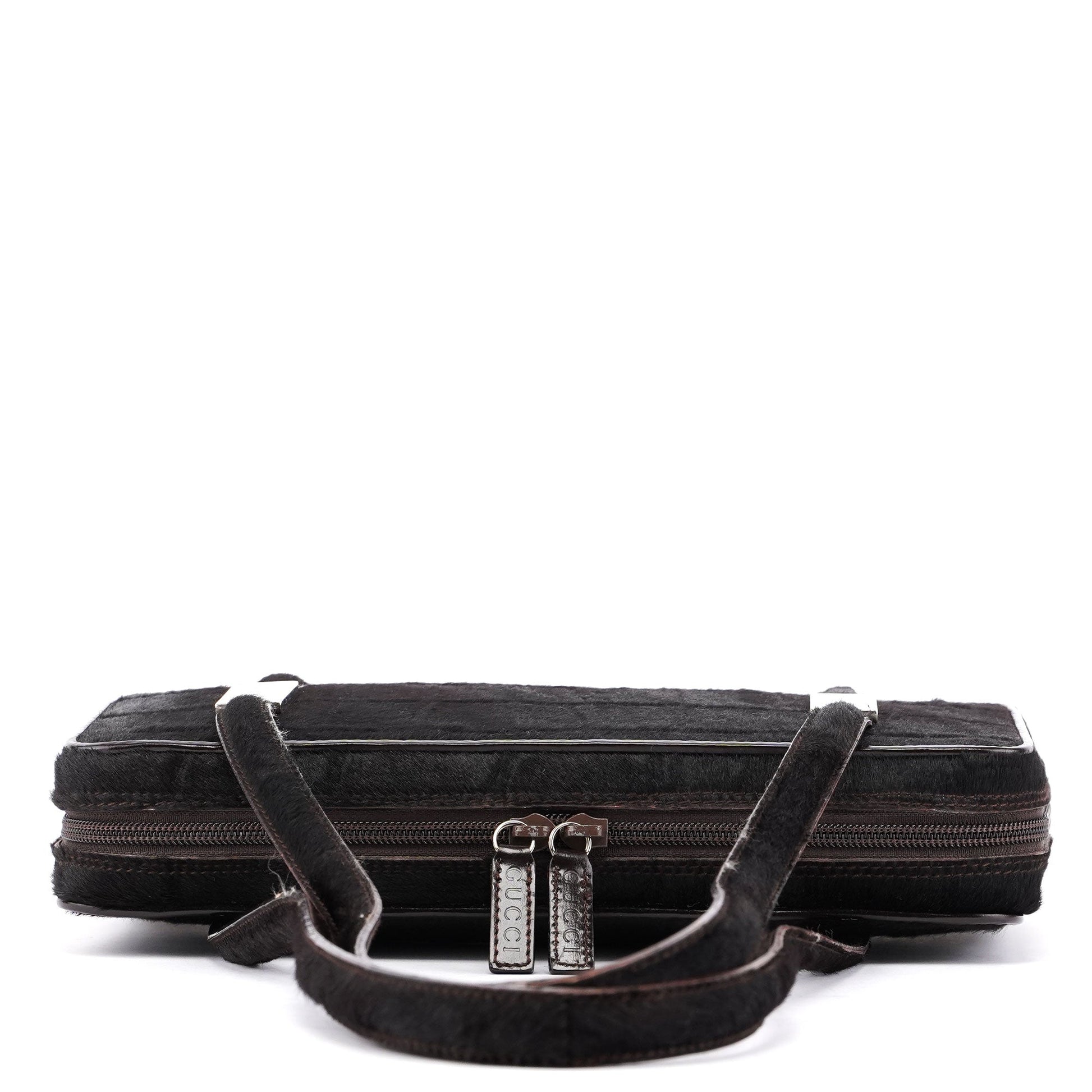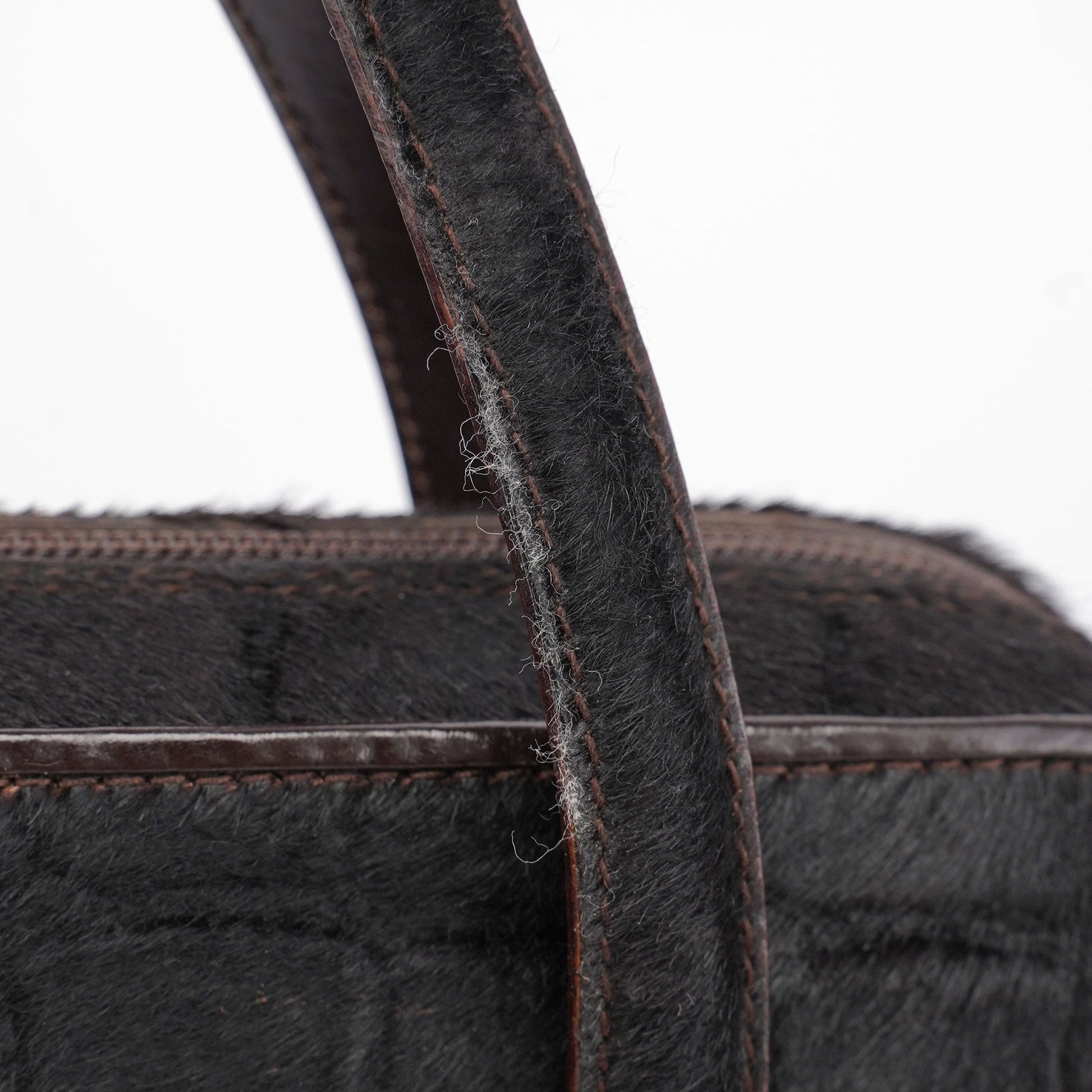 This Gucci bag, a unique creation by Tom Ford from the late 1990s, is handcrafted from dark brown pony fur with brown leather trim and silver-tone hardware engraved with the Gucci logo. It features a zipper closure, and the interior is lined in leather with an additional pocket for organized storage.