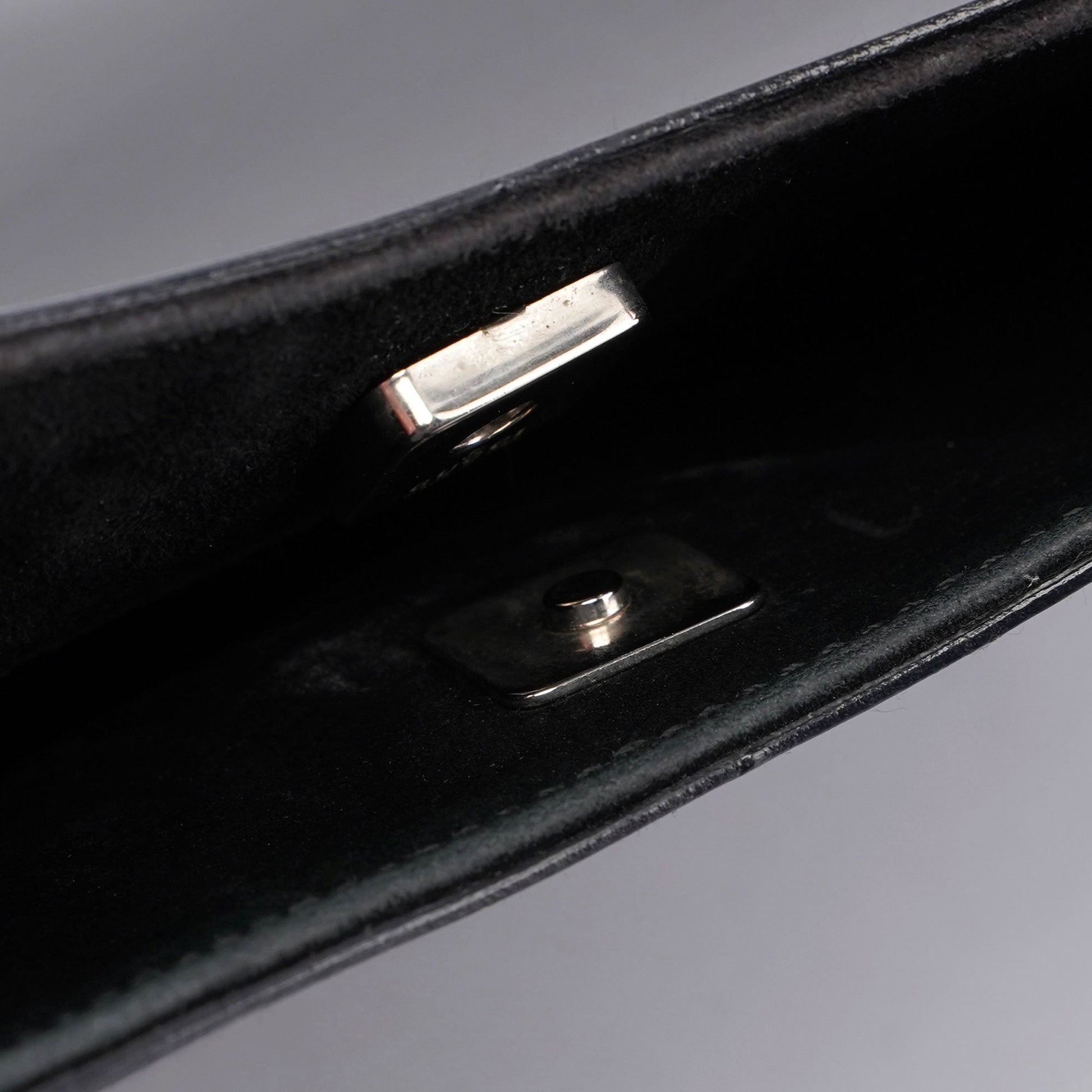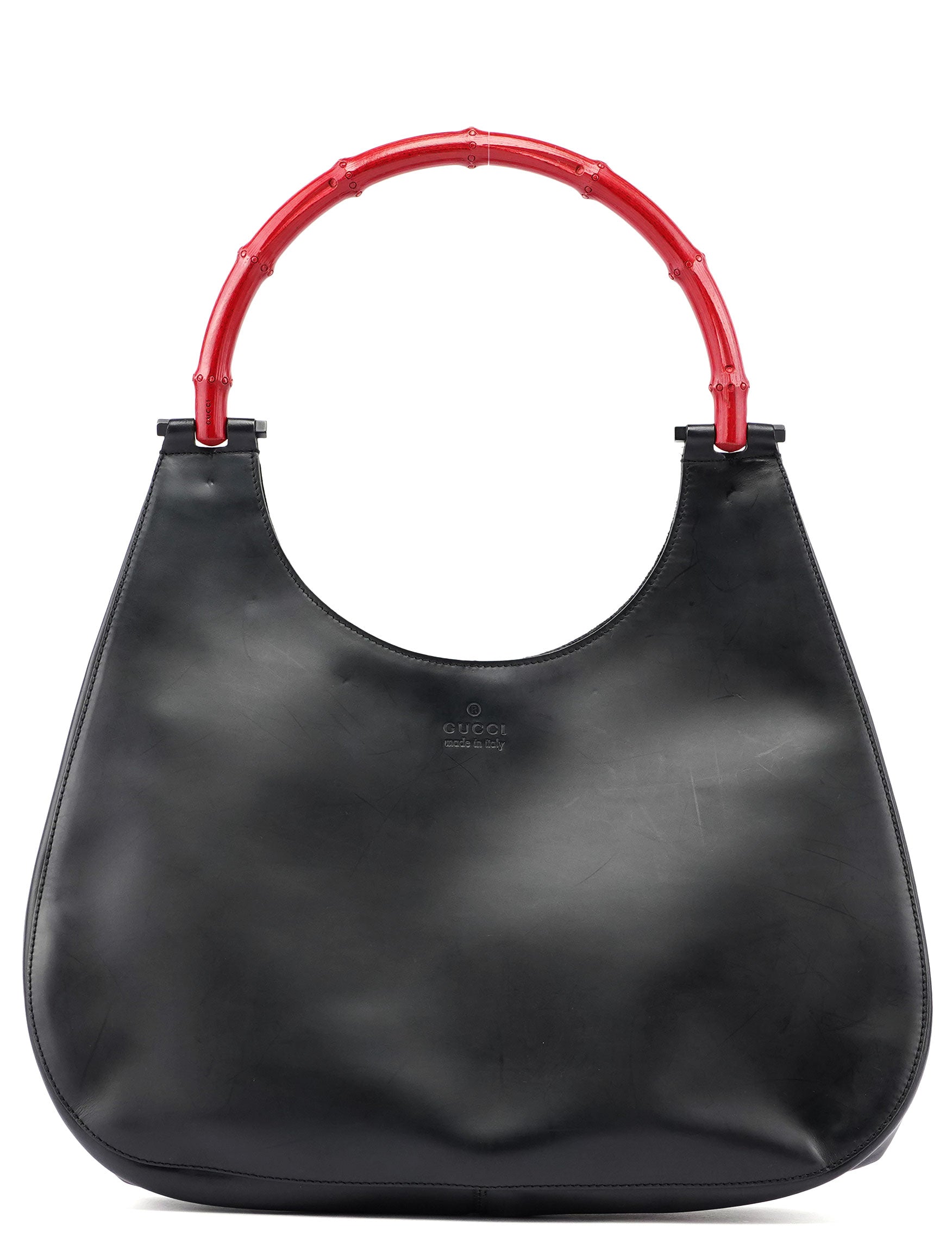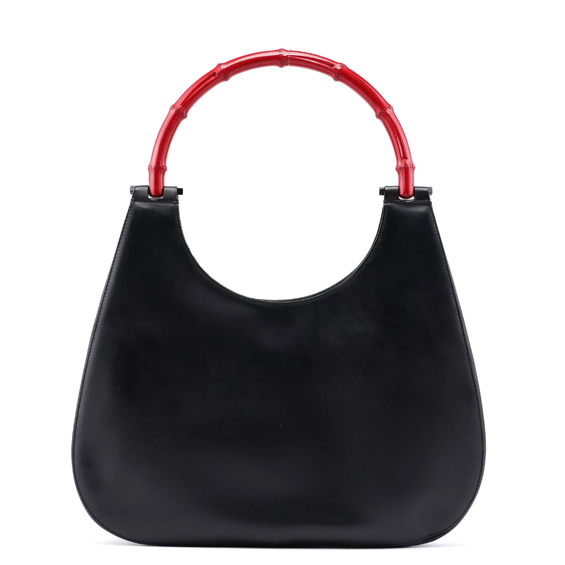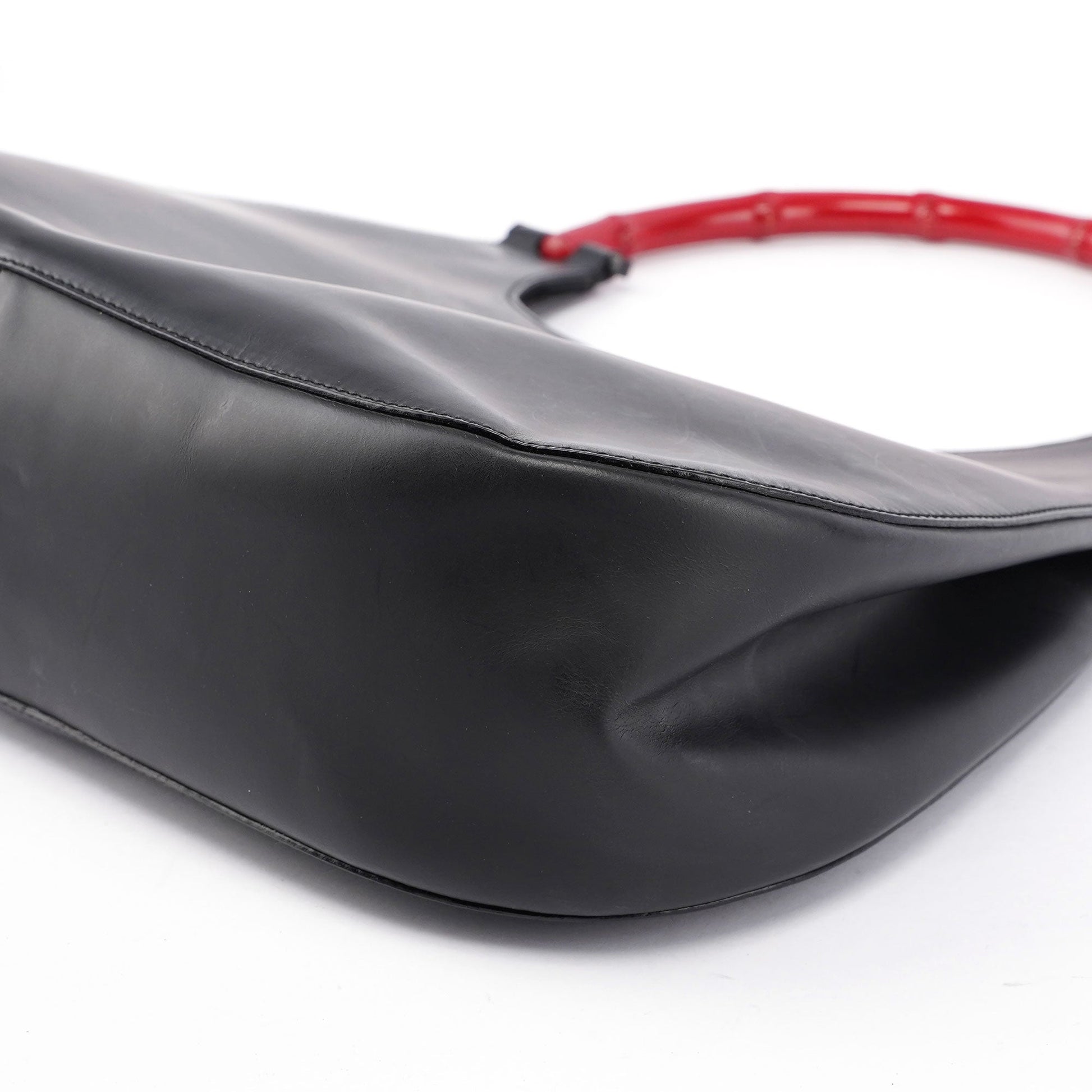 This Gucci Bamboo shoulder bag, is a timeless classic designed in the late 1990s by Tom Ford. The iconic bamboo red handle adds a touch of sophistication to the bag, while the black matte leather create a stunning visual contrast. The bag's spacious magnetic-closed compartment is lined with suede and includes an interior zipper pocket. Gucci logo is embossed at the front, adding a touch of sophistication.