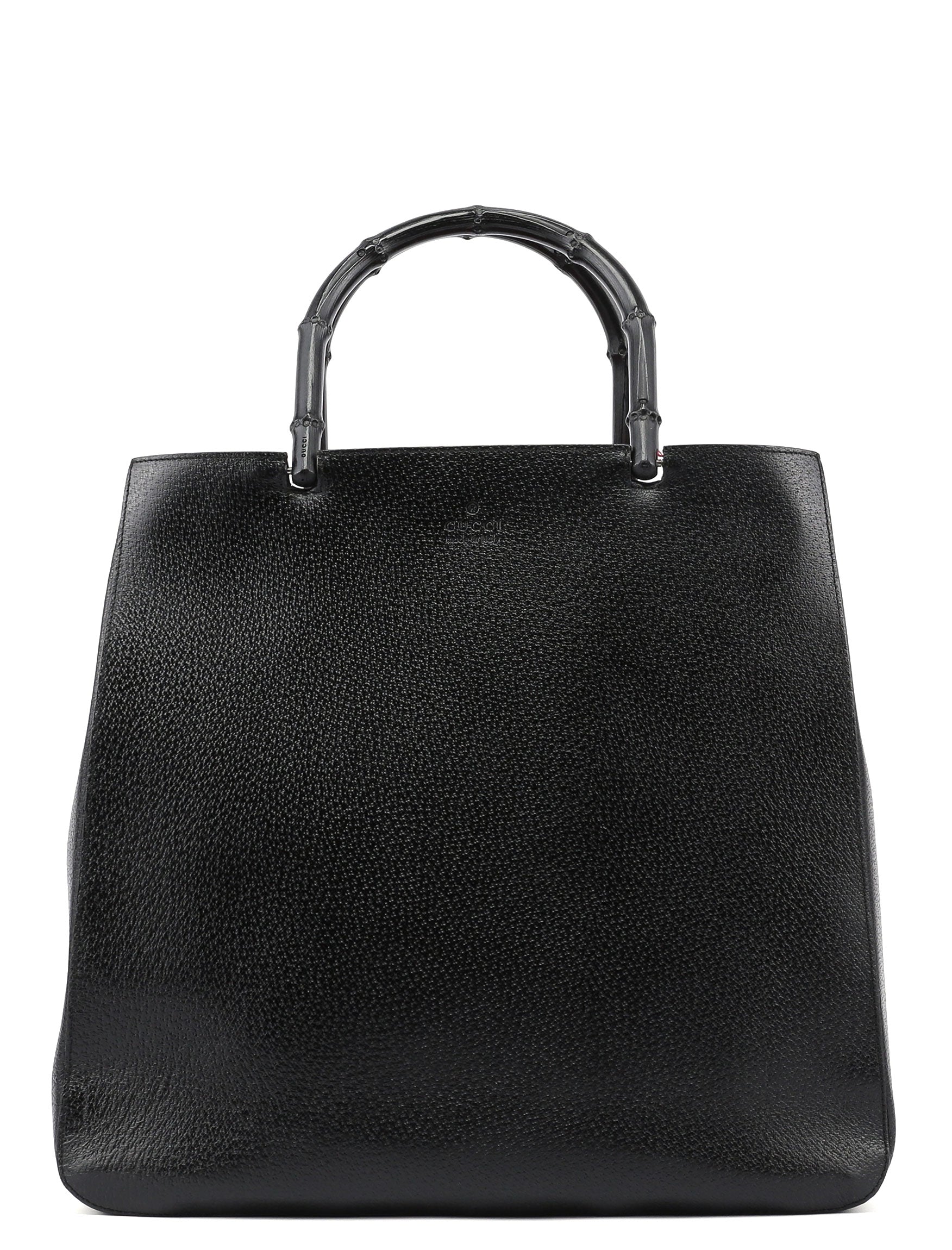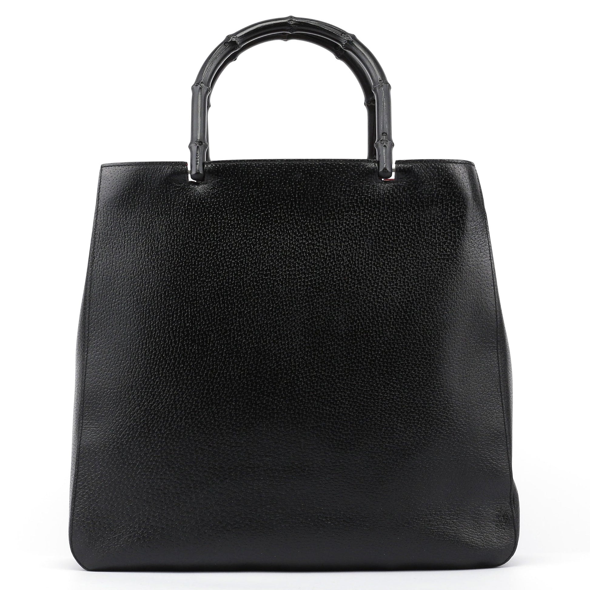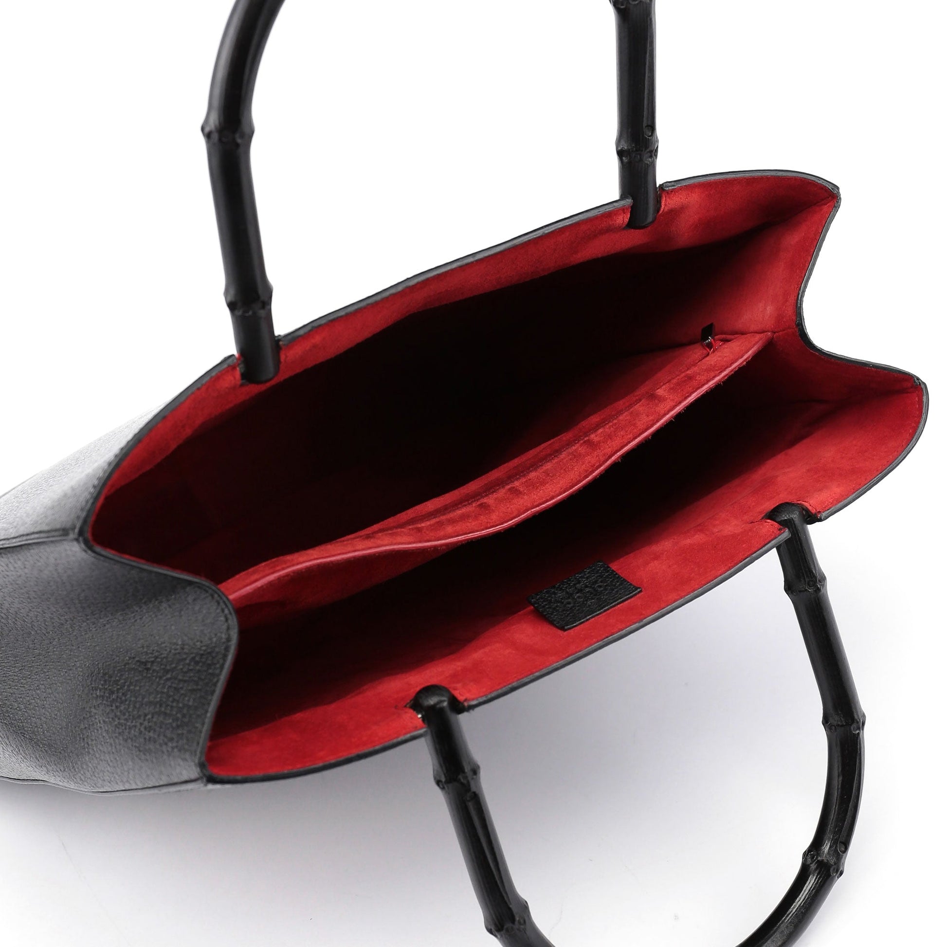 Designed by Tom Ford in the late '90s, this large Gucci Bamboo tote bag handcrafted in black leather features two bamboo handles and two interior compartments. The interior, lined with red suede and including a zipper pocket, adds a bold contrast. The Gucci logo embossed at the front highlights its distinguished design.