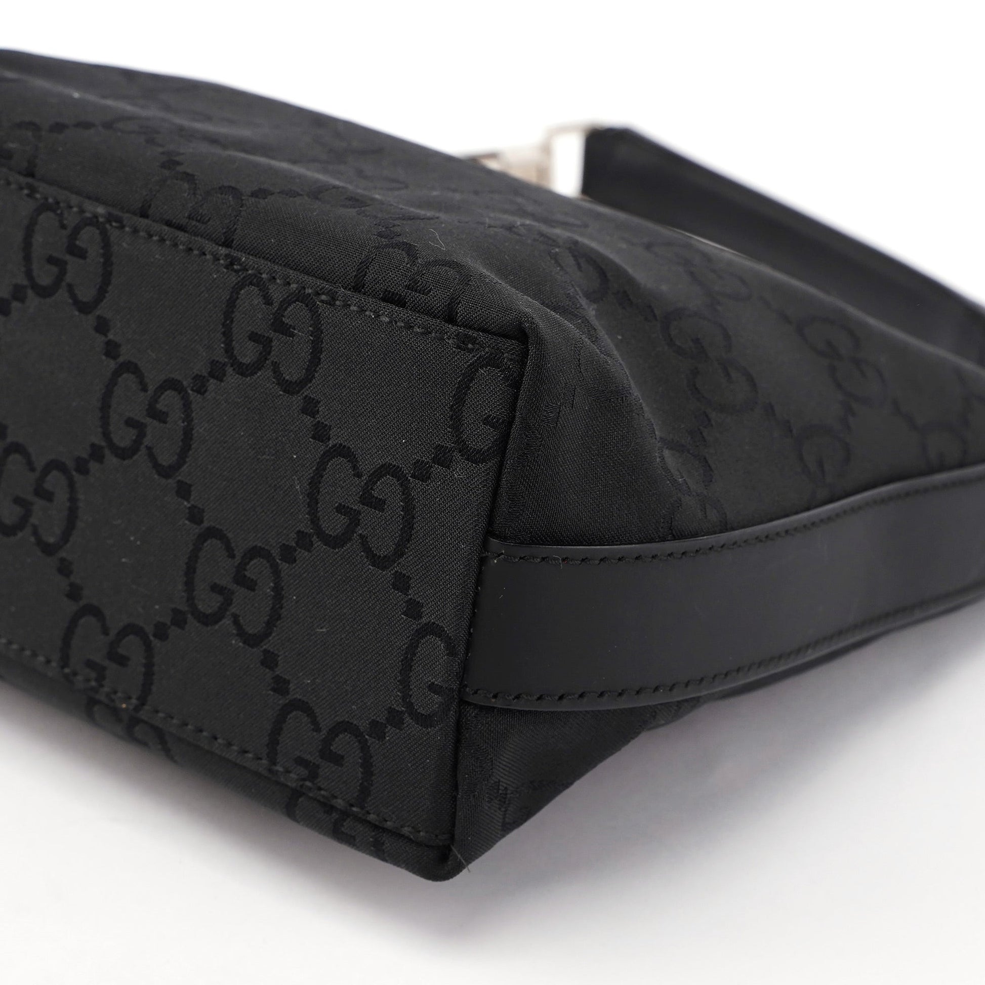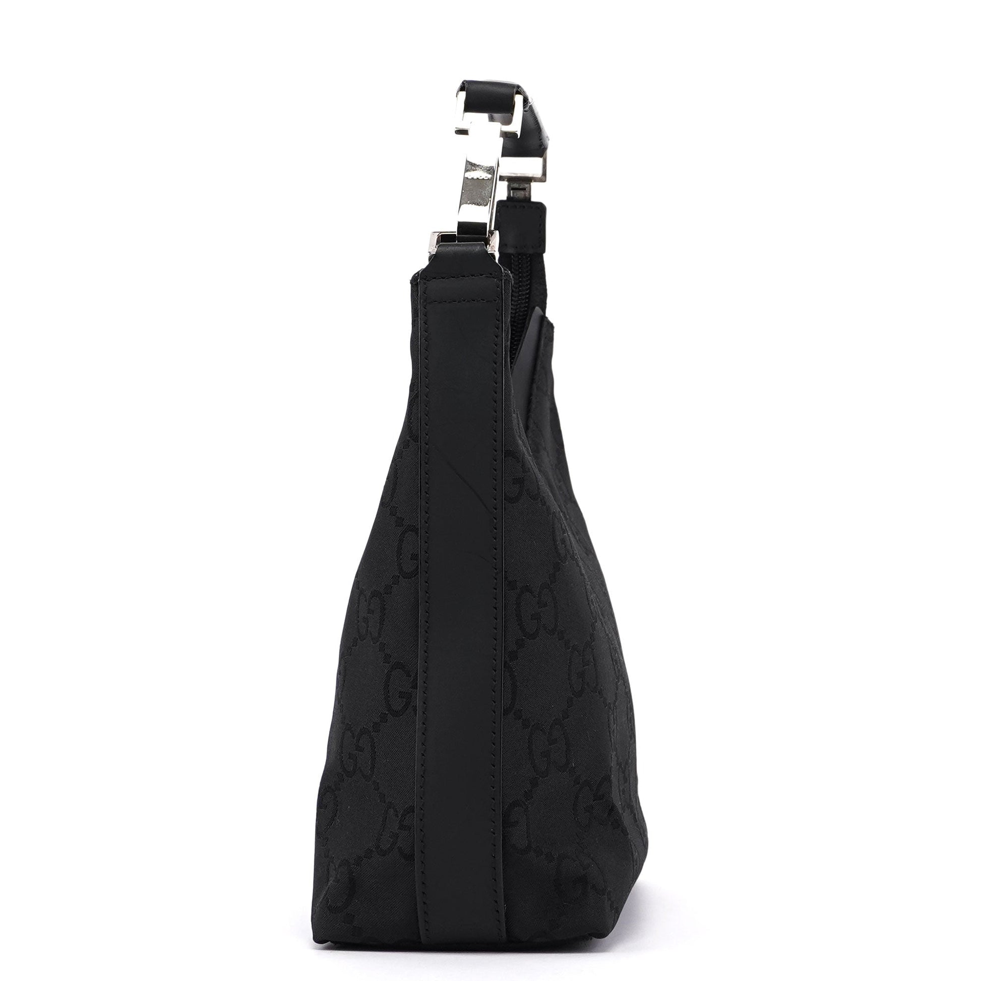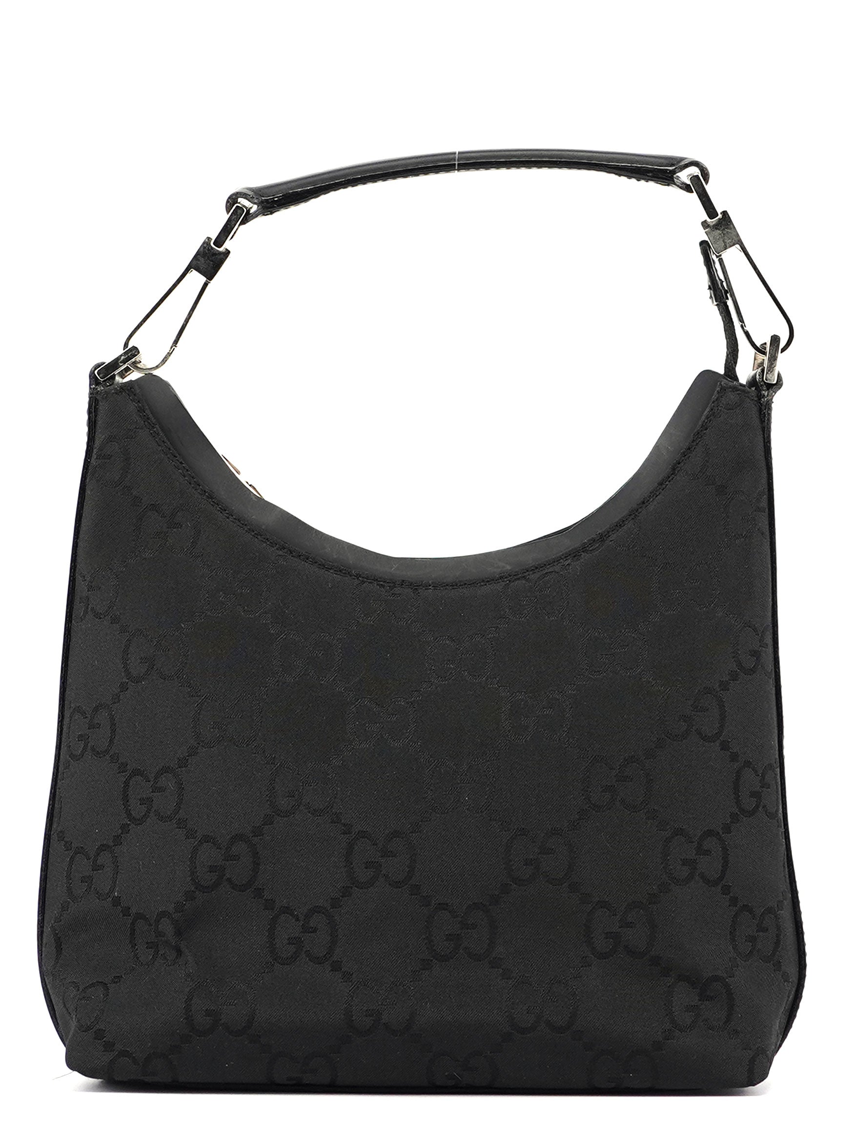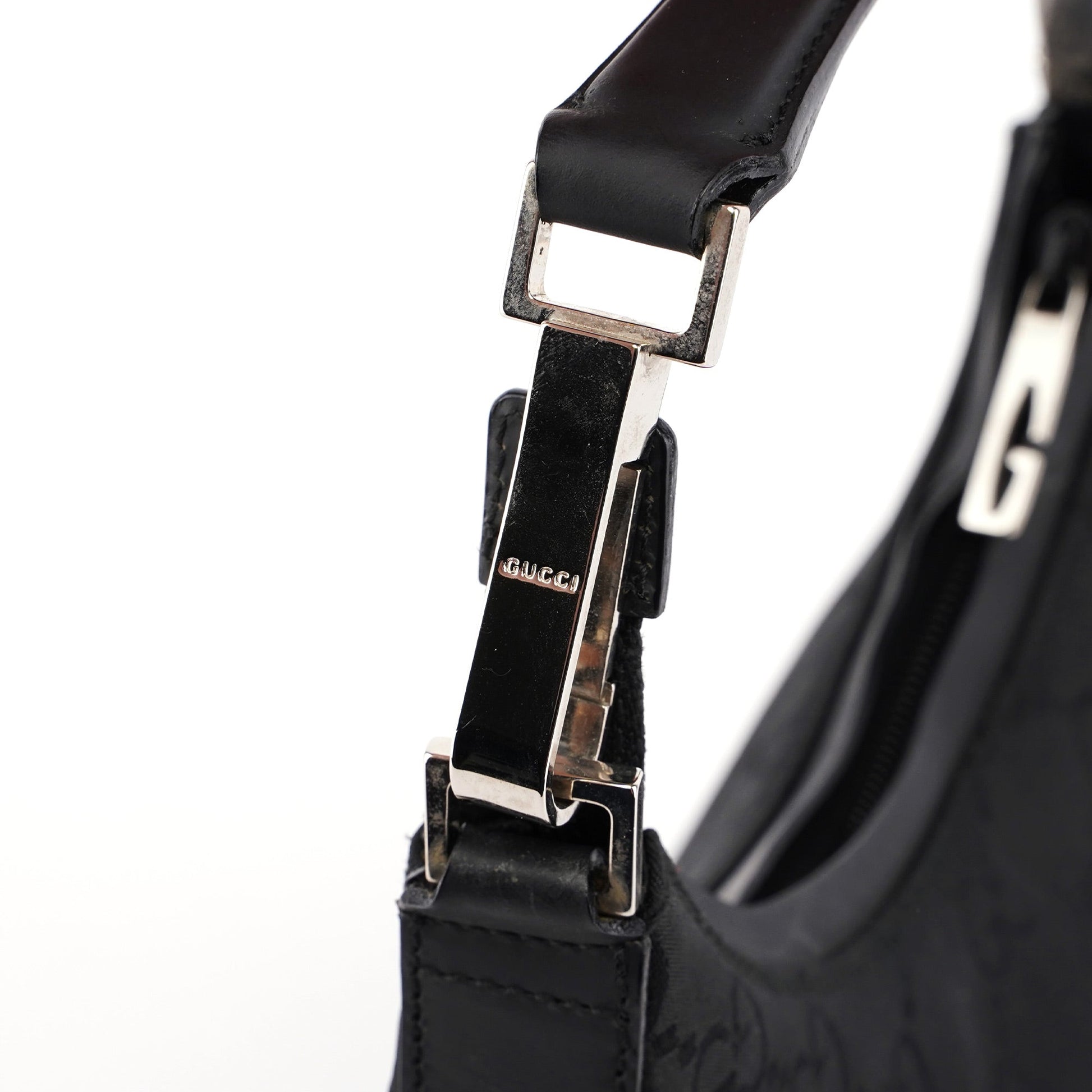 Unveil the elegance of the Gucci GG canvas shoulder bag, designed by Tom Ford in the late 1990s. This piece features silver-tone hardware with engraved Gucci logo, complemented by black calfskin leather trim. A zipper closure secures the satin-lined interior and its pocket.