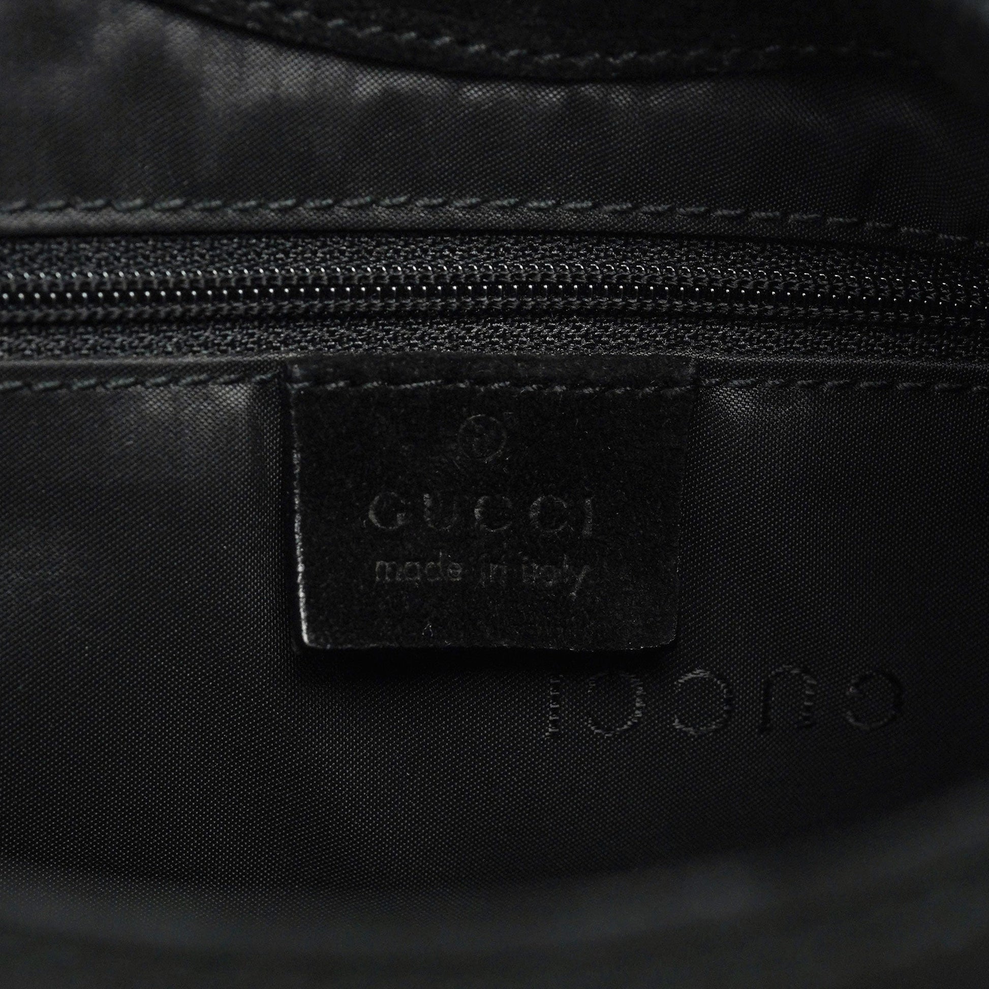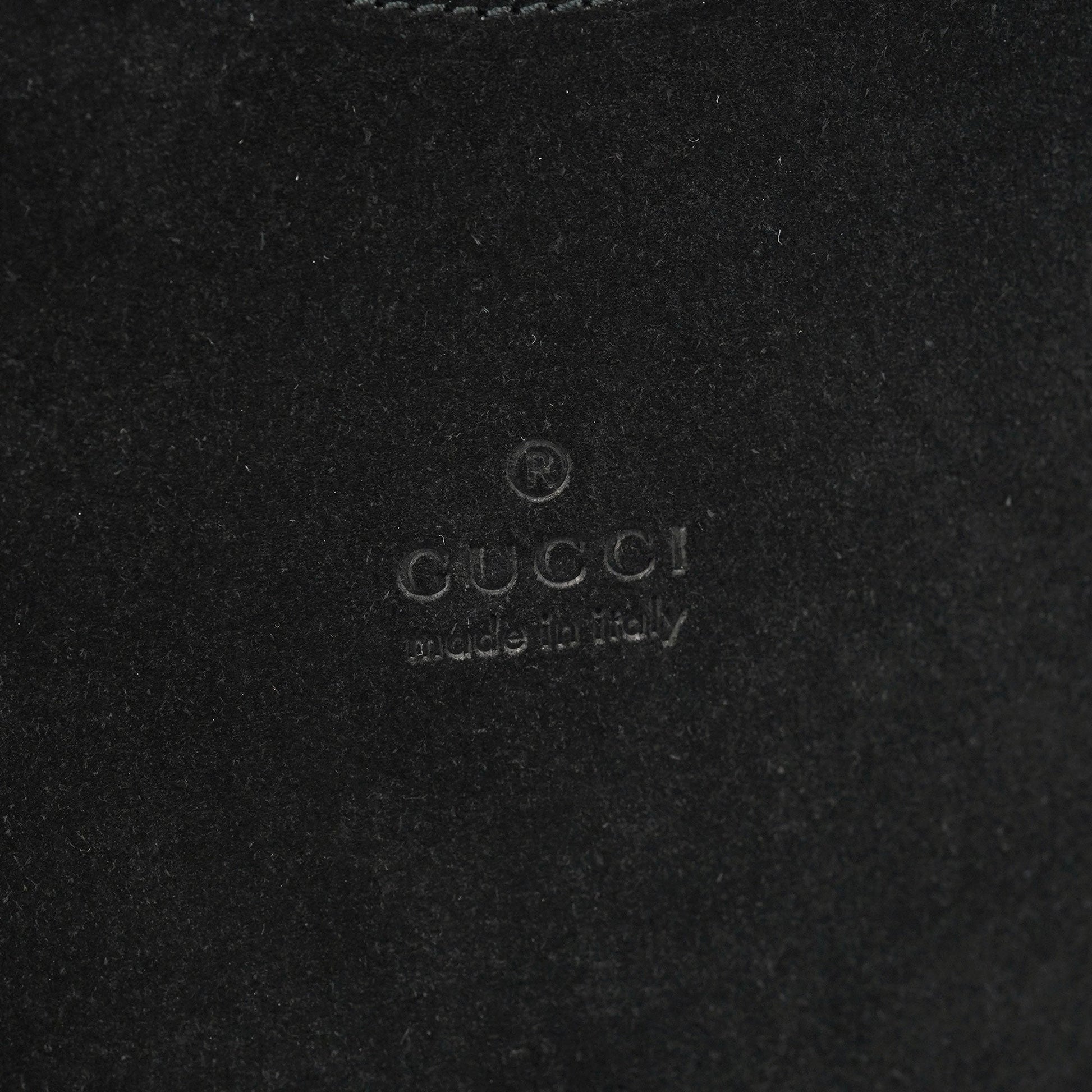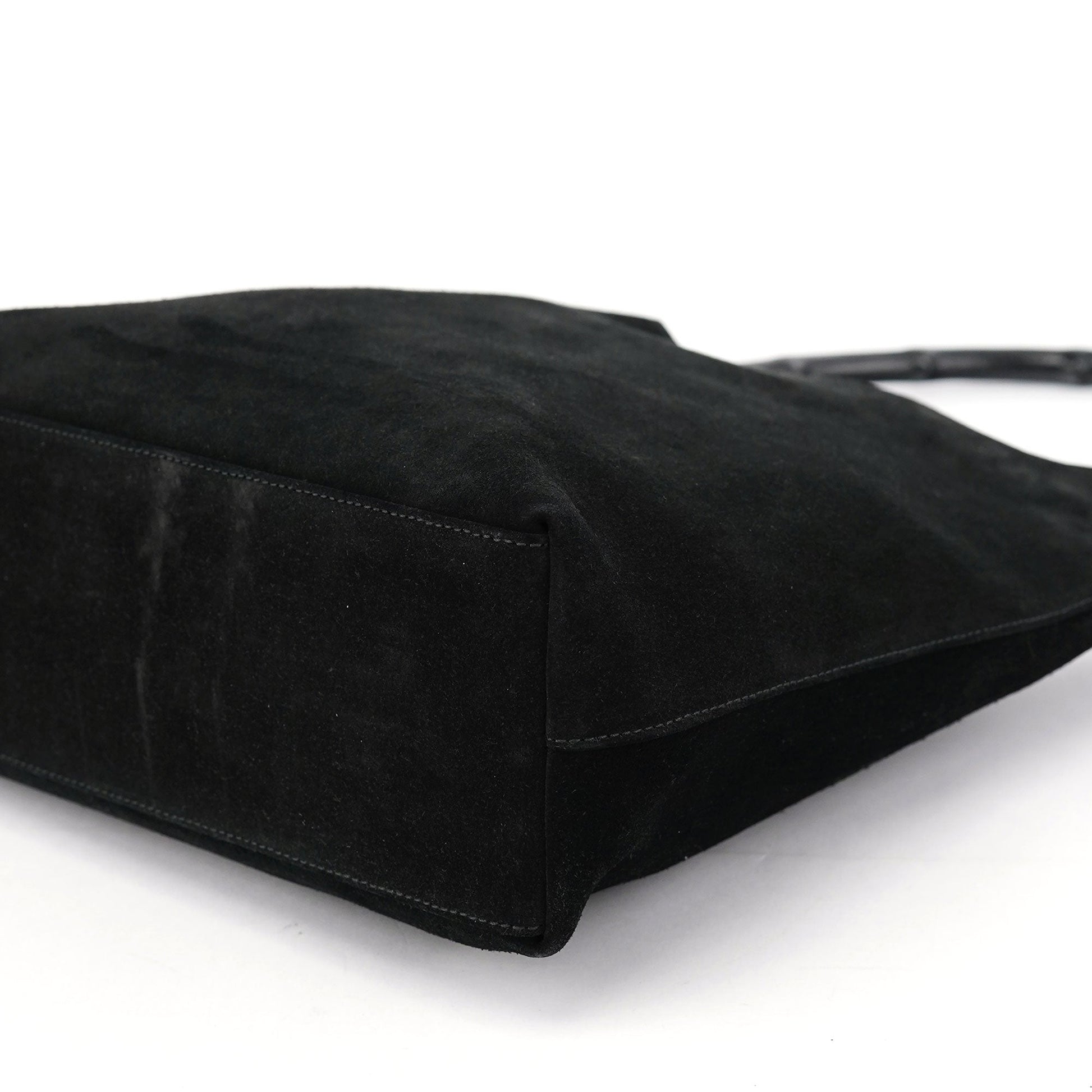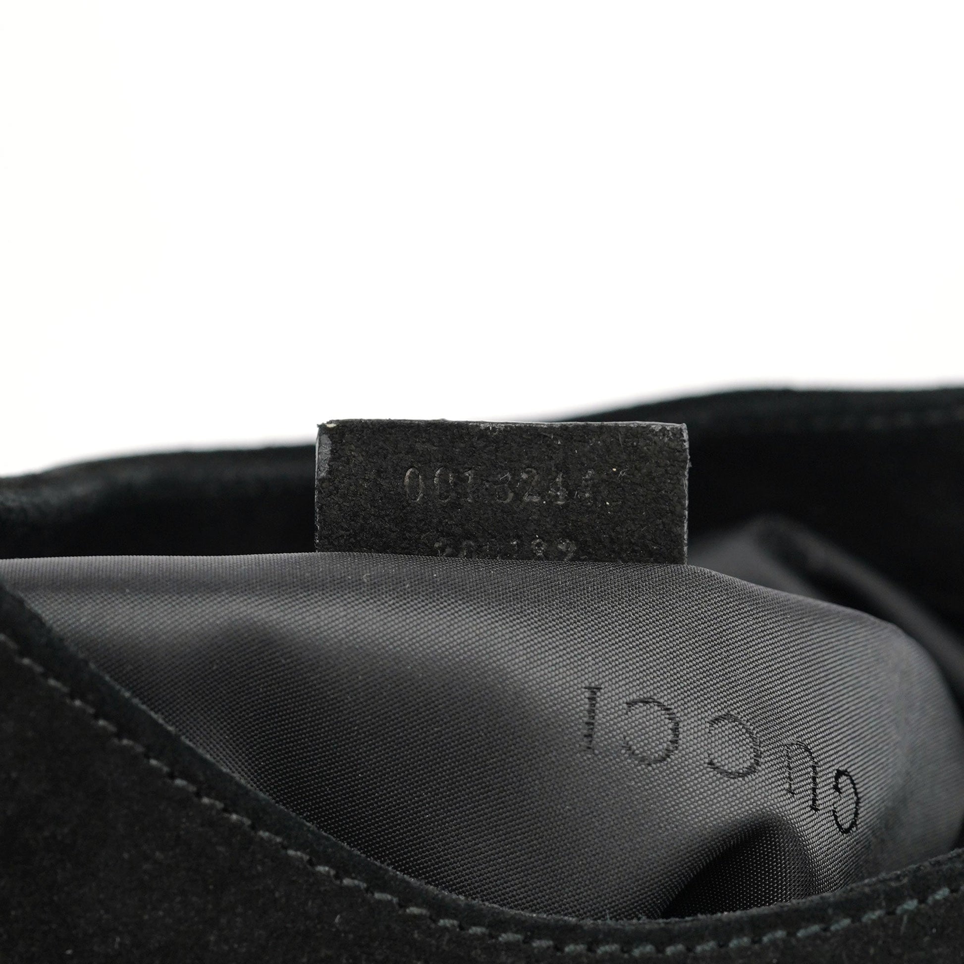 Designed by Tom Ford in the late 1990s, this Gucci Bamboo Hobo is handcrafted from black suede with a signature bamboo handle and silver-tone hardware. The front is subtly embossed with the Gucci logo, and the satin-lined interior includes a zipper pocket for practical elegance.