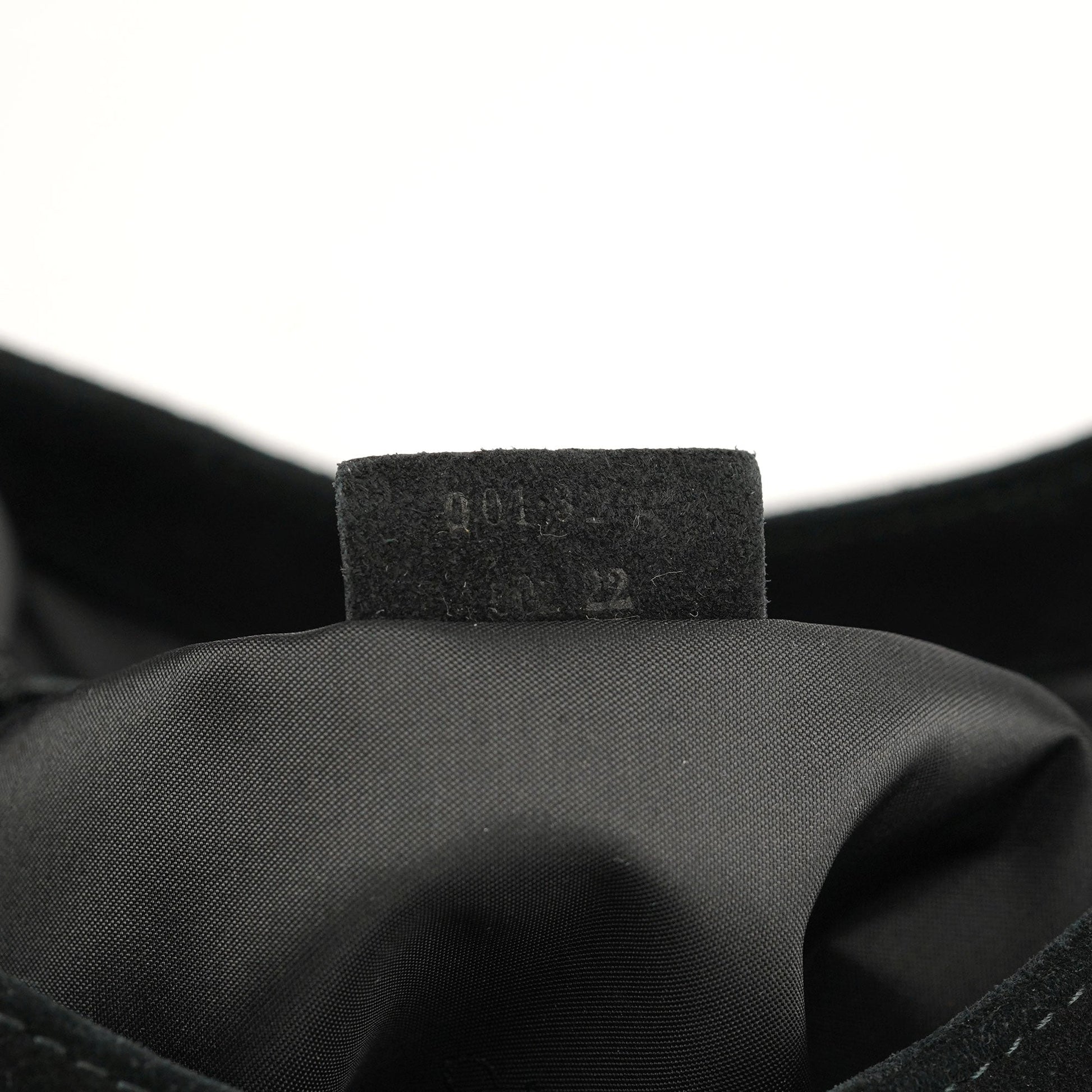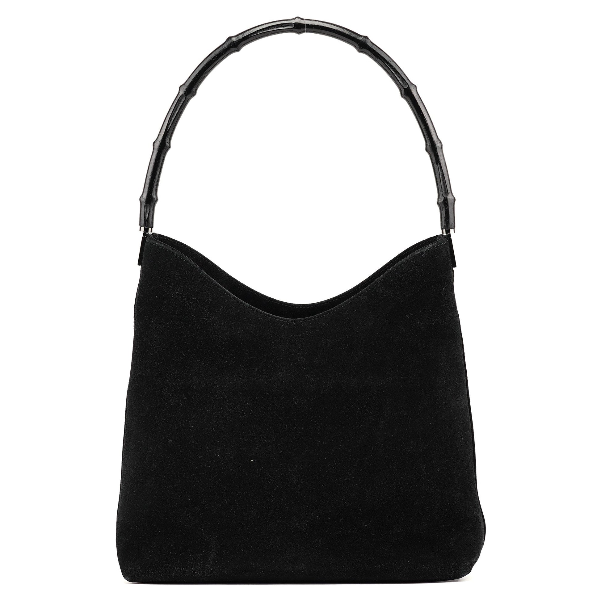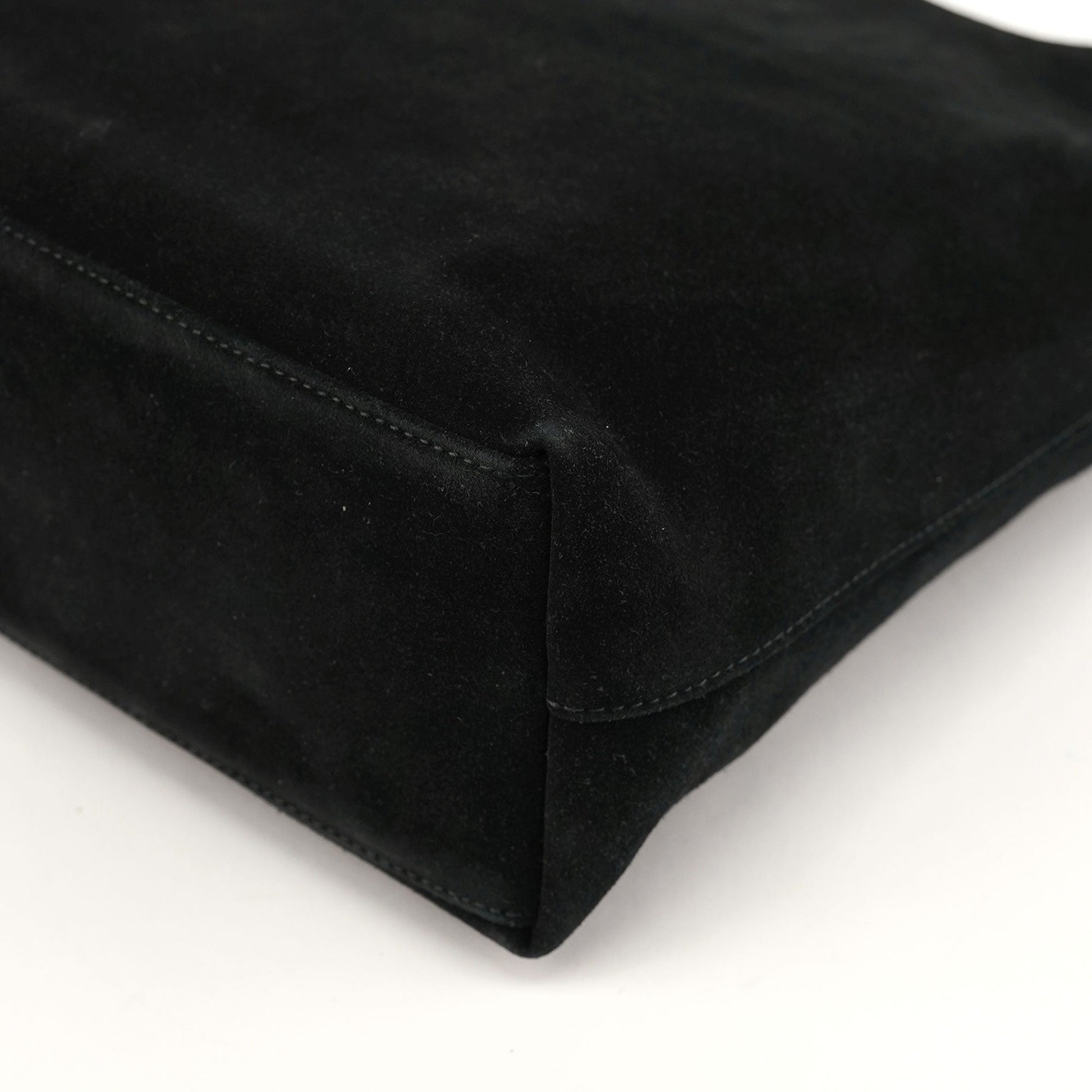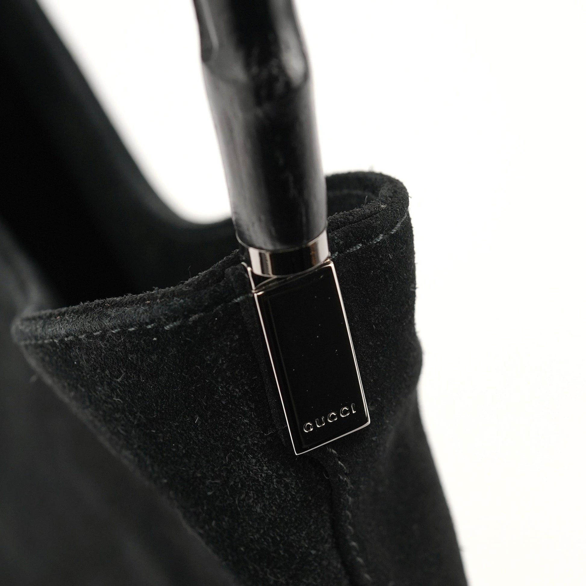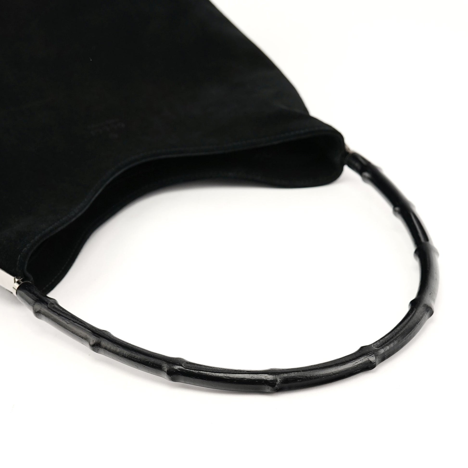 Handcrafted from luxurious black suede, this Gucci Bamboo Hobo bag by Tom Ford from the late 1990s features a bamboo handle, silver-tone hardware, and a satin-lined interior with a zipper pocket. The Gucci logo is embossed at the front, highlighting its timeless elegance.