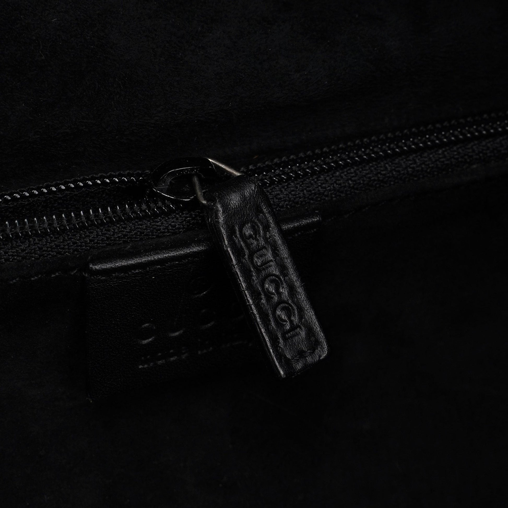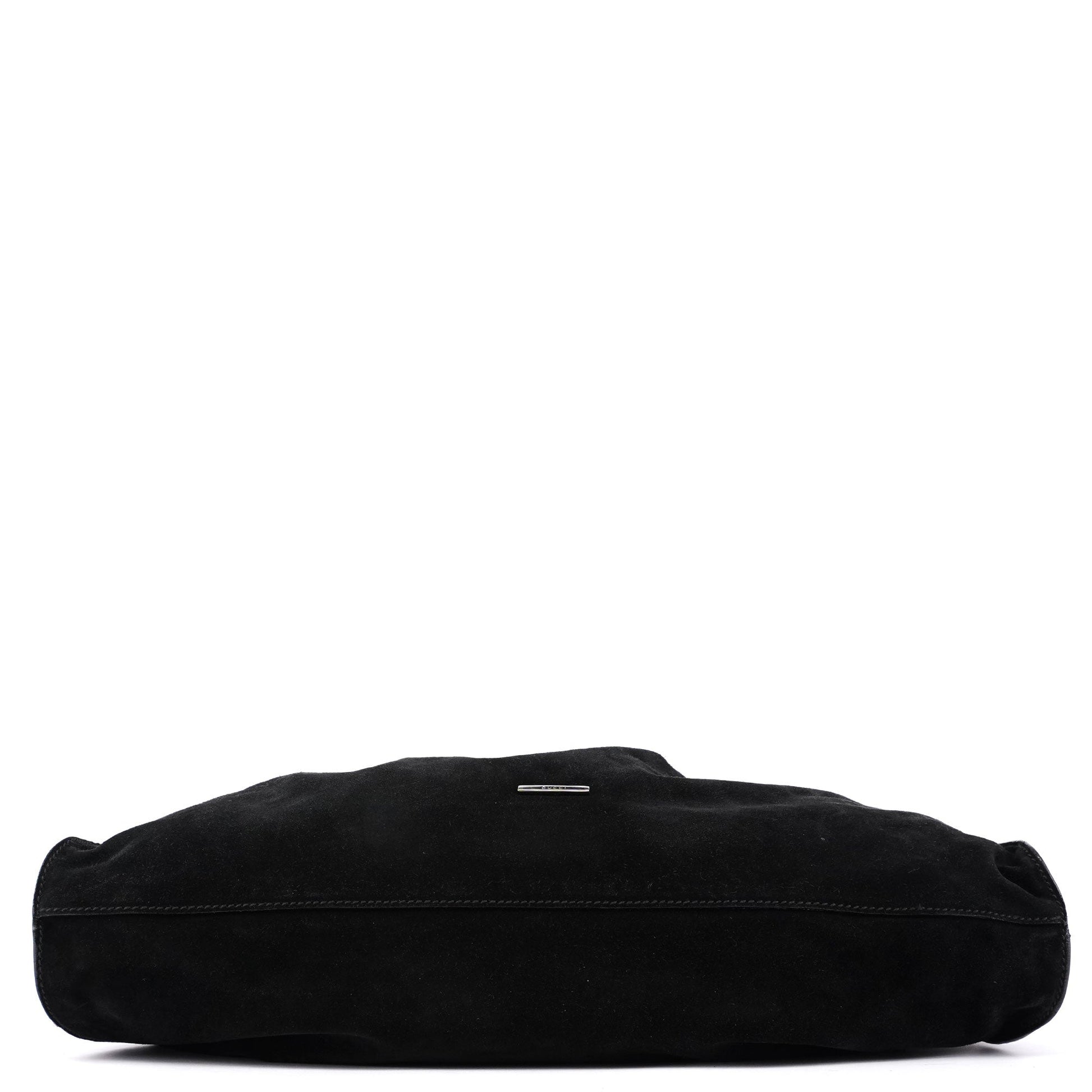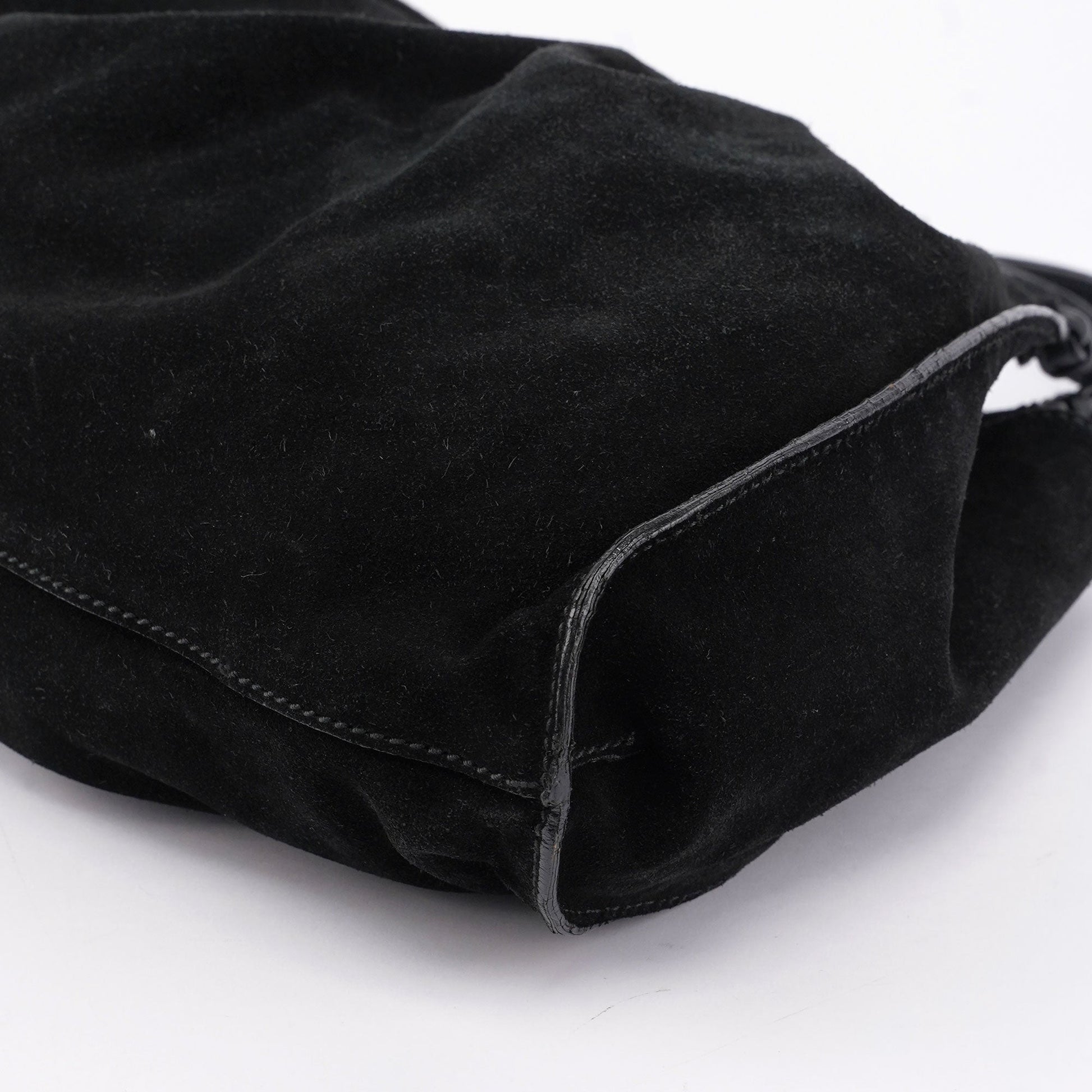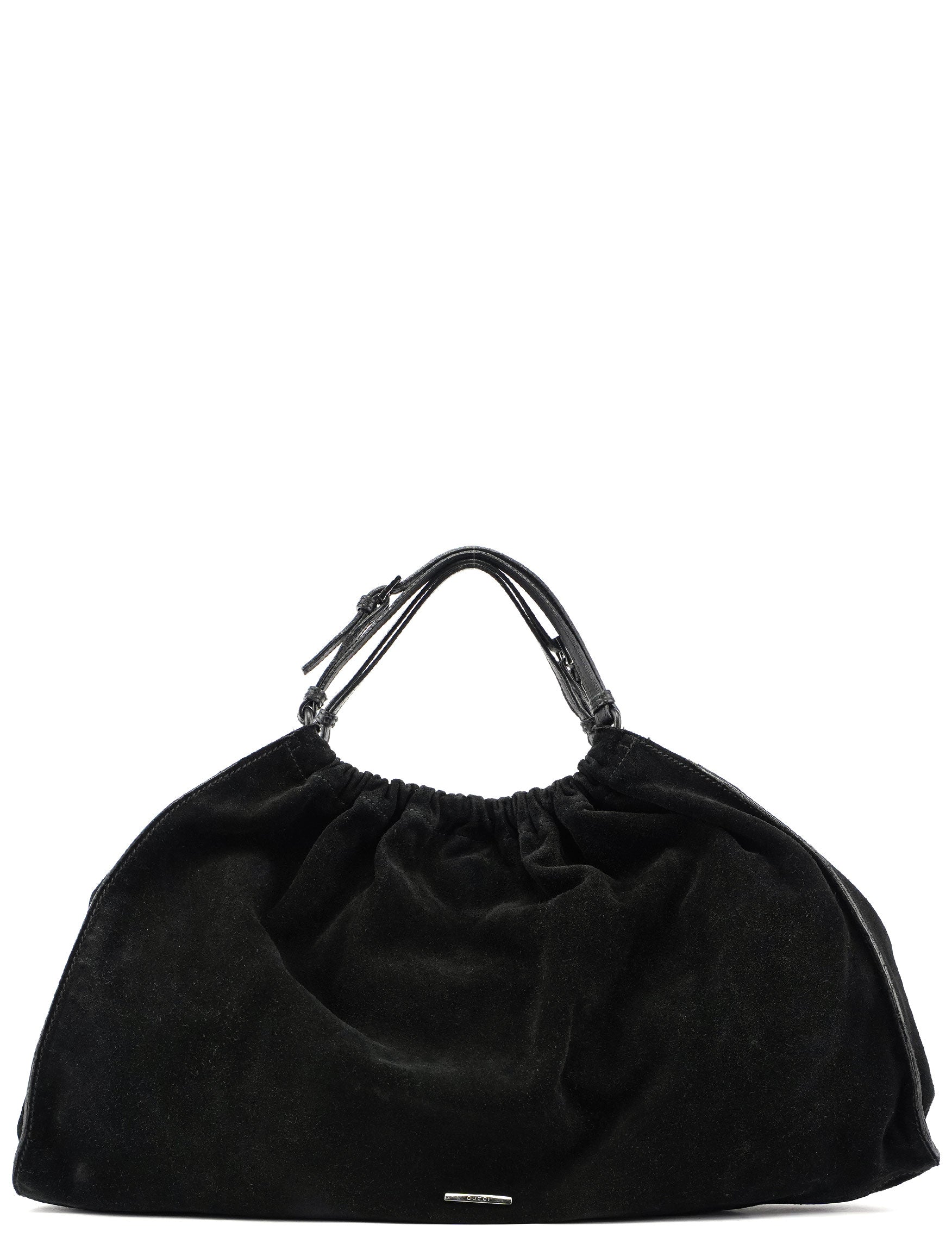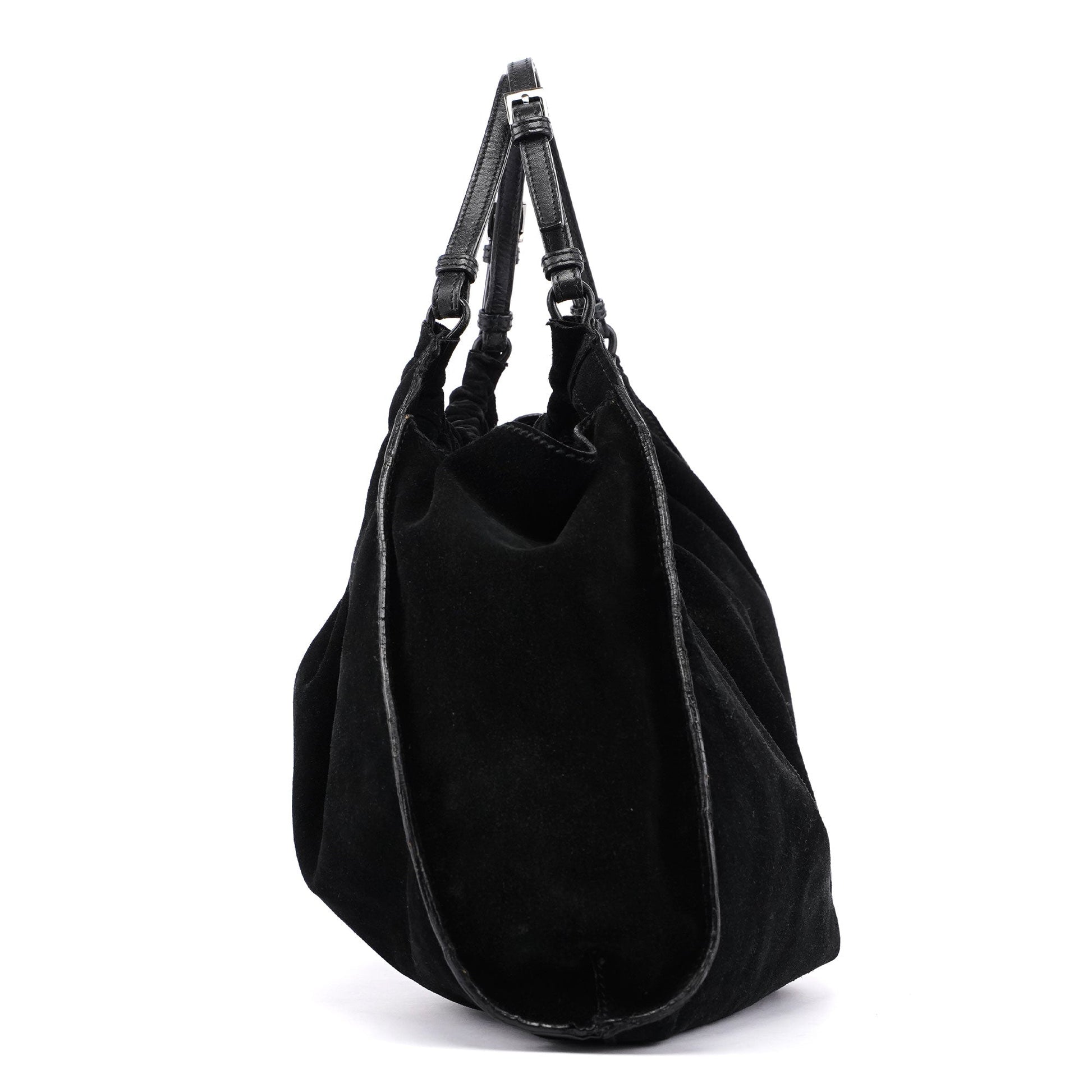 This Gucci Scamosciato handbag, designed by Tom Ford in the late 1990's, combines black suede with functional design, featuring silver-tone hardware and dual belt-style handles. Accented with same-tone leather trim for a cohesive look, it includes an interior pocket for essentials. A magnetic closure ensures security, while a silver-tone logo at the bottom front adds a subtle touch of brand identity.