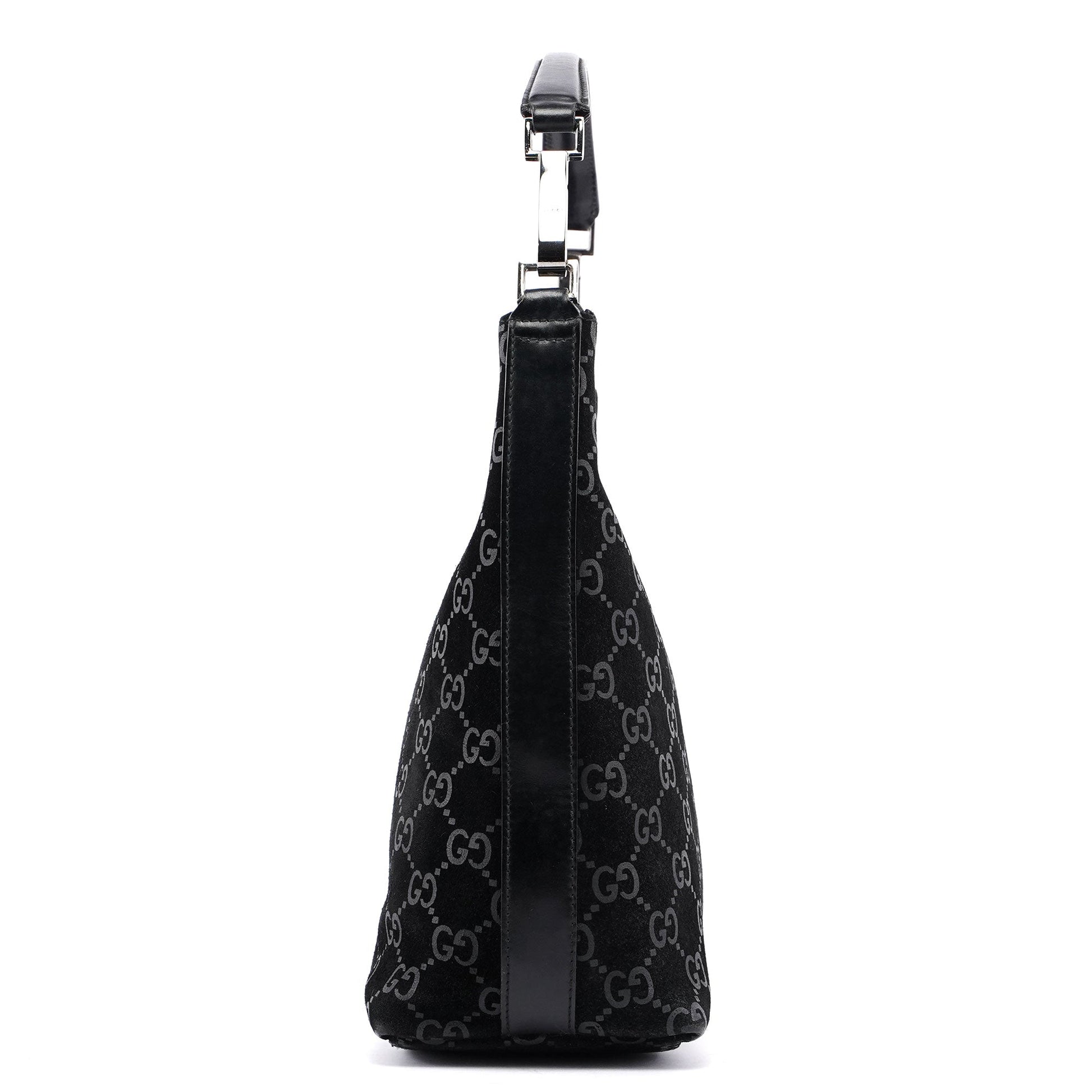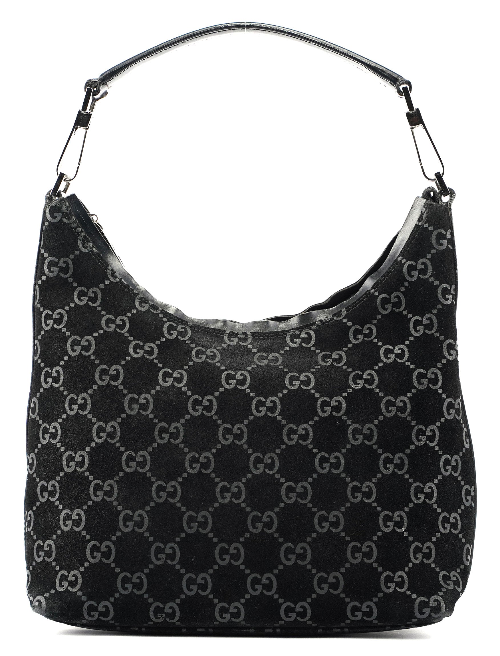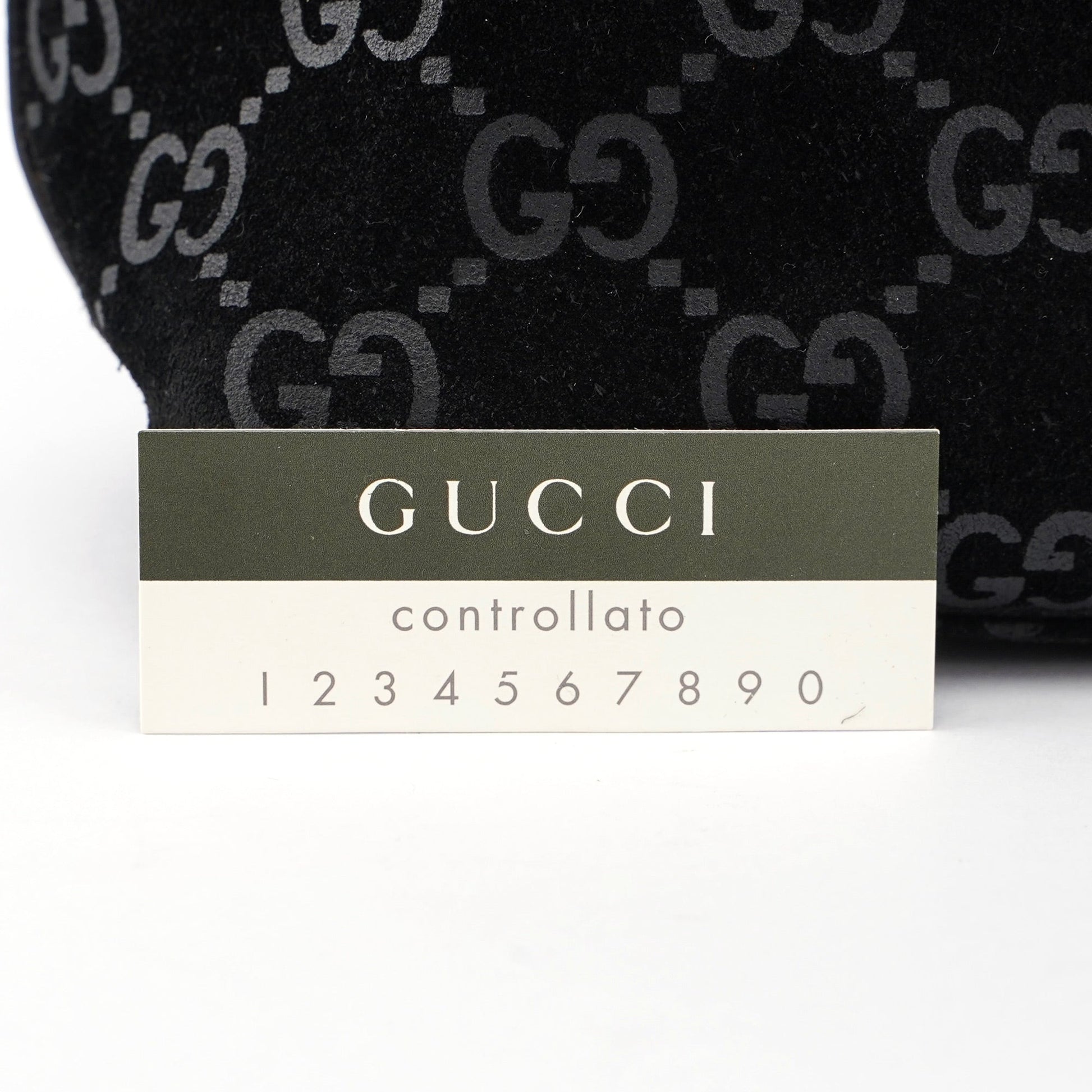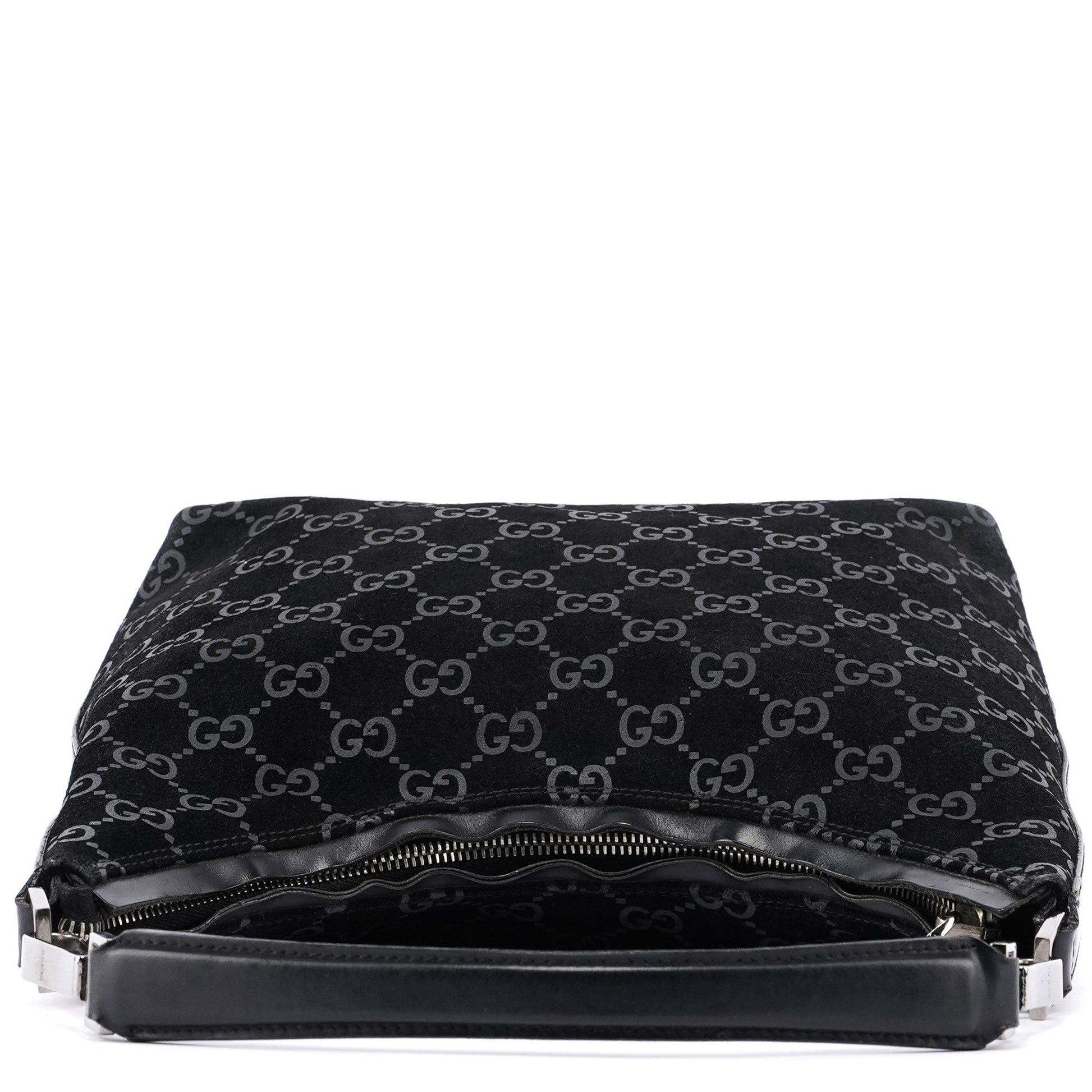 Unveil the elegance of the Gucci GG suede shoulder bag, designed by Tom Ford in 1997. This luxurious piece features silver-tone hardware with engraved Gucci logo, complemented by black calfskin leather trim. A zipper closure secures the satin-lined interior, making it a perfect fusion of timeless design and modern sophistication.